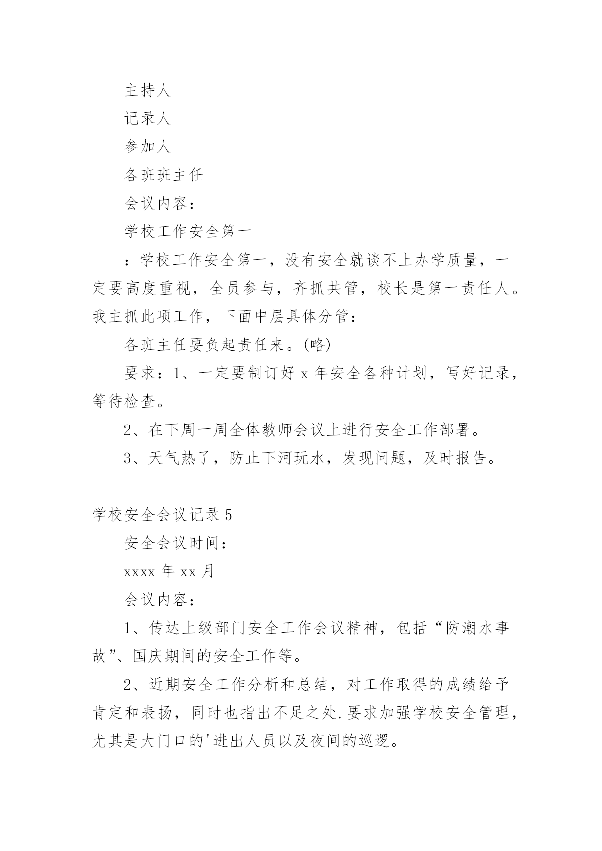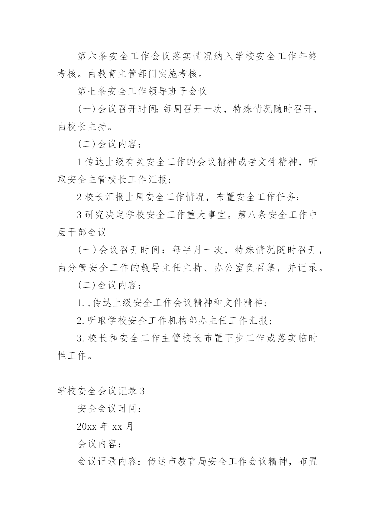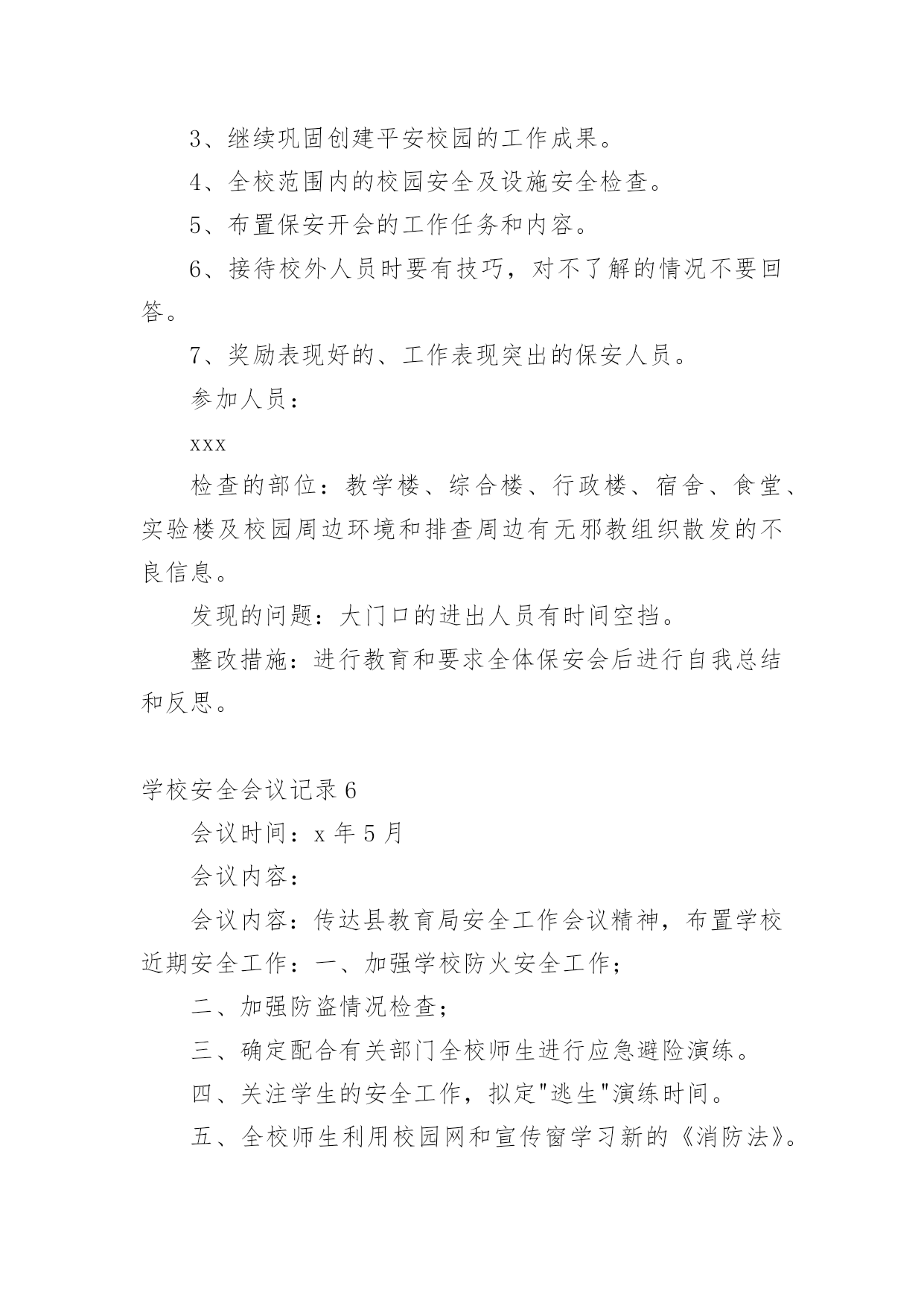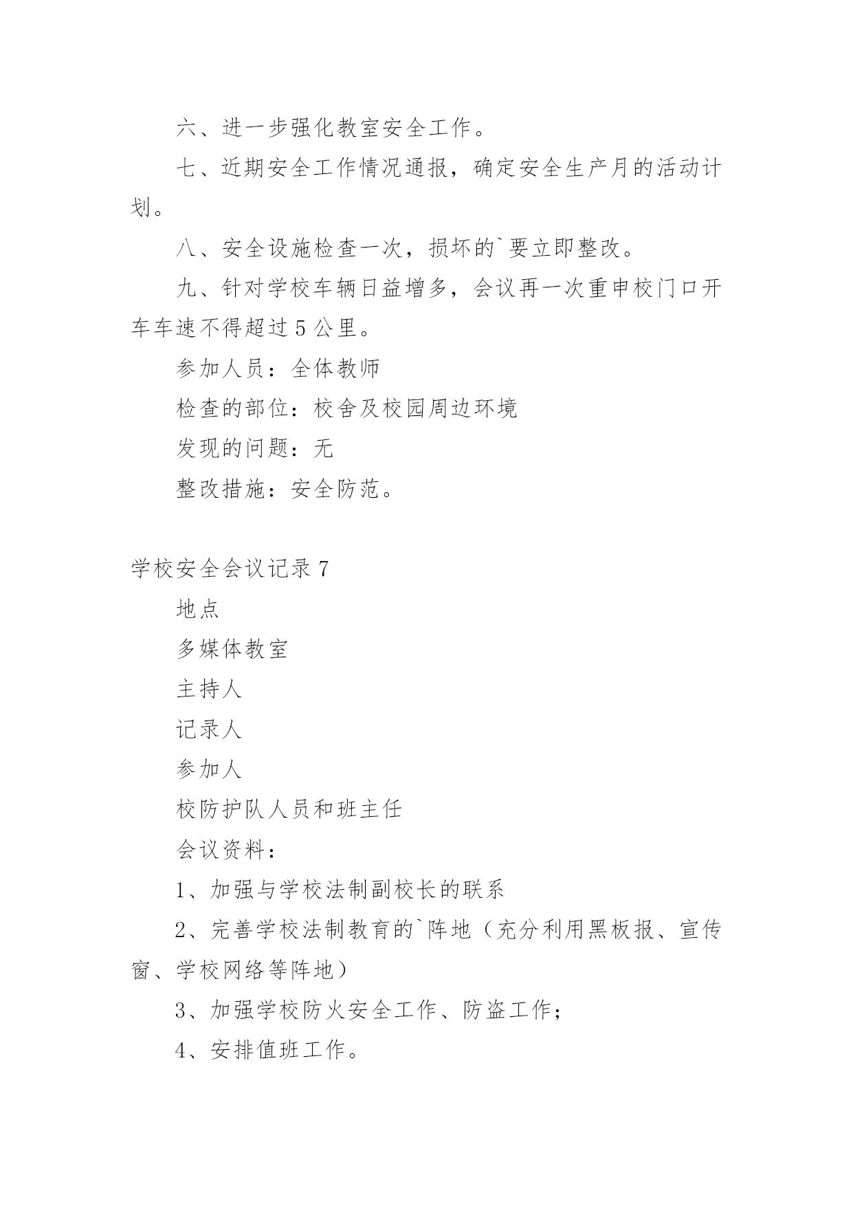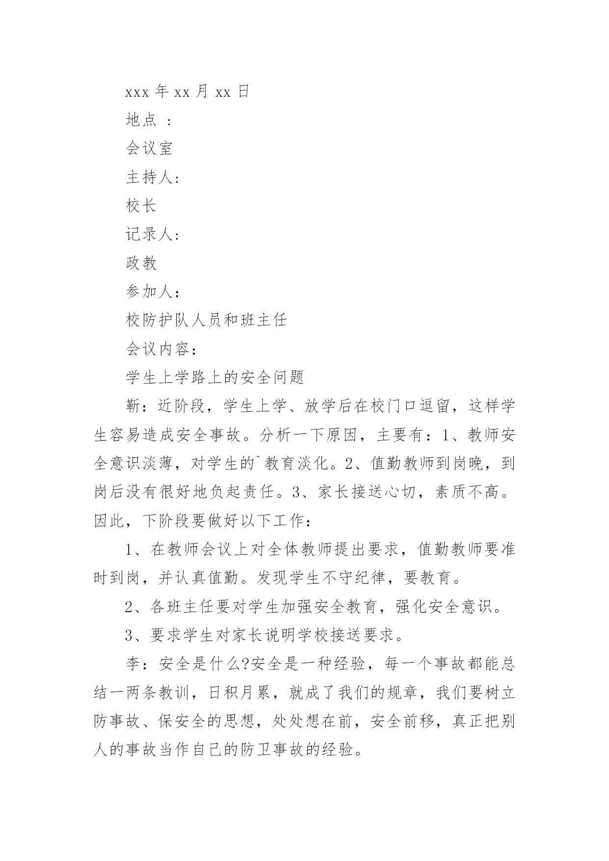 学校安全会议记录学校安全会议记录(合集)学校安全会议记录1安全会议时间:20xx年3月会议资料:1、传达教室安全工作会议精神和要求,部署和落实具体的安全工作。2、全校范围内的学校安全及设施安全检查。参加人员:全体教师检查的部位:教室,办公室及学校周边环境发现的.问题:无整改措施:警钟长鸣,防患与未然。学校安全会议记录2第一条为全面加强学校安全教育和管理,预防和减少师生校园安全事故,保护师生人身财产安全,维护学校正常的教育教学秩序,根据《中华人民共和国教育法》、《中华人民共和国安全生产法》和《中小学幼儿园安全管理办法》等法律法规,制定本制度。第二条学校是学生安全教育的主要阵地,学生安全教育是学校教育管理的一个重要组成部门,应当遵循依法管理、积极施教、服务学生的方针。树立安全工作无小事的管理理念。第三条学校安全工作例会制度主要包括:(一)定期召开安全工作联席会议制度,建立学校安全工作同教育主管部门、公安部门、司法部门的`指导、管理关系;(二)定期召开学校安全工作领导、保障机构任免会议,提高安全工作管理水平;(三)定期召开学校安全工作监控、排查工作会议,通过会议制定突发事件应急预案,完善事故预防措施,及时排除安全隐患,不断提高学校安全工作管理水平;(四)定期召开学校安全工作信息收集、分析、研判和汇报工作会议,对学校安全工作提出远景规划,对近期安全工作提出建议,做出决策;(五)定期召开安全工作培训会议。提高师生员工的安全防范意识;(六)如发生特殊安全事故时,应当临时召开特别的安全工作会议。第四条学校应当遵守有关安全工作的法律、法规和规章,按时定期召开相关安全工作会议。第五条学校安全工作领导机构,实行校长负责制,校长负责领导组织召开安全工作会议;分管副职领导具体负责,相关人员配合,责任落实到位,并配备专职或者兼职安全工作人员,具体落实安全工作决策。第六条安全工作会议落实情况纳入学校安全工作年终考核。由教育主管部门实施考核。第七条安全工作领导班子会议(一)会议召开时间:每周召开一次,特殊情况随时召开,由校长主持。(二)会议内容:1传达上级有关安全工作的会议精神或者文件精神,听取安全主管校长工作汇报;2校长汇报上周安全工作情况,布置安全工作任务;3研究决定学校安全工作重大事宜。第八条安全工作中层干部会议(一)会议召开时间:每半月一次,特殊情况随时召开,由分管安全工作的教导主任主持、办公室负召集,并记录。(二)会议内容:1.,传达上级安全工作会议精神和文件精神;2.听取学校安全工作机构部办主任工作汇报;3.校长和安全工作主管校长布置下步工作或落实临时性工作。学校安全会议记录3安全会议时间:20xx年xx月会议内容:会议记录内容:传达市教育局安全工作会议精神,布置学校近期安全工作一、加强学校防火安全工作;二、加强防盗情况检查;三、确定5月上旬配合有关部门全校师生进行应急避险演练。四、关于住校生的安全工作,拟定“逃生”演练时间。五、全校师生利用校园网和宣传窗学习新的《消防法》。六、进一步强x室安全工作要充分引起重视和传达室要严格出入管理制度。七、近期安全工作情况通报,确定安全生产月的活动计划。八、安全设施检查一次,损坏的要立即整改。九、针对学校车辆日益增多,会议再一次重申校门口开车车速不得超过5公里。十、要求教师教育学生不要随意变动灭火器的位置。参加人员:检查的`部位:教学楼、综合楼、行政楼、宿舍、食堂、实验楼艺术楼及校园周边环境发现的问题:无整改措施:安全防范。学校安全会议记录4地点办公室主持人记录人参加人各班班主任会议内容:学校工作安全第一:学校工作安全第一,没有安全就谈不上办学质量,一定要高度重视,全员参与,齐抓共管,校长是第一责任人。我主抓此项工作,下面中层具体分管:各班主任要负起责任来。(略)要求:1、一定要制订好x年安全各种计划,写好记录,等待检查。2、在下周一周全体教师会议上进行安全工作部署。3、天气热了,防止下河玩水,发现问题,及时报告。学校安全会议记录5安全会议时间:xxxx年xx月会议内容:1、传达上级部门安全工作会议精神,包括“防潮水事故”、国庆期间的安全工作等。2、近期安全工作分析和总结,对工作取得的成绩给予肯定和表扬,同时也指出不足之处.要求加强学校安全管理,尤其是大门口的'进出人员以及夜间的巡逻。3、继续巩固创建平安校园的工作成果。4、全校范围内的校园安全及设施安全检查。5、布置保安开会的工作任务和内容。6、接待校外人员时要有技巧,对不了解的情况不要回答。7、奖励表现好的、工作表现突出的保安人员。参加人员:xxx检查的部位:教学楼、综合楼、行政楼、宿舍、食堂、实验楼及校园周边环境和排查周边有无邪教组织散发的不良信息。发现的问题:大门口的进出人员有时间空挡。整改措施:进行教育和要求全体保安会后进行自我总结和反思。学校