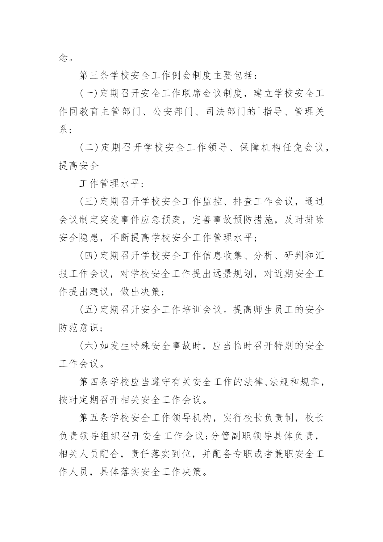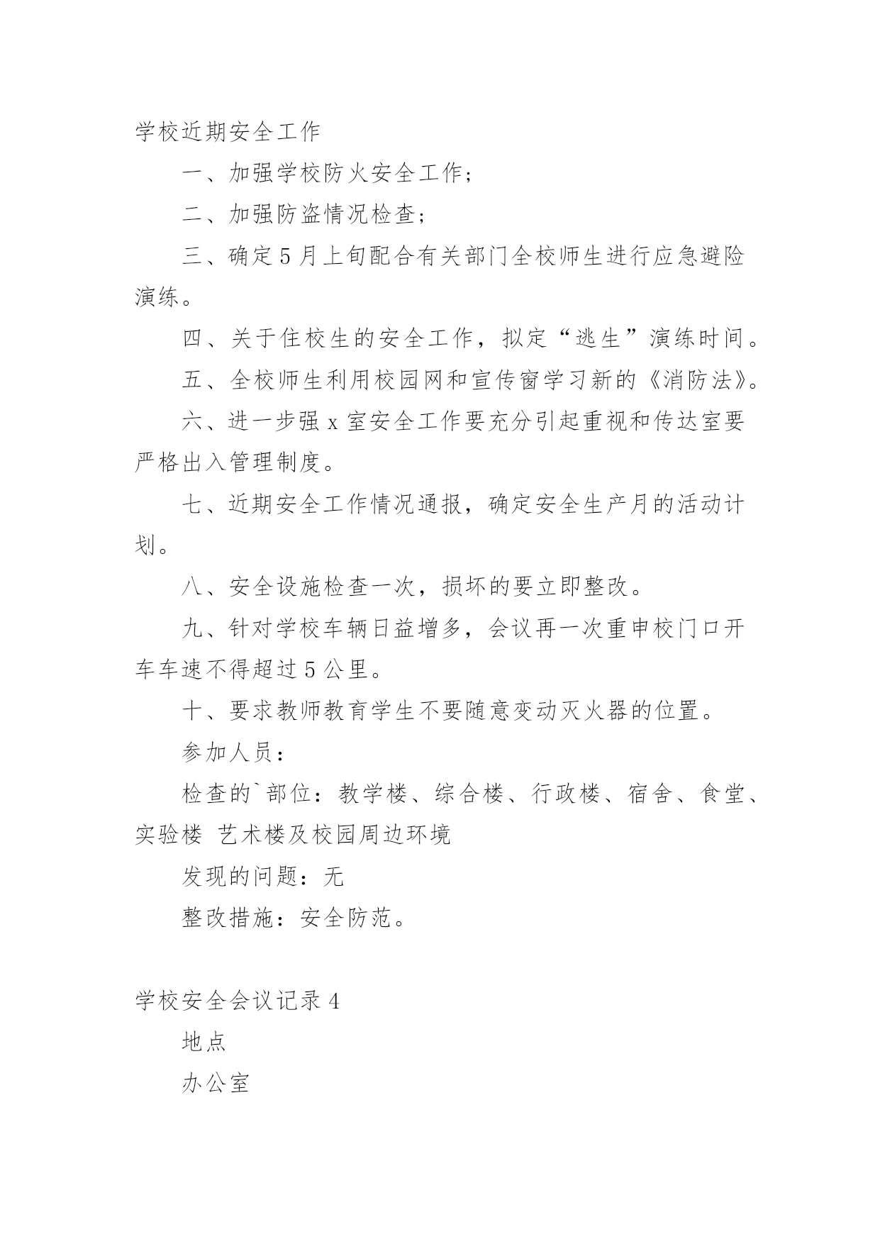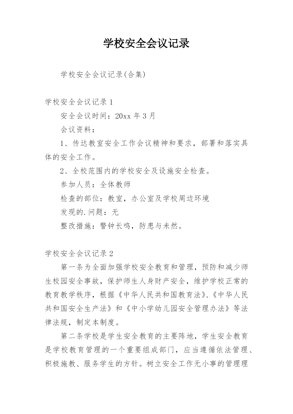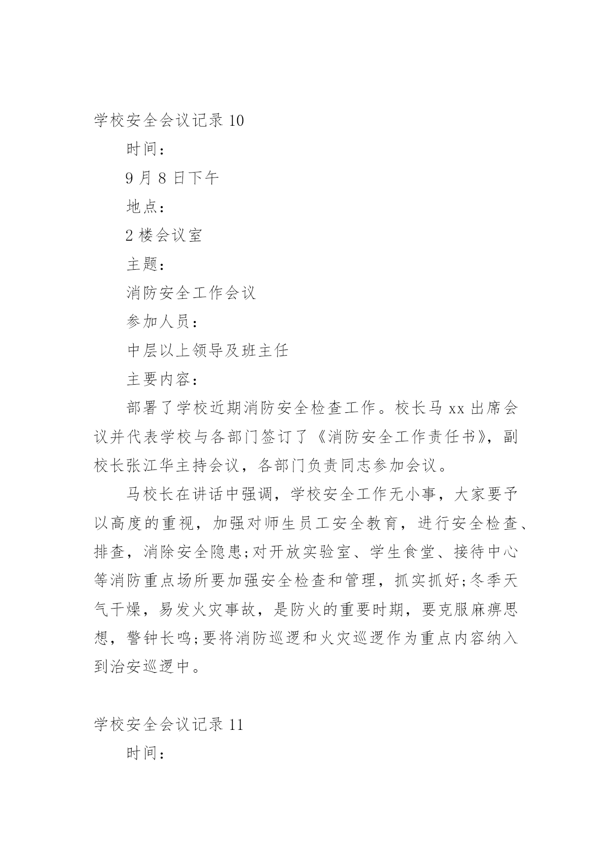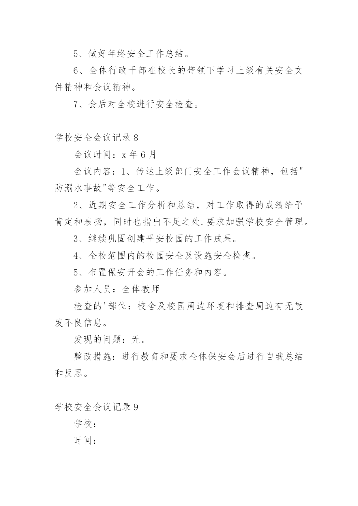 学校安全会议记录学校安全会议记录(合集)学校安全会议记录1安全会议时间:20xx年3月会议资料:1、传达教室安全工作会议精神和要求,部署和落实具体的安全工作。2、全校范围内的学校安全及设施安全检查。参加人员:全体教师检查的部位:教室,办公室及学校周边环境发现的.问题:无整改措施:警钟长鸣,防患与未然。学校安全会议记录2第一条为全面加强学校安全教育和管理,预防和减少师生校园安全事故,保护师生人身财产安全,维护学校正常的教育教学秩序,根据《中华人民共和国教育法》、《中华人民共和国安全生产法》和《中小学幼儿园安全管理办法》等法律法规,制定本制度。第二条学校是学生安全教育的主要阵地,学生安全教育是学校教育管理的一个重要组成部门,应当遵循依法管理、积极施教、服务学生的方针。树立安全工作无小事的管理理念。第三条学校安全工作例会制度主要包括:(一)定期召开安全工作联席会议制度,建立学校安全工作同教育主管部门、公安部门、司法部门的`指导、管理关系;(二)定期召开学校安全工作领导、保障机构任免会议,提高安全工作管理水平;(三)定期召开学校安全工作监控、排查工作会议,通过会议制定突发事件应急预案,完善事故预防措施,及时排除安全隐患,不断提高学校安全工作管理水平;(四)定期召开学校安全工作信息收集、分析、研判和汇报工作会议,对学校安全工作提出远景规划,对近期安全工作提出建议,做出决策;(五)定期召开安全工作培训会议。提高师生员工的安全防范意识;(六)如发生特殊安全事故时,应当临时召开特别的安全工作会议。第四条学校应当遵守有关安全工作的法律、法规和规章,按时定期召开相关安全工作会议。第五条学校安全工作领导机构,实行校长负责制,校长负责领导组织召开安全工作会议;分管副职领导具体负责,相关人员配合,责任落实到位,并配备专职或者兼职安全工作人员,具体落实安全工作决策。第六条安全工作会议落实情况纳入学校安全工作年终考核。由教育主管部门实施考核。第七条安全工作领导班子会议(一)会议召开时间:每周召开一次,特殊情况随时召开,由校长主持。(二)会议内容:1传达上级有关安全工作的会议精神或者文件精神,听取安全主管校长工作汇报;2校长汇报上周安全工作情况,布置安全工作任务;3研究决定学校安全工作重大事宜。第八条安全工作中层干部会议(一)会议召开时间:每半月一次,特殊情况随时召开,由分管安全工作的教导主任主持、办公室负召集,并记录。(二)会议内容:1.,传达上级安全工作会议精神和文件精神;2.听取学校安全工作机构部办主任工作汇报;3.校长和安全工作主管校长布置下步工作或落实临时性工作。学校安全会议记录3安全会议时间:20xx年xx月会议内容:会议记录内容:传达市教育局安全工作会议精神,布置学校近期安全工作一、加强学校防火安全工作;二、加强防盗情况检查;三、确定5月上旬配合有关部门全校师生进行应急避险演练。四、关于住校生的安全工作,拟定“逃生”演练时间。五、全校师生利用校园网和宣传窗学习新的《消防法》。六、进一步强x室安全工作要充分引起重视和传达室要严格出入管理制度。七、近期安全工作情况通报,确定安全生产月的活动计划。八、安全设施检查一次,损坏的要立即整改。九、针对学校车辆日益增多,会议再一次重申校门口开车车速不得超过5公里。十、要求教师教育学生不要随意变动灭火器的位置。参加人员:检查的`部位:教学楼、综合楼、行政楼、宿舍、食堂、实验楼艺术楼及校园周边环境发现的问题:无整改措施:安全防范。学校安全会议记录4地点办公室主持人记录人参加人各班班主任会议内容:学校工作安全第一:学校工作安全第一,没有安全就谈不上办学质量,一定要高度重视,全员参与,齐抓共管,校长是第一责任人。我主抓此项工作,下面中层具体分管:各班主任要负起责任来。(略)要求:1、一定要制订好x年安全各种计划,写好记录,等待检查。2、在下周一周全体教师会议上进行安全工作部署。3、天气热了,防止下河玩水,发现问题,及时报告。学校安全会议记录5安全会议时间:xxxx年xx月会议内容:1、传达上级部门安全工作会议精神,包括“防潮水事故”、国庆期间的安全工作等。2、近期安全工作分析和总结,对工作取得的成绩给予肯定和表扬,同时也指出不足之处.要求加强学校安全管理,尤其是大门口的'进出人员以及夜间的巡逻。3、继续巩固创建平安校园的工作成果。4、全校范围内的校园安全及设施安全检查。5、布置保安开会的工作任务和内容。6、接待校外人员时要有技巧,对不了解的情况不要回答。7、奖励表现好的、工作表现突出的保安人员。参加人员:xxx检查的部位:教学楼、综合楼、行政楼、宿舍、食堂、实验楼及校园周边环境和排查周边有无邪教组织散发的不良信息。发现的问题:大门口的进出人员有时间空挡。整改措施:进行教育和要求全体保安会后进行自我总结和反思。学校