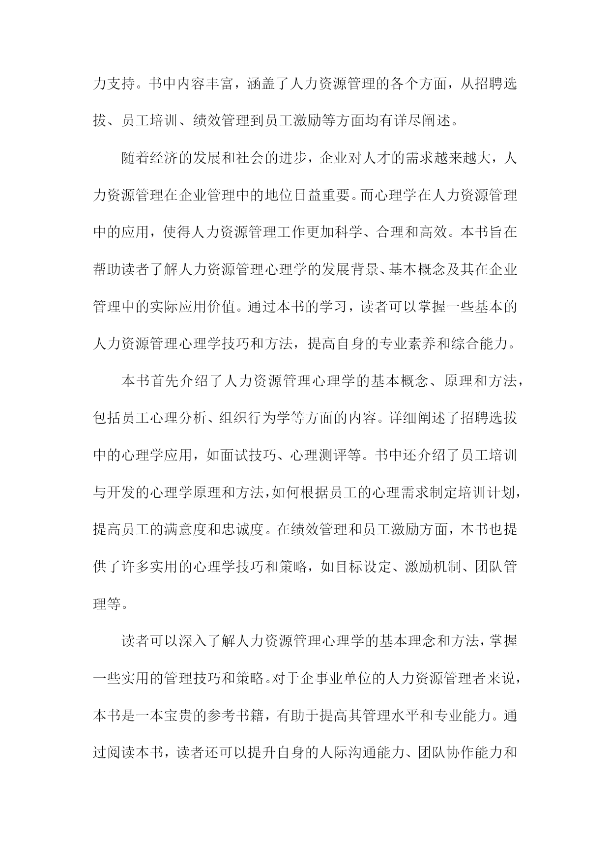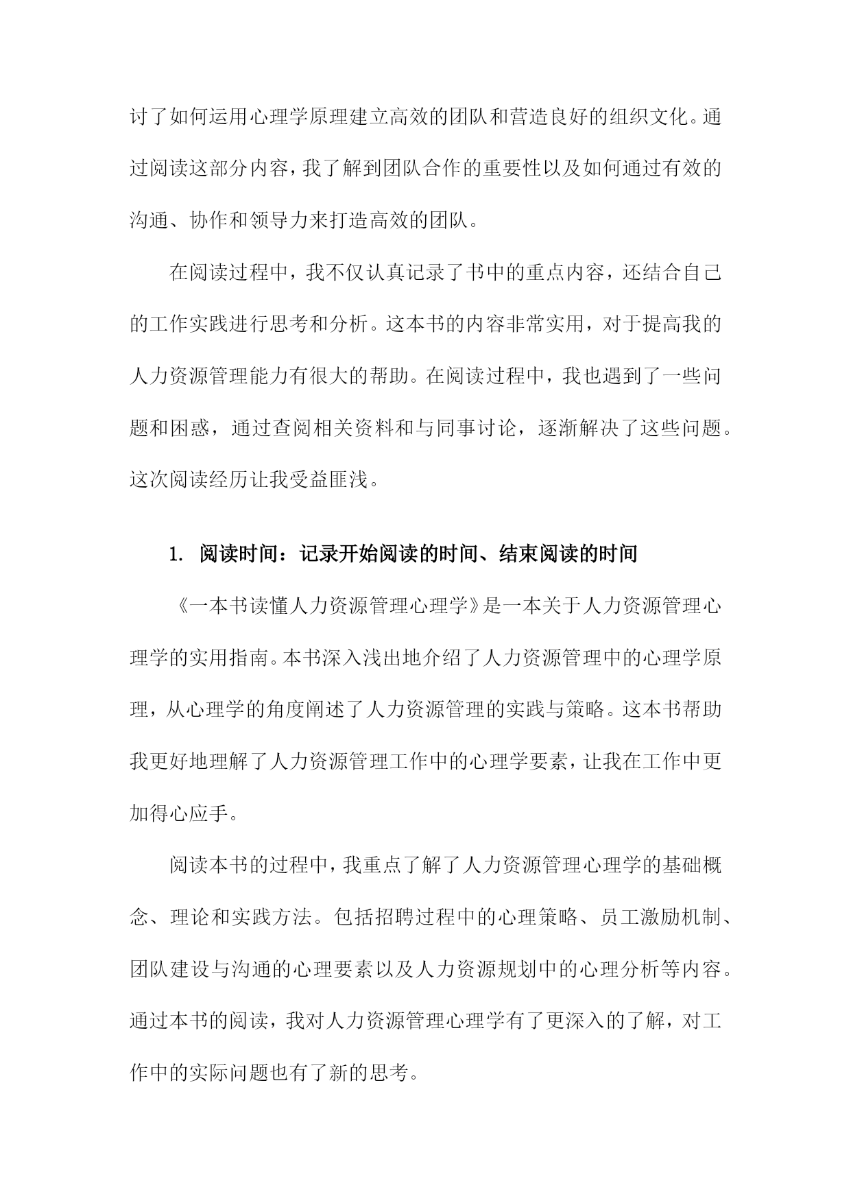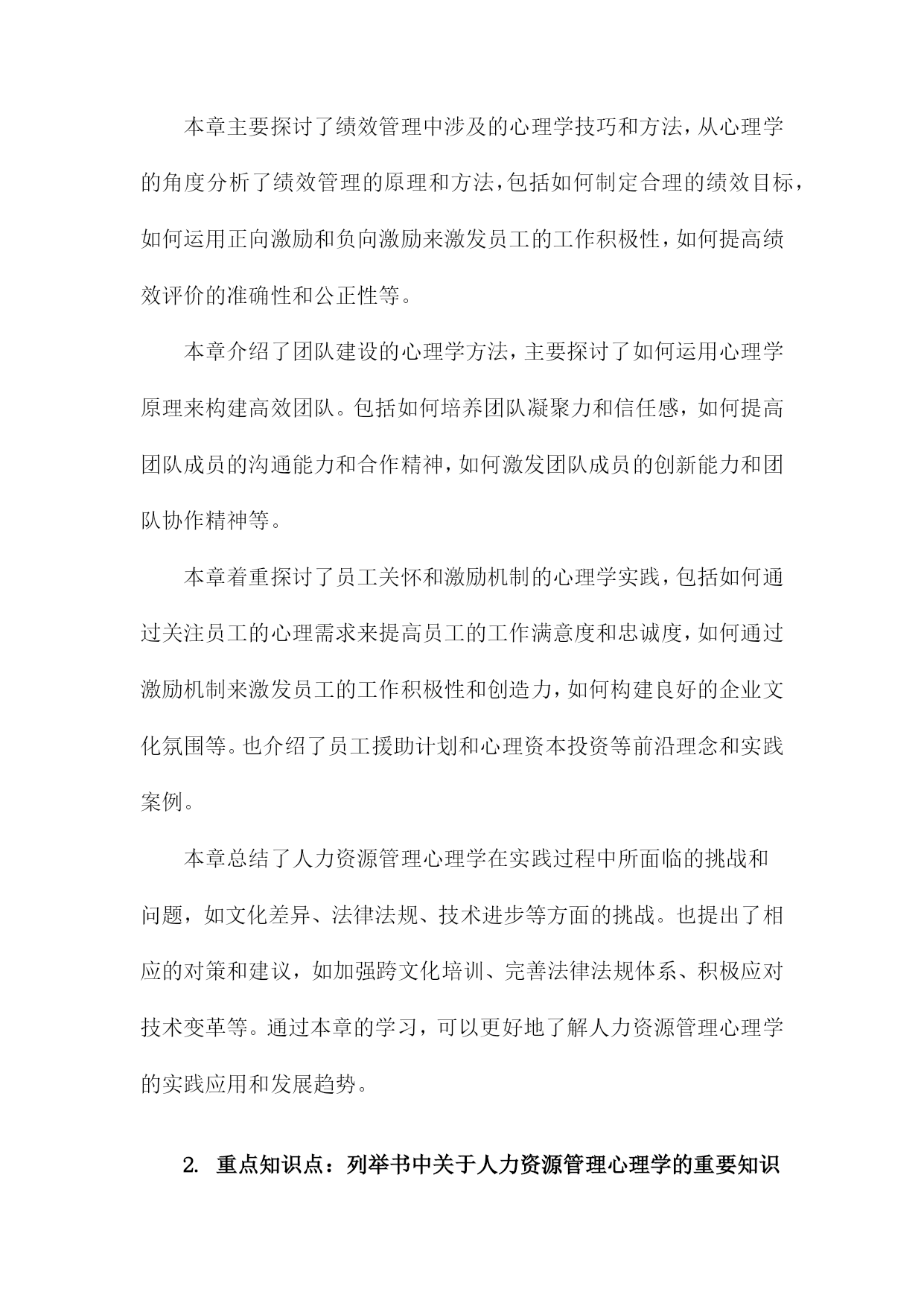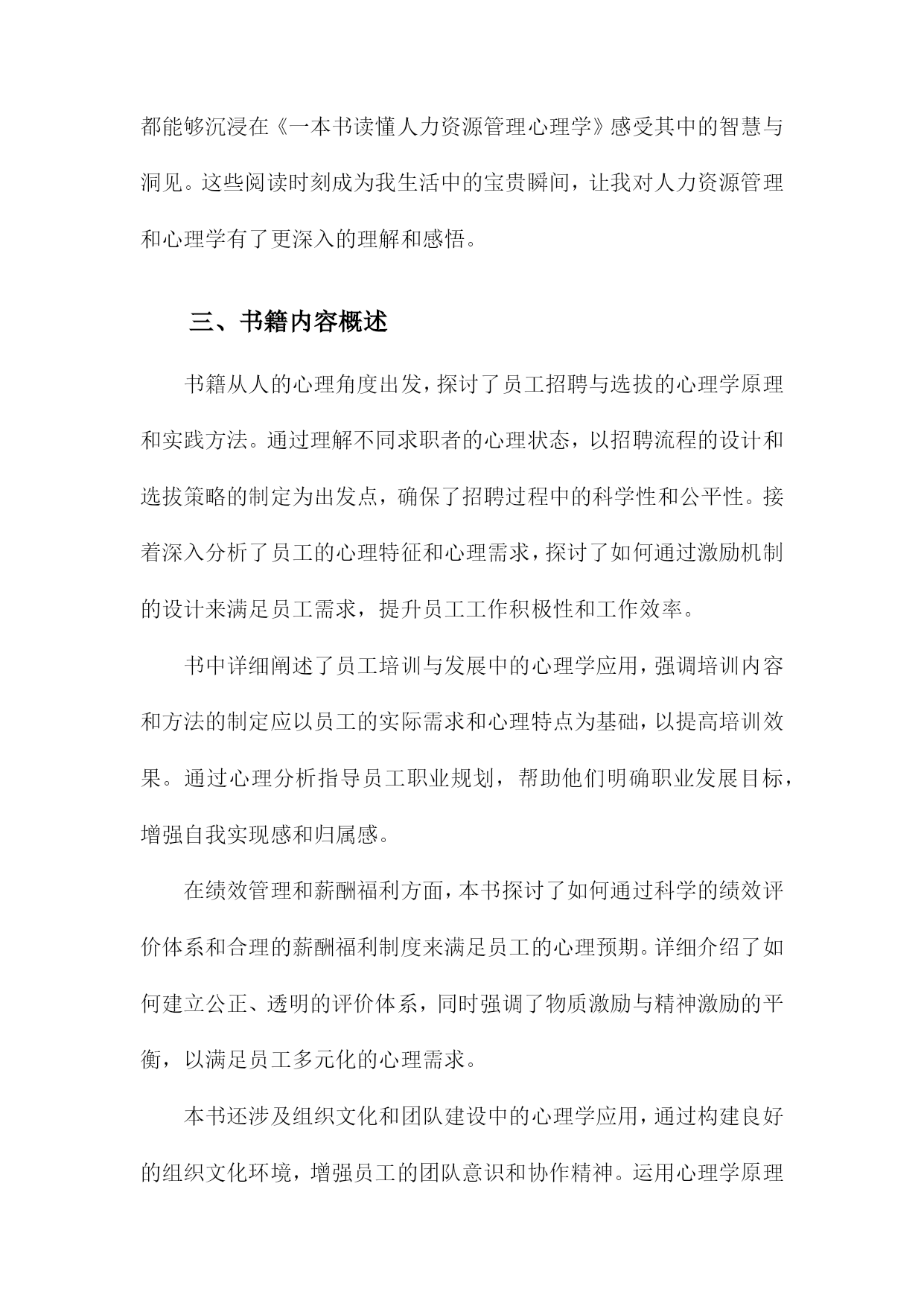 《一本书读懂人力资源管理心理学》阅读记录一、书籍基本信息本书是一本关于人力资源管理的心理学方面的著作,旨在帮助读者深入了解和理解人力资源管理中的心理学原理和应用。本书内容涵盖了人力资源管理的各个方面,包括招聘、培训、绩效管理、薪酬福利、员工关系等方面,通过深入浅出的方式,让读者更好地理解人力资源管理中的心理学知识,从而提高人力资源管理工作中的效率和准确性。书中结合了丰富的案例和实践经验,使得理论知识更加生动具体,便于读者理解和应用。本书还介绍了现代人力资源管理中的新兴理念和方法,如员工心理健康管理、远程办公的心理影响等,反映了人力资源管理领域的发展和变化。作者以专业的视角和丰富的实战经验,为人力资源管理者和从业人员提供了实用的指导和建议。1.书籍名称:《一本书读懂人力资源管理心理学》《一本书读懂人力资源管理心理学》是一本全面深入解析人力资源管理心理学的实用指南。本书旨在帮助读者理解并掌握人力资源管理中的心理学原理与技巧,为企事业单位的人力资源管理工作提供有力支持。书中内容丰富,涵盖了人力资源管理的各个方面,从招聘选拔、员工培训、绩效管理到员工激励等方面均有详尽阐述。随着经济的发展和社会的进步,企业对人才的需求越来越大,人力资源管理在企业管理中的地位日益重要。而心理学在人力资源管理中的应用,使得人力资源管理工作更加科学、合理和高效。本书旨在帮助读者了解人力资源管理心理学的发展背景、基本概念及其在企业管理中的实际应用价值。通过本书的学习,读者可以掌握一些基本的人力资源管理心理学技巧和方法,提高自身的专业素养和综合能力。本书首先介绍了人力资源管理心理学的基本概念、原理和方法,包括员工心理分析、组织行为学等方面的内容。详细阐述了招聘选拔中的心理学应用,如面试技巧、心理测评等。书中还介绍了员工培训与开发的心理学原理和方法,如何根据员工的心理需求制定培训计划,提高员工的满意度和忠诚度。在绩效管理和员工激励方面,本书也提供了许多实用的心理学技巧和策略,如目标设定、激励机制、团队管理等。读者可以深入了解人力资源管理心理学的基本理念和方法,掌握一些实用的管理技巧和策略。对于企事业单位的人力资源管理者来说,本书是一本宝贵的参考书籍,有助于提高其管理水平和专业能力。通过阅读本书,读者还可以提升自身的人际沟通能力、团队协作能力和领导力等方面的能力,从而更好地适应职场发展。阅读《一本书读懂人力资源管理心理学》,将为您在人力资源管理领域取得更大的成就提供有力支持。2.作者信息:包括作者姓名、职务或职称等本书作者为著名人力资源管理专家及心理学研究者——张华。张华教授具有丰富的学术背景和实践经验,现任国内知名大学人力资源管理系资深教授。他拥有多年在人力资源管理领域的从业经验,深入了解企业在人力资源管理过程中所面临的挑战和机遇。张华教授还担任国内外多个学术机构的顾问和委员,致力于推动人力资源管理心理学的研究和发展。他撰写过多部专业著作,深受读者和业界人士的赞誉与认可。在本书的创作过程中,张华教授凭借其深厚的人力资源管理知识和心理学理论基础,结合实践案例,为读者呈现了一本既具备理论指导又具备实践操作性的佳作。3.出版信息:包括出版社名称、出版日期等本书由机械工业出版社于年XX月出版。机械工业出版社作为国内知名的出版机构,以其深厚的学术积淀和广泛的品牌影响力,确保了本书的专业性和权威性。出版日期为近年,因此书中内容能够紧密结合当前的人力资源管理心理学发展趋势和实践需求,为读者提供最新、最全面的知识和观点。二、阅读过程描述在翻阅《一本书读懂人力资源管理心理学》我深受启发,阅读过程充满收获。这本书从心理学的角度深入探讨了人力资源管理的重要性及其在实际工作中的运用。阅读过程中,我按照章节顺序,逐步理解了书中的主要内容和观点。我阅读了关于人力资源管理的心理学基础部分,这部分内容介绍了人力资源管理与心理学之间的紧密联系,包括员工的心理需求、行为模式以及组织心理等方面的知识。通过阅读这部分内容,我对人力资源管理的理论基础有了更深入的了解。我阅读了关于招聘与选拔的心理学应用部分,书中详细介绍了如何运用心理学原理和方法进行招聘和选拔优秀人才。通过案例分析,我了解到心理测试、面试技巧等在人力资源招聘中的重要作用,并认识到选拔人才时需要考虑应聘者的性格、能力、潜力等多方面的因素。我学习了关于员工培训与激励的心理学策略,书中介绍了如何通过心理学知识制定有效的培训计划和激励机制,提升员工的工作积极性和工作效率。这部分内容让我认识到员工培训和激励的重要性,并了解到如何运用心理学原理提高员工的满意度和忠诚度。我还阅读了关于团队建设与组织文化的心理学视角部分,书中探讨了如何运用心理学原理建立高效的团队和营造良好的组织文化。通过阅读这部分内容,我了解到团队合作