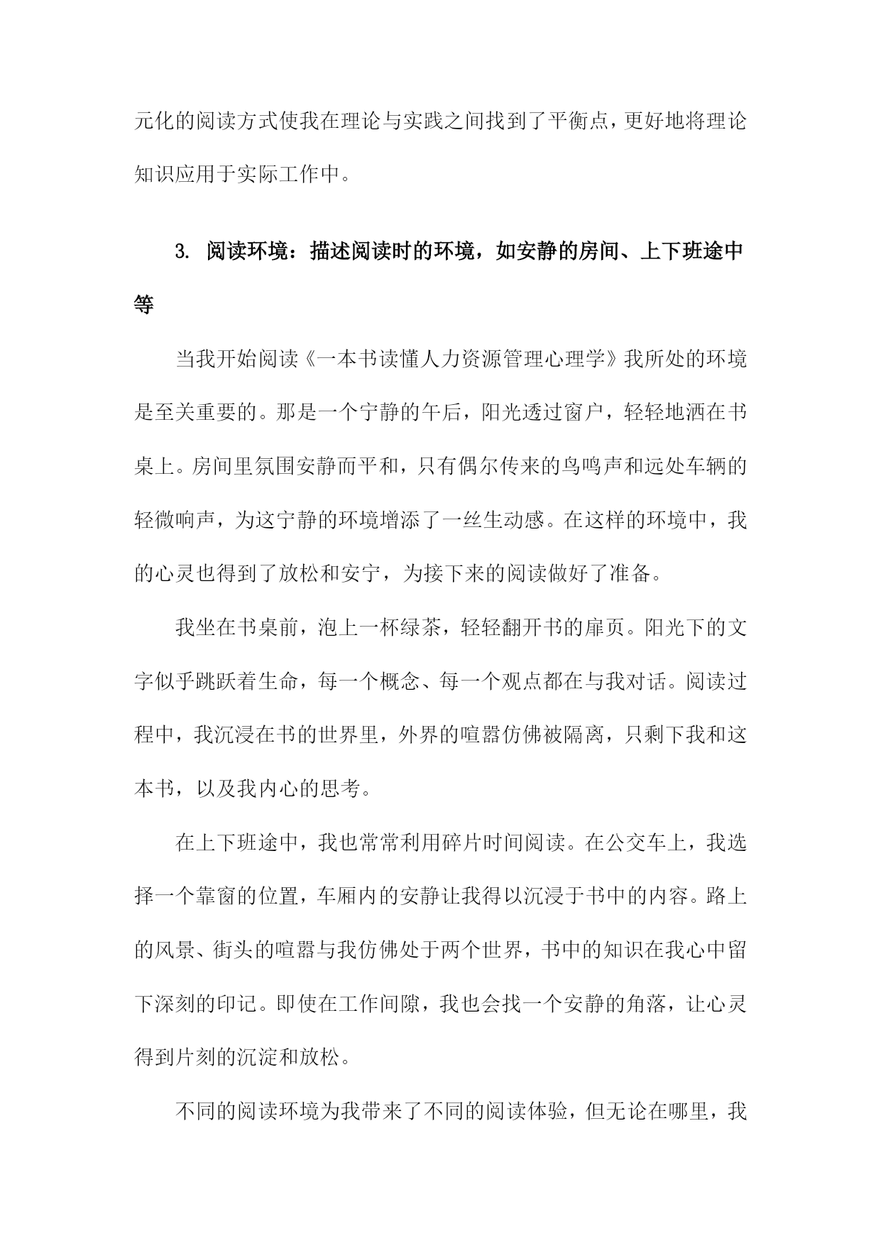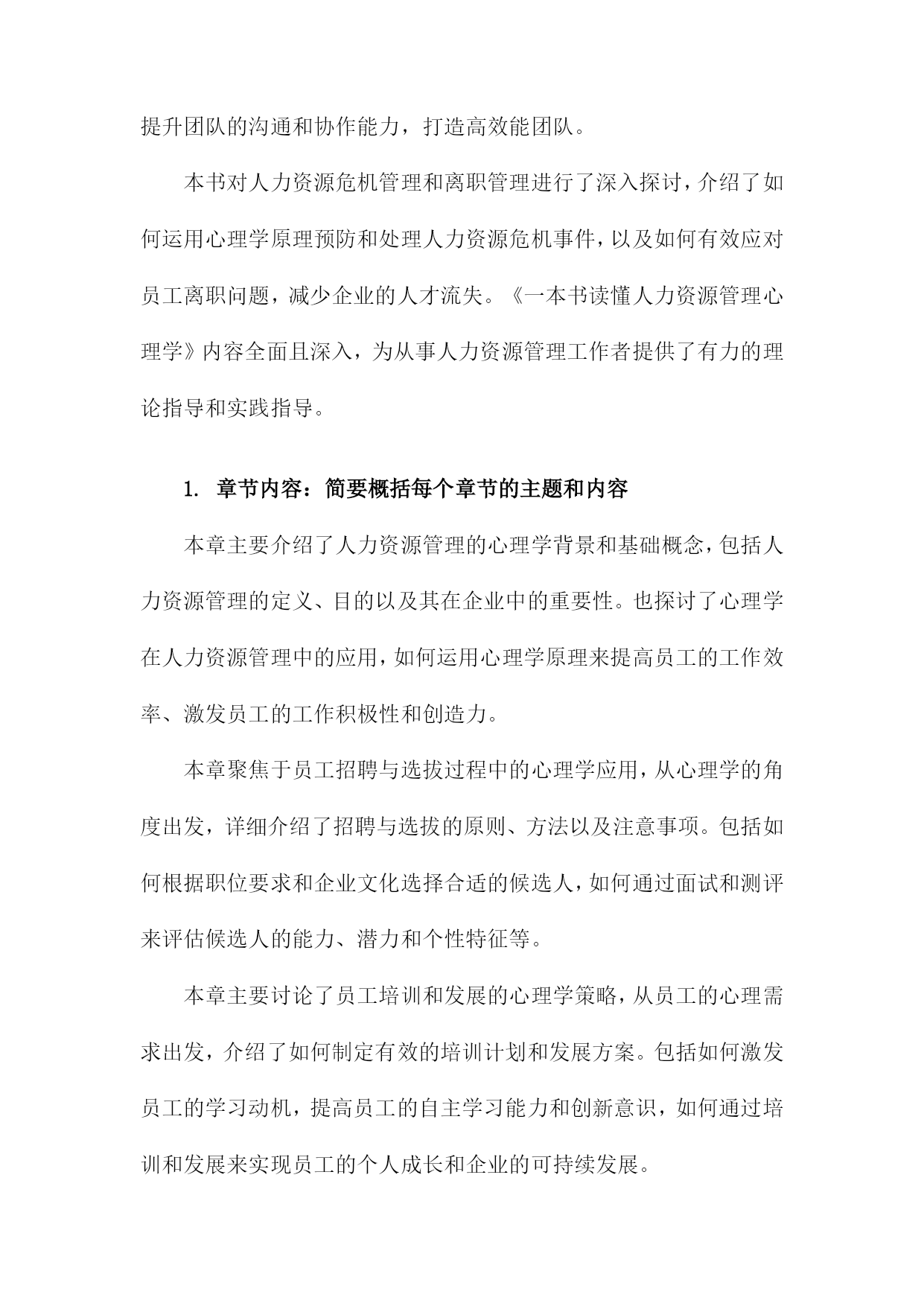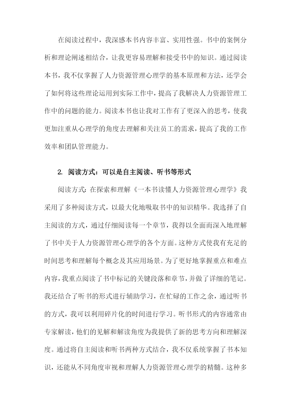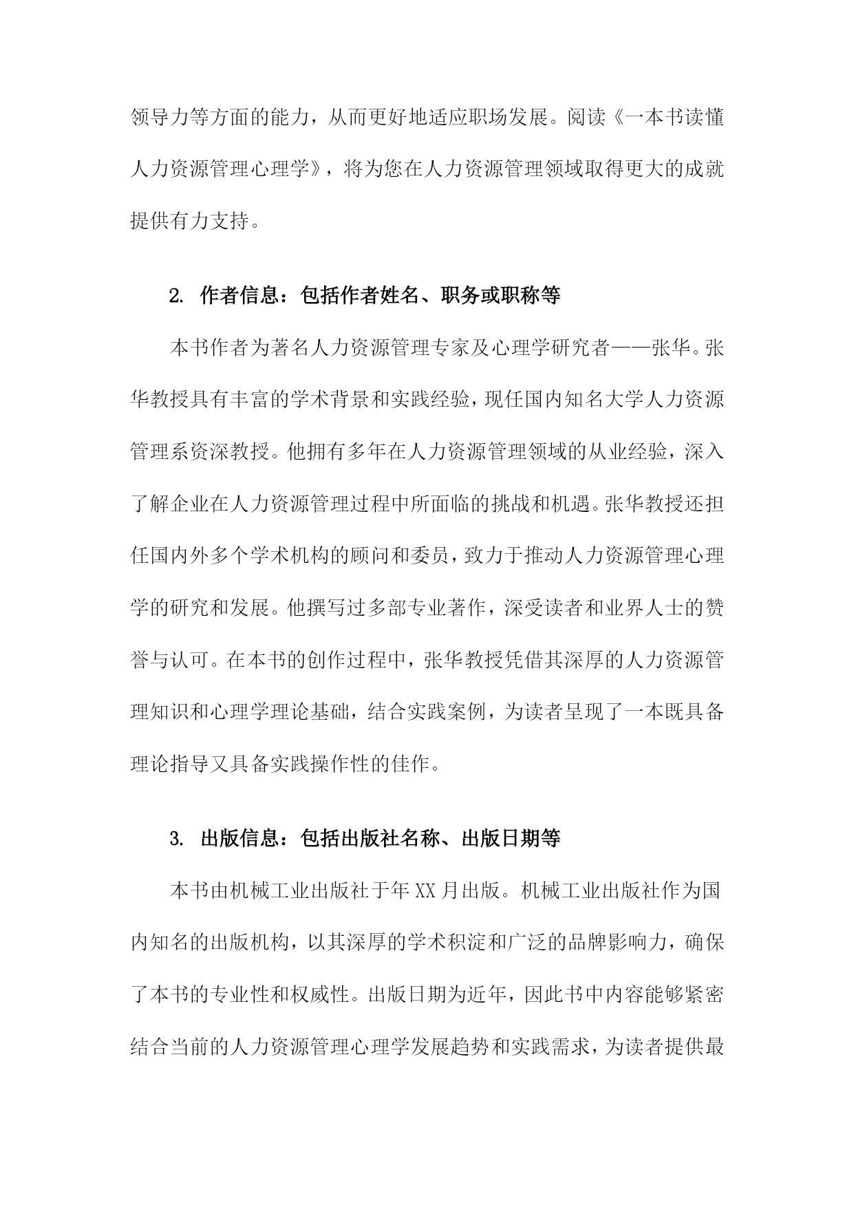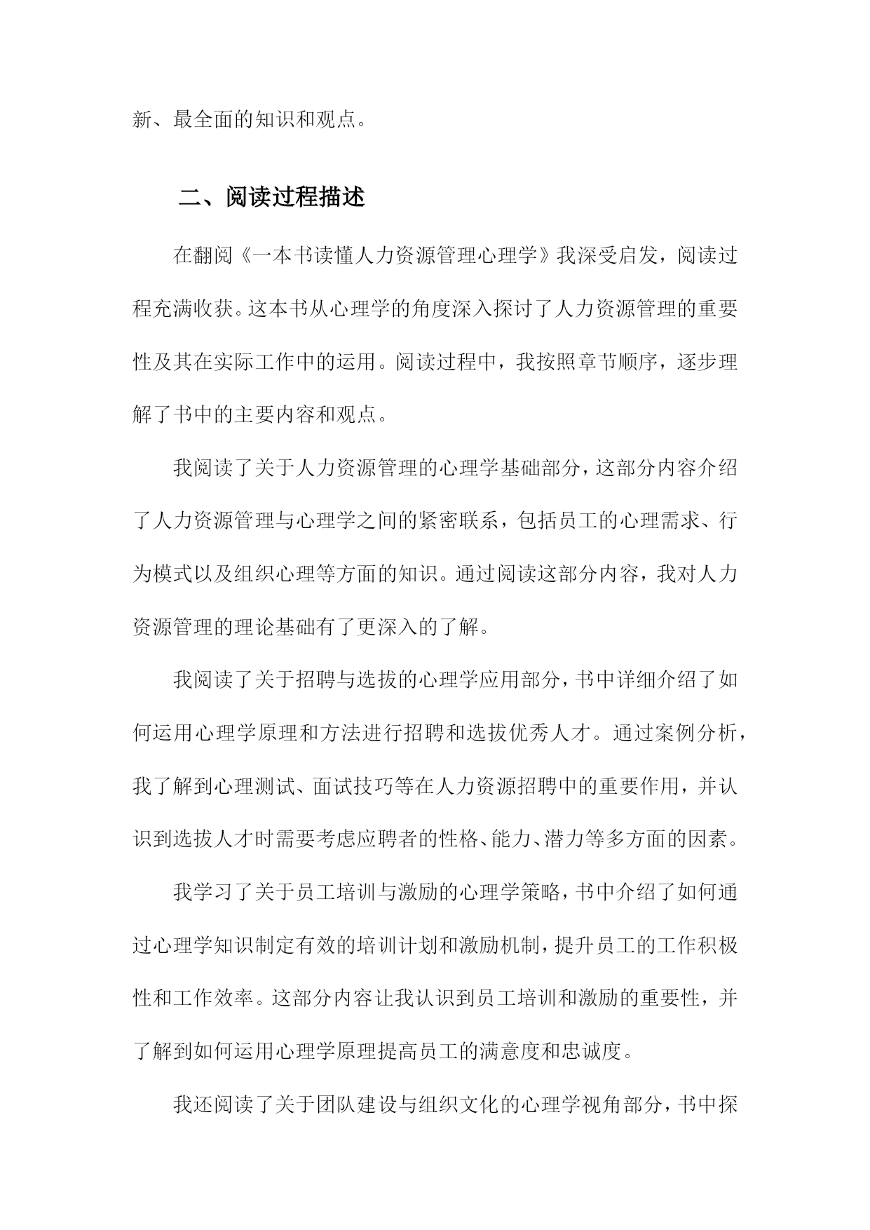 《一本书读懂人力资源管理心理学》阅读记录一、书籍基本信息本书是一本关于人力资源管理的心理学方面的著作,旨在帮助读者深入了解和理解人力资源管理中的心理学原理和应用。本书内容涵盖了人力资源管理的各个方面,包括招聘、培训、绩效管理、薪酬福利、员工关系等方面,通过深入浅出的方式,让读者更好地理解人力资源管理中的心理学知识,从而提高人力资源管理工作中的效率和准确性。书中结合了丰富的案例和实践经验,使得理论知识更加生动具体,便于读者理解和应用。本书还介绍了现代人力资源管理中的新兴理念和方法,如员工心理健康管理、远程办公的心理影响等,反映了人力资源管理领域的发展和变化。作者以专业的视角和丰富的实战经验,为人力资源管理者和从业人员提供了实用的指导和建议。1.书籍名称:《一本书读懂人力资源管理心理学》《一本书读懂人力资源管理心理学》是一本全面深入解析人力资源管理心理学的实用指南。本书旨在帮助读者理解并掌握人力资源管理中的心理学原理与技巧,为企事业单位的人力资源管理工作提供有力支持。书中内容丰富,涵盖了人力资源管理的各个方面,从招聘选拔、员工培训、绩效管理到员工激励等方面均有详尽阐述。随着经济的发展和社会的进步,企业对人才的需求越来越大,人力资源管理在企业管理中的地位日益重要。而心理学在人力资源管理中的应用,使得人力资源管理工作更加科学、合理和高效。本书旨在帮助读者了解人力资源管理心理学的发展背景、基本概念及其在企业管理中的实际应用价值。通过本书的学习,读者可以掌握一些基本的人力资源管理心理学技巧和方法,提高自身的专业素养和综合能力。本书首先介绍了人力资源管理心理学的基本概念、原理和方法,包括员工心理分析、组织行为学等方面的内容。详细阐述了招聘选拔中的心理学应用,如面试技巧、心理测评等。书中还介绍了员工培训与开发的心理学原理和方法,如何根据员工的心理需求制定培训计划,提高员工的满意度和忠诚度。在绩效管理和员工激励方面,本书也提供了许多实用的心理学技巧和策略,如目标设定、激励机制、团队管理等。读者可以深入了解人力资源管理心理学的基本理念和方法,掌握一些实用的管理技巧和策略。对于企事业单位的人力资源管理者来说,本书是一本宝贵的参考书籍,有助于提高其管理水平和专业能力。通过阅读本书,读者还可以提升自身的人际沟通能力、团队协作能力和领导力等方面的能力,从而更好地适应职场发展。阅读《一本书读懂人力资源管理心理学》,将为您在人力资源管理领域取得更大的成就提供有力支持。2.作者信息:包括作者姓名、职务或职称等本书作者为著名人力资源管理专家及心理学研究者——张华。张华教授具有丰富的学术背景和实践经验,现任国内知名大学人力资源管理系资深教授。他拥有多年在人力资源管理领域的从业经验,深入了解企业在人力资源管理过程中所面临的挑战和机遇。张华教授还担任国内外多个学术机构的顾问和委员,致力于推动人力资源管理心理学的研究和发展。他撰写过多部专业著作,深受读者和业界人士的赞誉与认可。在本书的创作过程中,张华教授凭借其深厚的人力资源管理知识和心理学理论基础,结合实践案例,为读者呈现了一本既具备理论指导又具备实践操作性的佳作。3.出版信息:包括出版社名称、出版日期等本书由机械工业出版社于年XX月出版。机械工业出版社作为国内知名的出版机构,以其深厚的学术积淀和广泛的品牌影响力,确保了本书的专业性和权威性。出版日期为近年,因此书中内容能够紧密结合当前的人力资源管理心理学发展趋势和实践需求,为读者提供最新、最全面的知识和观点。二、阅读过程描述在翻阅《一本书读懂人力资源管理心理学》我深受启发,阅读过程充满收获。这本书从心理学的角度深入探讨了人力资源管理的重要性及其在实际工作中的运用。阅读过程中,我按照章节顺序,逐步理解了书中的主要内容和观点。我阅读了关于人力资源管理的心理学基础部分,这部分内容介绍了人力资源管理与心理学之间的紧密联系,包括员工的心理需求、行为模式以及组织心理等方面的知识。通过阅读这部分内容,我对人力资源管理的理论基础有了更深入的了解。我阅读了关于招聘与选拔的心理学应用部分,书中详细介绍了如何运用心理学原理和方法进行招聘和选拔优秀人才。通过案例分析,我了解到心理测试、面试技巧等在人力资源招聘中的重要作用,并认识到选拔人才时需要考虑应聘者的性格、能力、潜力等多方面的因素。我学习了关于员工培训与激励的心理学策略,书中介绍了如何通过心理学知识制定有效的培训计划和激励机制,提升员工的工作积极性和工作效率。这部分内容让我认识到员工培训和激励的重要性,并了解到如何运用心理学原理提高员工的满意度和忠诚度。我还阅读了关于团队建设与组织文化的心理学视角部分,书中探讨了如何运用心理学原理建立高效的团队和营造良好的组织文化。通过阅读这部分内容,我了解到团队合作