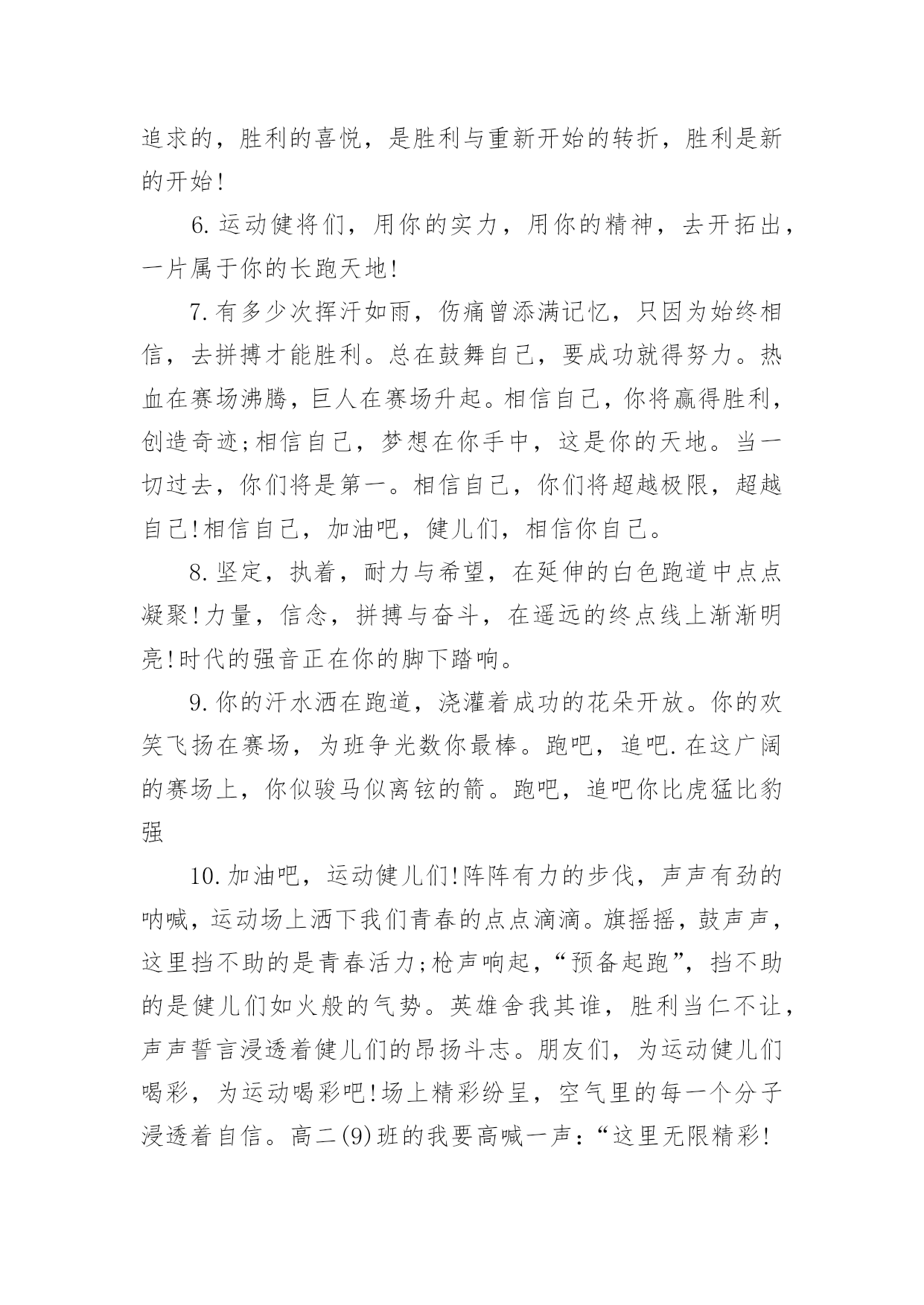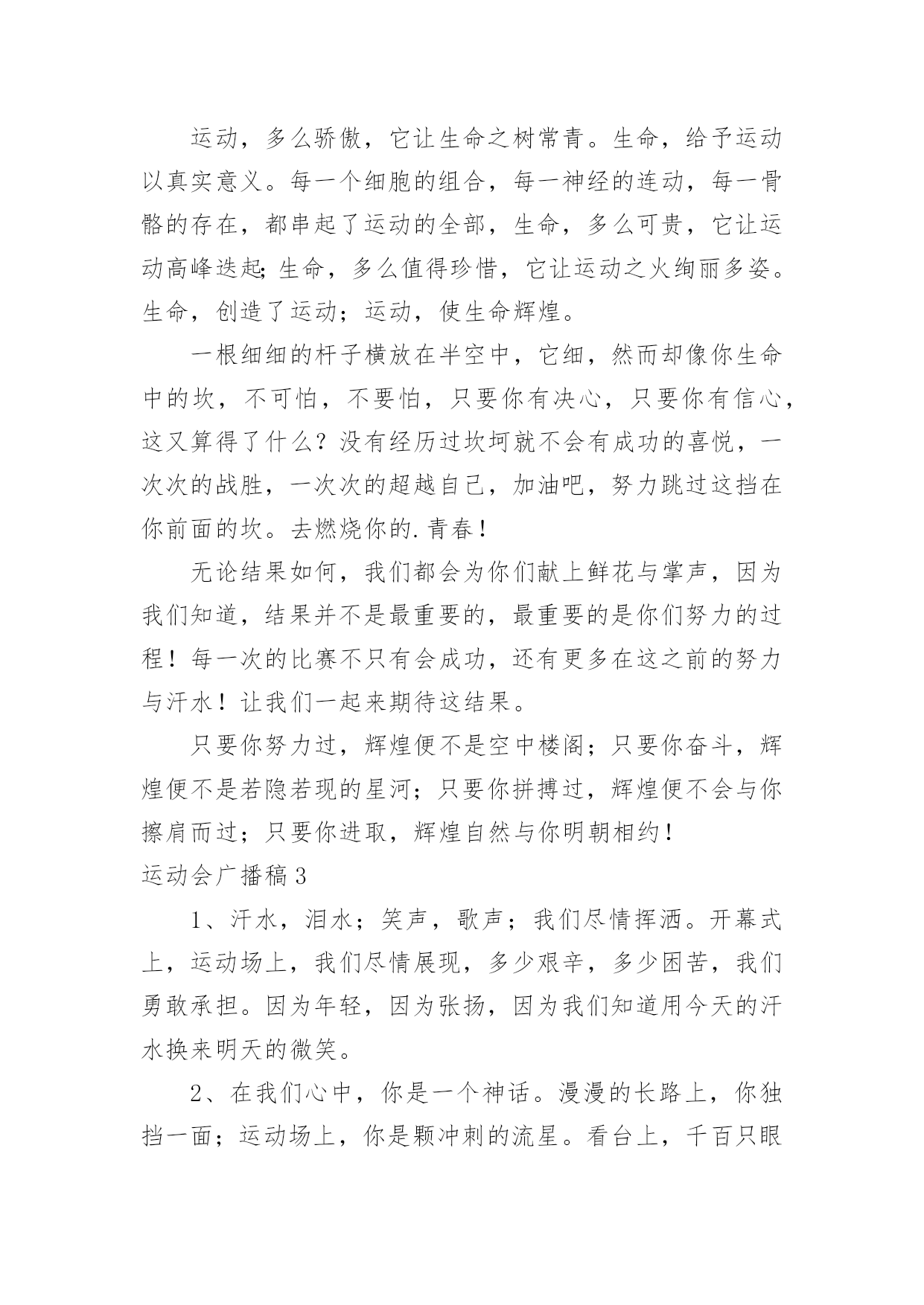 运动会广播稿运动会广播稿(精)在学校广播站锻炼的学生,大家广播前都会预先做好广播稿,广播稿写得好才会有好的节目效果,广播稿我们应该怎么写呢?下面是小编帮大家整理的运动会广播稿,仅供参考,大家一起来看看吧。运动会广播稿1不畏艰难,坚持不懈,斗志激昂、群策群力,“友谊第一,比赛第二”积极拼搏,赛出成绩,赛出风格,蓬勃向上的精神面貌迎接崭新的未来吧!挑战运动极限,演绎健美人学!互相学习,取长补短,再接再厉,勇攀高峰!不祈求太阳的光芒,也不肯用作月亮的伴娘。脚下的路要自己闯,不怕在黑暗中迷失方向;即使生命那么短暂,也无悔无憾,夜空上那道亮线,便是向命运最有力的挑战。当发令枪响起的那一瞬间;当铅球在手中即将掷出的`那一瞬间;当跨杆从你的腿下静止的那一瞬间;当沙坑就要等你去征服的那一瞬间;时间停止,空气凝固,每一个人的嘴里、心里,都在竭力呐喊。运动会广播稿2运动,多么骄傲,它让生命之树常青。生命,给予运动以真实意义。每一个细胞的组合,每一神经的连动,每一骨骼的存在,都串起了运动的全部,生命,多么可贵,它让运动高峰迭起;生命,多么值得珍惜,它让运动之火绚丽多姿。生命,创造了运动;运动,使生命辉煌。一根细细的杆子横放在半空中,它细,然而却像你生命中的坎,不可怕,不要怕,只要你有决心,只要你有信心,这又算得了什么?没有经历过坎坷就不会有成功的喜悦,一次次的战胜,一次次的超越自己,加油吧,努力跳过这挡在你前面的坎。去燃烧你的.青春!无论结果如何,我们都会为你们献上鲜花与掌声,因为我们知道,结果并不是最重要的,最重要的是你们努力的过程!每一次的比赛不只有会成功,还有更多在这之前的努力与汗水!让我们一起来期待这结果。只要你努力过,辉煌便不是空中楼阁;只要你奋斗,辉煌便不是若隐若现的星河;只要你拼搏过,辉煌便不会与你擦肩而过;只要你进取,辉煌自然与你明朝相约!运动会广播稿31、汗水,泪水;笑声,歌声;我们尽情挥洒。开幕式上,运动场上,我们尽情展现,多少艰辛,多少困苦,我们勇敢承担。因为年轻,因为张扬,因为我们知道用今天的汗水换来明天的微笑。2、在我们心中,你是一个神话。漫漫的长路上,你独挡一面;运动场上,你是颗冲刺的流星。看台上,千百只眼睛充满希望的望着你。加油!3、蔚蓝的天空下,有你矫健的身影,热闹的操场上,有你坚定的步伐,美丽的鲜花后有你辛勤的`汗水,我们的喝彩中,有你的自豪与骄傲!你的飒爽英姿,你的顽强拼搏,你的永不屈服,你的自我挑战,都深深地烙在每个人的心中,!拼搏者,你是赛场上最亮的点。拼搏者,你是生命乐章中最响的音符。场上的拼搏者,你是我们永远的骄傲!4、朋友,在你踏上跑道的那一刻,告诉自己,无论成功与否,微笑着跑完全程,只要年轻的心还在蓬勃的跳动,就要大声告诉自己——将信心进行到底。无论成功与否,我们永远铭记这充满奋斗印记的阳光灿烂的日子无论你成功与否,刹那属于你。而你,一定属于永恒!只要你拼搏了奋斗了,你就不必失望,你的生命已放出了闪光!运动会广播稿41、超越对手,超越自我,是我们的目标,我们的信念,在清凉的初秋,在喧嚣的田径场上,你们点燃了似火的热情,无论成败,我们都为你们感到自豪,你们永远是我们的骄傲!2、看!运动场上那一幕幕,无论是哭是笑,是喜是悲,其中都融入了他们的汗水辛劳。他们是真正的矫健者,是运动场上的骄儿,更是我们心中的英雄。加油吧!英雄们!每一份辛劳都有一份收获,每一次的痛苦都是快乐的开始,每一声呐喊都是力量的呼唤运动场上的健儿,掌声属于你们,鲜花属于你们,成功也是属于你们!3、踏着秋天的气息,迈着轻盈的脚步,我们迎来了心仪已久的运动会。那里就是展示自我的舞台。来吧,尽情释放你的活力。你的每一次冲刺,都叩动着我们的心弦;你的每一次跨越,都吸引着我们的视线;你的每一次起跳,都绷紧我们的神经。我们为你呐喊,我们为你自豪,我们为你疯狂。加油,xx班的你们永远是最棒的的!4、400米的跑道上,你正在飞驰,面对如此遥远的路途,你也许腿脚发麻,你也许有些茫然。但你可知道,在你身后,有同学们一双双期待的眼睛;在你身后,是你日日苦练的汗水。鼓起勇气,奋勇向前吧!5、不为鲜花的围绕,不为刹那的荣耀,只有执着的信念,化作不停的奔跑,心中燃烧着梦想,脚下不停的步伐,你用行动述说着过程的重要,没有无尽的终点,没有无法攀登的险峰,希望载着终点在向你微笑,拼搏吧!经历是一种精彩,迸发你全部的能量,成功是你汗水的写照。6、拼搏者,你是赛场上最亮的点。在你的眼中,不在乎胜利的欢乐和失败的眼泪,完全只是为了展示生命跳跃的节拍。拼搏者,你是生命乐章中最响的音符。在你的心中,只有不停拼搏的信念,用自己坚实的步伐去迈开人生新的旅程。场上的拼搏者,你是我们永远的'骄傲!7、秋风羽,天气淡淡的转凉。然而这人的`秋在今天更加迷人,不是因为它的秋高气爽,也不是因为
