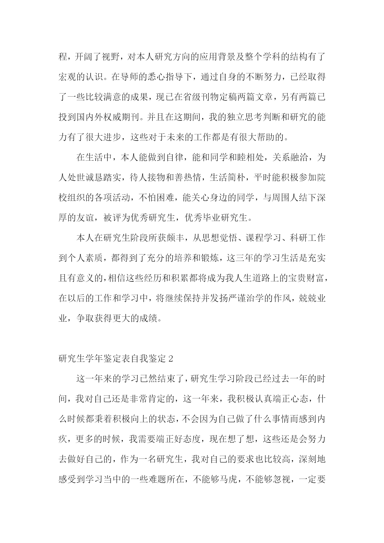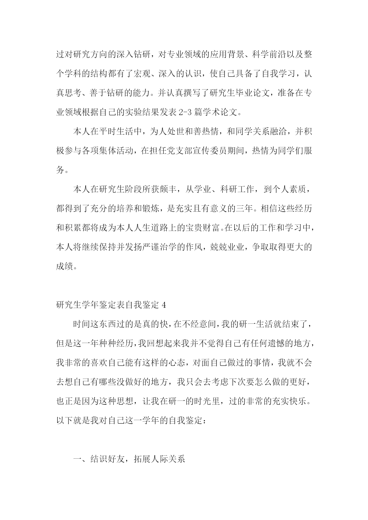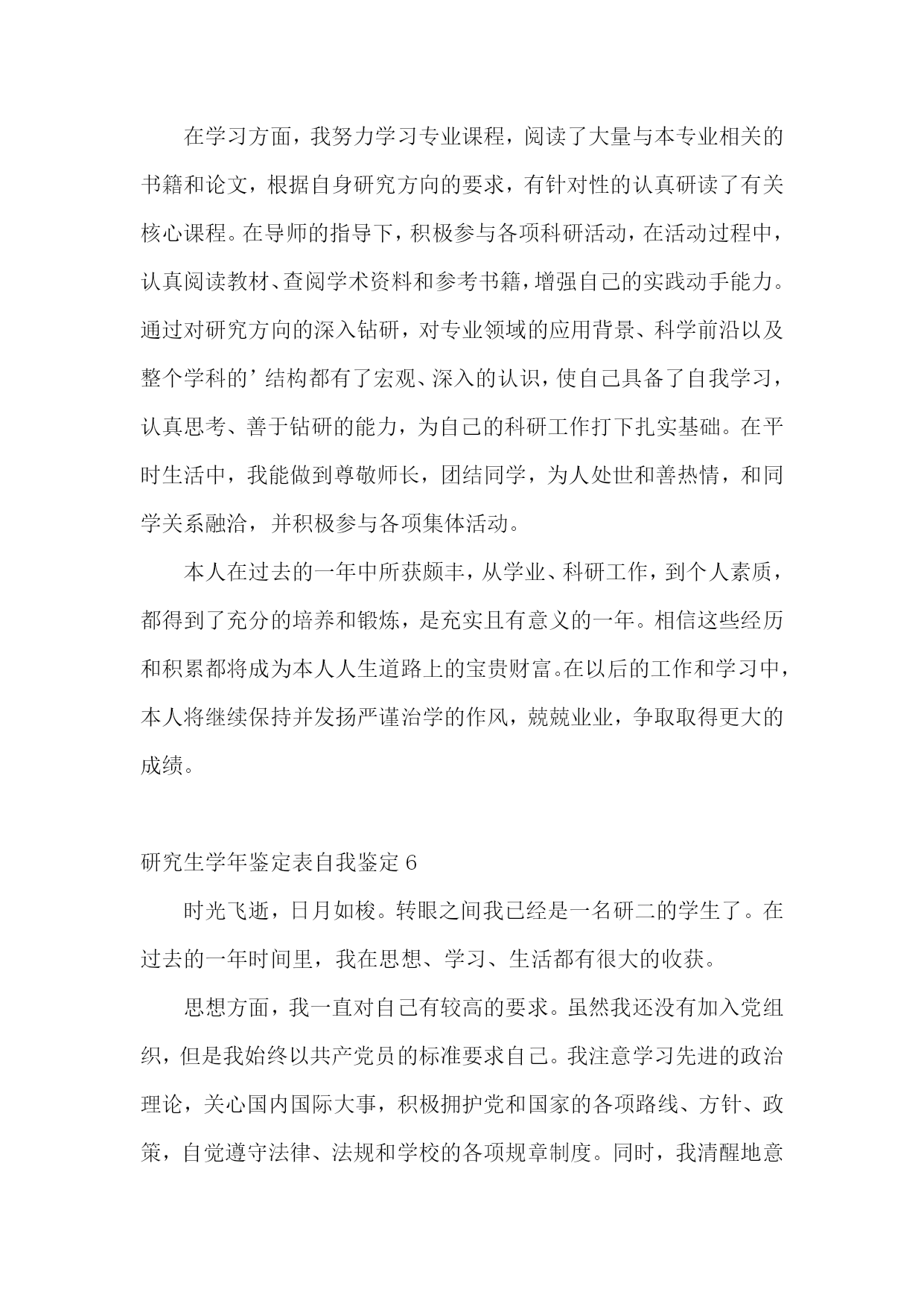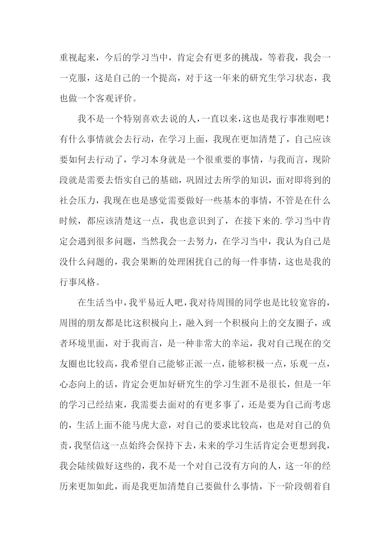 研究生学年鉴定表自我鉴定研究生学年鉴定表自我鉴定1自从20xx年x月成为一名硕士研究生以来,这三年我的学习、工作和生活是充实而有意义的,收获很多,成长很快,现做自我鉴定如下:在思想上,我认真学习马列主义、毛泽东思想、邓小平理论和“三个代表”重要思想,我关心时政,坚决拥护党的路线、方针和政策。我始终以一名优秀共产党员的高标准严格要求自己,能用科学的发展关来认识世界和社会,能清醒的意识到自己所担负的社会责任,对个人的人生理想和发展目标有了相对成熟的认识和定位。平时我能认真执行学习及学院的各项决议,关心学校的改革和发展,遵守学校的各项规章制度,具有良好的道德品质和思想修养。在专业课程的学习上,我学习态度端正,勤奋刻苦,成绩优秀,所修学分已经超出了研究生培养计划的要求。我在努力掌握好专业基础理论知识的同时还加强上机时间能力的培养,现能较熟练的设计和优化算法,并能运用Fortran和Matlab等工程通用语言实现数值算例程序。我已顺利通过了江苏省研究生学位英语水平考试,具备了良好的听、说、读、写能力,具备较强的`外文专业资料阅读和写作能力。在科研上,我的研究方向是偏微分方程数值解,在导师的指导下,我很快确定了自己的研究方向,并有针对性的认真研读了相关的书籍杂志,为自己的科研工作打下了扎实的基础,并涉猎了一部分其它课程,开阔了视野,对本人研究方向的应用背景及整个学科的结构有了宏观的认识。在导师的悉心指导下,通过自身的不断努力,已经取得了一些比较满意的成果,现已在省级刊物定稿两篇文章,另有两篇已投到国内外权威期刊。并且在这期间,我的独立思考判断和研究的能力有了很大进步,这些对于未来的工作都是有很大帮助的。在生活中,本人能做到自律,能和同学和睦相处,关系融洽,为人处世诚恳踏实,待人接物和善热情,生活简朴,平时能积极参加院校组织的各项活动,不怕困难,能关心身边的同学,与周围人结下深厚的友谊,被评为优秀研究生,优秀毕业研究生。本人在研究生阶段所获颇丰,从思想觉悟、课程学习、科研工作到个人素质,都得到了充分的培养和锻炼,这三年的学习生活是充实且有意义的,相信这些经历和积累都将成为我人生道路上的宝贵财富,在以后的工作和学习中,将继续保持并发扬严谨治学的作风,兢兢业业,争取获得更大的成绩。研究生学年鉴定表自我鉴定2这一年来的学习已然结束了,研究生学习阶段已经过去一年的时间,我对自己还是非常肯定的,这一年来,我积极认真端正心态,什么时候都秉着积极向上的状态,不会因为自己做了什么事情而感到内疚,更多的时候,我需要端正好态度,现在想了想,这些还是会努力去做好自己的,作为一名研究生,我对自己的要求也比较高,深刻地感受到学习当中的一些难题所在,不能够马虎,不能够忽视,一定要重视起来,今后的学习当中,肯定会有更多的挑战,等着我,我会一一克服,这是自己的一个提高,对于这一年来的研究生学习状态,我也做一个客观评价。我不是一个特别喜欢去说的人,一直以来,这也是我行事准则吧!有什么事情就会去行动,在学习上面,我现在更加清楚了,自己应该要如何去行动了,学习本身就是一个很重要的事情,与我而言,现阶段就是需要去悟实自己的基础,巩固过去所学的知识,面对即将到的社会压力,我现在也是感觉需要做好一些基本的事情,不管是在什么时候,都应该清楚这一点,我也意识到了,在接下来的.学习当中肯定会遇到很多问题,当然我会一去努力,在学习当中,我认为自己是没什么问题的,我会果断的处理困扰自己的每一件事情,这也是我的行事风格。在生活当中,我平易近人吧,我对待周围的同学也是比较宽容的,周围的朋友都是比这积极向上,融入到一个积极向上的交友圈子,或者环境里面,对于我而言,是一种非常大的幸运,我对自己现在的交友圈也比较高,我希望自己能够正派一点,能够积极一点,乐观一点,心态向上的话,肯定会更加好研究生的学习生涯不是很长,但是一年的学习已经结束,我需要去面对的有更多事了,还是要为自己而考虑的,生活上面不能马虎大意,对自己的要求比较高,也是对自己的负责,我坚信这一点始终会保持下去,未来的学习生活肯定会更想到我,我会陆续做好这些的,我不是一个对自己没有方向的人,这一年的经历来更加如此,而是我更加清楚自己要做什么事情,下一阶段朝着自己坚持的方向努力吧,肯定会有一定的收获。研究生学年鉴定表自我鉴定3时光荏苒,光阴流逛一转眼我已经是一名快毕业的研究生了。回首过去的一年,我觉得还是比较充实而有意义的,有很多收获,当然也有失落。总的来说自己成熟了很多。在这里对自己过去一年的学习、生活、科研及社会工作等做一个小结,目的是总结经验,发现不足之处,以利于今后继续发扬优点,弥补不足,为将来适应社会做好准备,把自己的人生道路走得更稳、更好,更快成材以服务于祖国和人民。先从政治思想和道德品质方面谈谈我这一