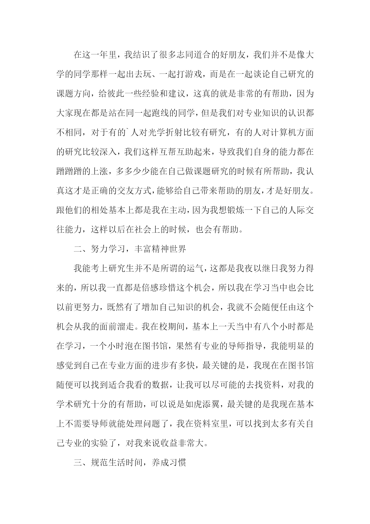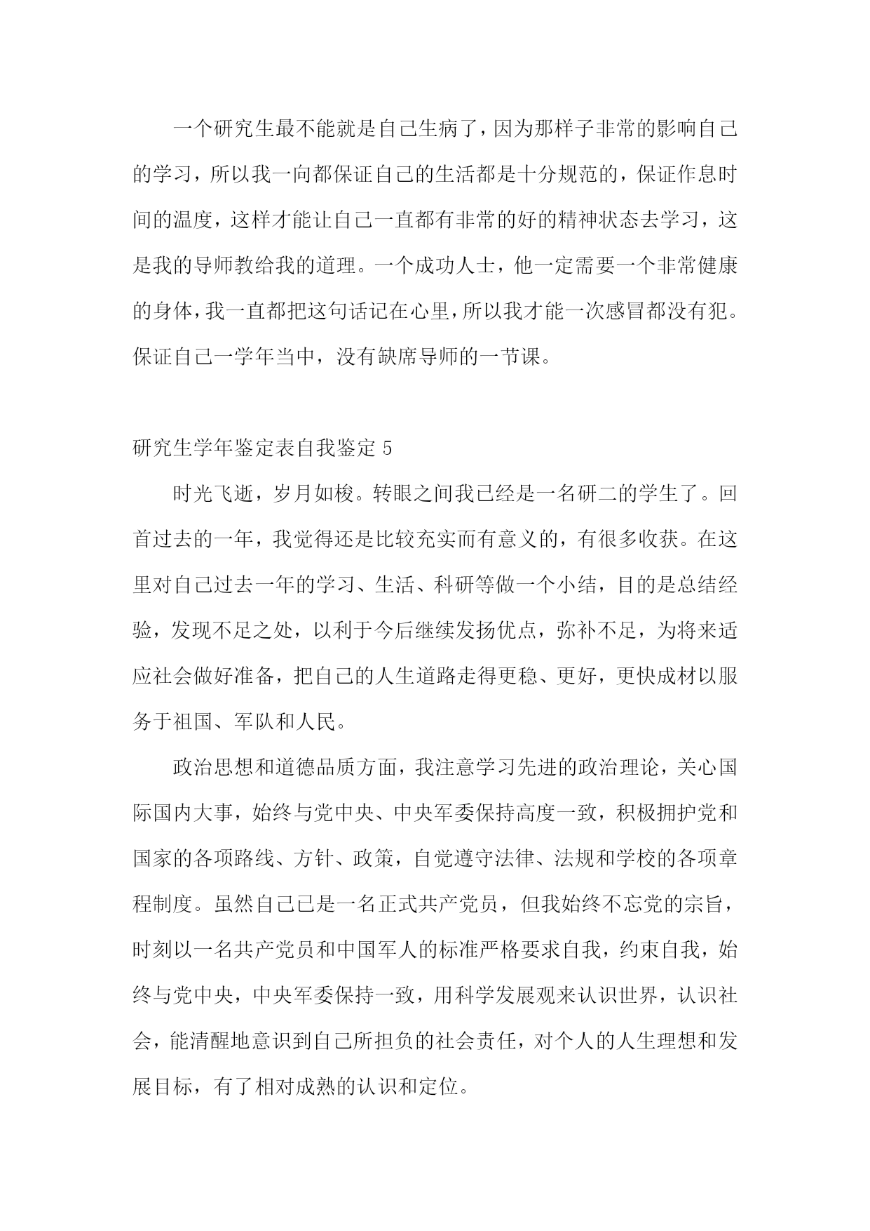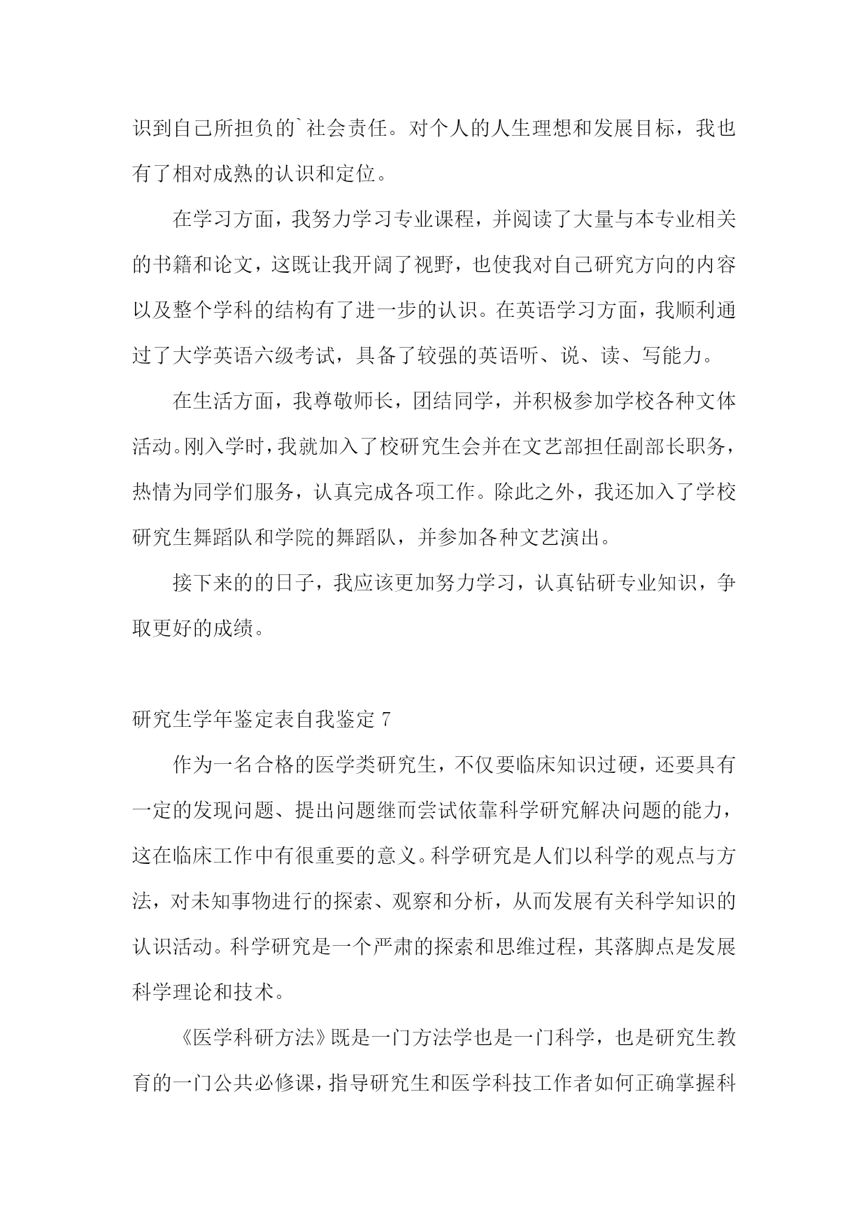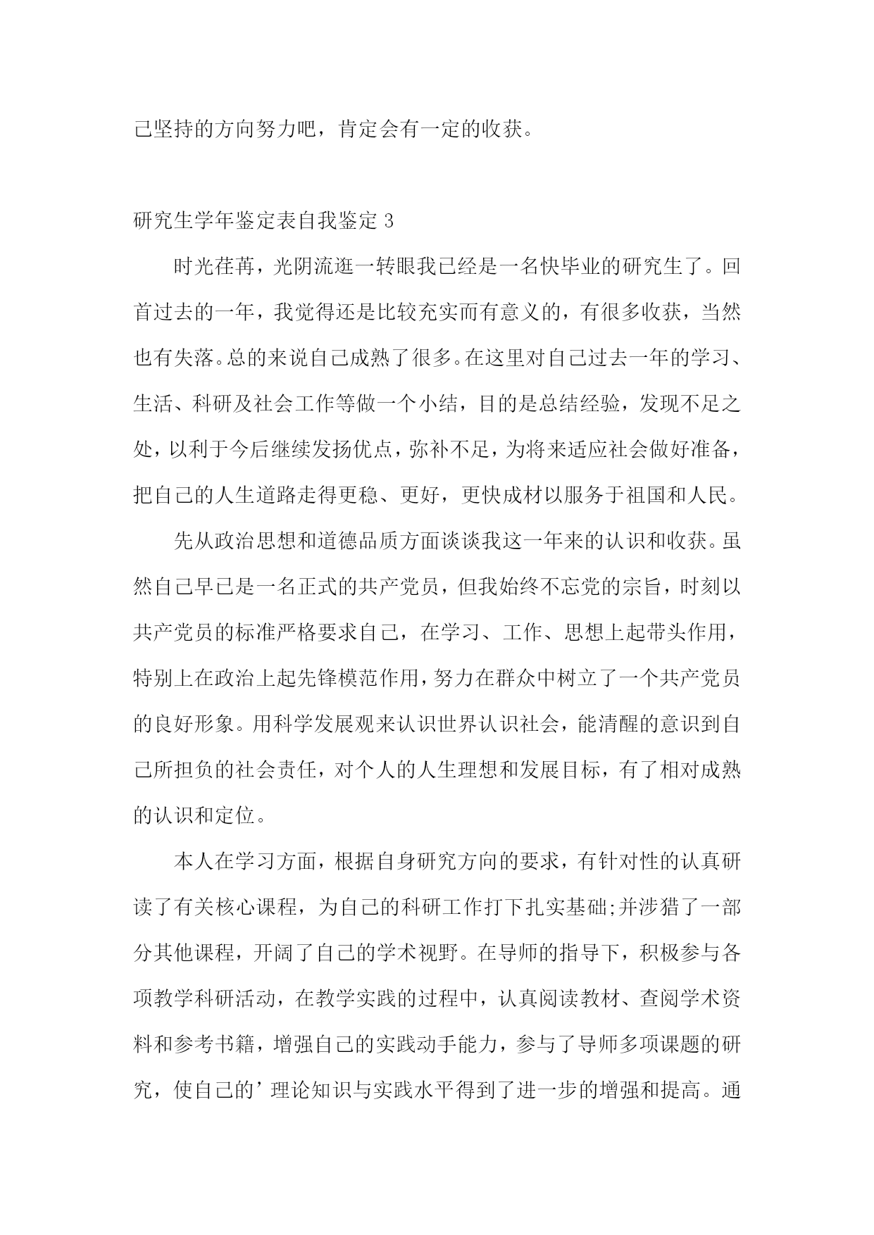 研究生学年鉴定表自我鉴定研究生学年鉴定表自我鉴定1自从20xx年x月成为一名硕士研究生以来,这三年我的学习、工作和生活是充实而有意义的,收获很多,成长很快,现做自我鉴定如下:在思想上,我认真学习马列主义、毛泽东思想、邓小平理论和“三个代表”重要思想,我关心时政,坚决拥护党的路线、方针和政策。我始终以一名优秀共产党员的高标准严格要求自己,能用科学的发展关来认识世界和社会,能清醒的意识到自己所担负的社会责任,对个人的人生理想和发展目标有了相对成熟的认识和定位。平时我能认真执行学习及学院的各项决议,关心学校的改革和发展,遵守学校的各项规章制度,具有良好的道德品质和思想修养。在专业课程的学习上,我学习态度端正,勤奋刻苦,成绩优秀,所修学分已经超出了研究生培养计划的要求。我在努力掌握好专业基础理论知识的同时还加强上机时间能力的培养,现能较熟练的设计和优化算法,并能运用Fortran和Matlab等工程通用语言实现数值算例程序。我已顺利通过了江苏省研究生学位英语水平考试,具备了良好的听、说、读、写能力,具备较强的`外文专业资料阅读和写作能力。在科研上,我的研究方向是偏微分方程数值解,在导师的指导下,我很快确定了自己的研究方向,并有针对性的认真研读了相关的书籍杂志,为自己的科研工作打下了扎实的基础,并涉猎了一部分其它课程,开阔了视野,对本人研究方向的应用背景及整个学科的结构有了宏观的认识。在导师的悉心指导下,通过自身的不断努力,已经取得了一些比较满意的成果,现已在省级刊物定稿两篇文章,另有两篇已投到国内外权威期刊。并且在这期间,我的独立思考判断和研究的能力有了很大进步,这些对于未来的工作都是有很大帮助的。在生活中,本人能做到自律,能和同学和睦相处,关系融洽,为人处世诚恳踏实,待人接物和善热情,生活简朴,平时能积极参加院校组织的各项活动,不怕困难,能关心身边的同学,与周围人结下深厚的友谊,被评为优秀研究生,优秀毕业研究生。本人在研究生阶段所获颇丰,从思想觉悟、课程学习、科研工作到个人素质,都得到了充分的培养和锻炼,这三年的学习生活是充实且有意义的,相信这些经历和积累都将成为我人生道路上的宝贵财富,在以后的工作和学习中,将继续保持并发扬严谨治学的作风,兢兢业业,争取获得更大的成绩。研究生学年鉴定表自我鉴定2这一年来的学习已然结束了,研究生学习阶段已经过去一年的时间,我对自己还是非常肯定的,这一年来,我积极认真端正心态,什么时候都秉着积极向上的状态,不会因为自己做了什么事情而感到内疚,更多的时候,我需要端正好态度,现在想了想,这些还是会努力去做好自己的,作为一名研究生,我对自己的要求也比较高,深刻地感受到学习当中的一些难题所在,不能够马虎,不能够忽视,一定要重视起来,今后的学习当中,肯定会有更多的挑战,等着我,我会一一克服,这是自己的一个提高,对于这一年来的研究生学习状态,我也做一个客观评价。我不是一个特别喜欢去说的人,一直以来,这也是我行事准则吧!有什么事情就会去行动,在学习上面,我现在更加清楚了,自己应该要如何去行动了,学习本身就是一个很重要的事情,与我而言,现阶段就是需要去悟实自己的基础,巩固过去所学的知识,面对即将到的社会压力,我现在也是感觉需要做好一些基本的事情,不管是在什么时候,都应该清楚这一点,我也意识到了,在接下来的.学习当中肯定会遇到很多问题,当然我会一去努力,在学习当中,我认为自己是没什么问题的,我会果断的处理困扰自己的每一件事情,这也是我的行事风格。在生活当中,我平易近人吧,我对待周围的同学也是比较宽容的,周围的朋友都是比这积极向上,融入到一个积极向上的交友圈子,或者环境里面,对于我而言,是一种非常大的幸运,我对自己现在的交友圈也比较高,我希望自己能够正派一点,能够积极一点,乐观一点,心态向上的话,肯定会更加好研究生的学习生涯不是很长,但是一年的学习已经结束,我需要去面对的有更多事了,还是要为自己而考虑的,生活上面不能马虎大意,对自己的要求比较高,也是对自己的负责,我坚信这一点始终会保持下去,未来的学习生活肯定会更想到我,我会陆续做好这些的,我不是一个对自己没有方向的人,这一年的经历来更加如此,而是我更加清楚自己要做什么事情,下一阶段朝着自己坚持的方向努力吧,肯定会有一定的收获。研究生学年鉴定表自我鉴定3时光荏苒,光阴流逛一转眼我已经是一名快毕业的研究生了。回首过去的一年,我觉得还是比较充实而有意义的,有很多收获,当然也有失落。总的来说自己成熟了很多。在这里对自己过去一年的学习、生活、科研及社会工作等做一个小结,目的是总结经验,发现不足之处,以利于今后继续发扬优点,弥补不足,为将来适应社会做好准备,把自己的人生道路走得更稳、更好,更快成材以服务于祖国和人民。先从政治思想和道德品质方面谈谈我这一