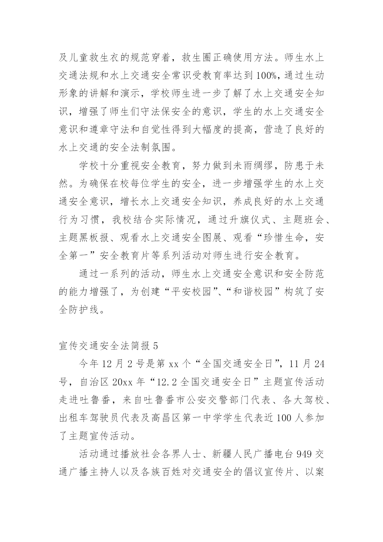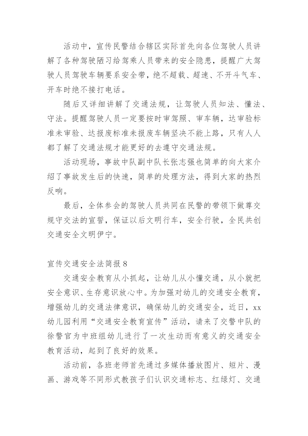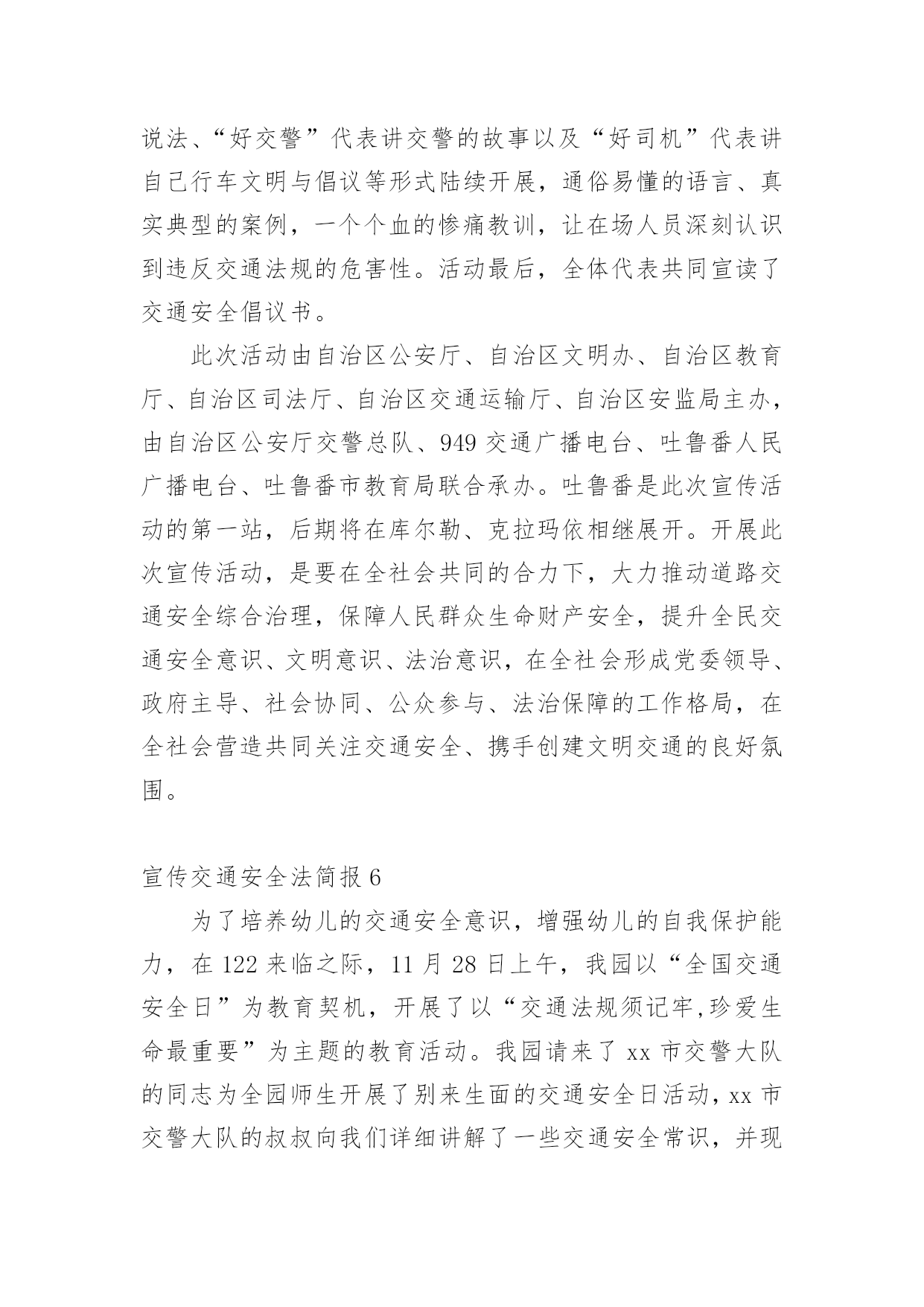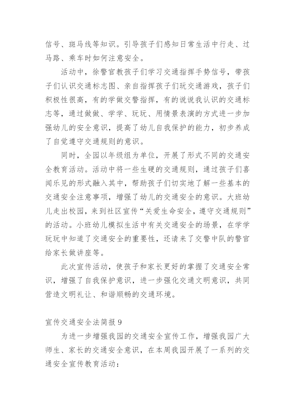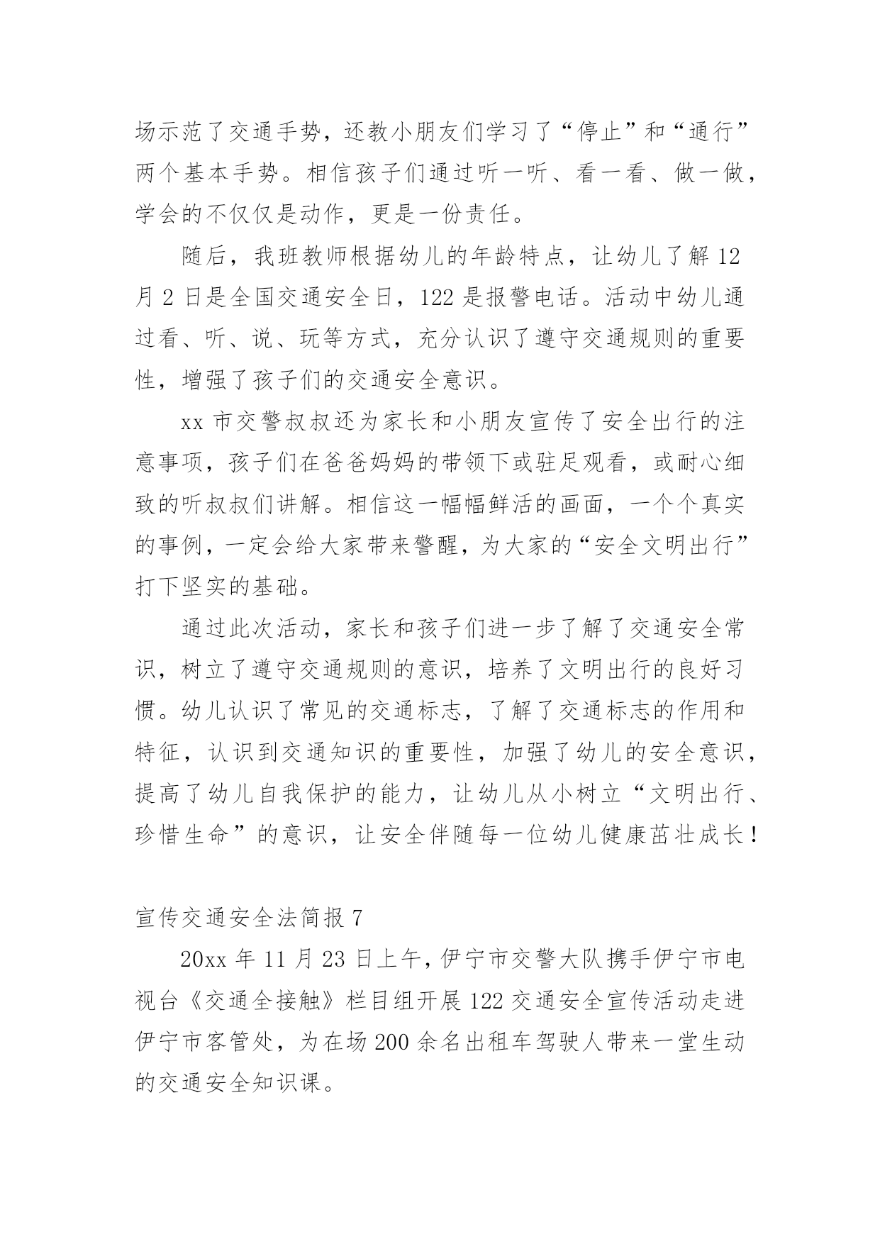 宣传交通安全法简报宣传交通安全法简报范文(精选20篇)在生活、工作和学习中,很多场合都离不了简报,简报的写作必须注意做到简短、明快,用尽可能少的文字说清楚必须说明的问题。还苦于找不到好的简报?以下是小编整理的宣传交通安全法简报范文(精选20篇),欢迎阅读,希望大家能够喜欢。宣传交通安全法简报1为了更好营造安全、有序、文明的校园周边交通环境,培养师生良好的交通安全意识,教育学生关爱生命、拒绝违章,严防道路交通事故,提高自我保护能力。为此,养正中心小学特邀晋江市公安局交警大队蔡忠警官一行来校给三年段1-4年级的学生作了交通安全主题宣教活动。讲座中,晋江市公安局交警大队李警官就同学们面临的交通环境、事故发生原因、交通法规、事故后怎么做等几个方面进行讲述,通报了近几年我县交通事故死伤和损失情况。讲座结合生活中的交通违规案例进行分析,用血的事实深入分析违反交通规则、违背交通道德带来的种种危害,强调在座的每一位学生要丰富交通安全知识,增强防范意识,遵守交通安全法规,提高自我保护能力。授课中,李警官根据破出校门就是路,车多的特点,教导学生如何在道路行走、如何过马路、如何乘车才会有安全保障;提醒大家若遇交通事故要保持冷静,及时报警,维持秩序;呼吁全体学生能“小手拉大手,同走文明路”。安全主题宣教活动结束后,同学们纷纷表示,交通安全关乎生命,要珍爱生命,就一定要安全出行,今后除了自觉遵守交通法规,还将努力做好小小宣传员,共同播撒平安的种子,收获更多的祥和、幸福和安宁,形成“珍爱生命,安全出行”的安全氛围,并且要提醒父母长辈,遵守交通规则,安全出行。宣传交通安全法简报2为进一步加强交通安全宣传教育,不断提升小学生交通安全防范意识,养成文明交通行为习惯,有效预防和减少涉及学生的道路交通事故,倡导绿色低碳出行方式,营造文明礼让、和谐顺畅的交通环境,近日,实验小学开展了交通安全系列宣传教育活动。实验小学通过国旗下讲话、宣传窗等开展形式多样、内容丰富的系列主题教育活动,邀请交警城区中队的警官开展交通安全知识进校园活动,发放交通安全知识宣传册,宣讲《道路交通安全法》,具体指导学生怎样走路、乘车、过路口,切实提升了小学生交通安全素质。发挥“小手拉大手”的辐射带动作用,鼓励学生不仅要做文明交通的实践者,还要努力当好宣传员,用自己学到的知识对家长、亲朋好友进行交通安全提醒,共同拒绝交通违法行为,做到安全文明出行。实验小学通过微信向家长宣传学校在交通安全方面需要家长配合的举措,倡导家长主动遵守交通法规,安全出行、文明出行、绿色出行。充分发挥教职员工文明出行模范带头作用,大力倡导教职员工文明出行、步行、乘坐公共交通、自行车出行。切实把体验式教育融入于社会课堂,让每个学生掌握候车、行走、过马路、上下车、乘车等交通参与的注意事项和要求,深刻领会遵守交通法规的重要性和必要性,增强安全意识,提高自我防范能力和危险情况下的自救能力,从源头上减少交通乱象发生,共同创造良好交通秩序。宣传交通安全法简报3为增强全体师生的交通安全意识,丰富交通安全知识,12月2日,在第xx个“全国交通安全日”到来之际,我校采用多种形式开展全国交通安全日主题教育活动。教育日期间,学校利用电子屏、校园网,倡导文明交通新风尚,将20xx年“全国交通安全日”活动主题、宣传口号等循环滚动显示在电子屏与校园网上,增强全体师生的交通安全意识,摒弃交通陋习,做到安全文明出行。召开主题班会,传播交通安全知识。各班利用班班通电子设备,展示了一幅幅近年来发生的一些交通事故图片,明确交通事故的严重危害,学习了交通信号、自行车行车安全、安全乘坐交通工具等安全知识,介绍了道路上存在的风险。开展主题板报、手抄报评比活动,营造班级教育文化氛围。活动中,各班师生群策群力,围绕安全教育主题对黑板报和手抄报进行了精心的设计,内容丰富,图文并茂,各具特色。孩子们在动手操作的同时,再一次了解了安全知识,增强了安全防范意识,营造了一个积极向上、安全、有序的班级教育文化氛围。发放致学生家长的一封信,共搭家校安全教育平台。通过发放致学生家长的一封信,让家长认识到交通安全教育的重要性,不可麻痹大意,掌握基本的交通安全知识,要求家长自觉遵守交通法规,加强对孩子的交通安全宣传教育,营造全民文明交通的氛围。此外,学校部分班级还采用了观影及交通安全知识问答的形式,让安全知识牢记于每位同学的心中,让交通安全事故远离师生。宣传交通安全法简报4为了普及学生水上交通法律法规知识,加强学生水上交通安全教育,增强学生水上安全意识。近日,广利砚洲安监会在砚洲小学开展了水上交通安全知识进校园活动,为该校师生宣讲了水上交通安全常识。鼎湖区广利小学砚洲分教点座落在风景秀丽的砚洲岛,四面环水。在日常生活中,学生需要购物和走亲访友时,要乘船过渡。为保证学生过渡的安全,砚洲安监