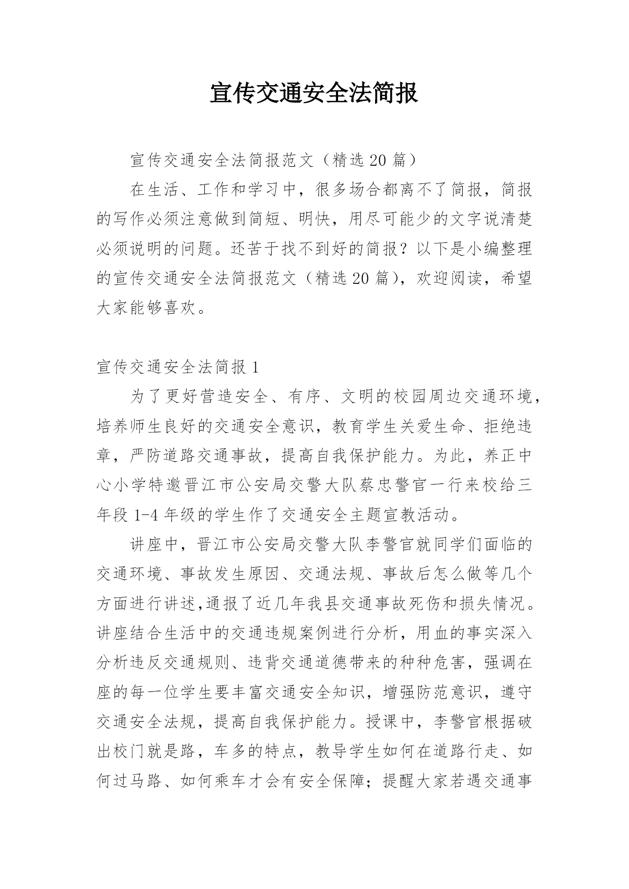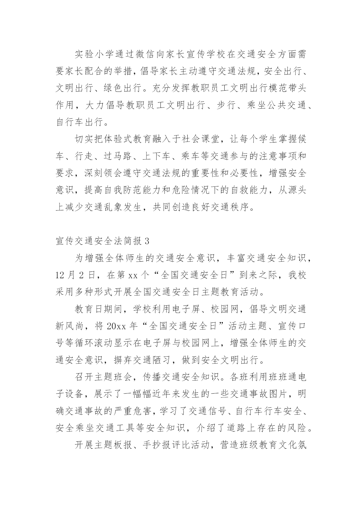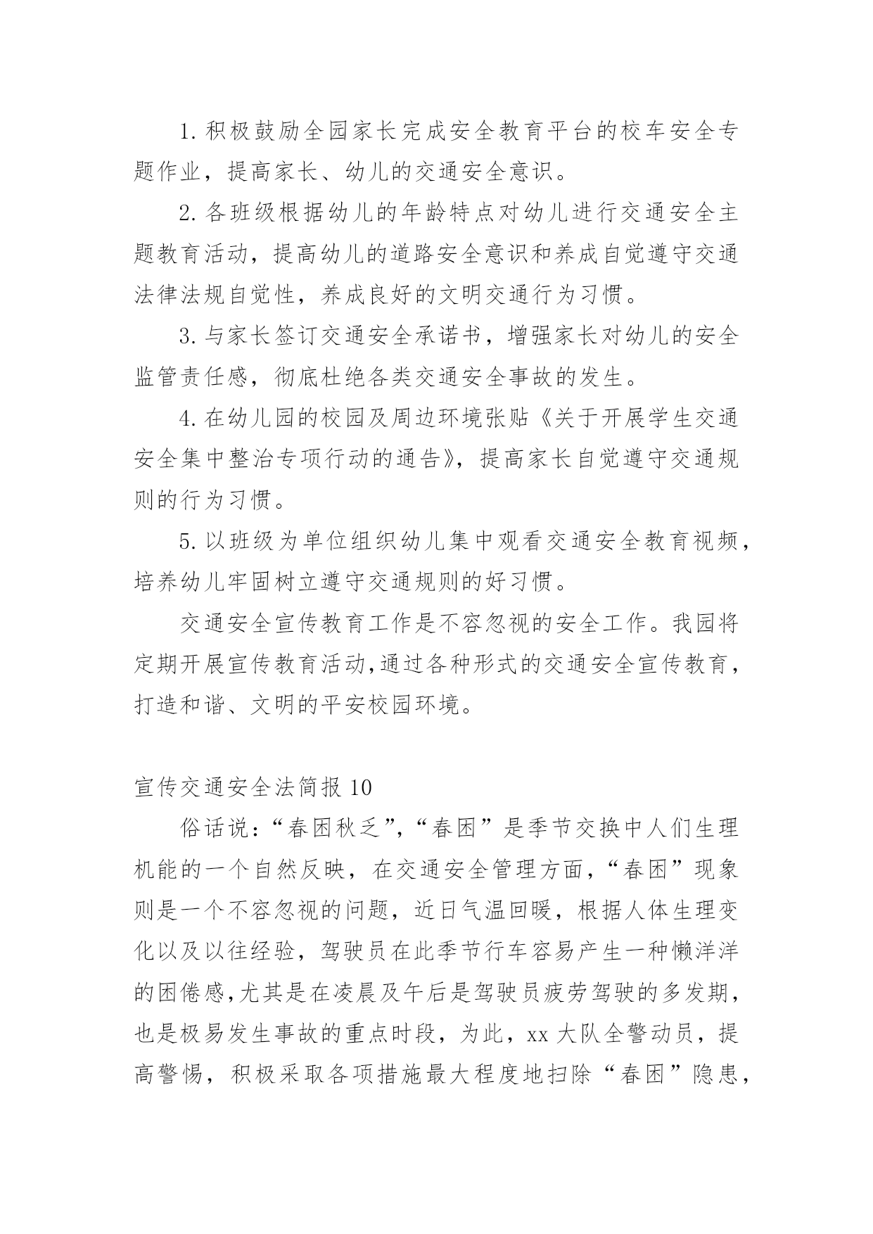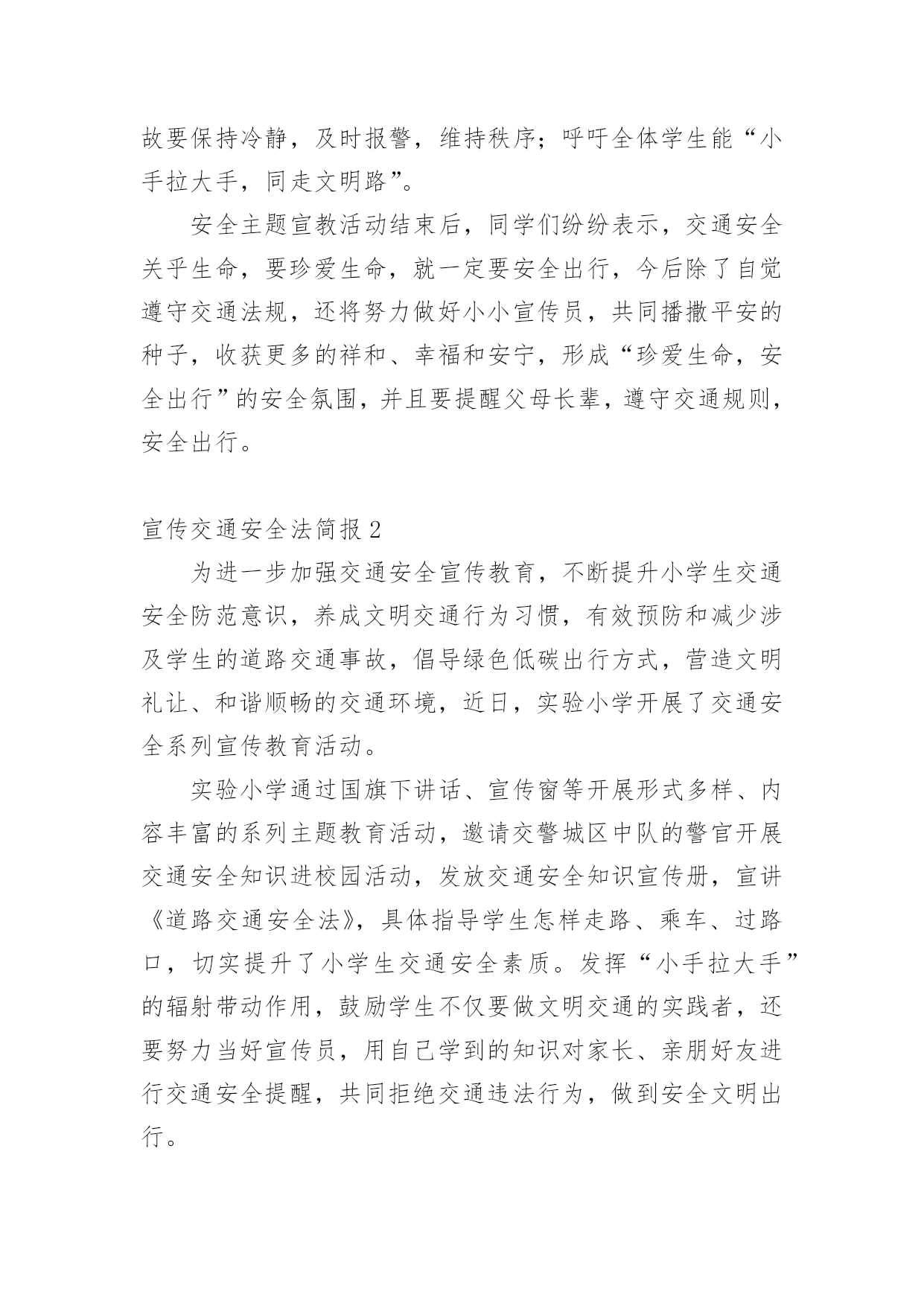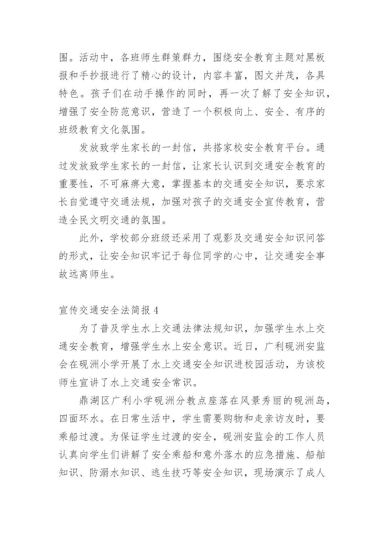 宣传交通安全法简报宣传交通安全法简报范文(精选20篇)在生活、工作和学习中,很多场合都离不了简报,简报的写作必须注意做到简短、明快,用尽可能少的文字说清楚必须说明的问题。还苦于找不到好的简报?以下是小编整理的宣传交通安全法简报范文(精选20篇),欢迎阅读,希望大家能够喜欢。宣传交通安全法简报1为了更好营造安全、有序、文明的校园周边交通环境,培养师生良好的交通安全意识,教育学生关爱生命、拒绝违章,严防道路交通事故,提高自我保护能力。为此,养正中心小学特邀晋江市公安局交警大队蔡忠警官一行来校给三年段1-4年级的学生作了交通安全主题宣教活动。讲座中,晋江市公安局交警大队李警官就同学们面临的交通环境、事故发生原因、交通法规、事故后怎么做等几个方面进行讲述,通报了近几年我县交通事故死伤和损失情况。讲座结合生活中的交通违规案例进行分析,用血的事实深入分析违反交通规则、违背交通道德带来的种种危害,强调在座的每一位学生要丰富交通安全知识,增强防范意识,遵守交通安全法规,提高自我保护能力。授课中,李警官根据破出校门就是路,车多的特点,教导学生如何在道路行走、如何过马路、如何乘车才会有安全保障;提醒大家若遇交通事故要保持冷静,及时报警,维持秩序;呼吁全体学生能“小手拉大手,同走文明路”。安全主题宣教活动结束后,同学们纷纷表示,交通安全关乎生命,要珍爱生命,就一定要安全出行,今后除了自觉遵守交通法规,还将努力做好小小宣传员,共同播撒平安的种子,收获更多的祥和、幸福和安宁,形成“珍爱生命,安全出行”的安全氛围,并且要提醒父母长辈,遵守交通规则,安全出行。宣传交通安全法简报2为进一步加强交通安全宣传教育,不断提升小学生交通安全防范意识,养成文明交通行为习惯,有效预防和减少涉及学生的道路交通事故,倡导绿色低碳出行方式,营造文明礼让、和谐顺畅的交通环境,近日,实验小学开展了交通安全系列宣传教育活动。实验小学通过国旗下讲话、宣传窗等开展形式多样、内容丰富的系列主题教育活动,邀请交警城区中队的警官开展交通安全知识进校园活动,发放交通安全知识宣传册,宣讲《道路交通安全法》,具体指导学生怎样走路、乘车、过路口,切实提升了小学生交通安全素质。发挥“小手拉大手”的辐射带动作用,鼓励学生不仅要做文明交通的实践者,还要努力当好宣传员,用自己学到的知识对家长、亲朋好友进行交通安全提醒,共同拒绝交通违法行为,做到安全文明出行。实验小学通过微信向家长宣传学校在交通安全方面需要家长配合的举措,倡导家长主动遵守交通法规,安全出行、文明出行、绿色出行。充分发挥教职员工文明出行模范带头作用,大力倡导教职员工文明出行、步行、乘坐公共交通、自行车出行。切实把体验式教育融入于社会课堂,让每个学生掌握候车、行走、过马路、上下车、乘车等交通参与的注意事项和要求,深刻领会遵守交通法规的重要性和必要性,增强安全意识,提高自我防范能力和危险情况下的自救能力,从源头上减少交通乱象发生,共同创造良好交通秩序。宣传交通安全法简报3为增强全体师生的交通安全意识,丰富交通安全知识,12月2日,在第xx个“全国交通安全日”到来之际,我校采用多种形式开展全国交通安全日主题教育活动。教育日期间,学校利用电子屏、校园网,倡导文明交通新风尚,将20xx年“全国交通安全日”活动主题、宣传口号等循环滚动显示在电子屏与校园网上,增强全体师生的交通安全意识,摒弃交通陋习,做到安全文明出行。召开主题班会,传播交通安全知识。各班利用班班通电子设备,展示了一幅幅近年来发生的一些交通事故图片,明确交通事故的严重危害,学习了交通信号、自行车行车安全、安全乘坐交通工具等安全知识,介绍了道路上存在的风险。开展主题板报、手抄报评比活动,营造班级教育文化氛围。活动中,各班师生群策群力,围绕安全教育主题对黑板报和手抄报进行了精心的设计,内容丰富,图文并茂,各具特色。孩子们在动手操作的同时,再一次了解了安全知识,增强了安全防范意识,营造了一个积极向上、安全、有序的班级教育文化氛围。发放致学生家长的一封信,共搭家校安全教育平台。通过发放致学生家长的一封信,让家长认识到交通安全教育的重要性,不可麻痹大意,掌握基本的交通安全知识,要求家长自觉遵守交通法规,加强对孩子的交通安全宣传教育,营造全民文明交通的氛围。此外,学校部分班级还采用了观影及交通安全知识问答的形式,让安全知识牢记于每位同学的心中,让交通安全事故远离师生。宣传交通安全法简报4为了普及学生水上交通法律法规知识,加强学生水上交通安全教育,增强学生水上安全意识。近日,广利砚洲安监会在砚洲小学开展了水上交通安全知识进校园活动,为该校师生宣讲了水上交通安全常识。鼎湖区广利小学砚洲分教点座落在风景秀丽的砚洲岛,四面环水。在日常生活中,学生需要购物和走亲访友时,要乘船过渡。为保证学生过渡的安全,砚洲安监