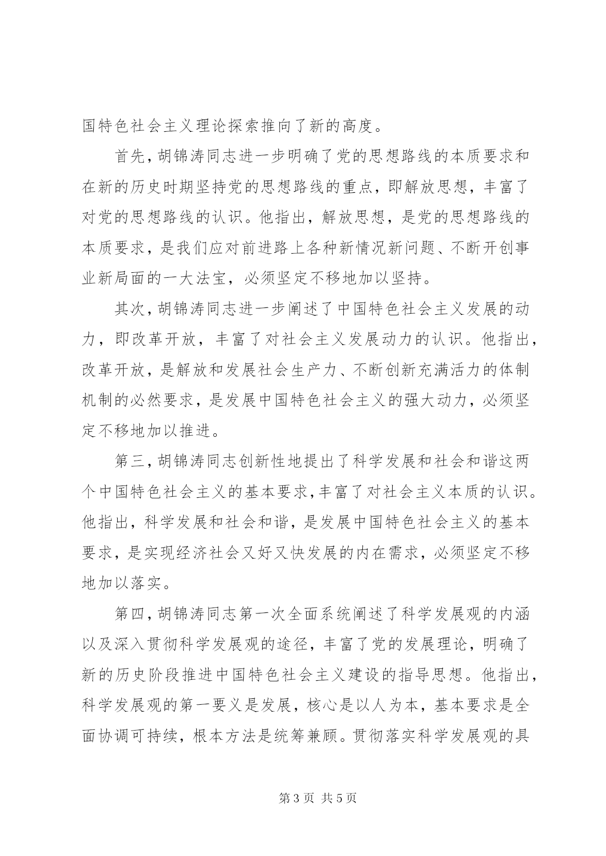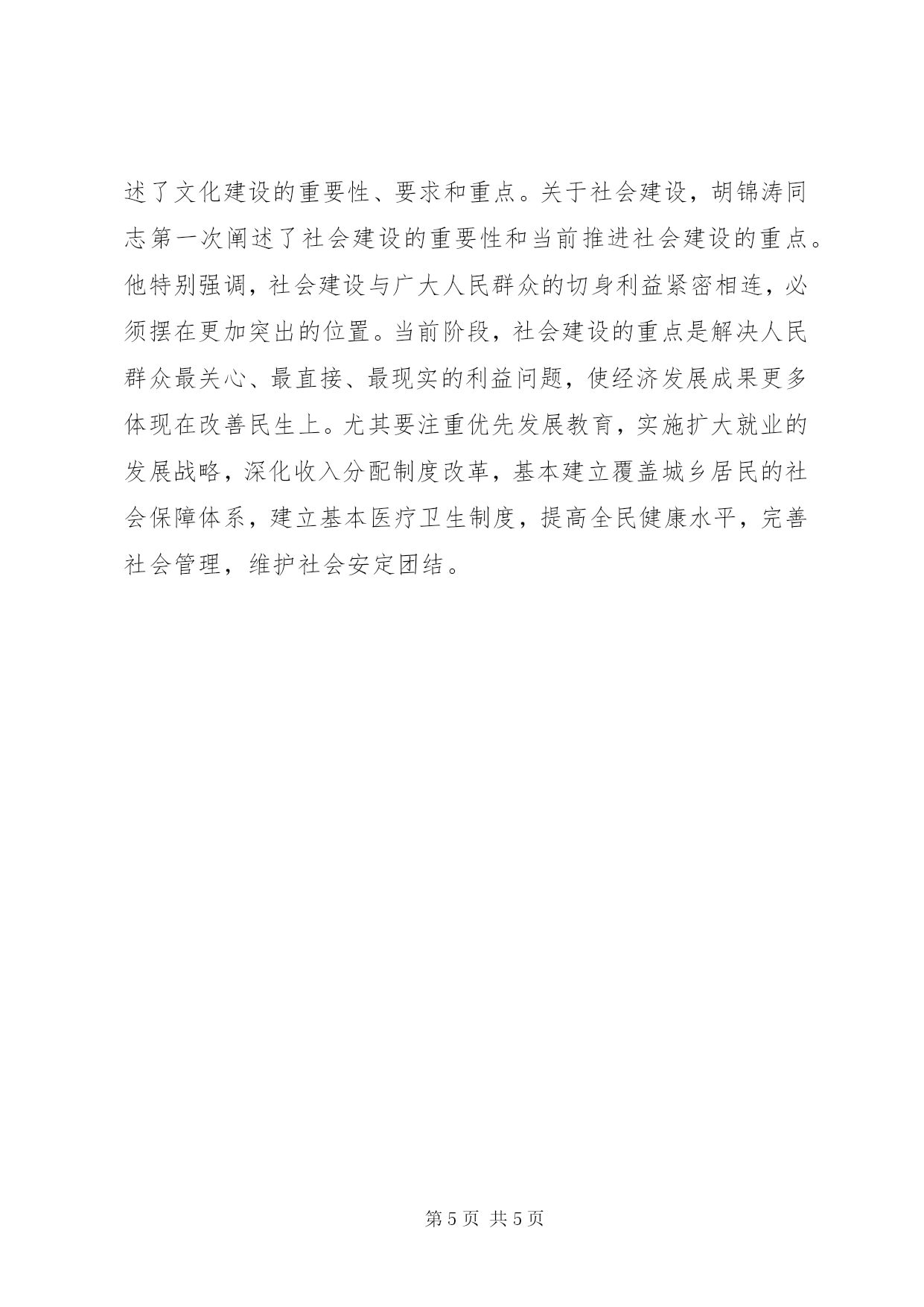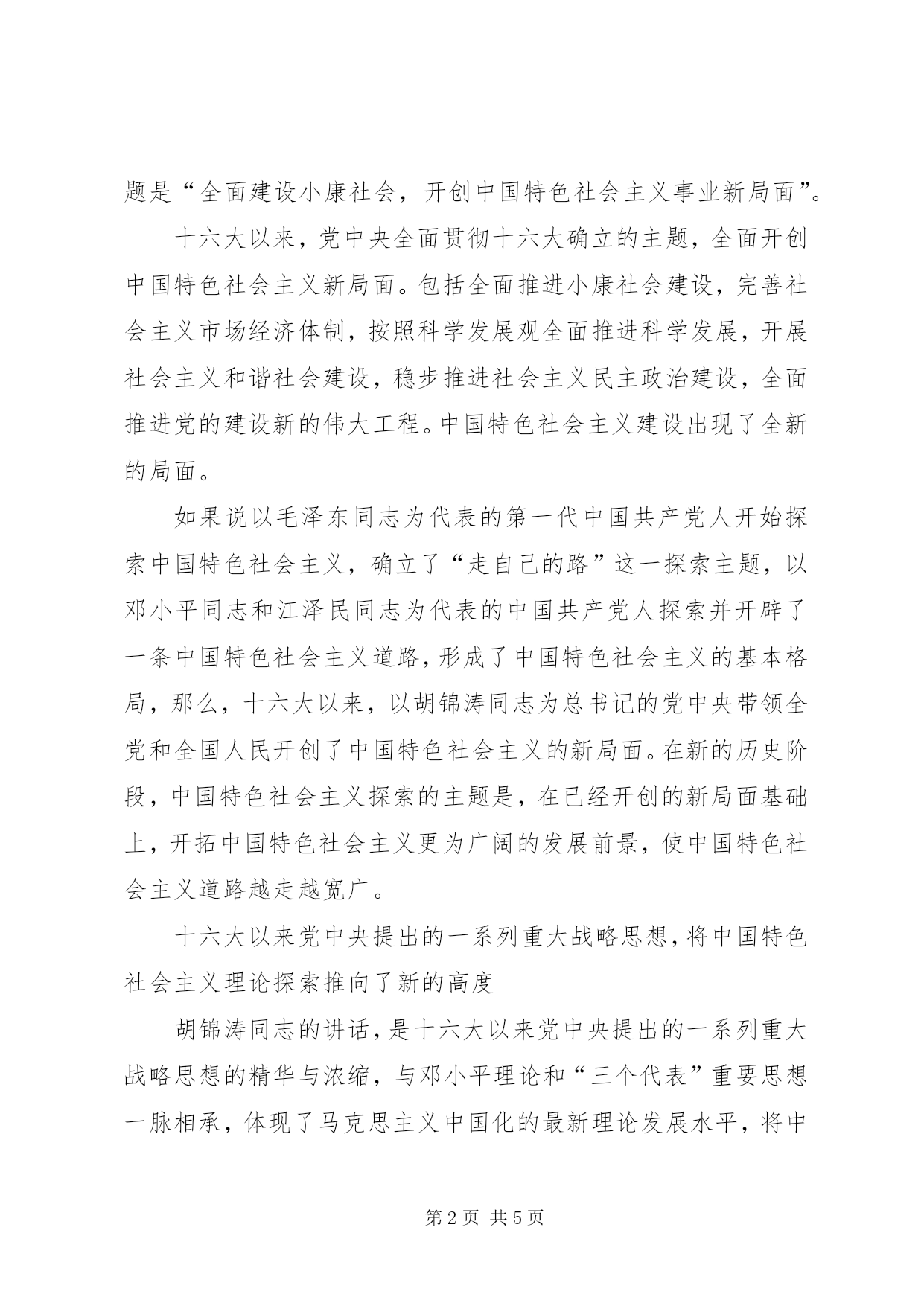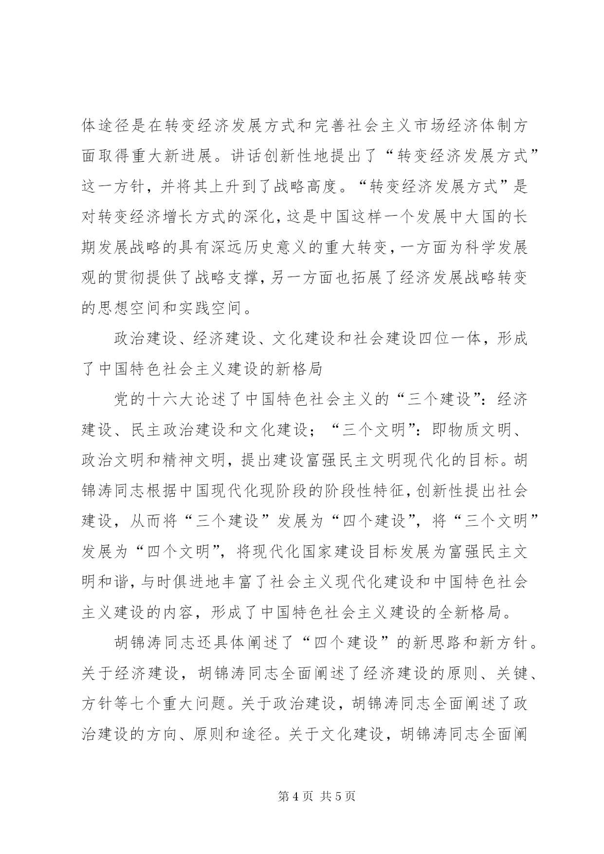第PAGE\*Arabic\*MERGEFORMAT5页共NUMPAGES\*MERGEFORMAT5页社会新阶段重要理论思考胡锦涛同志在“6·25”讲话中明确提出,要努力使中国特色社会主义道路越走越宽广,奋力开拓中国特色社会主义更为广阔的前景。这一论断的提出,标志着中国特色社会主义探索进入了新的阶段。新的历史阶段,中国共产党人的历史使命,就是开拓中国特色社会主义更为广阔的发展前景,使中国特色社会主义道路越走越宽广党的十六大以来,中国共产党人全面开创了中国特色社会主义的新局面,中国特色社会主义进入了新的历史阶段。胡锦涛同志指出,在这个阶段上,中国共产党人的历史使命,就是开拓中国特色社会主义更为广阔的发展前景,使中国特色社会主义道路越走越宽广。在党的十二大上,邓小平同志确立了建设有中国特色社会主义的主题。从十二大开始,党的全国代表大会都是以中国特色社会主义为主题。从历次党代会的主题可以看出这一点。十二大的主题是“全面开创社会主义现代化建设新局面”;十三大的主题是“沿着有中国特色的社会主义道路前进”;十四大的主题是“加快改革开放和现代化建设步伐,夺取有中国特色的社会主义事业的更大胜利”;十五大的主题是“高举邓小平理论伟大旗帜,把建设有中国特色的社会主义事业全面推向21世纪”;十六大的主题是“全面建设小康社会,开创中国特色社会主义事业新局面”。十六大以来,党中央全面贯彻十六大确立的主题,全面开创中国特色社会主义新局面。包括全面推进小康社会建设,完善社会主义市场经济体制,按照科学发展观全面推进科学发展,开展社会主义和谐社会建设,稳步推进社会主义民主政治建设,全面推进党的建设新的伟大工程。中国特色社会主义建设出现了全新的局面。如果说以毛泽东同志为代表的第一代中国共产党人开始探索中国特色社会主义,确立了“走自己的路”这一探索主题,以邓小平同志和江泽民同志为代表的中国共产党人探索并开辟了一条中国特色社会主义道路,形成了中国特色社会主义的基本格局,那么,十六大以来,以胡锦涛同志为总书记的党中央带领全党和全国人民开创了中国特色社会主义的新局面。在新的历史阶段,中国特色社会主义探索的主题是,在已经开创的新局面基础上,开拓中国特色社会主义更为广阔的发展前景,使中国特色社会主义道路越走越宽广。十六大以来党中央提出的一系列重大战略思想,将中国特色社会主义理论探索推向了新的高度胡锦涛同志的讲话,是十六大以来党中央提出的一系列重大战略思想的精华与浓缩,与邓小平理论和“三个代表”重要思想一脉相承,体现了马克思主义中国化的最新理论发展水平,将中国特色社会主义理论探索推向了新的高度。首先,胡锦涛同志进一步明确了党的思想路线的本质要求和在新的历史时期坚持党的思想路线的重点,即解放思想,丰富了对党的思想路线的认识。他指出,解放思想,是党的思想路线的本质要求,是我们应对前进路上各种新情况新问题、不断开创事业新局面的一大法宝,必须坚定不移地加以坚持。其次,胡锦涛同志进一步阐述了中国特色社会主义发展的动力,即改革开放,丰富了对社会主义发展动力的认识。他指出,改革开放,是解放和发展社会生产力、不断创新充满活力的体制机制的必然要求,是发展中国特色社会主义的强大动力,必须坚定不移地加以推进。第三,胡锦涛同志创新性地提出了科学发展和社会和谐这两个中国特色社会主义的基本要求,丰富了对社会主义本质的认识。他指出,科学发展和社会和谐,是发展中国特色社会主义的基本要求,是实现经济社会又好又快发展的内在需求,必须坚定不移地加以落实。第四,胡锦涛同志第一次全面系统阐述了科学发展观的内涵以及深入贯彻科学发展观的途径,丰富了党的发展理论,明确了新的历史阶段推进中国特色社会主义建设的指导思想。他指出,科学发展观的第一要义是发展,核心是以人为本,基本要求是全面协调可持续,根本方法是统筹兼顾。贯彻落实科学发展观的具体途径是在转变经济发展方式和完善社会主义市场经济体制方面取得重大新进展。讲话创新性地提出了“转变经济发展方式”这一方针,并将其上升到了战略高度。“转变经济发展方式”是对转变经济增长方式的深化,这是中国这样一个发展中大国的长期发展战略的具有深远历史意义的重大转变,一方面为科学发展观的贯彻提供了战略支撑,另一方面也拓展了经济发展战略转变的思想空间和实践空间。政治建设、经济建设、文化建设和社会建设四位一体,形成了中国特色社会主义建设的新格局党的十六大论述了中国特色社会主义的“三个建设”:经济建设、民主政治建设和文化建设;“三个文明”:即物质文明、政治文明和精神文明,提出建设富强民主文明现代化的目标。胡锦涛同志根据中国现代化现阶段的阶段性特征,创新性提出社会建设,从而将“三个建设”发展为“四个建设”,将“三个文明”发展为“四个文明”,将现代化国家建设目标发展为富强民主文明和