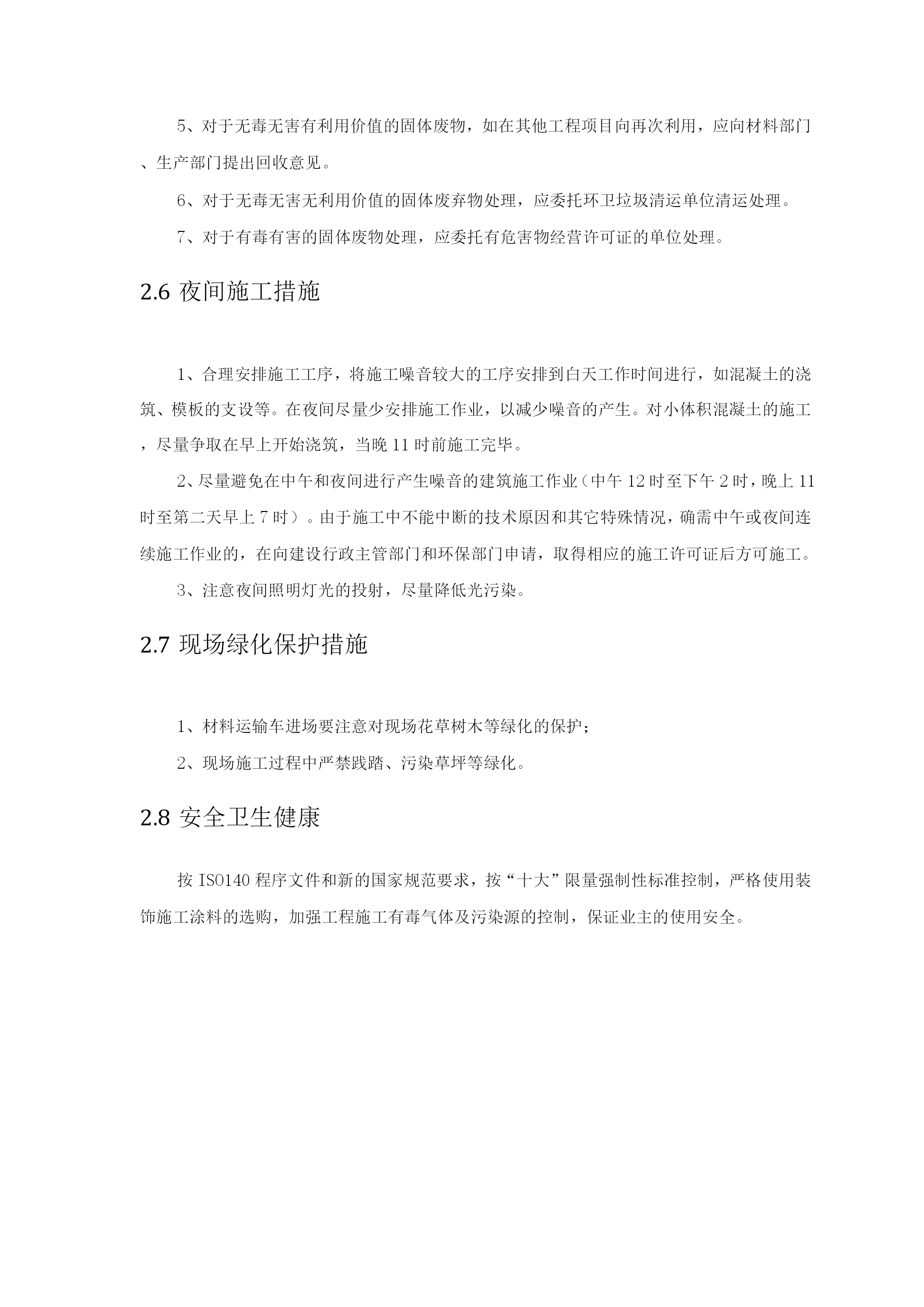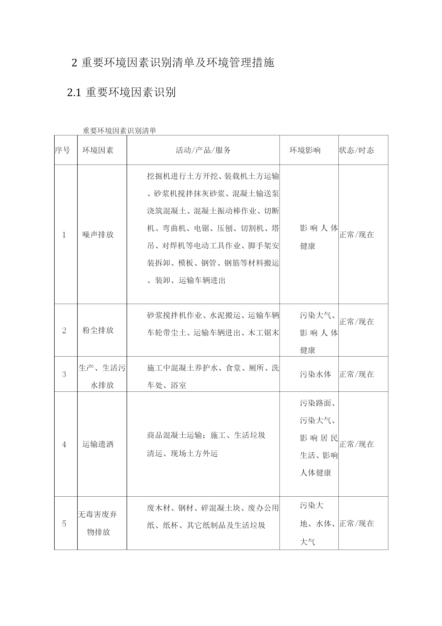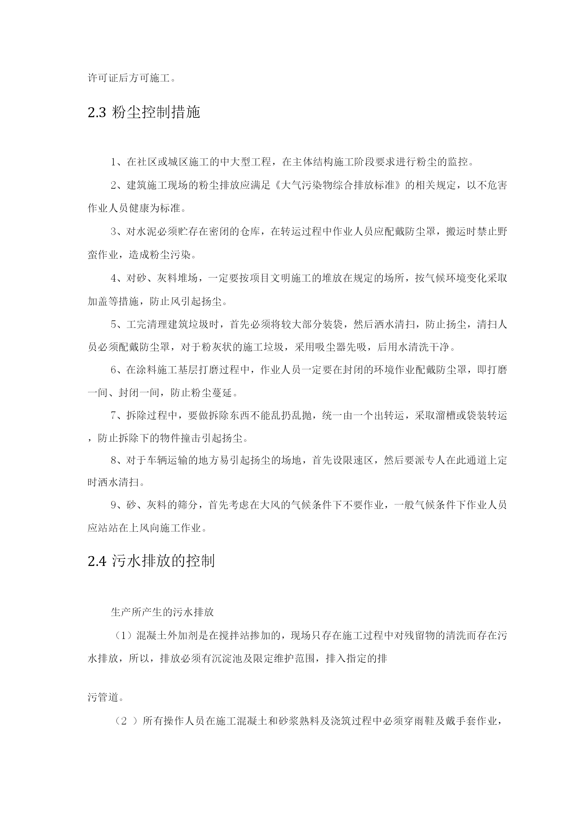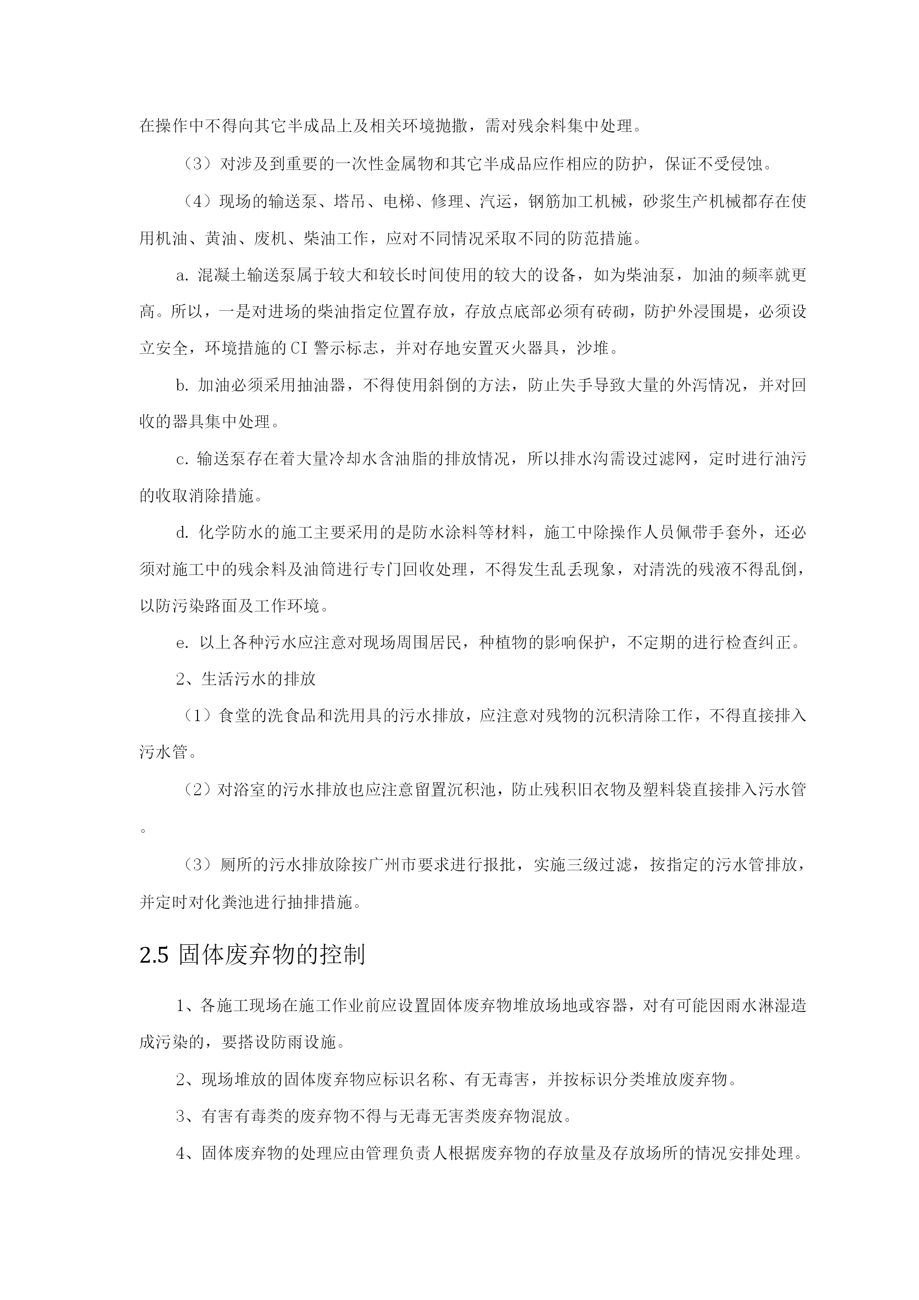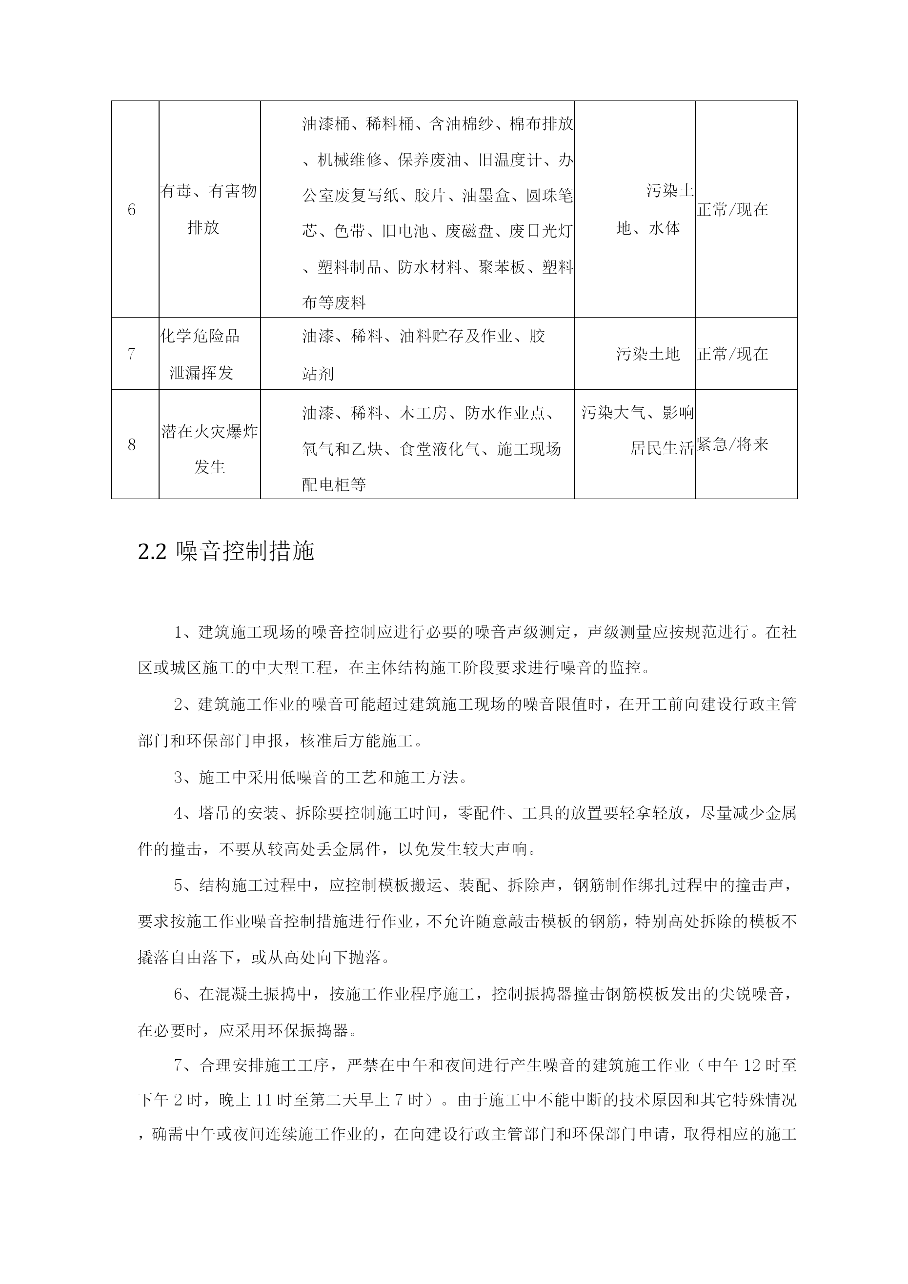 环保管理体系与措施1环保管理体系投入相应人、财、物2重要环境因素识别清单及环境管理措施2.1重要环境因素识别重要环境因素识别清单序号环境因素活动/产品/服务环境影响状态/时态1噪声排放挖掘机进行土方开挖、装载机土方运输、砂浆机搅拌抹灰砂浆、混凝土输送泵浇筑混凝土、混凝土振动棒作业、切断机、弯曲机、电锯、压刨、切割机、塔吊、对焊机等电动工具作业、脚手架安装拆卸、模板、钢管、钢筋等材料搬运、装卸、运输车辆进出影响人体健康正常/现在2粉尘排放砂浆搅拌机作业、水泥搬运、运输车辆车轮带尘土、运输车辆进出、木工锯末污染大气、影响人体健康正常/现在3生产、生活污水排放施工中混凝土养护水、食堂、厕所、洗车处、浴室污染水体正常/现在4运输遗洒商品混凝土运输;施工、生活垃圾清运、现场土方外运污染路面、污染大气、影响居民生活、影响人体健康正常/现在5无毒害废弃物排放废木材、钢材、碎混凝土块、废办公用纸、纸杯、其它纸制品及生活垃圾污染大地、水体、大气正常/现在6有毒、有害物排放油漆桶、稀料桶、含油棉纱、棉布排放、机械维修、保养废油、旧温度计、办公室废复写纸、胶片、油墨盒、圆珠笔芯、色带、旧电池、废磁盘、废日光灯、塑料制品、防水材料、聚苯板、塑料布等废料污染土地、水体正常/现在7化学危险品泄漏挥发油漆、稀料、油料贮存及作业、胶站剂污染土地正常/现在8潜在火灾爆炸发生油漆、稀料、木工房、防水作业点、氧气和乙炔、食堂液化气、施工现场配电柜等污染大气、影响居民生活紧急/将来2.2噪音控制措施1、建筑施工现场的噪音控制应进行必要的噪音声级测定,声级测量应按规范进行。在社区或城区施工的中大型工程,在主体结构施工阶段要求进行噪音的监控。2、建筑施工作业的噪音可能超过建筑施工现场的噪音限值时,在开工前向建设行政主管部门和环保部门申报,核准后方能施工。3、施工中采用低噪音的工艺和施工方法。4、塔吊的安装、拆除要控制施工时间,零配件、工具的放置要轻拿轻放,尽量减少金属件的撞击,不要从较高处丢金属件,以免发生较大声响。5、结构施工过程中,应控制模板搬运、装配、拆除声,钢筋制作绑扎过程中的撞击声,要求按施工作业噪音控制措施进行作业,不允许随意敲击模板的钢筋,特别高处拆除的模板不撬落自由落下,或从高处向下抛落。6、在混凝土振捣中,按施工作业程序施工,控制振捣器撞击钢筋模板发出的尖锐噪音,在必要时,应采用环保振捣器。7、合理安排施工工序,严禁在中午和夜间进行产生噪音的建筑施工作业(中午12时至下午2时,晚上11时至第二天早上7时)。由于施工中不能中断的技术原因和其它特殊情况,确需中午或夜间连续施工作业的,在向建设行政主管部门和环保部门申请,取得相应的施工许可证后方可施工。2.3粉尘控制措施1、在社区或城区施工的中大型工程,在主体结构施工阶段要求进行粉尘的监控。2、建筑施工现场的粉尘排放应满足《大气污染物综合排放标准》的相关规定,以不危害作业人员健康为标准。3、对水泥必须贮存在密闭的仓库,在转运过程中作业人员应配戴防尘罩,搬运时禁止野蛮作业,造成粉尘污染。4、对砂、灰料堆场,一定要按项目文明施工的堆放在规定的场所,按气候环境变化采取加盖等措施,防止风引起扬尘。5、工完清理建筑垃圾时,首先必须将较大部分装袋,然后洒水清扫,防止扬尘,清扫人员必须配戴防尘罩,对于粉灰状的施工垃圾,采用吸尘器先吸,后用水清洗干净。6、在涂料施工基层打磨过程中,作业人员一定要在封闭的环境作业配戴防尘罩,即打磨一间、封闭一间,防止粉尘蔓延。7、拆除过程中,要做拆除东西不能乱扔乱抛,统一由一个出转运,采取溜槽或袋装转运,防止拆除下的物件撞击引起扬尘。8、对于车辆运输的地方易引起扬尘的场地,首先设限速区,然后要派专人在此通道上定时洒水清扫。9、砂、灰料的筛分,首先考虑在大风的气候条件下不要作业,一般气候条件下作业人员应站站在上风向施工作业。2.4污水排放的控制生产所产生的污水排放(1)混凝土外加剂是在搅拌站掺加的,现场只存在施工过程中对残留物的清洗而存在污水排放,所以,排放必须有沉淀池及限定维护范围,排入指定的排污管道。(2)所有操作人员在施工混凝土和砂浆熟料及浇筑过程中必须穿雨鞋及戴手套作业,在操作中不得向其它半成品上及相关环境抛撒,需对残余料集中处理。(3)对涉及到重要的一次性金属物和其它半成品应作相应的防护,保证不受侵蚀。(4)现场的输送泵、塔吊、电梯、修理、汽运,钢筋加工机械,砂浆生产机械都存在使用机油、黄油、废机、柴油工作,应对不同情况采取不同的防范措施。混凝土输送泵属于较大和较长时间使用的较大的设备,如为柴油泵,加油的频率就更高。所以,