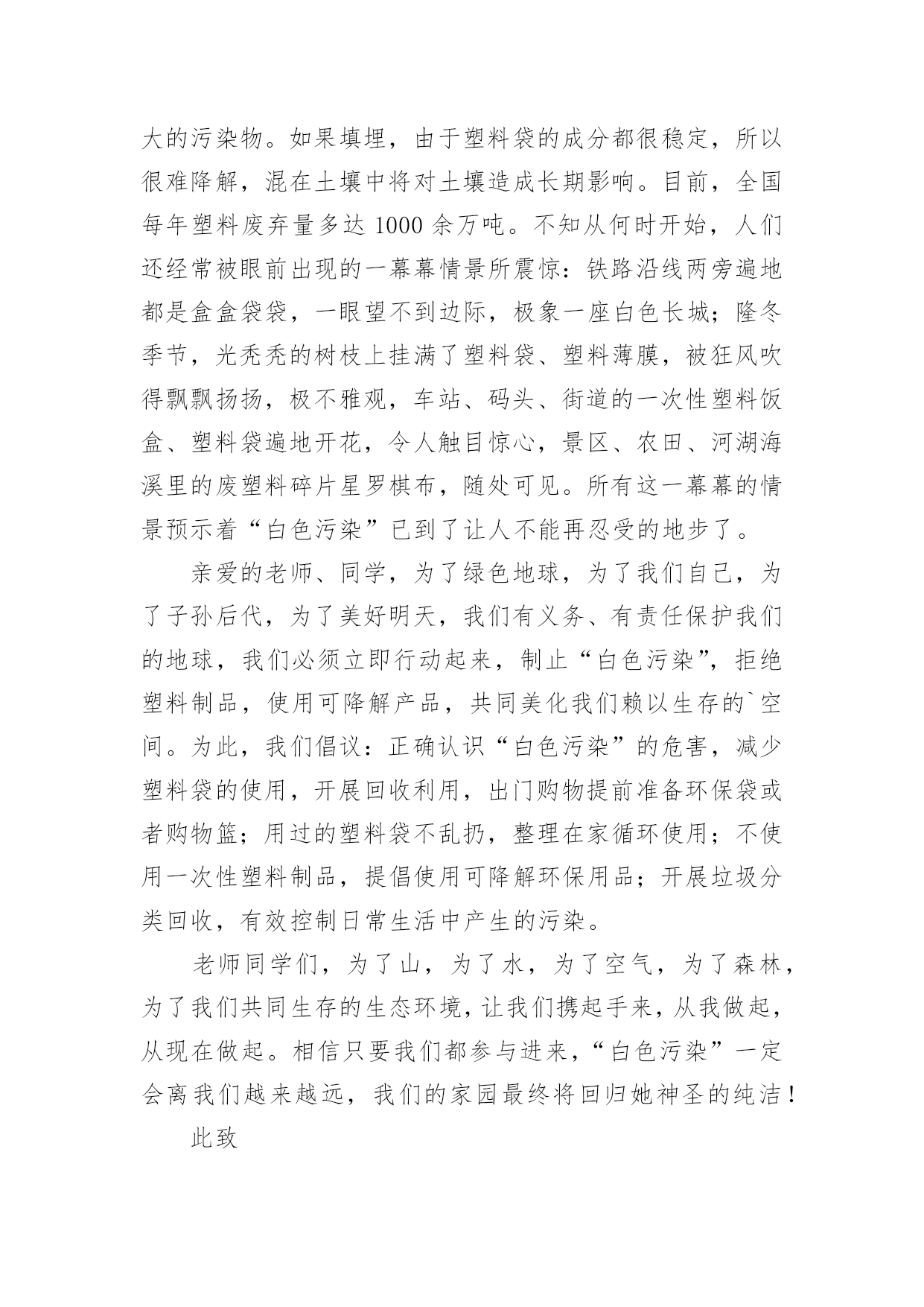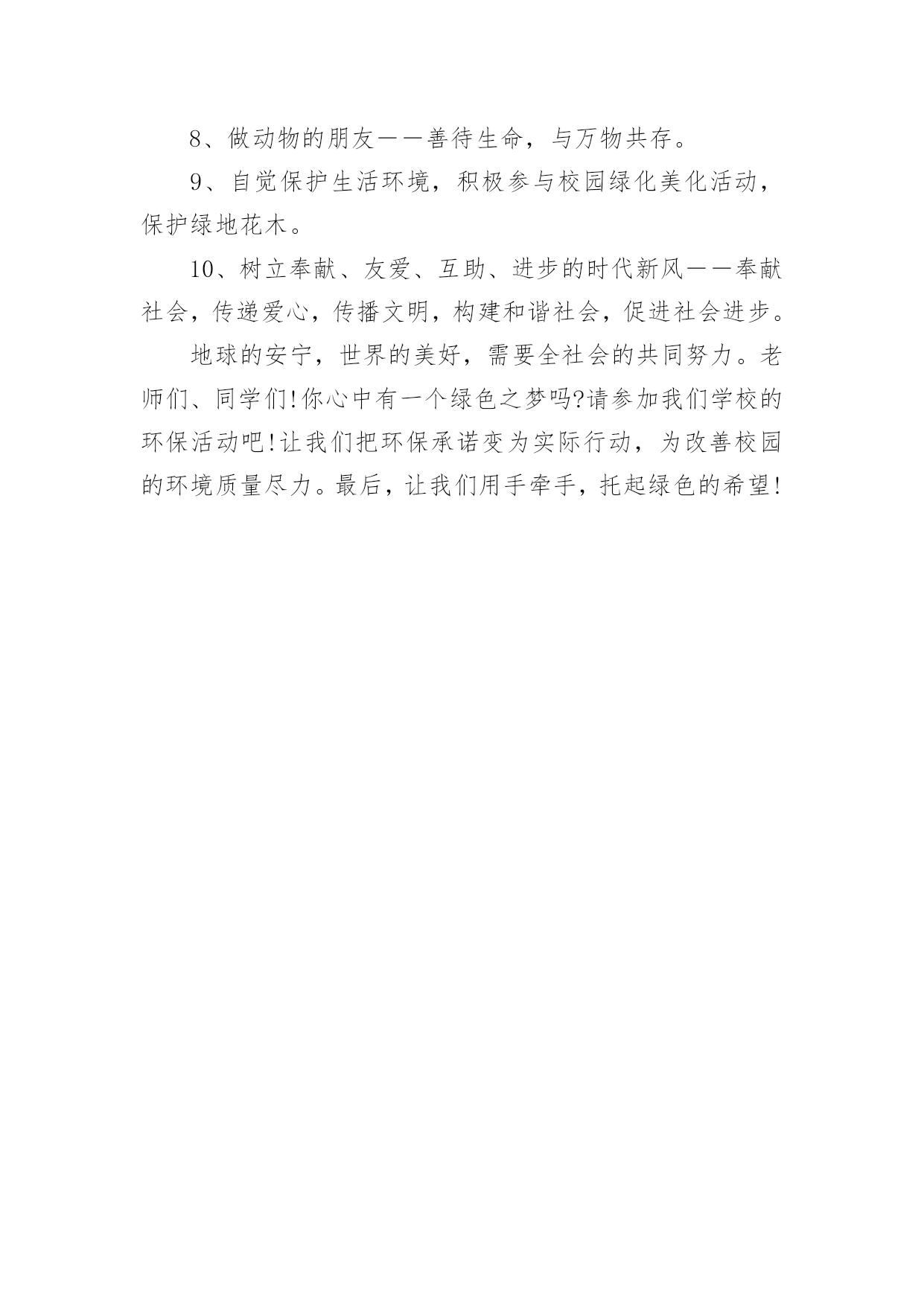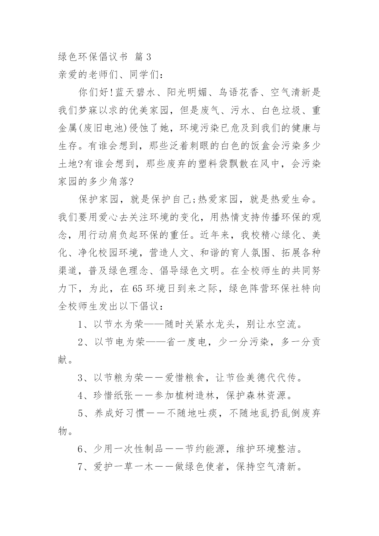 绿色环保倡议书绿色环保倡议书3篇在当今社会生活中,越来越多人会去使用倡议书,倡议书具有响应者不确定性的特征。一听到写倡议书就拖延症懒癌齐复发?以下是小编为大家收集的绿色环保倡议书3篇,仅供参考,希望能够帮助到大家。绿色环保倡议书篇1亲爱的老师、同学们:在全球环境问题日趋严重的今天,尤其是被称为环保头号大敌的“白色污染”,已成为影响城市乡村环境和人们生活的一道难题。环境保护正变得越来越紧迫,不加限制的环境污染,将会导致环境污染不断蔓延扩散。为了更清新的空气,更清澈的水源,更洁净的蓝天白云,任何一个谋求长远发展的国家,任何一个有责任心的市民,都不能再忍受由不文明的生活方式造成对环境的污染。为了我们的地球能够重返绿色、为了我们日日夜夜生活的城市,让我们立即行动起来吧!保护环境,消灭污染,从点滴做起,从拒绝使用塑料袋做起。所谓“白色污染”,是指主要包括塑料袋、塑料快餐盒、餐具、杯盘、塑料包装等废弃的不易降解的塑料对环境的污染。许多塑料袋成分是聚氯乙烯,如果焚烧,焚烧产生的气体会污染大气,由于含氯,有可能生成二恶英这样的毒性更大的污染物。如果填埋,由于塑料袋的成分都很稳定,所以很难降解,混在土壤中将对土壤造成长期影响。目前,全国每年塑料废弃量多达1000余万吨。不知从何时开始,人们还经常被眼前出现的一幕幕情景所震惊:铁路沿线两旁遍地都是盒盒袋袋,一眼望不到边际,极象一座白色长城;隆冬季节,光秃秃的树枝上挂满了塑料袋、塑料薄膜,被狂风吹得飘飘扬扬,极不雅观,车站、码头、街道的一次性塑料饭盒、塑料袋遍地开花,令人触目惊心,景区、农田、河湖海溪里的废塑料碎片星罗棋布,随处可见。所有这一幕幕的情景预示着“白色污染”已到了让人不能再忍受的地步了。亲爱的老师、同学,为了绿色地球,为了我们自己,为了子孙后代,为了美好明天,我们有义务、有责任保护我们的地球,我们必须立即行动起来,制止“白色污染”,拒绝塑料制品,使用可降解产品,共同美化我们赖以生存的`空间。为此,我们倡议:正确认识“白色污染”的危害,减少塑料袋的使用,开展回收利用,出门购物提前准备环保袋或者购物篮;用过的塑料袋不乱扔,整理在家循环使用;不使用一次性塑料制品,提倡使用可降解环保用品;开展垃圾分类回收,有效控制日常生活中产生的污染。老师同学们,为了山,为了水,为了空气,为了森林,为了我们共同生存的生态环境,让我们携起手来,从我做起,从现在做起。相信只要我们都参与进来,“白色污染”一定会离我们越来越远,我们的家园最终将回归她神圣的纯洁!此致敬礼!xxx年月日绿色环保倡议书篇2新的世纪,我们渴望干净的地球,渴望健康的生命,渴望幸福的家园,渴望绿色、健康、卫生的生活环境......。作为二十一世纪的xx公司的职员,我们要义不容辞地承担起使命,共创绿色环保、健康卫生的新社会。我们的口号是:“绿色环保,举手之劳;从我做起,从点滴做起”。xx公司倡议:大了宣传普及环境保护知识,提高工人们的环境意识,积极参与工业园区的环保实践和监督;从我做起,从现在做起,从身边小事做起,提倡绿色生活,节约资源,减少污染,回收资源,绿色消费,支持环保;积极参与环境的绿化、美化、净化,清除或有效控制日常生活中产生的污染,对环境少一份破坏,多一份关爱,共创绿色家园;全面提高环境与发展意识,树立正确的环境价值观和环境道德风尚;认真贯彻国家方针政策,法律法规,为改善人类居住环境做出实质性的贡献。为了我们共同的家园,让我们行动起来,用爱心去关注环境的变化,用热情去传播环保的理念,用行动肩负起环保重任。让天更蓝,水更清,地更绿,让我们的工业园区更美丽。倡议人:xxx时间:xxxxx绿色环保倡议书篇3亲爱的老师们、同学们:你们好!蓝天碧水、阳光明媚、鸟语花香、空气清新是我们梦寐以求的优美家园,但是废气、污水、白色垃圾、重金属(废旧电池)侵蚀了她,环境污染已危及到我们的健康与生存。有谁会想到,那些泛着刺眼的白色的饭盒会污染多少土地?有谁会想到,那些废弃的塑料袋飘散在风中,会污染家园的多少角落?保护家园,就是保护自己;热爱家园,就是热爱生命。我们要用爱心去关注环境的变化,用热情支持传播环保的观念,用行动肩负起环保的重任。近年来,我校精心绿化、美化、净化校园环境,营造人文、和谐的育人氛围、拓展各种渠道,普及绿色理念、倡导绿色文明。在全校师生的共同努力下,为此,在65环境日到来之际,绿色阵营环保社特向全校师生发出以下倡议:1、以节水为荣——随时关紧水龙头,别让水空流。2、以节电为荣——省一度电,少一分污染,多一分贡献。3、以节粮为荣――爱惜粮食,让节俭美德代代传。4、珍惜纸张――参加植树造林,保护森林资源。5、养成好习惯――不随地吐痰,不随地乱扔乱倒废弃物。6、少用一次性制品――节约能源,维护环境整洁。7、爱护一草一木――做绿色使者,保持空