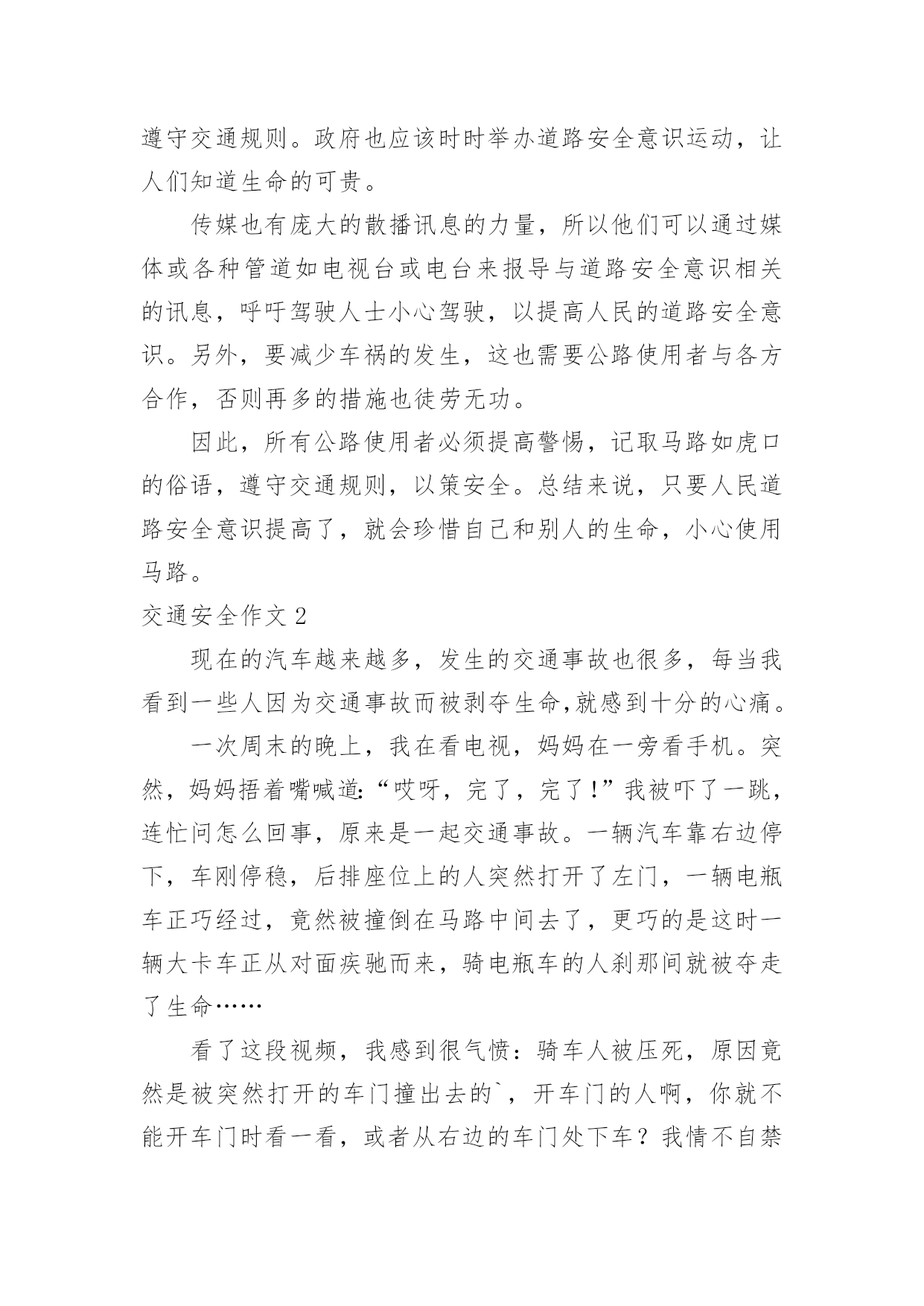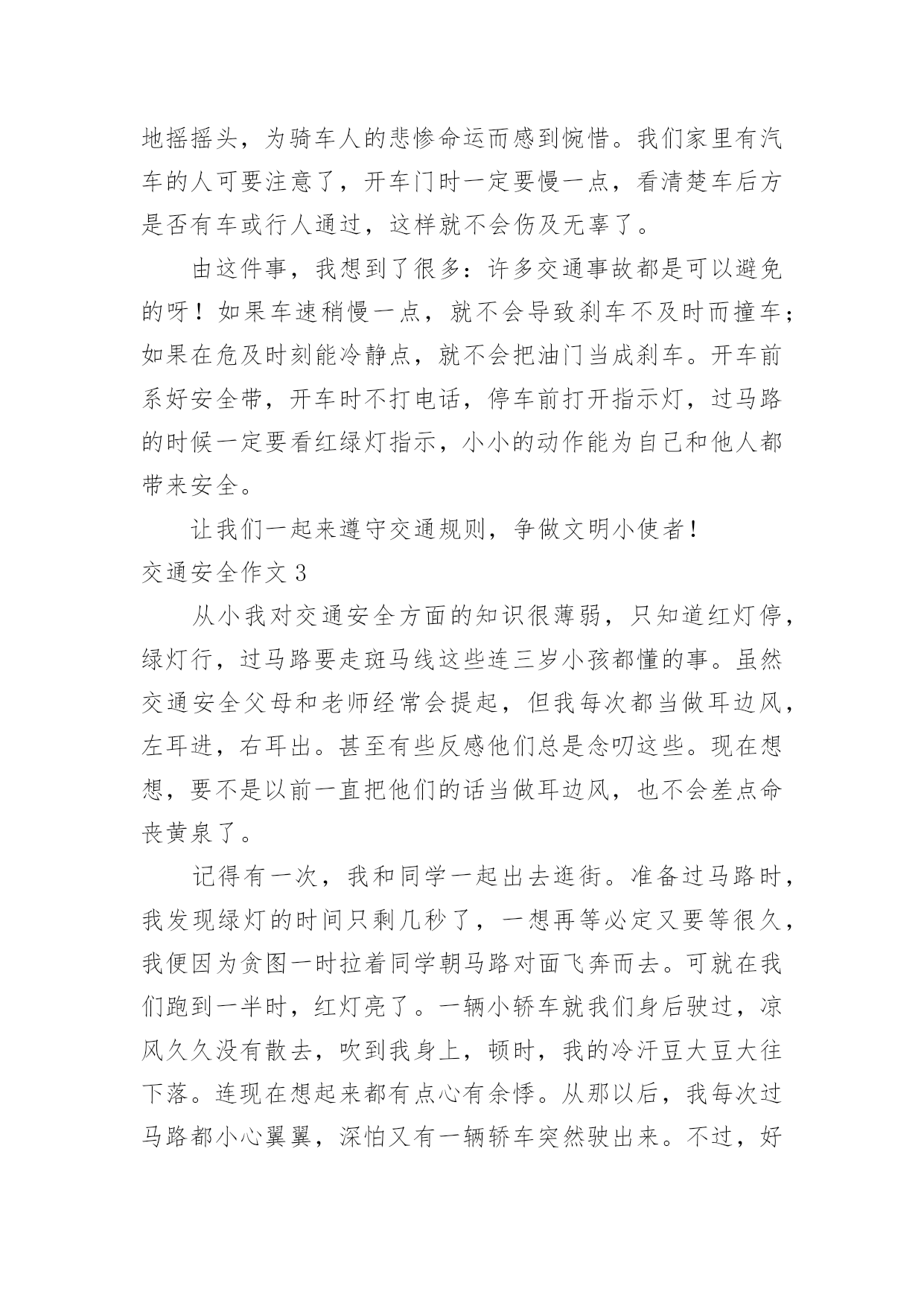 交通安全作文交通安全作文在平平淡淡的日常中,大家一定都接触过作文吧,作文是从内部言语向外部言语的过渡,即从经过压缩的简要的、自己能明白的语言,向开展的、具有规范语法结构的、能为他人所理解的外部语言形式的转化。你知道作文怎样写才规范吗?以下是小编为大家整理的交通安全作文,希望能够帮助到大家。交通安全作文1随着我国蓬勃的发展,车辆也逐渐增加了,所以交通事故每天频频发生,无论是报纸还是电台,电视台,每天都有很多关于车祸的新闻报道,车祸的伤亡数字逐年增加,令人触目惊心。为了减少交通事故,提升人民的道路安全意识是刻不容缓的事情。首先,学校必须举办交通规则的讲座会,以灌输学生道路安全的重要性。此外,消防应该知道同学们正确用公路如不在路边嬉戏,并让他们知道马路如虎口,规则要遵守的道理。另外,政府应该严厉取缔违规的'公路使用者,例如提高交通罚款或吊销驾车执照给酒后驾驶者和违反交通规则的驾驶人士。只要政府做到杀一儆百的行动,人民才会时时遵守交通规则。政府也应该时时举办道路安全意识运动,让人们知道生命的可贵。传媒也有庞大的散播讯息的力量,所以他们可以通过媒体或各种管道如电视台或电台来报导与道路安全意识相关的讯息,呼吁驾驶人士小心驾驶,以提高人民的道路安全意识。另外,要减少车祸的发生,这也需要公路使用者与各方合作,否则再多的措施也徒劳无功。因此,所有公路使用者必须提高警惕,记取马路如虎口的俗语,遵守交通规则,以策安全。总结来说,只要人民道路安全意识提高了,就会珍惜自己和别人的生命,小心使用马路。交通安全作文2现在的汽车越来越多,发生的交通事故也很多,每当我看到一些人因为交通事故而被剥夺生命,就感到十分的心痛。一次周末的晚上,我在看电视,妈妈在一旁看手机。突然,妈妈捂着嘴喊道:“哎呀,完了,完了!”我被吓了一跳,连忙问怎么回事,原来是一起交通事故。一辆汽车靠右边停下,车刚停稳,后排座位上的人突然打开了左门,一辆电瓶车正巧经过,竟然被撞倒在马路中间去了,更巧的是这时一辆大卡车正从对面疾驰而来,骑电瓶车的人刹那间就被夺走了生命……看了这段视频,我感到很气愤:骑车人被压死,原因竟然是被突然打开的车门撞出去的`,开车门的人啊,你就不能开车门时看一看,或者从右边的车门处下车?我情不自禁地摇摇头,为骑车人的悲惨命运而感到惋惜。我们家里有汽车的人可要注意了,开车门时一定要慢一点,看清楚车后方是否有车或行人通过,这样就不会伤及无辜了。由这件事,我想到了很多:许多交通事故都是可以避免的呀!如果车速稍慢一点,就不会导致刹车不及时而撞车;如果在危及时刻能冷静点,就不会把油门当成刹车。开车前系好安全带,开车时不打电话,停车前打开指示灯,过马路的时候一定要看红绿灯指示,小小的动作能为自己和他人都带来安全。让我们一起来遵守交通规则,争做文明小使者!交通安全作文3从小我对交通安全方面的知识很薄弱,只知道红灯停,绿灯行,过马路要走斑马线这些连三岁小孩都懂的事。虽然交通安全父母和老师经常会提起,但我每次都当做耳边风,左耳进,右耳出。甚至有些反感他们总是念叨这些。现在想想,要不是以前一直把他们的话当做耳边风,也不会差点命丧黄泉了。记得有一次,我和同学一起出去逛街。准备过马路时,我发现绿灯的时间只剩几秒了,一想再等必定又要等很久,我便因为贪图一时拉着同学朝马路对面飞奔而去。可就在我们跑到一半时,红灯亮了。一辆小轿车就我们身后驶过,凉风久久没有散去,吹到我身上,顿时,我的冷汗豆大豆大往下落。连现在想起来都有点心有余悸。从那以后,我每次过马路都小心翼翼,深怕又有一辆轿车突然驶出来。不过,好景不长,过了一段时间,我便忘了这个教训。又有一次我骑车和妈妈出去玩,妈妈骑车在前面,我跟着妈妈的后面。骑到一个十字路口,我和妈妈的距离已经拉开了距离,为了追上妈妈,我加快了速度,到达十字路口的中心时,突然,从左侧冲出来一辆车,眼看就要撞上我,我什么都顾不上,只好紧张闭上了眼睛。“哧”随着刹车声,那辆车停在了我的面前,司机下车询问有没有事,妈妈也慌忙的'跑过来问候我,当时身边声音吵杂,我却什么也听不见。一想到刚刚经历了这么恐怖的事,差点就要见不到爸爸妈妈了。那一刻,我意识到交通安全的重要性。从那以后,我再也不拿父母老师的话当做耳边风了。作为已经经历过“生死之难”的我,提醒大家,一定要听父母和老师的教导,生命是宝贵的,用什么也换不来,注意交通安全,就能让自己多一份安全。