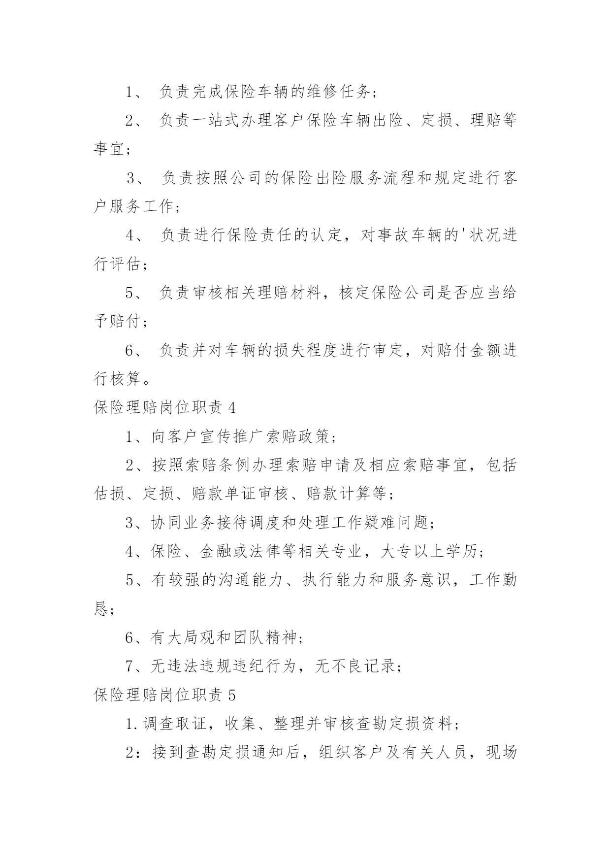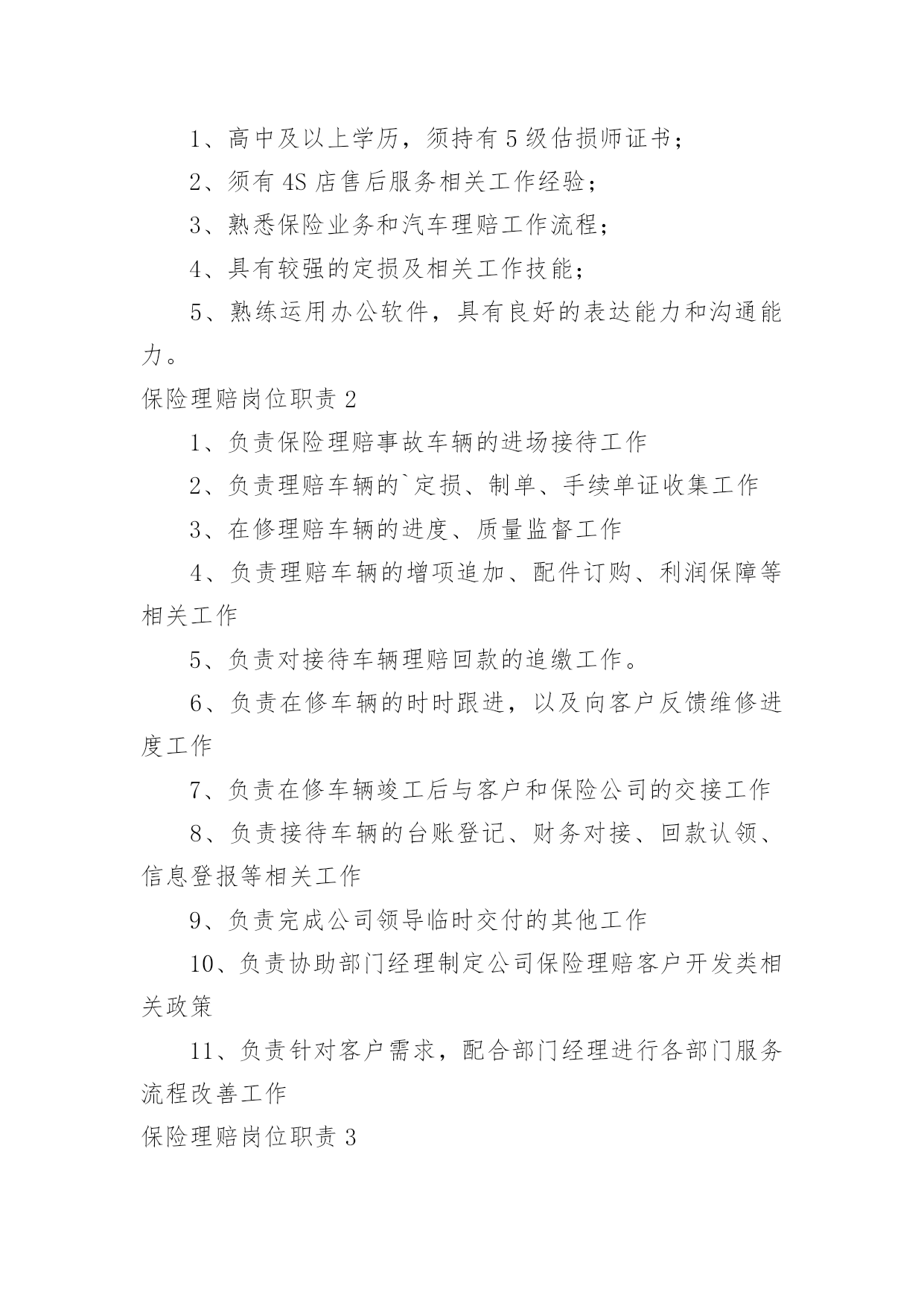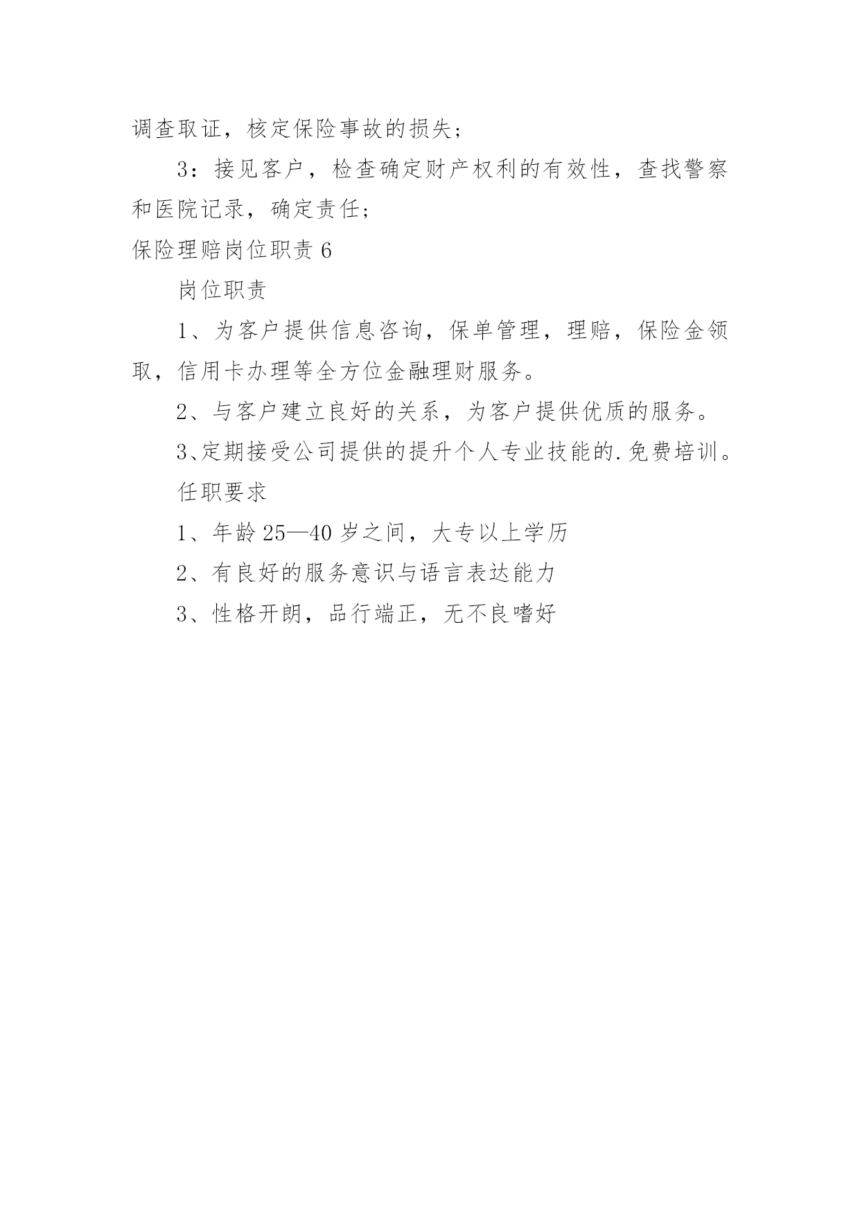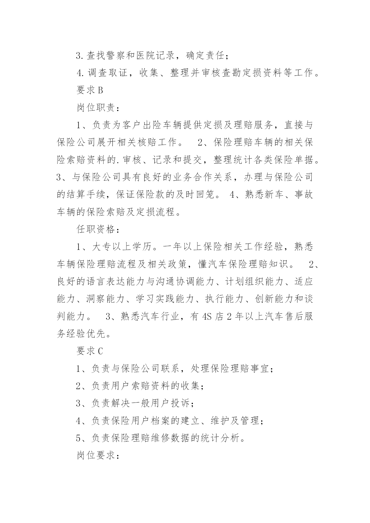 保险理赔岗位职责保险理赔岗位职责(6篇)在充满活力,日益开放的今天,岗位职责起到的作用越来越大,明确岗位职责能让员工知晓和掌握岗位职责,能够最大化的进行劳动用工管理,科学的进行人力配置,做到人尽其才、人岗匹配。什么样的岗位职责才是有效的呢?以下是小编为大家整理的保险理赔岗位职责,欢迎大家借鉴与参考,希望对大家有所帮助。保险理赔岗位职责1保险理赔员职责岗位职责:1.负责在接到查勘定损通知后,组织客户及有关人员,现场调查取证;2.接见客户,检查确定财产权利的有效性;3.查找警察和医院记录,确定责任;4.调查取证,收集、整理并审核查勘定损资料等工作。企业对保险理赔员要求要求A岗位职责:1.负责在接到查勘定损通知后,组织客户及有关人员,现场调查取证;2.接见客户,检查确定财产权利的有效性;3.查找警察和医院记录,确定责任;4.调查取证,收集、整理并审核查勘定损资料等工作。要求B岗位职责:1、负责为客户出险车辆提供定损及理赔服务,直接与保险公司展开相关核赔工作。2、保险理赔车辆的相关保险索赔资料的.审核、记录和提交,整理统计各类保险单据。3、与保险公司具有良好的业务合作关系,办理与保险公司的结算手续,保证保险款的及时回笼。4、熟悉新车、事故车辆的保险索赔及定损流程。任职资格:1、大专以上学历。一年以上保险相关工作经验,熟悉车辆保险理赔流程及相关政策,懂汽车保险理赔知识。2、良好的语言表达能力与沟通协调能力、计划组织能力、适应能力、洞察能力、学习实践能力、执行能力、创新能力和谈判能力。3、熟悉汽车行业,有4S店2年以上汽车售后服务经验优先。要求C1、负责与保险公司联系,处理保险理赔事宜;2、负责用户索赔资料的收集;3、负责解决一般用户投诉;4、负责保险用户档案的建立、维护及管理;5、负责保险理赔维修数据的统计分析。岗位要求:1、高中及以上学历,须持有5级估损师证书;2、须有4S店售后服务相关工作经验;3、熟悉保险业务和汽车理赔工作流程;4、具有较强的定损及相关工作技能;5、熟练运用办公软件,具有良好的表达能力和沟通能力。保险理赔岗位职责21、负责保险理赔事故车辆的进场接待工作2、负责理赔车辆的`定损、制单、手续单证收集工作3、在修理赔车辆的进度、质量监督工作4、负责理赔车辆的增项追加、配件订购、利润保障等相关工作5、负责对接待车辆理赔回款的追缴工作。6、负责在修车辆的时时跟进,以及向客户反馈维修进度工作7、负责在修车辆竣工后与客户和保险公司的交接工作8、负责接待车辆的台账登记、财务对接、回款认领、信息登报等相关工作9、负责完成公司领导临时交付的其他工作10、负责协助部门经理制定公司保险理赔客户开发类相关政策11、负责针对客户需求,配合部门经理进行各部门服务流程改善工作保险理赔岗位职责31、负责完成保险车辆的维修任务;2、负责一站式办理客户保险车辆出险、定损、理赔等事宜;3、负责按照公司的保险出险服务流程和规定进行客户服务工作;4、负责进行保险责任的认定,对事故车辆的'状况进行评估;5、负责审核相关理赔材料,核定保险公司是否应当给予赔付;6、负责并对车辆的损失程度进行审定,对赔付金额进行核算。保险理赔岗位职责41、向客户宣传推广索赔政策;2、按照索赔条例办理索赔申请及相应索赔事宜,包括估损、定损、赔款单证审核、赔款计算等;3、协同业务接待调度和处理工作疑难问题;4、保险、金融或法律等相关专业,大专以上学历;5、有较强的沟通能力、执行能力和服务意识,工作勤恳;6、有大局观和团队精神;7、无违法违规违纪行为,无不良记录;保险理赔岗位职责51.调查取证,收集、整理并审核查勘定损资料;2:接到查勘定损通知后,组织客户及有关人员,现场调查取证,核定保险事故的损失;3:接见客户,检查确定财产权利的有效性,查找警察和医院记录,确定责任;保险理赔岗位职责6岗位职责1、为客户提供信息咨询,保单管理,理赔,保险金领取,信用卡办理等全方位金融理财服务。2、与客户建立良好的关系,为客户提供优质的服务。3、定期接受公司提供的提升个人专业技能的.免费培训。任职要求1、年龄25—40岁之间,大专以上学历2、有良好的服务意识与语言表达能力3、性格开朗,品行端正,无不良嗜好