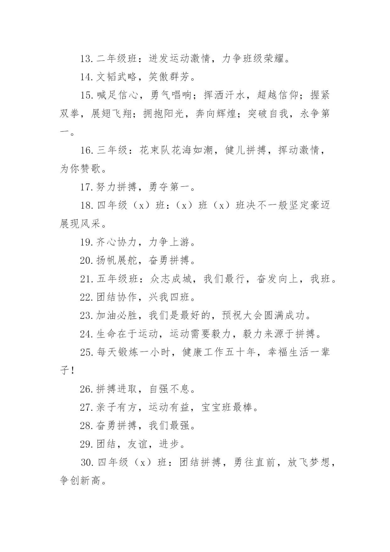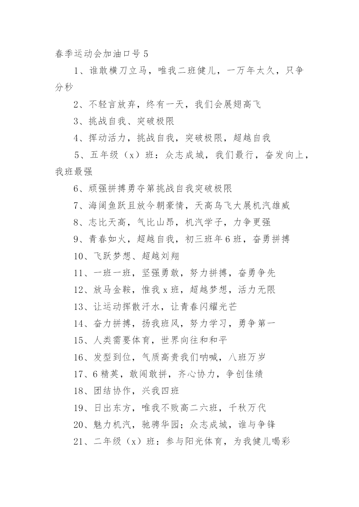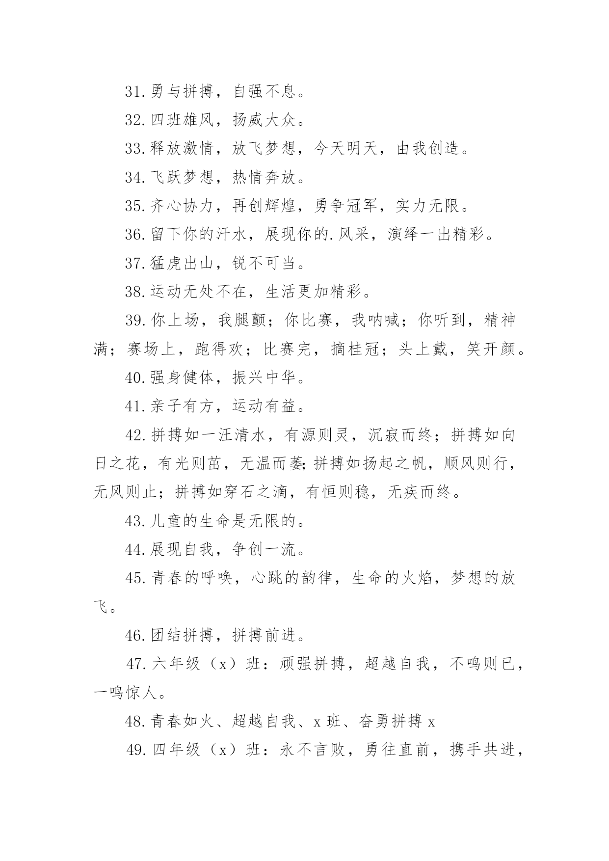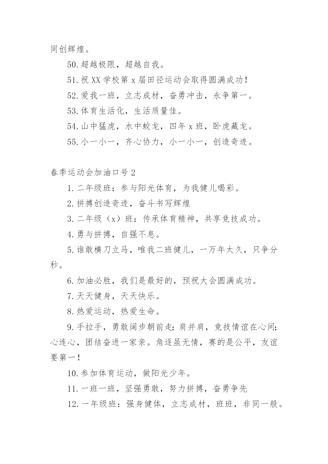 春季运动会加油口号在日复一日的学习、工作或生活中,大家都接触过比较经典的口号吧,口号要在受众的心目中形成一定程度的印记,就要使之句式简短,容易记忆。口号的类型有很多,你都知道吗?下面是小编为大家收集的春季运动会加油口号,欢迎阅读与收藏。春季运动会加油口号11.小一小一,勇夺桂冠;齐心协力,共创辉煌。2.五年级(x)班:燃烧激情,沸腾理想,超越自我,再创辉煌。3.强身健体,立志成材,班班,非同一般。4.奋力拼搏,扬我班风,努力学习,勇争第一。5.全民健身,阳光体育;锻炼身体,积极参与。6.六年级:彩旗队锻炼身体,增强体质,展示活力,超越自我。7.强身健体,终身幸福。8.六年级(x)班:扬帆起航,劈波斩浪,扬我班风,再创辉煌。9.大班大班,属我!10.努力拼搏,锐意进取,携手奋进,共创佳绩。11.挥动激情,挑战自我,突破极限,超越自我。12.天天健身,天天快乐。13.二年级班:迸发运动激情,力争班级荣耀。14.文韬武略,笑傲群芳。15.喊足信心,勇气唱响;挥洒汗水,超越信仰;握紧双拳,展翅飞翔;拥抱阳光,奔向辉煌;突破自我,永争第一。16.三年级:花束队花海如潮,健儿拼搏,挥动激情,为你赞歌。17.努力拼搏,勇夺第一。18.四年级(x)班:(x)班(x)班决不一般坚定豪迈展现风采。19.齐心协力,力争上游。20.扬帆展舵,奋勇拼搏。21.五年级班:众志成城,我们最行,奋发向上,我班。22.团结协作,兴我四班。23.加油必胜,我们是最好的,预祝大会圆满成功。24.生命在于运动,运动需要毅力,毅力来源于拼搏。25.每天锻炼一小时,健康工作五十年,幸福生活一辈子!26.拼搏进取,自强不息。27.亲子有方,运动有益,宝宝班最棒。28.奋勇拼搏,我们最强。29.团结,友谊,进步。30.四年级(x)班:团结拼搏,勇往直前,放飞梦想,争创新高。31.勇与拼搏,自强不息。32.四班雄风,扬威大众。33.释放激情,放飞梦想,今天明天,由我创造。34.飞跃梦想,热情奔放。35.齐心协力,再创辉煌,勇争冠军,实力无限。36.留下你的汗水,展现你的.风采,演绎一出精彩。37.猛虎出山,锐不可当。38.运动无处不在,生活更加精彩。39.你上场,我腿颤;你比赛,我呐喊;你听到,精神满;赛场上,跑得欢;比赛完,摘桂冠;头上戴,笑开颜。40.强身健体,振兴中华。41.亲子有方,运动有益。42.拼搏如一汪清水,有源则灵,沉寂而终;拼搏如向日之花,有光则茁,无温而萎;拼搏如扬起之帆,顺风则行,无风则止;拼搏如穿石之滴,有恒则稳,无疾而终。43.儿童的生命是无限的。44.展现自我,争创一流。45.青春的呼唤,心跳的韵律,生命的火焰,梦想的放飞。46.团结拼搏,拼搏前进。47.六年级(x)班:顽强拼搏,超越自我,不鸣则已,一鸣惊人。48.青春如火、超越自我、x班、奋勇拼搏x49.四年级(x)班:永不言败,勇往直前,携手共进,同创辉煌。50.超越极限,超越自我。51.祝XX学校第x届田径运动会取得圆满成功!52.爱我一班,立志成材,奋勇冲击,永争第一。53.体育生活化,生活质量佳。54.山中猛虎,水中蛟龙,四年x班,卧虎藏龙。55.小一小一,齐心协力,小一小一,创造奇迹。春季运动会加油口号21.二年级班:参与阳光体育,为我健儿喝彩。2.拼搏创造奇迹,奋斗书写辉煌3.二年级(x)班:传承体育精神,共享竞技成功。4.勇与拼搏,自强不息。5.谁敢横刀立马,唯我二班健儿,一万年太久,只争分秒。6.加油必胜,我们是最好的,预祝大会圆满成功。7.天天健身,天天快乐。8.热爱运动,热爱生命。9.手拉手,勇敢阔步朝前走;肩并肩,竞技情谊在心间;心连心,团结奋进一家亲。角逐虽无情,赛的是公平,友谊要第一!10.参加体育运动,做阳光少年。11.一班一班,坚强勇敢,努力拼搏,奋勇争先12.一年级班:强身健体,立志成材,班班,非同一般。13.热爱生命,珍视运动。14.六年级班:六一学子,斗志昂扬,驰骋赛场,为班争光。15.挑战自俺,突破极限。16.超越梦想,激情无限。17.勇争第一、团结一心、报效祖国、造福人类!18.锻炼享健康,快乐伴人生。19.不言失败,赛出风采。20.青春无畏、逐梦扬威。顽强拼搏、勇攀高峰。21.我运动,我健康,我快乐,运动伴随你和我。22.强身健体、立志成材。23.我运动,我健康,我快乐,我阳光。24.铁心拼搏、争创一流。赛出水平、赛出风格。25.六年级(x)班:扬帆起航,劈波斩浪,扬我班风,再创辉煌。26.运动健儿,无所不能,体坛精英,谁与争锋。27.扬帆展舵,奋勇拼搏。28.人格自尊,行为自律,学习自主,生活自理29.我精彩,我运动。30.我参与我奉献我快乐。31.利剑出鞘,倒海翻江赛出水平,赛出风格,向前冲,让我们与众不同。32.顽强拼搏,争创一流。33.强身健