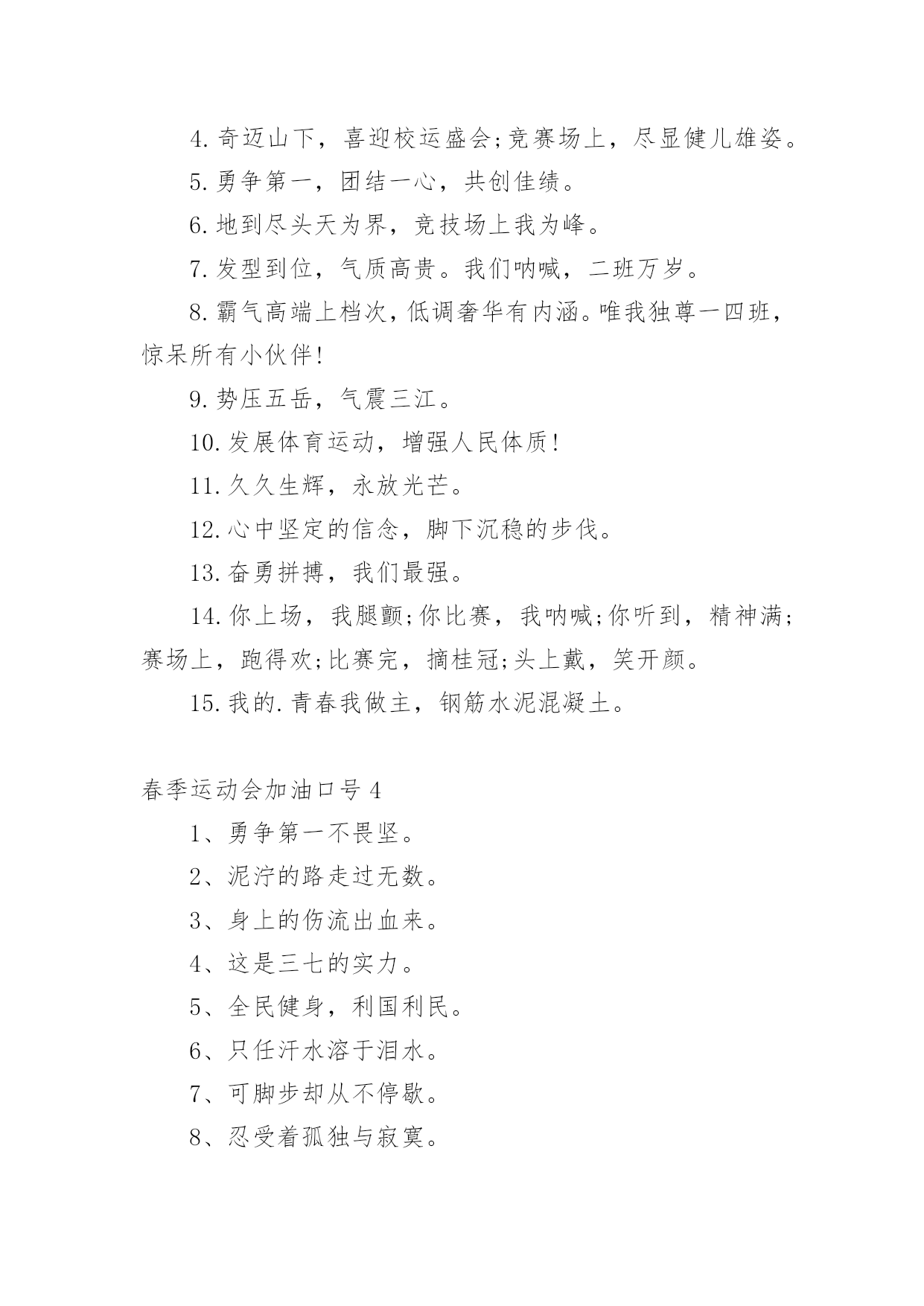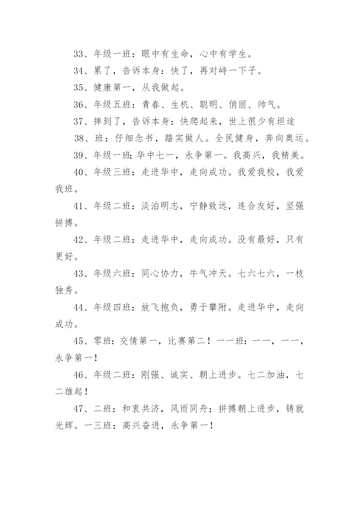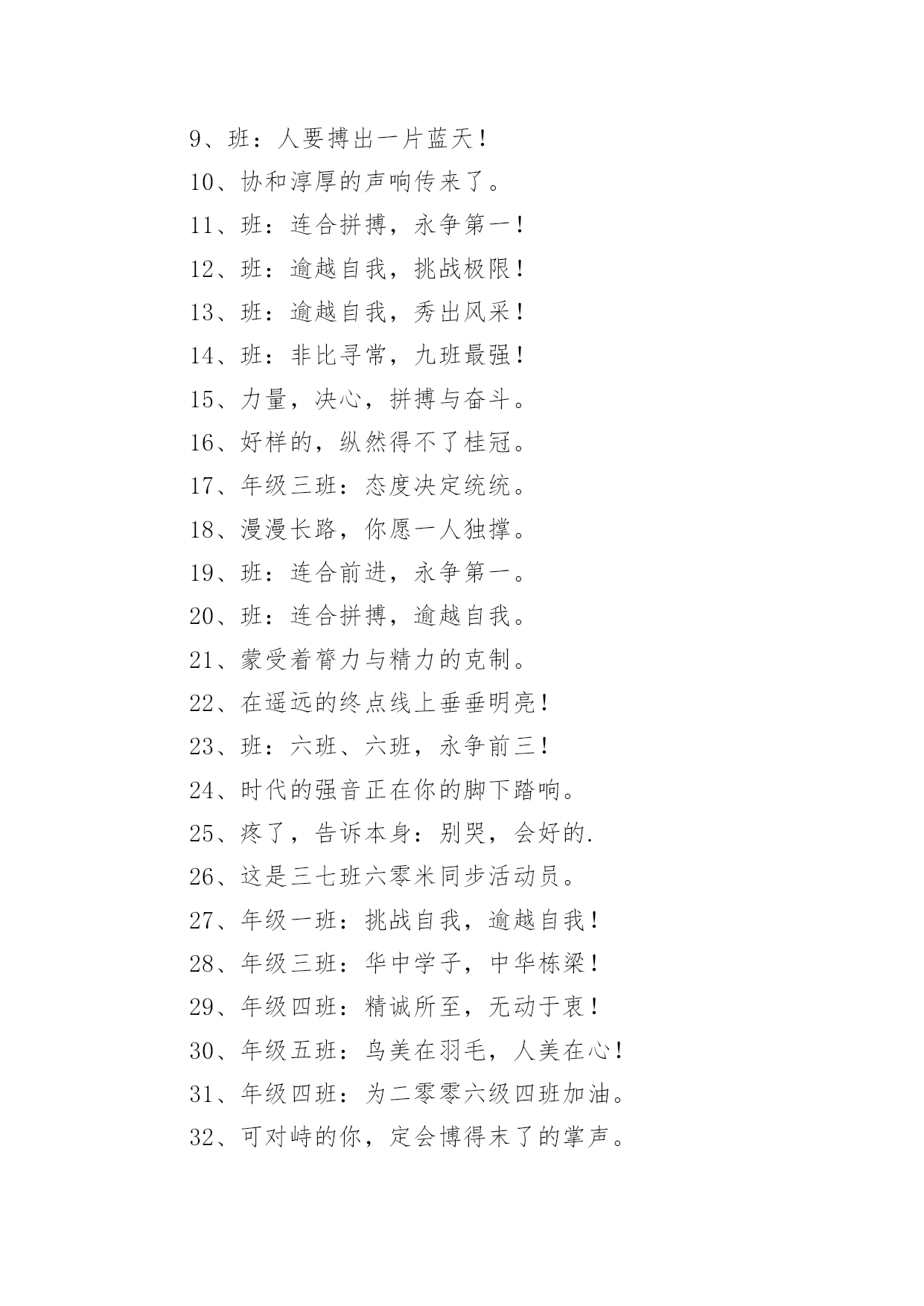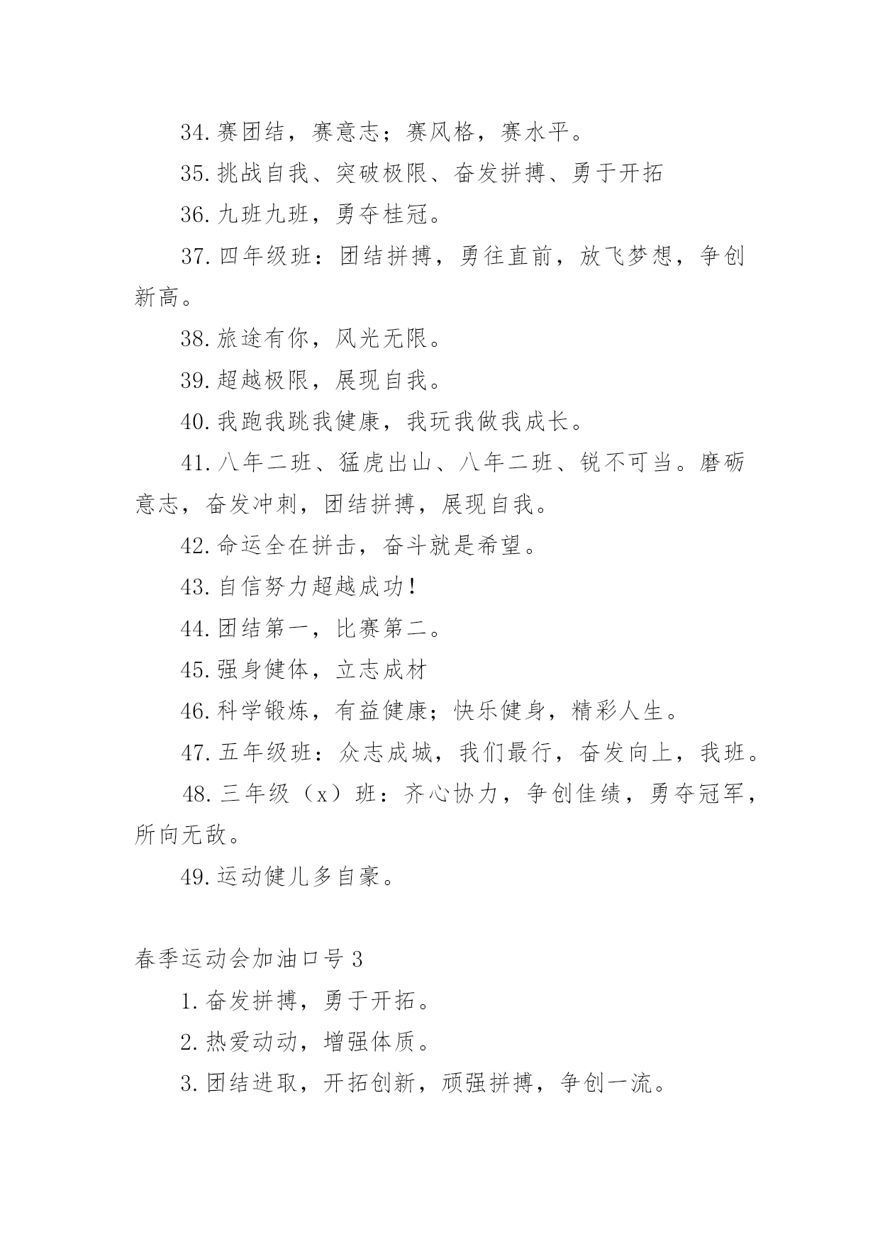 春季运动会加油口号在日复一日的学习、工作或生活中,大家都接触过比较经典的口号吧,口号要在受众的心目中形成一定程度的印记,就要使之句式简短,容易记忆。口号的类型有很多,你都知道吗?下面是小编为大家收集的春季运动会加油口号,欢迎阅读与收藏。春季运动会加油口号11.小一小一,勇夺桂冠;齐心协力,共创辉煌。2.五年级(x)班:燃烧激情,沸腾理想,超越自我,再创辉煌。3.强身健体,立志成材,班班,非同一般。4.奋力拼搏,扬我班风,努力学习,勇争第一。5.全民健身,阳光体育;锻炼身体,积极参与。6.六年级:彩旗队锻炼身体,增强体质,展示活力,超越自我。7.强身健体,终身幸福。8.六年级(x)班:扬帆起航,劈波斩浪,扬我班风,再创辉煌。9.大班大班,属我!10.努力拼搏,锐意进取,携手奋进,共创佳绩。11.挥动激情,挑战自我,突破极限,超越自我。12.天天健身,天天快乐。13.二年级班:迸发运动激情,力争班级荣耀。14.文韬武略,笑傲群芳。15.喊足信心,勇气唱响;挥洒汗水,超越信仰;握紧双拳,展翅飞翔;拥抱阳光,奔向辉煌;突破自我,永争第一。16.三年级:花束队花海如潮,健儿拼搏,挥动激情,为你赞歌。17.努力拼搏,勇夺第一。18.四年级(x)班:(x)班(x)班决不一般坚定豪迈展现风采。19.齐心协力,力争上游。20.扬帆展舵,奋勇拼搏。21.五年级班:众志成城,我们最行,奋发向上,我班。22.团结协作,兴我四班。23.加油必胜,我们是最好的,预祝大会圆满成功。24.生命在于运动,运动需要毅力,毅力来源于拼搏。25.每天锻炼一小时,健康工作五十年,幸福生活一辈子!26.拼搏进取,自强不息。27.亲子有方,运动有益,宝宝班最棒。28.奋勇拼搏,我们最强。29.团结,友谊,进步。30.四年级(x)班:团结拼搏,勇往直前,放飞梦想,争创新高。31.勇与拼搏,自强不息。32.四班雄风,扬威大众。33.释放激情,放飞梦想,今天明天,由我创造。34.飞跃梦想,热情奔放。35.齐心协力,再创辉煌,勇争冠军,实力无限。36.留下你的汗水,展现你的.风采,演绎一出精彩。37.猛虎出山,锐不可当。38.运动无处不在,生活更加精彩。39.你上场,我腿颤;你比赛,我呐喊;你听到,精神满;赛场上,跑得欢;比赛完,摘桂冠;头上戴,笑开颜。40.强身健体,振兴中华。41.亲子有方,运动有益。42.拼搏如一汪清水,有源则灵,沉寂而终;拼搏如向日之花,有光则茁,无温而萎;拼搏如扬起之帆,顺风则行,无风则止;拼搏如穿石之滴,有恒则稳,无疾而终。43.儿童的生命是无限的。44.展现自我,争创一流。45.青春的呼唤,心跳的韵律,生命的火焰,梦想的放飞。46.团结拼搏,拼搏前进。47.六年级(x)班:顽强拼搏,超越自我,不鸣则已,一鸣惊人。48.青春如火、超越自我、x班、奋勇拼搏x49.四年级(x)班:永不言败,勇往直前,携手共进,同创辉煌。50.超越极限,超越自我。51.祝XX学校第x届田径运动会取得圆满成功!52.爱我一班,立志成材,奋勇冲击,永争第一。53.体育生活化,生活质量佳。54.山中猛虎,水中蛟龙,四年x班,卧虎藏龙。55.小一小一,齐心协力,小一小一,创造奇迹。春季运动会加油口号21.二年级班:参与阳光体育,为我健儿喝彩。2.拼搏创造奇迹,奋斗书写辉煌3.二年级(x)班:传承体育精神,共享竞技成功。4.勇与拼搏,自强不息。5.谁敢横刀立马,唯我二班健儿,一万年太久,只争分秒。6.加油必胜,我们是最好的,预祝大会圆满成功。7.天天健身,天天快乐。8.热爱运动,热爱生命。9.手拉手,勇敢阔步朝前走;肩并肩,竞技情谊在心间;心连心,团结奋进一家亲。角逐虽无情,赛的是公平,友谊要第一!10.参加体育运动,做阳光少年。11.一班一班,坚强勇敢,努力拼搏,奋勇争先12.一年级班:强身健体,立志成材,班班,非同一般。13.热爱生命,珍视运动。14.六年级班:六一学子,斗志昂扬,驰骋赛场,为班争光。15.挑战自俺,突破极限。16.超越梦想,激情无限。17.勇争第一、团结一心、报效祖国、造福人类!18.锻炼享健康,快乐伴人生。19.不言失败,赛出风采。20.青春无畏、逐梦扬威。顽强拼搏、勇攀高峰。21.我运动,我健康,我快乐,运动伴随你和我。22.强身健体、立志成材。23.我运动,我健康,我快乐,我阳光。24.铁心拼搏、争创一流。赛出水平、赛出风格。25.六年级(x)班:扬帆起航,劈波斩浪,扬我班风,再创辉煌。26.运动健儿,无所不能,体坛精英,谁与争锋。27.扬帆展舵,奋勇拼搏。28.人格自尊,行为自律,学习自主,生活自理29.我精彩,我运动。30.我参与我奉献我快乐。31.利剑出鞘,倒海翻江赛出水平,赛出风格,向前冲,让我们与众不同。32.顽强拼搏,争创一流。33.强身健