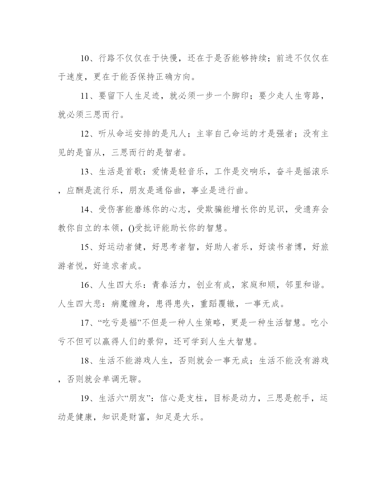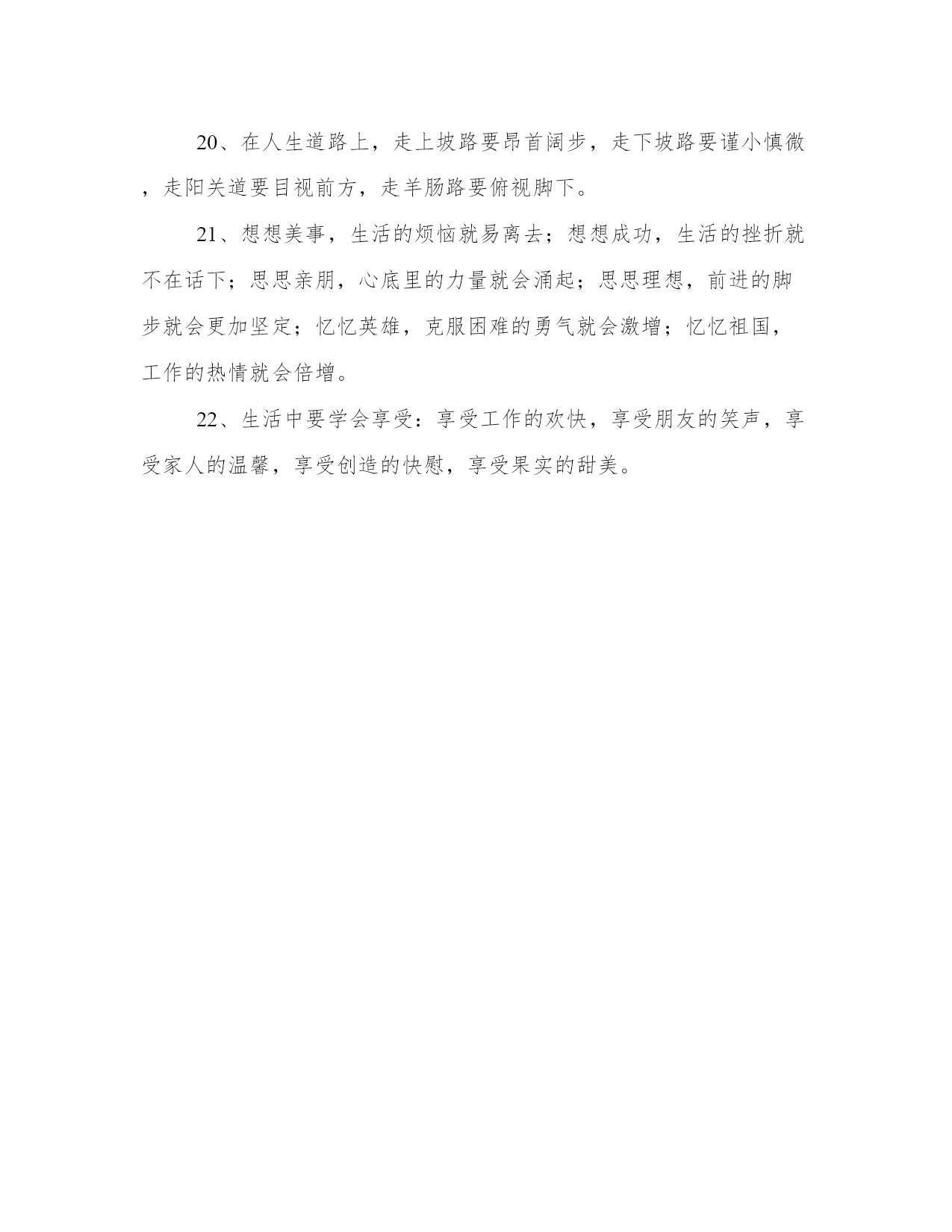 描写生活的句子摘抄2、节制是生活的艺术。如果你能节制烟酒,节制喜悲,节制贪欲,节制冲动,那么,你的生活就会充满阳光。3、有时多点糊涂会少点烦事,有时多点知足会少点烦恼,有时少点计较会多点平安,有时多点吃亏会多点平安。4、没有清醒的头脑,再快的脚步也会走歪;没有谨慎的步伐,再平的道路也会跌倒。5、生活就是奋斗,只有勇于攀登才能创造辉煌;生活就是创新,只有与时俱进才能跟上时代;生活就是付出,只有吃苦流汗才能实现理想;生活就是享受,只有品尝人生才能感知生活的快乐。6、人生难免经受挫折,风雨过后就是彩虹;生活难免遭受苦难,雨过天晴终有阳光。7、人生道路虽很曲折,却很美丽。只要你细心观看,就能饱尝沿途美景。8、认认真真学习,清清静静思考,踏踏实实做事,勤勤勉勉工作,淡淡泊泊生活,真真诚诚交友,悠悠闲闲散步,清清白白做人。9、拥有一个健康的体魄将使你的生活更具活力;拥有一个清醒的头脑将使你的人生更具理智;拥有一群朋友将使你的生活更具快乐;拥有一颗爱心将使你的生活更具和谐。10、行路不仅仅在于快慢,还在于是否能够持续;前进不仅仅在于速度,更在于能否保持正确方向。11、要留下人生足迹,就必须一步一个脚印;要少走人生弯路,就必须三思而行。12、听从命运安排的是凡人;主宰自己命运的才是强者;没有主见的是盲从,三思而行的是智者。13、生活是首歌:爱情是轻音乐,工作是交响乐,奋斗是摇滚乐,应酬是流行乐,朋友是通俗曲,事业是进行曲。14、受伤害能磨练你的心志,受欺骗能增长你的见识,受遗弃会教你自立的本领,()受批评能助长你的智慧。15、好运动者健,好思考者智,好助人者乐,好读书者博,好旅游者悦,好追求者成。16、人生四大乐:青春活力,创业有成,家庭和顺,邻里和谐。人生四大悲:病魔缠身,患得患失,重蹈覆辙,一事无成。17、“吃亏是福”不但是一种人生策略,更是一种生活智慧。吃小亏不但可以赢得人们的景仰,还可学到人生大智慧。18、生活不能游戏人生,否则就会一事无成;生活不能没有游戏,否则就会单调无聊。19、生活六“朋友”:信心是支柱,目标是动力,三思是舵手,运动是健康,知识是财富,知足是大乐。20、在人生道路上,走上坡路要昂首阔步,走下坡路要谨小慎微,走阳关道要目视前方,走羊肠路要俯视脚下。21、想想美事,生活的烦恼就易离去;想想成功,生活的挫折就不在话下;思思亲朋,心底里的力量就会涌起;思思理想,前进的脚步就会更加坚定;忆忆英雄,克服困难的勇气就会激增;忆忆祖国,工作的热情就会倍增。22、生活中要学会享受:享受工作的欢快,享受朋友的笑声,享受家人的温馨,享受创造的快慰,享受果实的甜美。