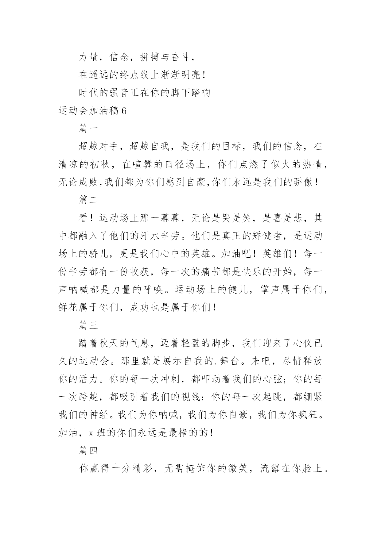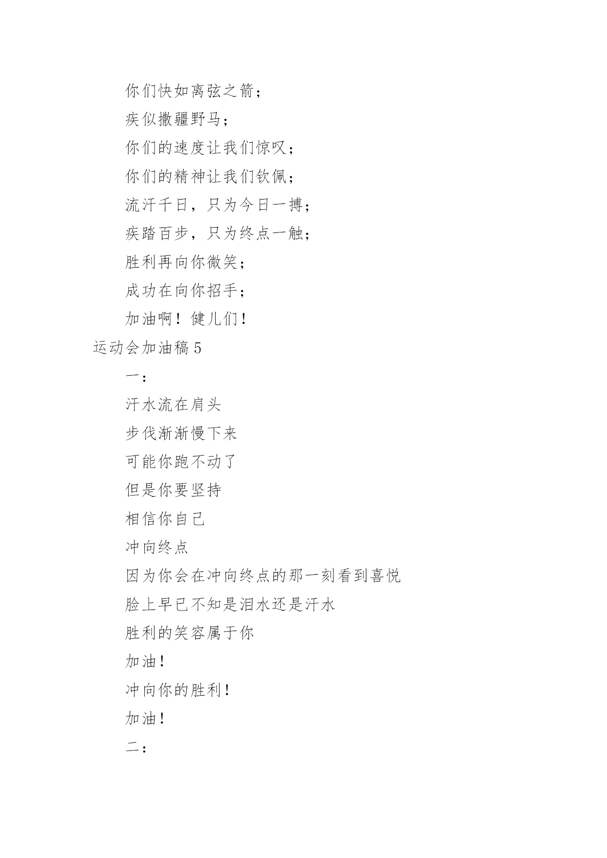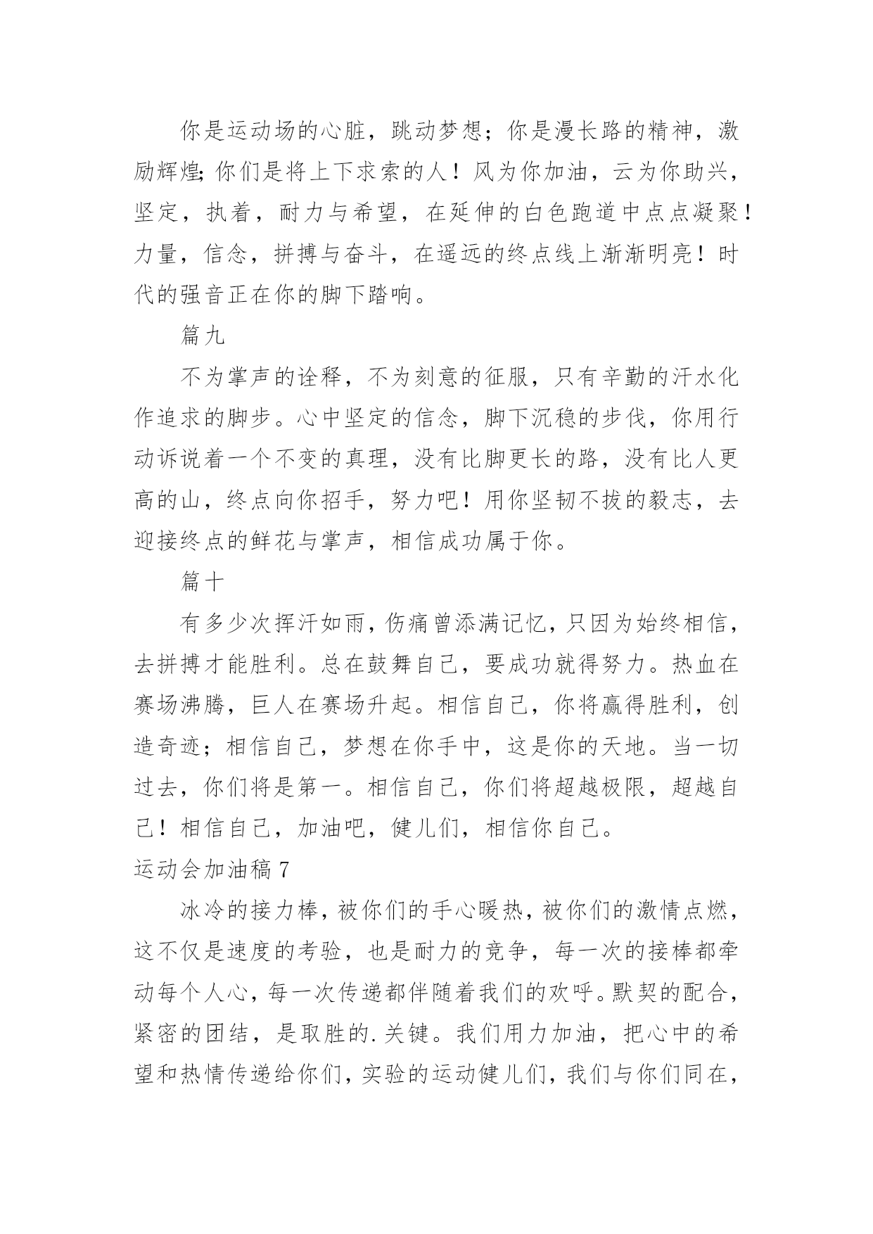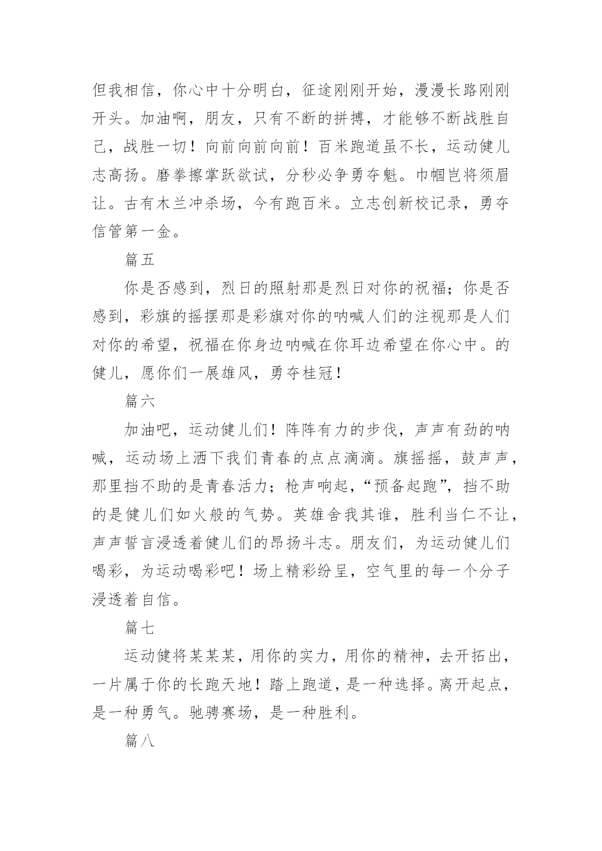 运动会加油稿运动会加油稿汇编【15篇】在当下社会,很多地方都会使用到加油稿,借助加油稿可以激起人的希望,催人奋进。你所见过的加油稿是什么样的呢?以下是小编精心整理的运动会加油稿,仅供参考,欢迎大家阅读。运动会加油稿1就让这灼目的骄阳,在你自信满满的目光下黯然失,就让这绚烂的繁花,在你矫健挺拔的身姿前兀自凋零,就让这激情呐喊,为你添一分风雨无惧的`豪迈,就让这连绵欢唱,为你奏一曲凯旋之歌,向前冲刺吧!勇敢的运动员们!运动会加油稿2人不是一件东西,而是一个置身于不断发展过程中的生命体,人的生命在运动。为何不让我们运动起来,让生命现出光彩呢?为何不让这个生命展现出无尽的光茫呢?所以,让我们运动起来,一起展示我们的色彩。让我们解脱过重的学习负担,飞驰在运动场上。让我们为自已飞奔吧,加油吧,运动员。致运动员你从哪里哪里走来?青春是你的风采你向终点奔去掌声为你澎湃你用流淌的汗液震撼着有情儿女你用健美的`臂膀挽起高山大海奔向前方--致运动员枪声响起燃起的是你的激情放飞的是你的理想你的挥汗付出在矫健的步伐以后逐一闪亮纵使艰难但,奔向前方唯有它给你掌声唯有它让你傲气昂扬!致运动员矫健的身姿,飞奔的身影,一道道亮丽的风景线,辛勤的汗水,激动的泪水,还有伤心的泪水,赛场上的奋力拼搏,成功者,取得了荣誉;失败者,获得了尊重。班级、同学、老师,为你加油!加油吧!运动健儿。运动会加油稿31.致运动员400米的跑道上,你正在飞驰,面对如此遥远的路途,你也许腿脚发麻,你也许有些茫然。但你可知道,在你身后,有同学们一双双期待的眼睛;在你身后,是你日日苦练的汗水。鼓起勇气,奋勇向前吧!2.温暖的阳光洒在赛场上,男子乙组标枪的比赛即将开始。赛场上,一道道优美的弧线将轻盈地划过天空。健儿们用手中的标枪向距离的权限发起一轮又一轮的挑战。标枪在空中轻盈的姿态,是健儿们强健的力量和熟练的技巧的结合。谁能在这场激烈的竞争中获胜?让我们拭目以待,让我们为他们呐喊、助威吧!只有将力量与技巧合二为一的人,才能获得胜利的桂冠!3.今日学校园人心欢畅,运动场上彩旗飘扬。锣鼓喧天,运动员健儿分批传喜报。溢香桃李风华正茂,一声枪令、一代英豪。你追俺赶百米线上争分夺秒。学子夺冠展雄风,搏尽全力奔目标。4.泰戈尔在诗中说,天空没有翅膀的影子,但我已飞过;艾青对朋友说,也许有人到达不了彼岸,但我们共同拥有大海。也许你们没有显赫的成绩,但运动场上留下了你们的足迹。也许你们没有奖品,但我们心中留下了你们拼搏的`身影。所有的努力都是为了迎接这一刹那,所有的拼搏都是为了这一声令下。5.时间在流逝,赛道在延伸,成功在你面前展现心脏的跳动,热血在沸腾,辉煌在你脚下铸就。加油吧,健儿们!6.或许失败对于你来说是一种耻辱,是一种希望的破灭。几个月的艰辛训练和满怀的希望在一刹那间付诸东流,令你沮丧,令人悲伤,但看看你用尽全力奋力拼搏的一刹那。眼眶中含着泪水的我们不这么想,你是勇敢的,你是坚强的,你用你那顽强的意志完成了你的任务。看成败人生豪迈,我们应从头再来,为你感到了骄傲。7.致800米长跑运动员:等待你的,是慢慢征途勇敢冲吧!勇士们!付出的汗水就要得到回报!胜利的泪水就要顺颊而下,春风会为你喝彩阳光会为你庆功掌声已为你响起!8.金秋送爽,丹桂飘香!望京实验学校终于迎来了第二届秋季运动会,我们三(1)班全体师生感谢学校为我们提供这次锻炼身体和检阅成绩的机会。9.你们挥舞着充满力量的双臂,看着实心球化成美丽的弧线,我着实在心里佩服你们,你们抛出了自我的水平。10.天空没有翅膀的影子,我已飞过晴空;也许有人到达不了彼岸,但我们共同拥有大海。也许你们没有显赫的成绩,但运动场上留下了你们的汗水;也许你们没有奖品,但你们拼搏的身影应得了我们的喝彩。在这一刹那努力拼搏,我们愿意永远为你们加油。11.心中坚定的信念,脚下沉稳的步伐,你用行动告诉我们一个不变之理,没有走不完的路,没有过不了的山,成功正在终点冲着你高高的招手,用你那顽强的意志去努力,去迎接终点的鲜花与掌声,相信成功一定是属于你。12.心中坚定的信念,脚下沉稳的步伐,你用行动告诉我们一个不变之理,没有走不完的路,没有过不了的山,成功正在终点冲着你高高的招手,用你那顽强的意志去努力,去迎接终点的鲜花与掌声,相信成功一定是属于你。13.ibelieve,成功是一幅诱人的蓝图,滴滴汗珠,才能把它绘出;ibelieve,失败是一剂苦口良药,经历风雨,才能见到彩虹;ibelieve,命运不能将我们摆布,年轻的心永不服输,我们笑着面对挑战,笑着比赛,互相祝福!14.就像花儿准备了春、秋、冬,就是为了红透整个盛夏。就像雪花经历了春、夏、秋就是为了洁白整个严冬。蹲下,昂首,出发--轻轻的一抬脚,便牵动了全场的目光。潇洒的挥挥手,便满足了那一份无言的等待。迎着朝阳,你们踏歌而