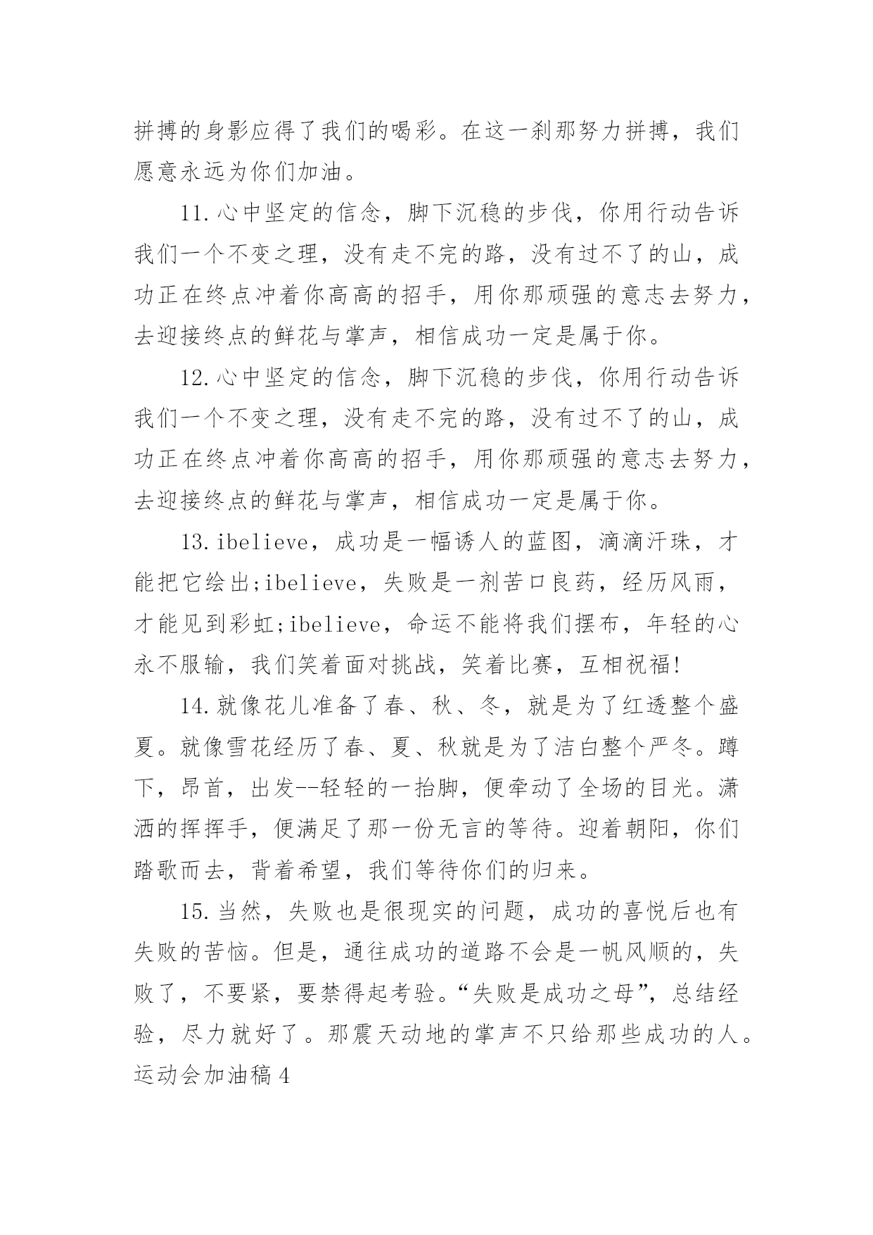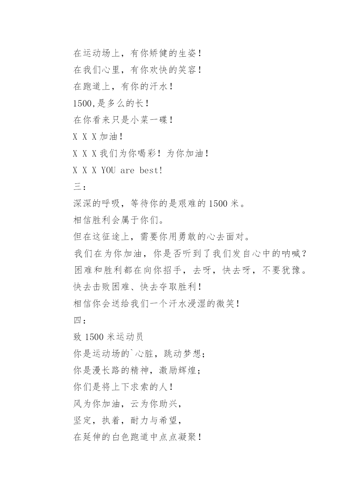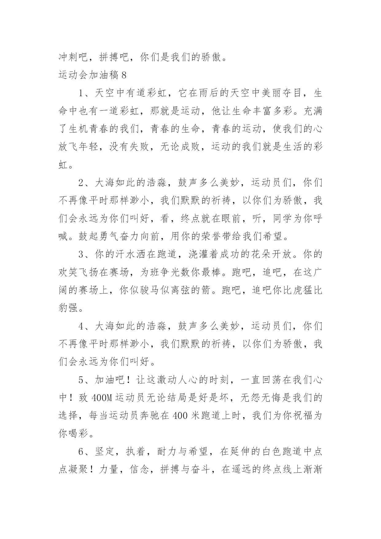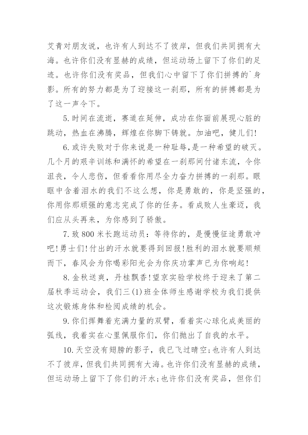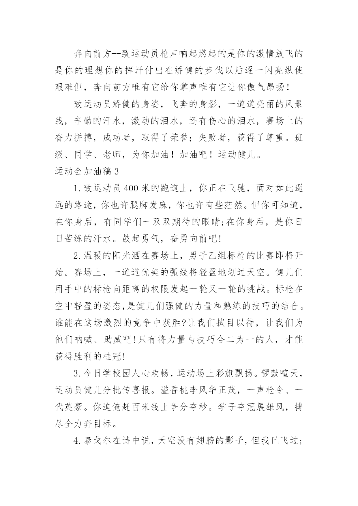 运动会加油稿运动会加油稿汇编【15篇】在当下社会,很多地方都会使用到加油稿,借助加油稿可以激起人的希望,催人奋进。你所见过的加油稿是什么样的呢?以下是小编精心整理的运动会加油稿,仅供参考,欢迎大家阅读。运动会加油稿1就让这灼目的骄阳,在你自信满满的目光下黯然失,就让这绚烂的繁花,在你矫健挺拔的身姿前兀自凋零,就让这激情呐喊,为你添一分风雨无惧的`豪迈,就让这连绵欢唱,为你奏一曲凯旋之歌,向前冲刺吧!勇敢的运动员们!运动会加油稿2人不是一件东西,而是一个置身于不断发展过程中的生命体,人的生命在运动。为何不让我们运动起来,让生命现出光彩呢?为何不让这个生命展现出无尽的光茫呢?所以,让我们运动起来,一起展示我们的色彩。让我们解脱过重的学习负担,飞驰在运动场上。让我们为自已飞奔吧,加油吧,运动员。致运动员你从哪里哪里走来?青春是你的风采你向终点奔去掌声为你澎湃你用流淌的汗液震撼着有情儿女你用健美的`臂膀挽起高山大海奔向前方--致运动员枪声响起燃起的是你的激情放飞的是你的理想你的挥汗付出在矫健的步伐以后逐一闪亮纵使艰难但,奔向前方唯有它给你掌声唯有它让你傲气昂扬!致运动员矫健的身姿,飞奔的身影,一道道亮丽的风景线,辛勤的汗水,激动的泪水,还有伤心的泪水,赛场上的奋力拼搏,成功者,取得了荣誉;失败者,获得了尊重。班级、同学、老师,为你加油!加油吧!运动健儿。运动会加油稿31.致运动员400米的跑道上,你正在飞驰,面对如此遥远的路途,你也许腿脚发麻,你也许有些茫然。但你可知道,在你身后,有同学们一双双期待的眼睛;在你身后,是你日日苦练的汗水。鼓起勇气,奋勇向前吧!2.温暖的阳光洒在赛场上,男子乙组标枪的比赛即将开始。赛场上,一道道优美的弧线将轻盈地划过天空。健儿们用手中的标枪向距离的权限发起一轮又一轮的挑战。标枪在空中轻盈的姿态,是健儿们强健的力量和熟练的技巧的结合。谁能在这场激烈的竞争中获胜?让我们拭目以待,让我们为他们呐喊、助威吧!只有将力量与技巧合二为一的人,才能获得胜利的桂冠!3.今日学校园人心欢畅,运动场上彩旗飘扬。锣鼓喧天,运动员健儿分批传喜报。溢香桃李风华正茂,一声枪令、一代英豪。你追俺赶百米线上争分夺秒。学子夺冠展雄风,搏尽全力奔目标。4.泰戈尔在诗中说,天空没有翅膀的影子,但我已飞过;艾青对朋友说,也许有人到达不了彼岸,但我们共同拥有大海。也许你们没有显赫的成绩,但运动场上留下了你们的足迹。也许你们没有奖品,但我们心中留下了你们拼搏的`身影。所有的努力都是为了迎接这一刹那,所有的拼搏都是为了这一声令下。5.时间在流逝,赛道在延伸,成功在你面前展现心脏的跳动,热血在沸腾,辉煌在你脚下铸就。加油吧,健儿们!6.或许失败对于你来说是一种耻辱,是一种希望的破灭。几个月的艰辛训练和满怀的希望在一刹那间付诸东流,令你沮丧,令人悲伤,但看看你用尽全力奋力拼搏的一刹那。眼眶中含着泪水的我们不这么想,你是勇敢的,你是坚强的,你用你那顽强的意志完成了你的任务。看成败人生豪迈,我们应从头再来,为你感到了骄傲。7.致800米长跑运动员:等待你的,是慢慢征途勇敢冲吧!勇士们!付出的汗水就要得到回报!胜利的泪水就要顺颊而下,春风会为你喝彩阳光会为你庆功掌声已为你响起!8.金秋送爽,丹桂飘香!望京实验学校终于迎来了第二届秋季运动会,我们三(1)班全体师生感谢学校为我们提供这次锻炼身体和检阅成绩的机会。9.你们挥舞着充满力量的双臂,看着实心球化成美丽的弧线,我着实在心里佩服你们,你们抛出了自我的水平。10.天空没有翅膀的影子,我已飞过晴空;也许有人到达不了彼岸,但我们共同拥有大海。也许你们没有显赫的成绩,但运动场上留下了你们的汗水;也许你们没有奖品,但你们拼搏的身影应得了我们的喝彩。在这一刹那努力拼搏,我们愿意永远为你们加油。11.心中坚定的信念,脚下沉稳的步伐,你用行动告诉我们一个不变之理,没有走不完的路,没有过不了的山,成功正在终点冲着你高高的招手,用你那顽强的意志去努力,去迎接终点的鲜花与掌声,相信成功一定是属于你。12.心中坚定的信念,脚下沉稳的步伐,你用行动告诉我们一个不变之理,没有走不完的路,没有过不了的山,成功正在终点冲着你高高的招手,用你那顽强的意志去努力,去迎接终点的鲜花与掌声,相信成功一定是属于你。13.ibelieve,成功是一幅诱人的蓝图,滴滴汗珠,才能把它绘出;ibelieve,失败是一剂苦口良药,经历风雨,才能见到彩虹;ibelieve,命运不能将我们摆布,年轻的心永不服输,我们笑着面对挑战,笑着比赛,互相祝福!14.就像花儿准备了春、秋、冬,就是为了红透整个盛夏。就像雪花经历了春、夏、秋就是为了洁白整个严冬。蹲下,昂首,出发--轻轻的一抬脚,便牵动了全场的目光。潇洒的挥挥手,便满足了那一份无言的等待。迎着朝阳,你们踏歌而
