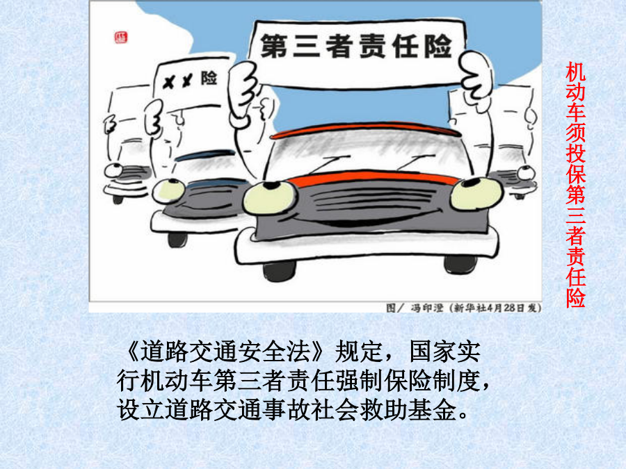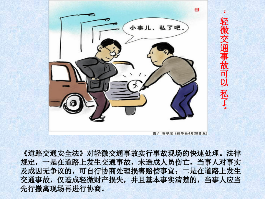 交通安全法宣传图片中华人民共和国道路交通安全法中华人民共和国道路交通安全法2003年10月28日第十届全国人民代表大会常务委员会第五次会议通过第一章总则第二章车辆和驾驶人第一节机动车、非机动车第二节机动车驾驶人第三章道路通行条件第四章道路通行规定第一节一般规定第二节机动车通行规定第三节非机动车通行规定第四节行人和乘车人通行规定第五节高速公路的特别规定第五章交通事故处理第六章执法监督第七章法律责任第八章附则本法自2004年5月1日起施行。《道路交通安全法》对轻微交通事故实行事故现场的快速处理。法律规定,一是在道路上发生交通事故,未造成人员伤亡,当事人对事实及成因无争议的,可自行协商处理损害赔偿事宜;二是在道路上发生交通事故,仅造成轻微财产损失,并且基本事实清楚的,当事人应当先行撤离现场再进行协商。《道路交通安全法》对行人的行为有明确规定。行人、乘车人、非机动车驾驶人违反道路安全法律、法规关于道路通行规定的,处警告或者五元以上五十元以下罚款;非机动车驾驶人拒绝接受罚款处罚的,可以扣留其非机动车。《道路交通安全法》特别从通行权利的分配上充分保护行人的生命安全。赋予行人在人行横道上的绝对优先权,保护无交通信号情况下的行人横过道路权。《道路交通安全法》规定,国家实行机动车第三者责任强制保险制度,设立道路交通事故社会救助基金。