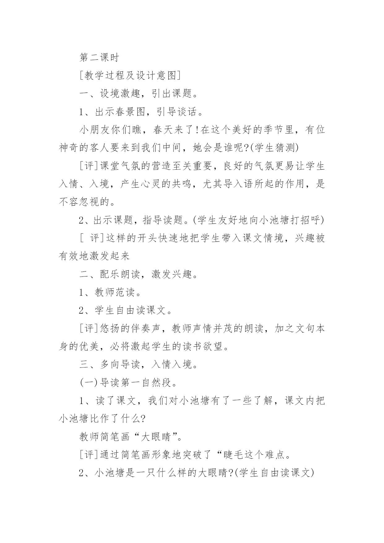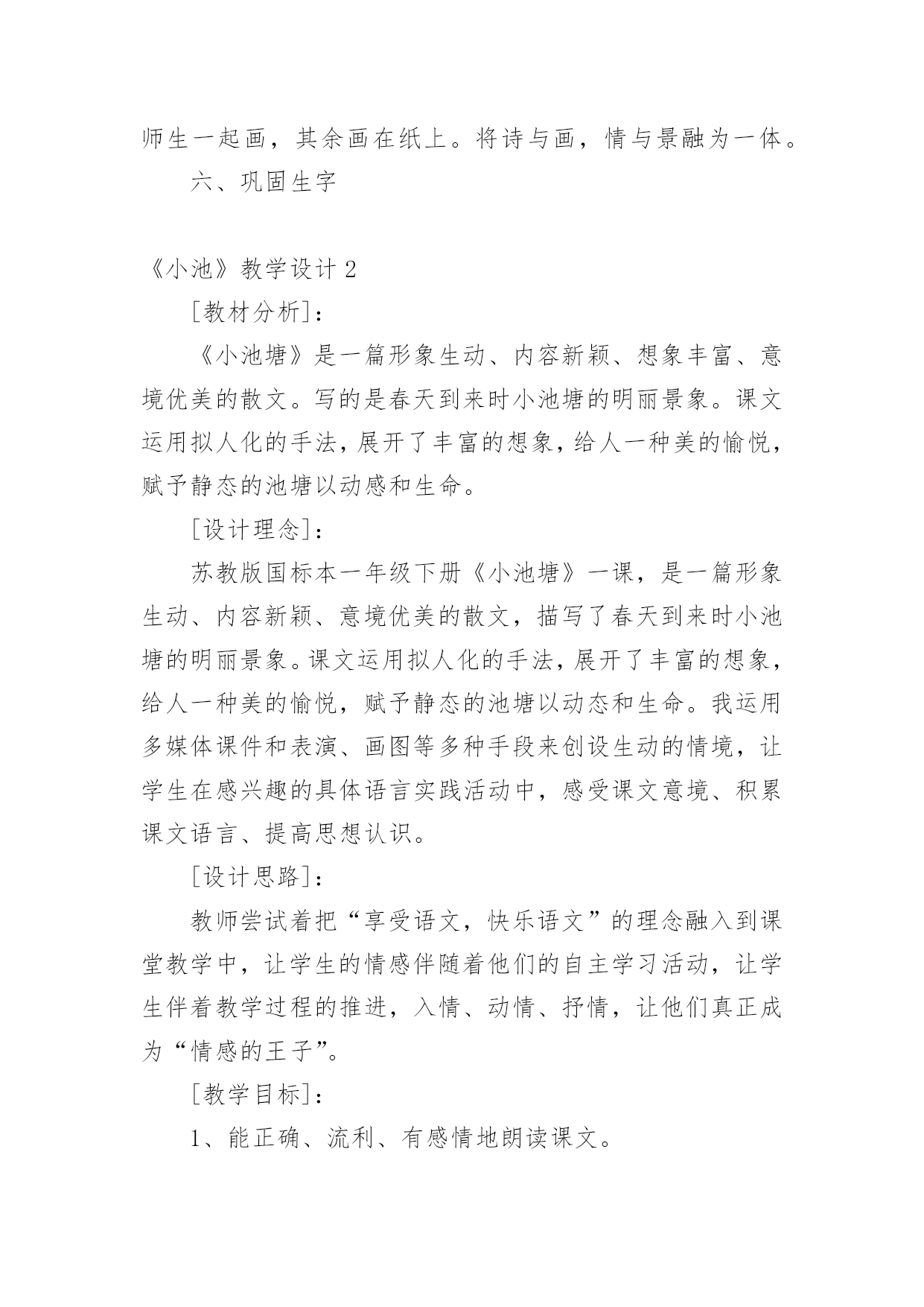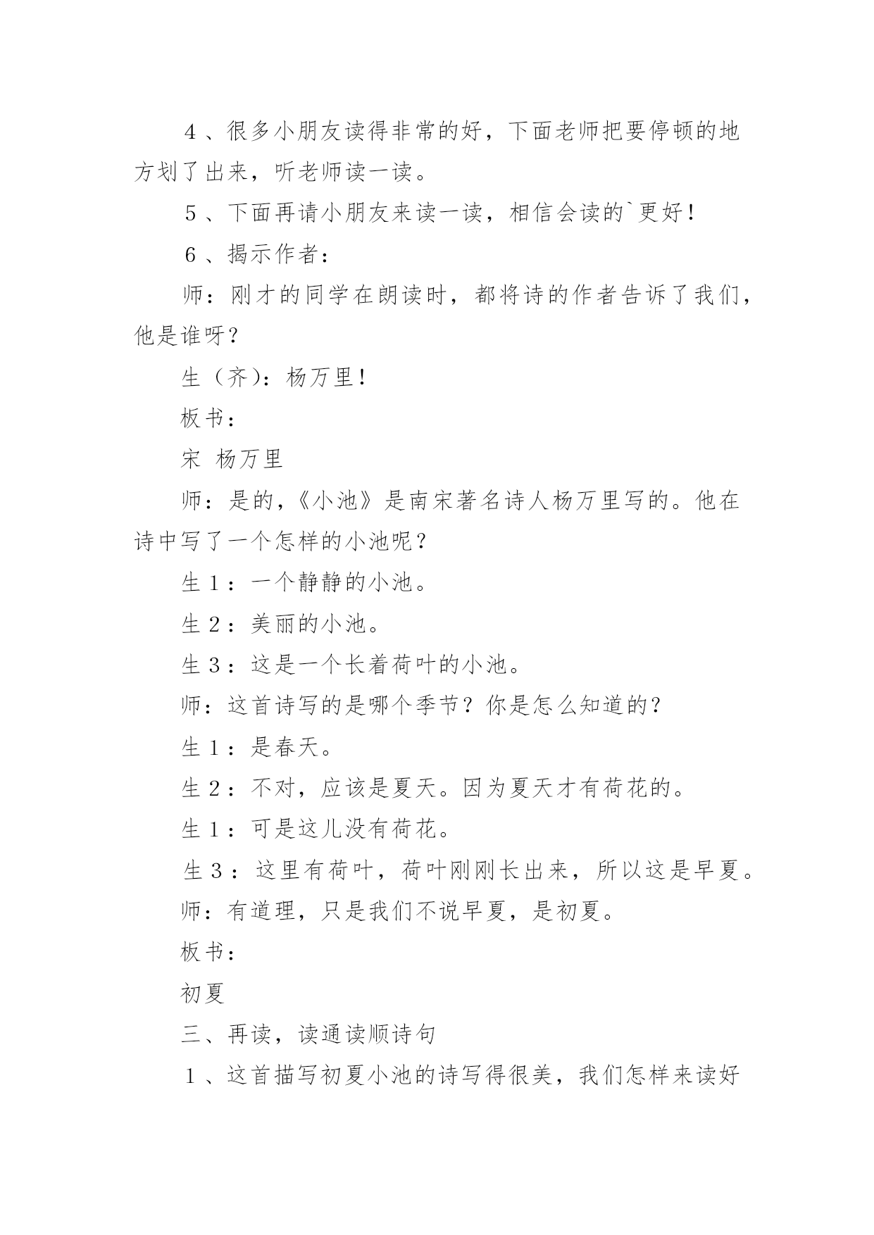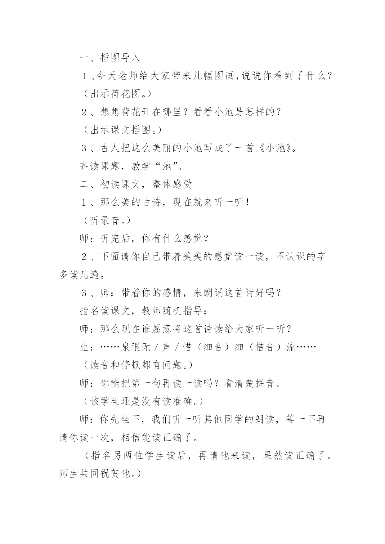 《小池》教学设计《小池》教学设计15篇作为一名默默奉献的教育工作者,往往需要进行教学设计编写工作,借助教学设计可使学生在单位时间内能够学到更多的知识。如何把教学设计做到重点突出呢?下面是小编收集整理的《小池》教学设计,欢迎大家借鉴与参考,希望对大家有所帮助。《小池》教学设计1【学习目标】1、认识“所”、“牧”等12个生字,会写“诗”、“林”等6个字。2、正确、流利、有感情地朗读古诗。背诵古诗。3、有朗读古诗的兴趣。【学习重难点】1、重点:认识12个生字,会写6个字;能正确流利地读古诗背诵古诗。2、难点:有感情地朗读古诗。【课前准备】多媒体课件。【教学过程】一、插图导入1、今天老师给大家带来几幅图画,说说你看到了什么?(出示荷花图。)2、想想荷花开在哪里?看看小池是怎样的?(出示课文插图。)3、古人把这么美丽的小池写成了一首《小池》。齐读课题,教学“池”。二、初读课文,整体感受1、那么美的古诗,现在就来听一听!(听录音。)师:听完后,你有什么感觉?2、下面请你自己带着美美的感觉读一读,不认识的字多读几遍。3、师:带着你的感情,来朗诵这首诗好吗?指名读课文,教师随机指导:师:那么现在谁愿意将这首诗读给大家听一听?生:……泉眼无/声/惜(细音)细(惜音)流……(读音和停顿都有问题。)师:你能把第一句再读一读吗?看清楚拼音。(该学生还是没有读准确。)师:你先坐下,我们听一听其他同学的朗读,等一下再请你读一次,相信能读正确了。(指名另两位学生读后,再请他来读,果然读正确了。师生共同祝贺他。)4、很多小朋友读得非常的好,下面老师把要停顿的地方划了出来,听老师读一读。5、下面再请小朋友来读一读,相信会读的`更好!6、揭示作者:师:刚才的同学在朗读时,都将诗的作者告诉了我们,他是谁呀?生(齐):杨万里!板书:宋杨万里师:是的,《小池》是南宋著名诗人杨万里写的。他在诗中写了一个怎样的小池呢?生1:一个静静的小池。生2:美丽的小池。生3:这是一个长着荷叶的小池。师:这首诗写的是哪个季节?你是怎么知道的?生1:是春天。生2:不对,应该是夏天。因为夏天才有荷花的。生1:可是这儿没有荷花。生3:这里有荷叶,荷叶刚刚长出来,所以这是早夏。师:有道理,只是我们不说早夏,是初夏。板书:初夏三、再读,读通读顺诗句1、这首描写初夏小池的诗写得很美,我们怎样来读好它呢?先来听听课文录音。2、齐读课文。3、指名叫一些学生来读或者背:师:她哪些地方已经读得好了,不足的地方又在哪儿?谁愿意将它指出来?4、小组互相朗读:还没有读的在小组里读,读给同学听听,互相纠正共同进步。同桌两人互相读。圈出生字,借助拼音读准生字,并说说你是怎样记住它们的。同桌把每句诗读通顺。5、检查朗读情况:指名读,小组赛读,全班齐读。四、交流,简单了解诗意1、师:通过读,你读懂了什么?你是从哪句读懂的?生1:我读懂了泉水是没有声音的,泉眼“无声”惜细流。生2:我读懂了泉水是轻轻地流过的,是从“泉眼无声惜细流”知道的生3:我知道了荷叶刚刚长出尖尖的角,就已经有蜻蜓停在上面了,是从后面两句读懂的。2、师:你能在插图中指一指那刚露出尖尖角的荷叶吗?指名该学生上来在图中指出,其余学生一起朗读:小荷才露尖尖角。生4:老师,那我有问题了,为什么蜻蜓是“立”在荷叶上,而不是“停”?生5:“立”在荷叶上就是“停”在荷叶上。像杂技表演那样倒过来了。3、师:哪里还读不懂?生:“泉眼”是什么意思?师:那我们来看看插图,你认为泉水是从哪边流出来的?生:是从右上方流过来的(指图)。师:泉眼也就是泉水流出的地方就在这边。生:“惜细流”的“惜”我又不懂了。师:你们谁能用“惜”组词吗?生:珍惜,爱惜。生2:哦,就是泉水爱惜流水。师:是啊,泉眼珍惜地让泉水轻轻流出。4、“晴柔”说明了天气怎样?所以是初夏。5、小荷是荷叶还是荷花?五、画画,加深对诗句的理解师:你能把这样的情景画一画吗?师:你觉得在你的画中应该画些什么呢?生1:荷叶,泉水,大树,蜻蜓。生2:还有太阳!师:为什么要画太阳?生2:因为这是个晴天。树阴照水爱“晴”柔。师:好!谁愿意来黑板前跟老师一起画一画?最后大家一起画一画,指名学生到黑板上和老师一起画,师生一起画,其余画在纸上。将诗与画,情与景融为一体。六、巩固生字《小池》教学设计2[教材分析]:《小池塘》是一篇形象生动、内容新颖、想象丰富、意境优美的散文。写的是春天到来时小池塘的明丽景象。课文运用拟人化的手法,展开了丰富的想象,给人一种美的愉悦,赋予静态的池塘以动感和生命。[设计理念]:苏教版国标本一年级下册《小池塘》一课,是一篇形象生动、内容新颖、意境优美的散文,描写了春天到来时小池塘的明丽景象。课文运用拟人化的手法,展开了丰富的想象,给人一种美的愉悦,赋予静态的池塘以动态和生命。我运用多媒体课件和表演、画图等多种