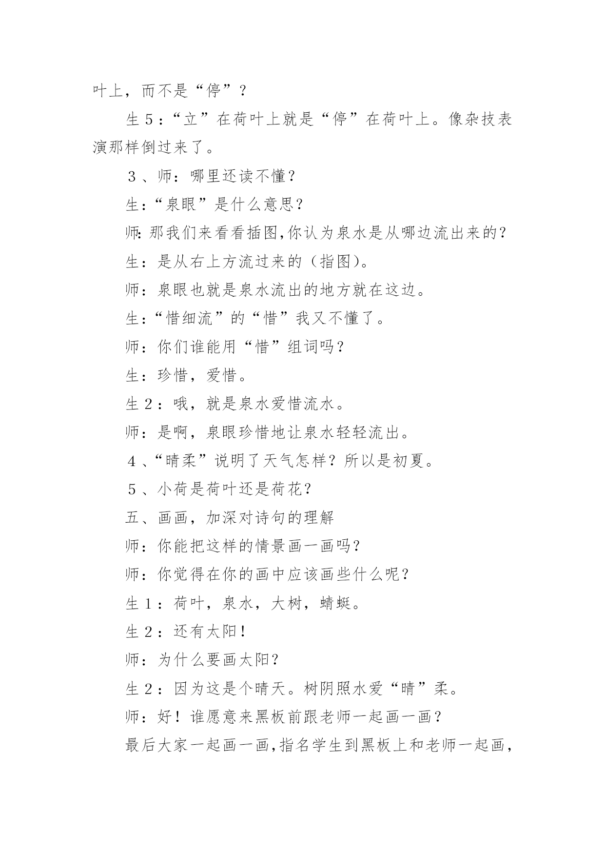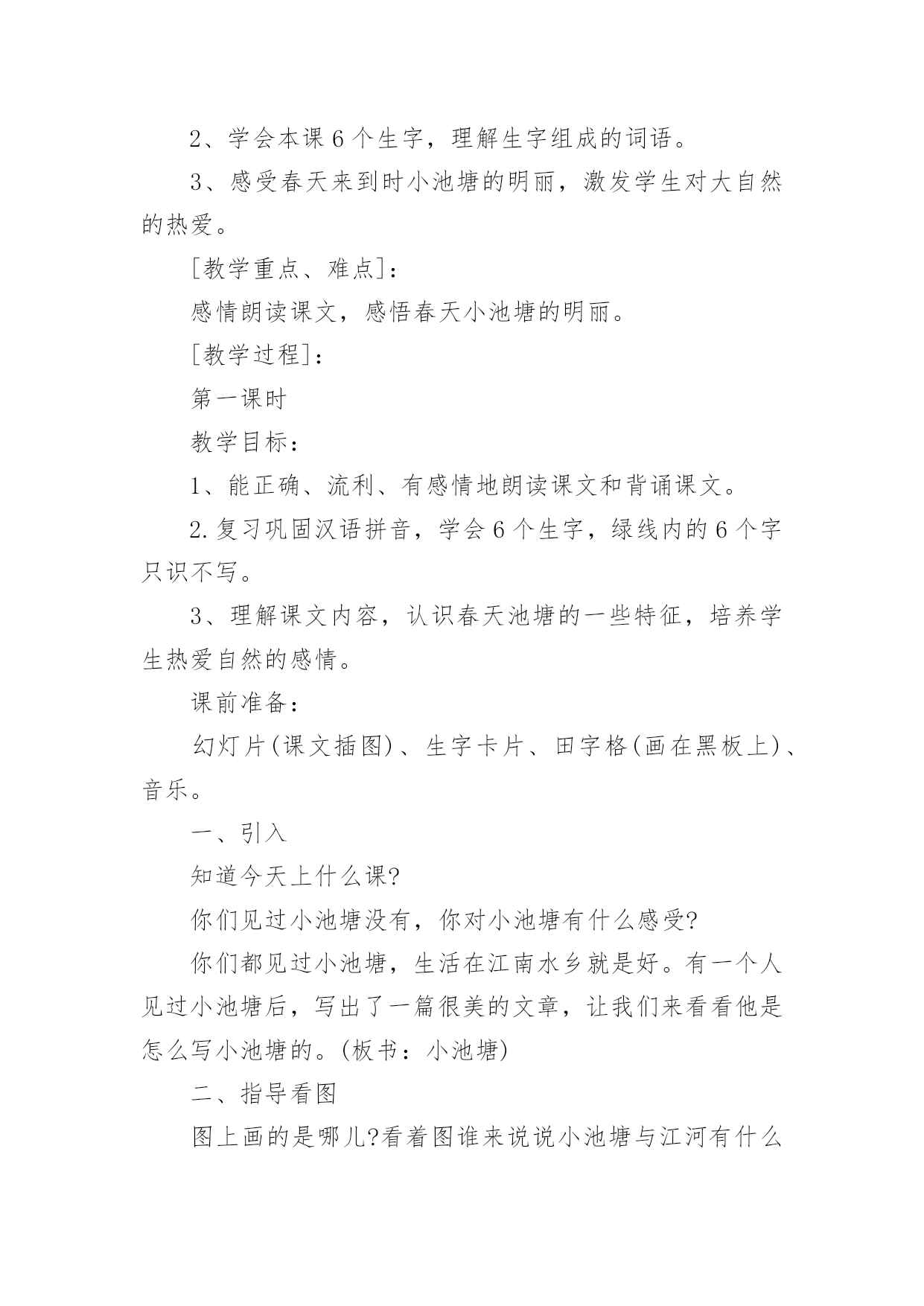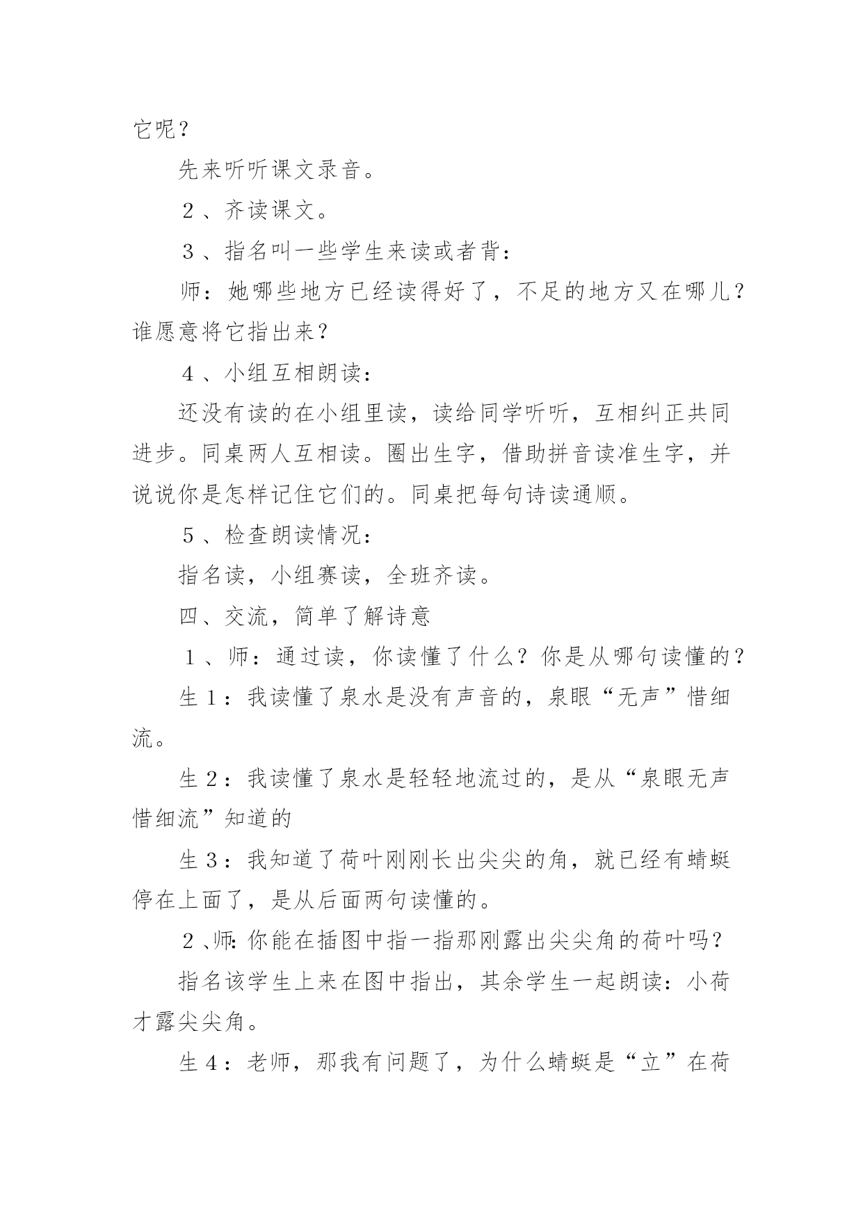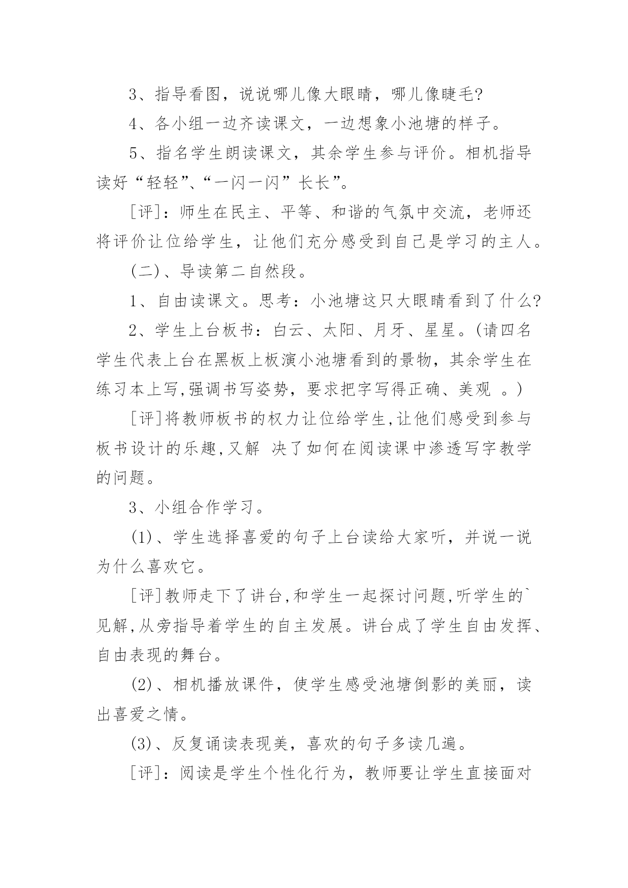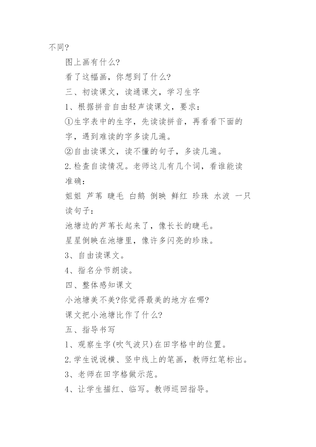 《小池》教学设计《小池》教学设计15篇作为一名默默奉献的教育工作者,往往需要进行教学设计编写工作,借助教学设计可使学生在单位时间内能够学到更多的知识。如何把教学设计做到重点突出呢?下面是小编收集整理的《小池》教学设计,欢迎大家借鉴与参考,希望对大家有所帮助。《小池》教学设计1【学习目标】1、认识“所”、“牧”等12个生字,会写“诗”、“林”等6个字。2、正确、流利、有感情地朗读古诗。背诵古诗。3、有朗读古诗的兴趣。【学习重难点】1、重点:认识12个生字,会写6个字;能正确流利地读古诗背诵古诗。2、难点:有感情地朗读古诗。【课前准备】多媒体课件。【教学过程】一、插图导入1、今天老师给大家带来几幅图画,说说你看到了什么?(出示荷花图。)2、想想荷花开在哪里?看看小池是怎样的?(出示课文插图。)3、古人把这么美丽的小池写成了一首《小池》。齐读课题,教学“池”。二、初读课文,整体感受1、那么美的古诗,现在就来听一听!(听录音。)师:听完后,你有什么感觉?2、下面请你自己带着美美的感觉读一读,不认识的字多读几遍。3、师:带着你的感情,来朗诵这首诗好吗?指名读课文,教师随机指导:师:那么现在谁愿意将这首诗读给大家听一听?生:……泉眼无/声/惜(细音)细(惜音)流……(读音和停顿都有问题。)师:你能把第一句再读一读吗?看清楚拼音。(该学生还是没有读准确。)师:你先坐下,我们听一听其他同学的朗读,等一下再请你读一次,相信能读正确了。(指名另两位学生读后,再请他来读,果然读正确了。师生共同祝贺他。)4、很多小朋友读得非常的好,下面老师把要停顿的地方划了出来,听老师读一读。5、下面再请小朋友来读一读,相信会读的`更好!6、揭示作者:师:刚才的同学在朗读时,都将诗的作者告诉了我们,他是谁呀?生(齐):杨万里!板书:宋杨万里师:是的,《小池》是南宋著名诗人杨万里写的。他在诗中写了一个怎样的小池呢?生1:一个静静的小池。生2:美丽的小池。生3:这是一个长着荷叶的小池。师:这首诗写的是哪个季节?你是怎么知道的?生1:是春天。生2:不对,应该是夏天。因为夏天才有荷花的。生1:可是这儿没有荷花。生3:这里有荷叶,荷叶刚刚长出来,所以这是早夏。师:有道理,只是我们不说早夏,是初夏。板书:初夏三、再读,读通读顺诗句1、这首描写初夏小池的诗写得很美,我们怎样来读好它呢?先来听听课文录音。2、齐读课文。3、指名叫一些学生来读或者背:师:她哪些地方已经读得好了,不足的地方又在哪儿?谁愿意将它指出来?4、小组互相朗读:还没有读的在小组里读,读给同学听听,互相纠正共同进步。同桌两人互相读。圈出生字,借助拼音读准生字,并说说你是怎样记住它们的。同桌把每句诗读通顺。5、检查朗读情况:指名读,小组赛读,全班齐读。四、交流,简单了解诗意1、师:通过读,你读懂了什么?你是从哪句读懂的?生1:我读懂了泉水是没有声音的,泉眼“无声”惜细流。生2:我读懂了泉水是轻轻地流过的,是从“泉眼无声惜细流”知道的生3:我知道了荷叶刚刚长出尖尖的角,就已经有蜻蜓停在上面了,是从后面两句读懂的。2、师:你能在插图中指一指那刚露出尖尖角的荷叶吗?指名该学生上来在图中指出,其余学生一起朗读:小荷才露尖尖角。生4:老师,那我有问题了,为什么蜻蜓是“立”在荷叶上,而不是“停”?生5:“立”在荷叶上就是“停”在荷叶上。像杂技表演那样倒过来了。3、师:哪里还读不懂?生:“泉眼”是什么意思?师:那我们来看看插图,你认为泉水是从哪边流出来的?生:是从右上方流过来的(指图)。师:泉眼也就是泉水流出的地方就在这边。生:“惜细流”的“惜”我又不懂了。师:你们谁能用“惜”组词吗?生:珍惜,爱惜。生2:哦,就是泉水爱惜流水。师:是啊,泉眼珍惜地让泉水轻轻流出。4、“晴柔”说明了天气怎样?所以是初夏。5、小荷是荷叶还是荷花?五、画画,加深对诗句的理解师:你能把这样的情景画一画吗?师:你觉得在你的画中应该画些什么呢?生1:荷叶,泉水,大树,蜻蜓。生2:还有太阳!师:为什么要画太阳?生2:因为这是个晴天。树阴照水爱“晴”柔。师:好!谁愿意来黑板前跟老师一起画一画?最后大家一起画一画,指名学生到黑板上和老师一起画,师生一起画,其余画在纸上。将诗与画,情与景融为一体。六、巩固生字《小池》教学设计2[教材分析]:《小池塘》是一篇形象生动、内容新颖、想象丰富、意境优美的散文。写的是春天到来时小池塘的明丽景象。课文运用拟人化的手法,展开了丰富的想象,给人一种美的愉悦,赋予静态的池塘以动感和生命。[设计理念]:苏教版国标本一年级下册《小池塘》一课,是一篇形象生动、内容新颖、意境优美的散文,描写了春天到来时小池塘的明丽景象。课文运用拟人化的手法,展开了丰富的想象,给人一种美的愉悦,赋予静态的池塘以动态和生命。我运用多媒体课件和表演、画图等多种