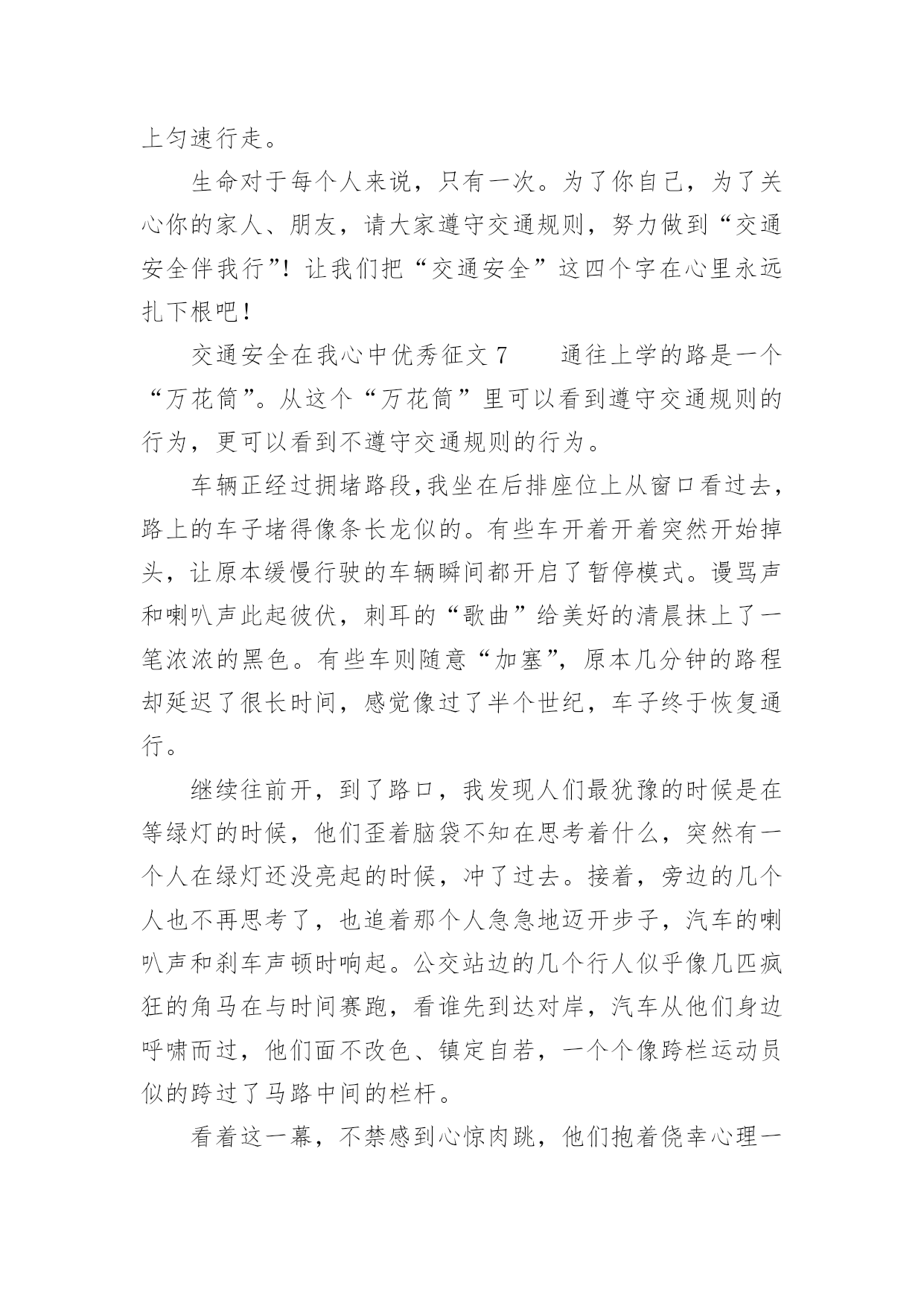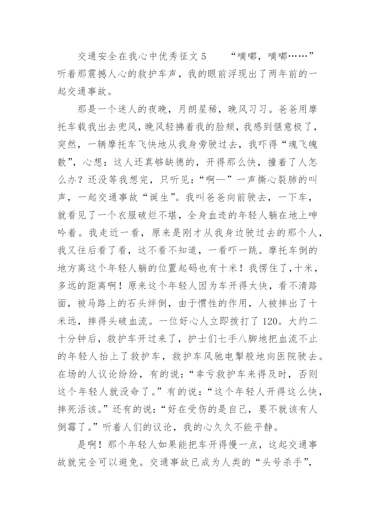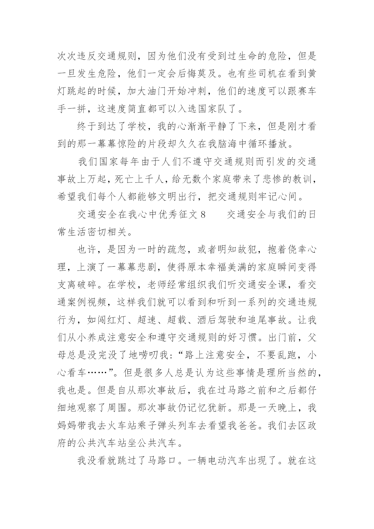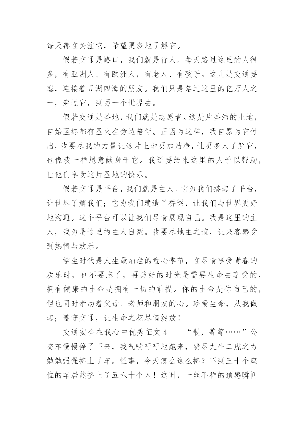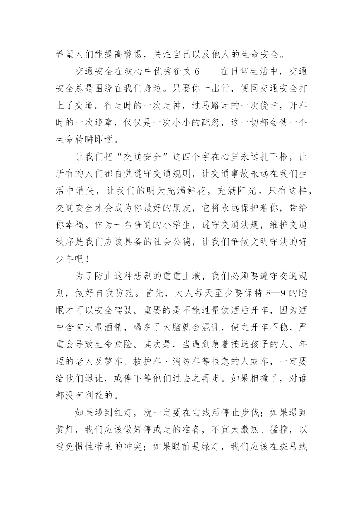 交通安全在我心中优秀征文交通安全在我心中优秀征文600字(通用20篇)无论在学习、工作或是生活中,大家总少不了接触征文吧,征文要求篇段合乎格式,字数合乎规定。怎么写征文才能避免踩雷呢?以下是小编精心整理的交通安全在我心中优秀征文600字(通用20篇),欢迎大家分享。交通安全在我心中优秀征文1看完交通安全的视频,让我,深有感触,从中我认识到了醉驾的要害,无证驾驶的可怕,未成年人上路的危险安全头盔的立柱,以及小车和货车的盲区广大。在日常生活中说到交通事故,一定会想到这有什么可怕的,其实产生这样的思想,主要还是我们对交通事故的不了解,也很遥远,因为我们的朋友,家人,亲戚都没有发生过交通事故,可当看到仅在小小的晋城市中发生了上万例交通事故,还有死亡上百的人,损失的财产在900万左右。那么在这上万例的事故中,有许多种,其中让我印象最深刻的是醉驾和小车和大货车的盲区,首先醉驾是由一个视频延伸出来的,这个视频讲到孙某某与几位好友庆祝43在饭店中大喝几人因此醉酒,几人喝完后准备回家,虽说几人在找自己的车时已很困难,但孙某某为了面子逞强,还选择开车带朋友们回家,在途中,小车失控撞断公路围栏,使小车冲到山坡下,当警察来到现场时,车已变形,车中几人有的离世,有的重伤离世,这几人的父母也是很悲痛的,正如一句话“行车不规范,亲人两行泪”这不仅对父母的伤害大,还影响到他们未来的子女,使子女们就业困难,上学困难等等,所以我们要牢记“喝酒不开车,开车不喝酒”也不要在一时逞强而丢掉了自己的性命。在盲区中小车还算好,因为大货车的盲区占全车的视线区一半不到,小撒在一档节目中做了实验,分别放一个人,一辆婴儿车,一辆自行车可以看到货车在行驶中形成了内轮差,人被压的粉碎,婴儿车受擦碰,则自行车被压的散架,所以我们要远离大货车,站在安全台上等候车辆。交通事故并不遥远,只是曾为经历,遵守交通为你我他会更好。交通安全在我心中优秀征文2现在交通方便了,出门有汽车、火车、飞机、轮船等各种工具。有人会说:科学进步了,不用费什么劲就可以到很远的地方,这样多好啊!但是,方便给我们带来的悲痛,也真不少呀!每年因交通事故伤亡的人不计其数,那血腥的场面,那伤者的呻吟,那亲人的哭泣,刺痛着无数人的心。又有人看不下去了:干脆以后不要再使用这些交通工具了!但是,这样就不能享受科技给我们带来的方便和益处了。为了两全其美,人们制定了各种交通规则,也形成了各种安全交通常识。只要认真遵守交通规则,就可以减少各种交通事故,因为遵守规则的人最安全。我们小学生更要学习交通安全知识,下面是常用的几条:1、十二岁以下的儿童不准骑车上路:年龄小,处理事情的能力也比较差,一旦发生意外,很容易造成事故。我也曾经有过到马路上骑车的念头,但想到自己不满十二岁和看到交通事故现场的一幕幕,我又一次次打消了这个想法。我对不满十二岁的儿童呼吁:遵守规则,不要骑车上路!2、道路宽,不拥挤,有秩序,民满意:道路再宽,也难免有拥挤、堵塞的现象,这时,我们就要做到有秩序、不拥挤,互相谦让,宁停三分,不抢一秒。既减少了事故的发生,又增进了社会和谐。3、红灯停,绿灯行,黄灯等一等;听警察,走对道,大家都高兴:红绿灯是为了保持交通秩序而设的,红灯亮了,停止不动;绿灯亮了,才可通行;黄灯是红绿灯转换或者发生意外时才会亮,也要等在原地,不能通行。机动车、自行车和行人都要走各自的道路,还要服从警察的指挥,这样,大家才能高高兴兴回到家里。让我们学习交通规章,平时严格遵守,为良好的交通秩序和防止交通事故的发生而尽力!交通安全在我心中优秀征文3“交通”,一个再熟悉不过的名词了。不过,大家可千万不要小看这个名词,在这个名词里面,有无数的人从这里走过,也有无数的人在这里丧失生命。作为这个世界的一员,我们应让这个世界变得更加美好,首先从交通开始。假若交通是窗口,我们就是守望者。这是一扇极大的窗,被擦得明亮。透过它,看到的是世界。这里每天都在变,这里每天都有新兴事物在更替。而我们,这群忠诚的守望者,每天都在关注它,希望更多地了解它。假若交通是路口,我们就是行人。每天路过这里的人很多,有亚洲人、有欧洲人,有老人、有孩子。这儿是交通要塞,连接着五湖四海的朋友。我们只是路过这里的亿万人之一,穿过它,到另一个世界去。假若交通是圣地,我们就是志愿者。这是片圣洁的土地,自始至终都有圣火在旁边陪伴。正因为这样,我自愿为它付出,我要尽我的力量让这片土地更加洁净,让更多人了解它,也像我一样愿意献身于它。我还要给来这里的人予以帮助,让他们享受这片圣地的快乐。假若交通是平台,我们就是主人。它为我们搭起了平台,让世界了解我们;它为我们建造了桥梁,让我们与世界更好地沟通。这个平台可以让我们尽情展现自己。我是这里的主人,我为是这里的主人自豪。我要尽地主之谊,让来客感受到热情与欢乐。学生时代