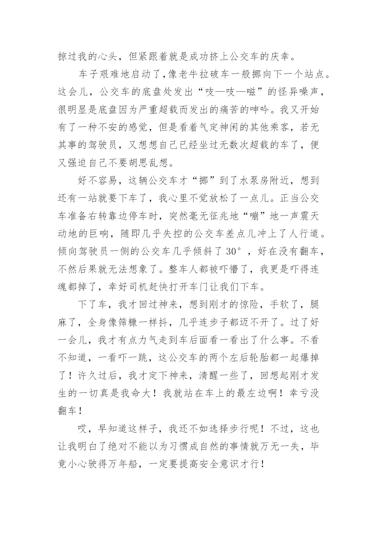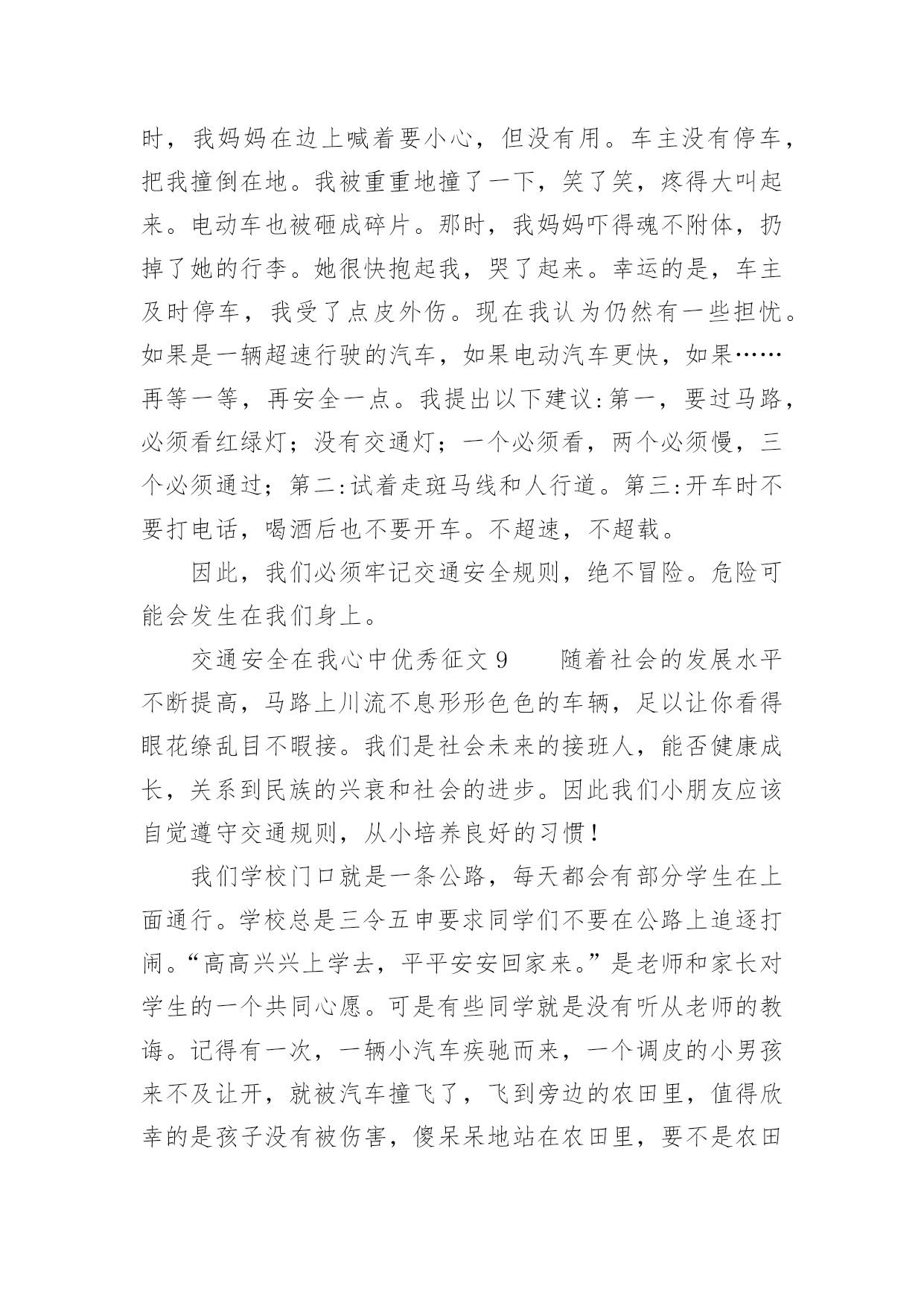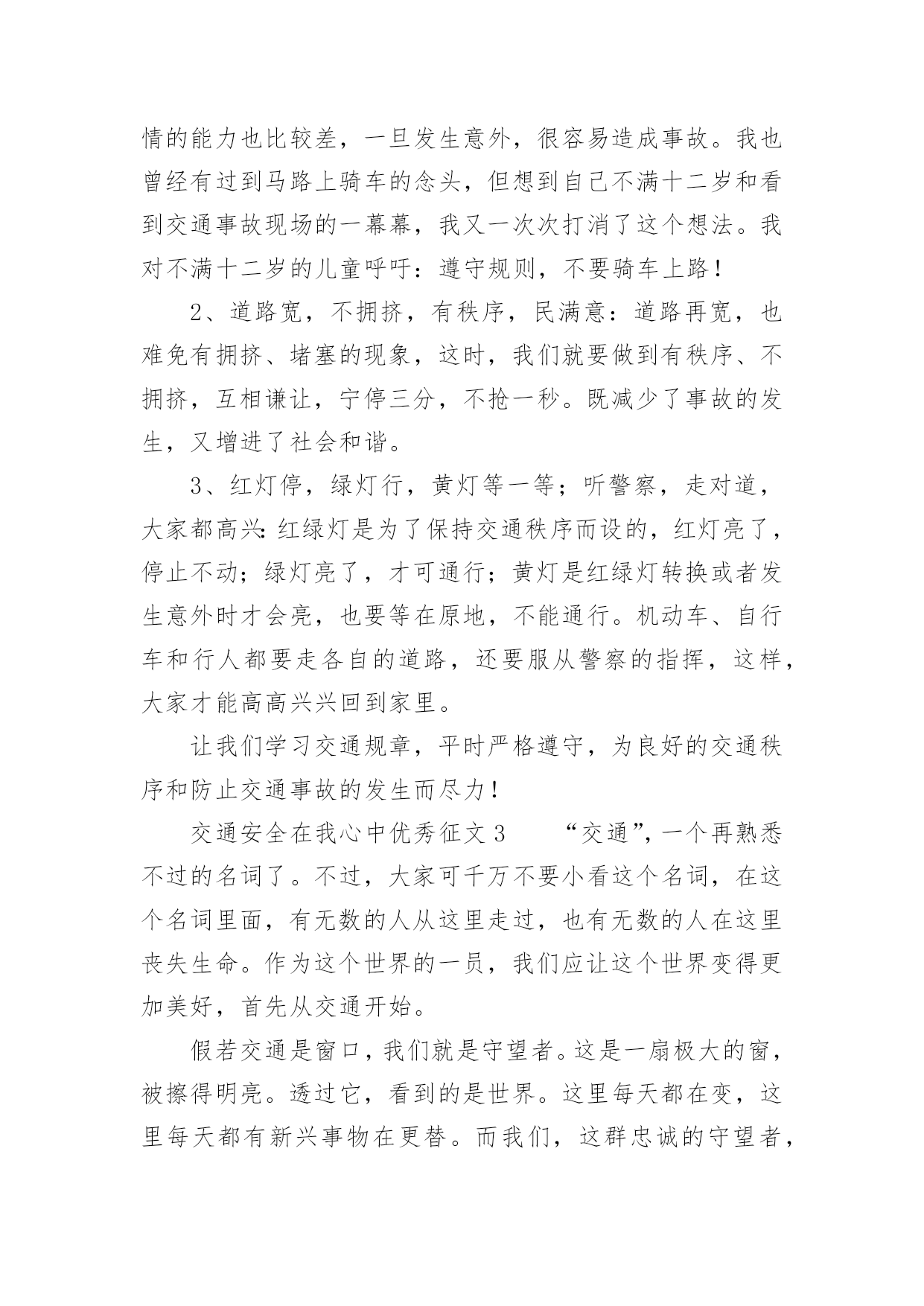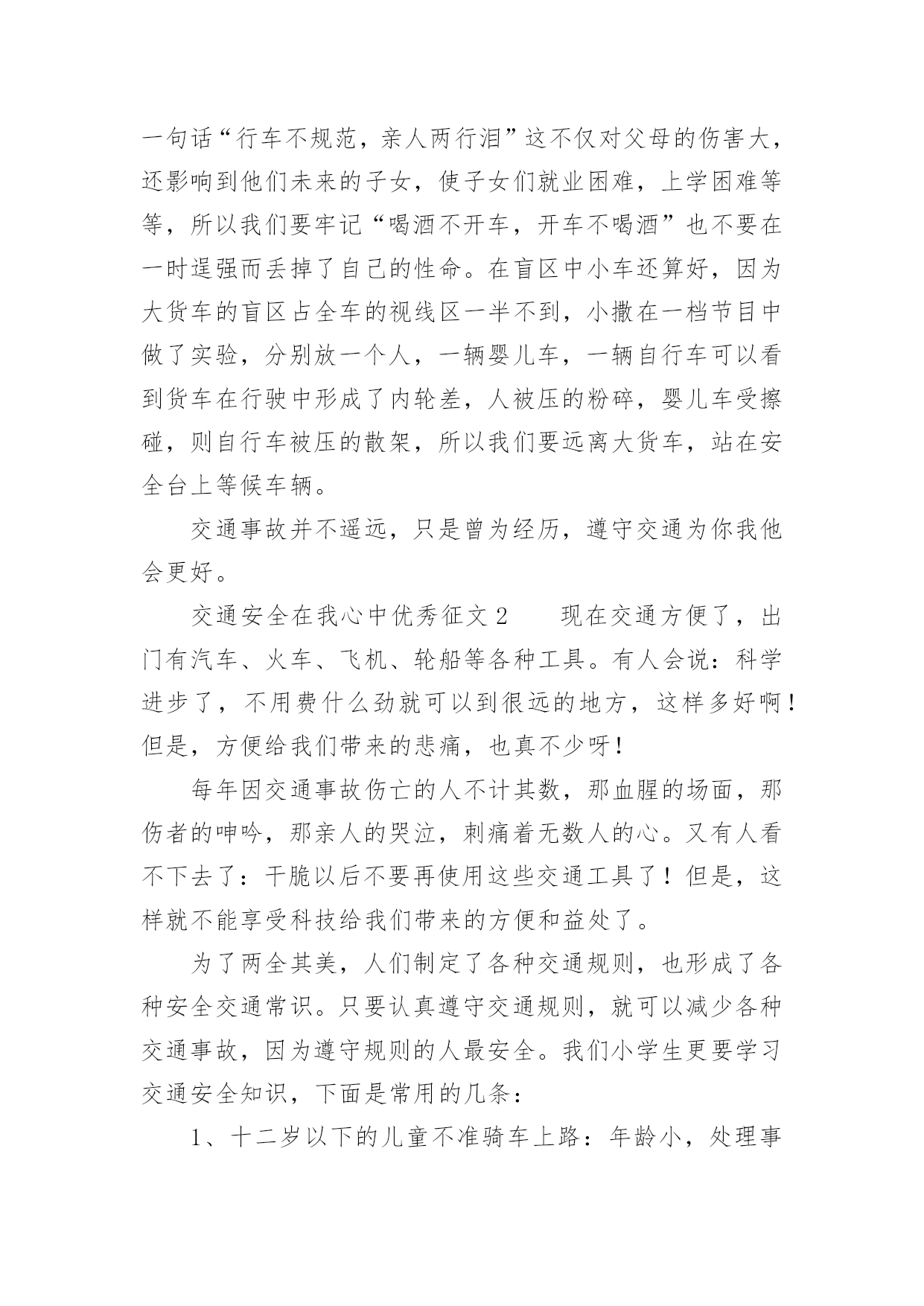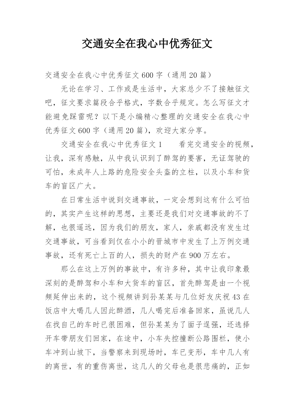 交通安全在我心中优秀征文交通安全在我心中优秀征文600字(通用20篇)无论在学习、工作或是生活中,大家总少不了接触征文吧,征文要求篇段合乎格式,字数合乎规定。怎么写征文才能避免踩雷呢?以下是小编精心整理的交通安全在我心中优秀征文600字(通用20篇),欢迎大家分享。交通安全在我心中优秀征文1看完交通安全的视频,让我,深有感触,从中我认识到了醉驾的要害,无证驾驶的可怕,未成年人上路的危险安全头盔的立柱,以及小车和货车的盲区广大。在日常生活中说到交通事故,一定会想到这有什么可怕的,其实产生这样的思想,主要还是我们对交通事故的不了解,也很遥远,因为我们的朋友,家人,亲戚都没有发生过交通事故,可当看到仅在小小的晋城市中发生了上万例交通事故,还有死亡上百的人,损失的财产在900万左右。那么在这上万例的事故中,有许多种,其中让我印象最深刻的是醉驾和小车和大货车的盲区,首先醉驾是由一个视频延伸出来的,这个视频讲到孙某某与几位好友庆祝43在饭店中大喝几人因此醉酒,几人喝完后准备回家,虽说几人在找自己的车时已很困难,但孙某某为了面子逞强,还选择开车带朋友们回家,在途中,小车失控撞断公路围栏,使小车冲到山坡下,当警察来到现场时,车已变形,车中几人有的离世,有的重伤离世,这几人的父母也是很悲痛的,正如一句话“行车不规范,亲人两行泪”这不仅对父母的伤害大,还影响到他们未来的子女,使子女们就业困难,上学困难等等,所以我们要牢记“喝酒不开车,开车不喝酒”也不要在一时逞强而丢掉了自己的性命。在盲区中小车还算好,因为大货车的盲区占全车的视线区一半不到,小撒在一档节目中做了实验,分别放一个人,一辆婴儿车,一辆自行车可以看到货车在行驶中形成了内轮差,人被压的粉碎,婴儿车受擦碰,则自行车被压的散架,所以我们要远离大货车,站在安全台上等候车辆。交通事故并不遥远,只是曾为经历,遵守交通为你我他会更好。交通安全在我心中优秀征文2现在交通方便了,出门有汽车、火车、飞机、轮船等各种工具。有人会说:科学进步了,不用费什么劲就可以到很远的地方,这样多好啊!但是,方便给我们带来的悲痛,也真不少呀!每年因交通事故伤亡的人不计其数,那血腥的场面,那伤者的呻吟,那亲人的哭泣,刺痛着无数人的心。又有人看不下去了:干脆以后不要再使用这些交通工具了!但是,这样就不能享受科技给我们带来的方便和益处了。为了两全其美,人们制定了各种交通规则,也形成了各种安全交通常识。只要认真遵守交通规则,就可以减少各种交通事故,因为遵守规则的人最安全。我们小学生更要学习交通安全知识,下面是常用的几条:1、十二岁以下的儿童不准骑车上路:年龄小,处理事情的能力也比较差,一旦发生意外,很容易造成事故。我也曾经有过到马路上骑车的念头,但想到自己不满十二岁和看到交通事故现场的一幕幕,我又一次次打消了这个想法。我对不满十二岁的儿童呼吁:遵守规则,不要骑车上路!2、道路宽,不拥挤,有秩序,民满意:道路再宽,也难免有拥挤、堵塞的现象,这时,我们就要做到有秩序、不拥挤,互相谦让,宁停三分,不抢一秒。既减少了事故的发生,又增进了社会和谐。3、红灯停,绿灯行,黄灯等一等;听警察,走对道,大家都高兴:红绿灯是为了保持交通秩序而设的,红灯亮了,停止不动;绿灯亮了,才可通行;黄灯是红绿灯转换或者发生意外时才会亮,也要等在原地,不能通行。机动车、自行车和行人都要走各自的道路,还要服从警察的指挥,这样,大家才能高高兴兴回到家里。让我们学习交通规章,平时严格遵守,为良好的交通秩序和防止交通事故的发生而尽力!交通安全在我心中优秀征文3“交通”,一个再熟悉不过的名词了。不过,大家可千万不要小看这个名词,在这个名词里面,有无数的人从这里走过,也有无数的人在这里丧失生命。作为这个世界的一员,我们应让这个世界变得更加美好,首先从交通开始。假若交通是窗口,我们就是守望者。这是一扇极大的窗,被擦得明亮。透过它,看到的是世界。这里每天都在变,这里每天都有新兴事物在更替。而我们,这群忠诚的守望者,每天都在关注它,希望更多地了解它。假若交通是路口,我们就是行人。每天路过这里的人很多,有亚洲人、有欧洲人,有老人、有孩子。这儿是交通要塞,连接着五湖四海的朋友。我们只是路过这里的亿万人之一,穿过它,到另一个世界去。假若交通是圣地,我们就是志愿者。这是片圣洁的土地,自始至终都有圣火在旁边陪伴。正因为这样,我自愿为它付出,我要尽我的力量让这片土地更加洁净,让更多人了解它,也像我一样愿意献身于它。我还要给来这里的人予以帮助,让他们享受这片圣地的快乐。假若交通是平台,我们就是主人。它为我们搭起了平台,让世界了解我们;它为我们建造了桥梁,让我们与世界更好地沟通。这个平台可以让我们尽情展现自己。我是这里的主人,我为是这里的主人自豪。我要尽地主之谊,让来客感受到热情与欢乐。学生时代