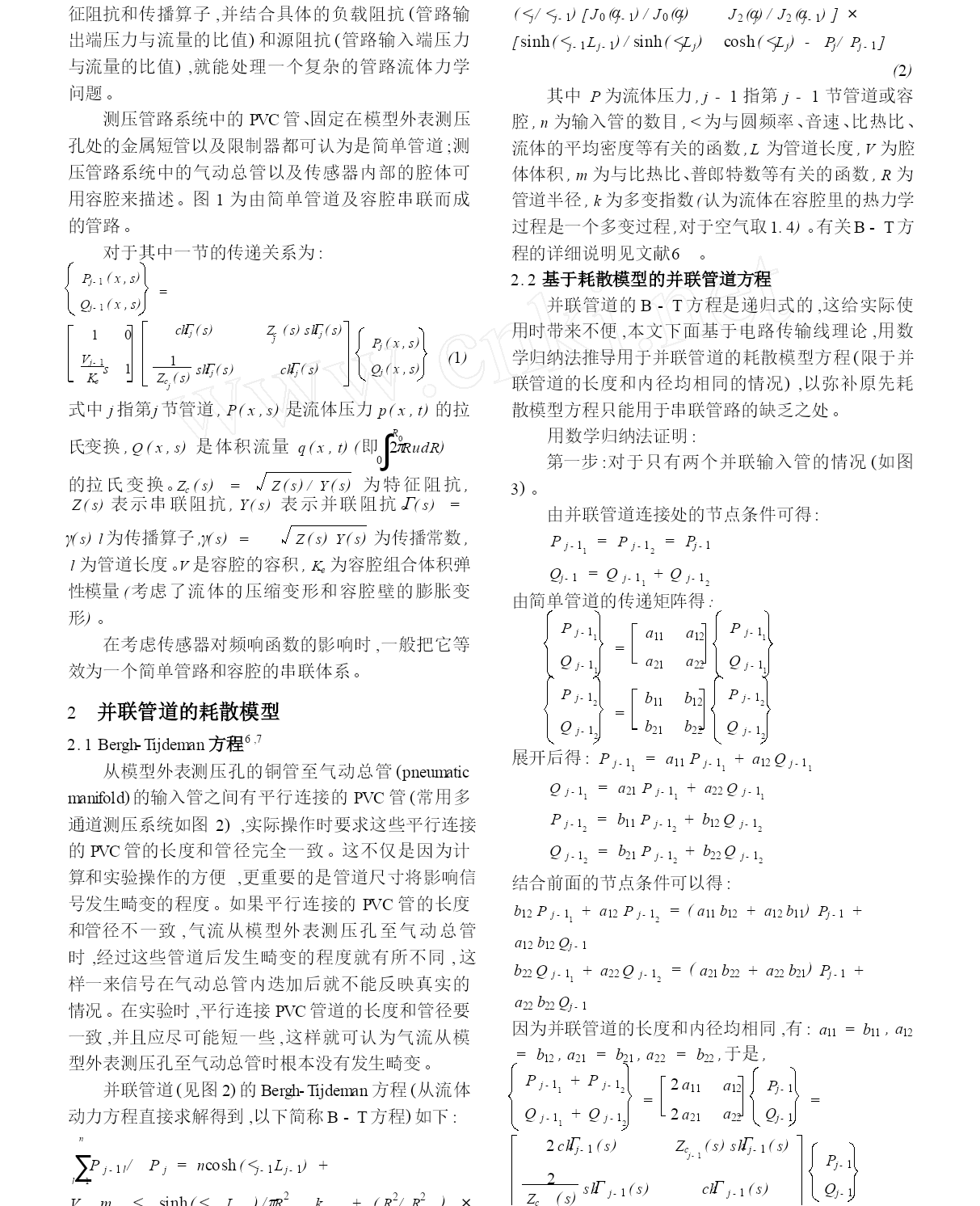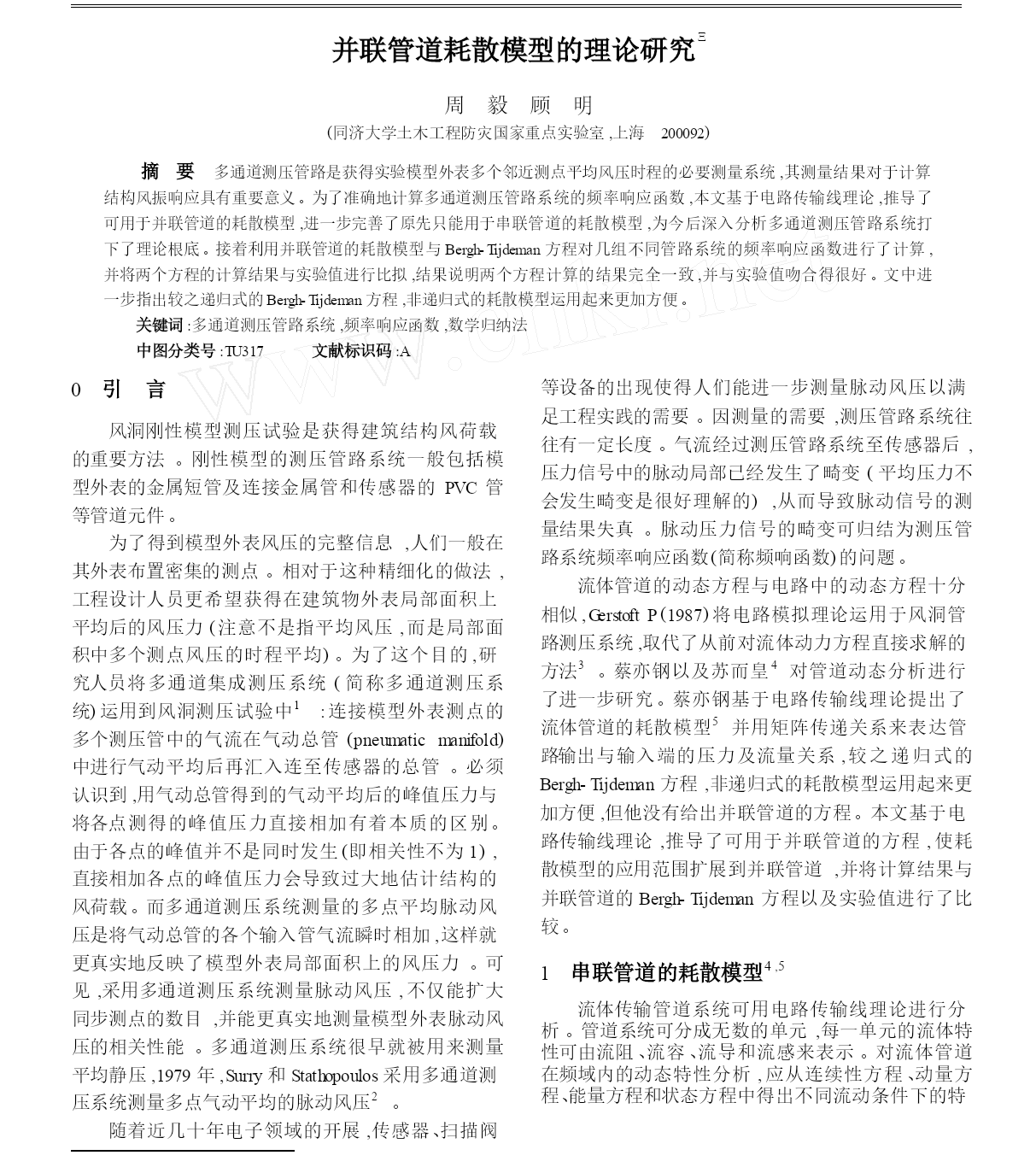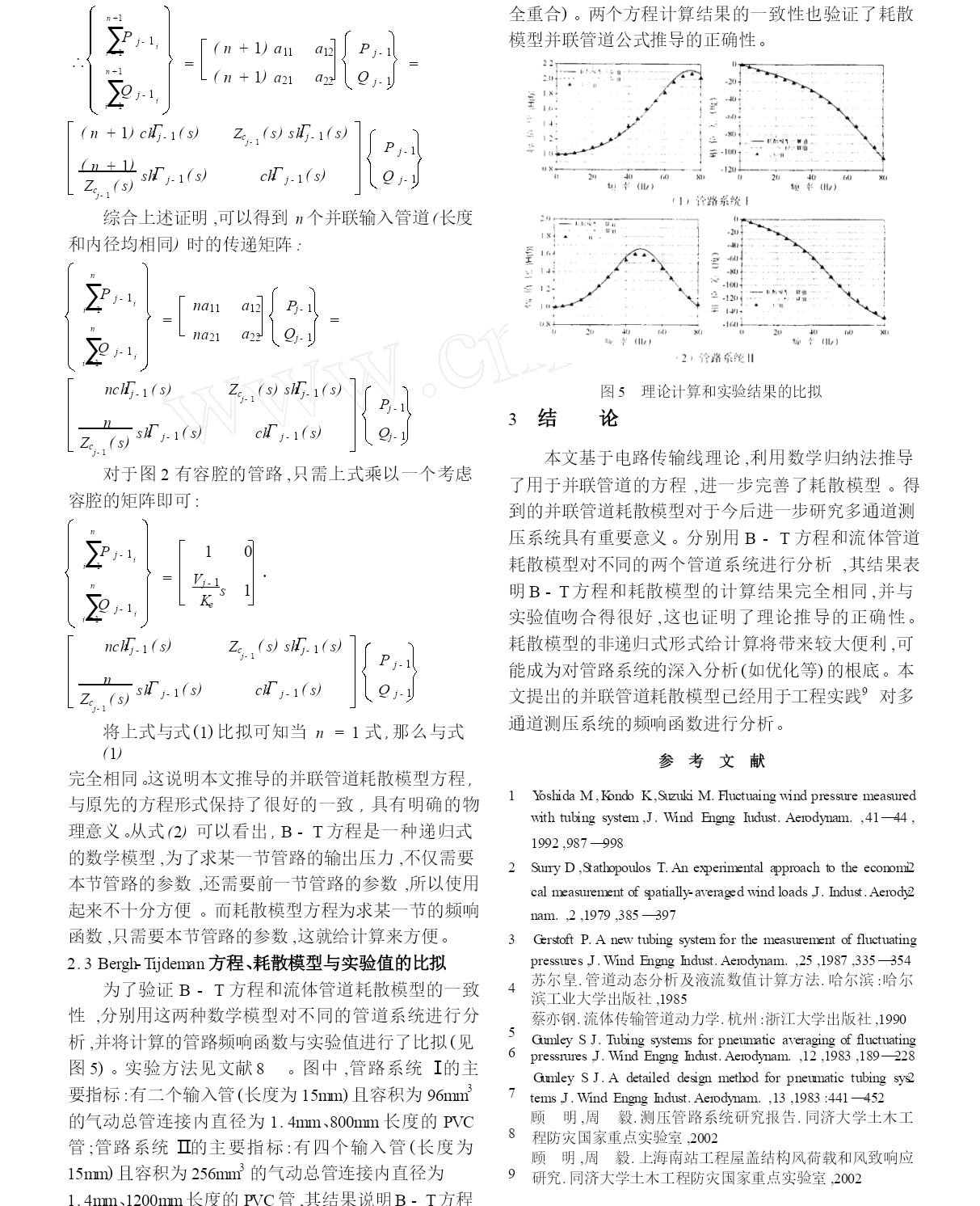并联管道耗散模型的理论研究【完整版】(文档可以直接使用,也可根据实际需要修订后使用,可编辑放心下载)Ξ并联管道耗散模型的理论研究周毅顾明(同济大学土木工程防灾国家重点实验室,上海200092)摘要多通道测压管路是获得实验模型外表多个邻近测点平均风压时程的必要测量系统,其测量结果对于计算结构风振响应具有重要意义。为了准确地计算多通道测压管路系统的频率响应函数,本文基于电路传输线理论,推导了可用于并联管道的耗散模型,进一步完善了原先只能用于串联管道的耗散模型,为今后深入分析多通道测压管路系统打下了理论根底。接着利用并联管道的耗散模型与Bergh-Tijdeman方程对几组不同管路系统的频率响应函数进行了计算,并将两个方程的计算结果与实验值进行比拟,结果说明两个方程计算的结果完全一致,并与实验值吻合得很好。文中进一步指出较之递归式的Bergh-Tijdeman方程,非递归式的耗散模型运用起来更加方便。关键词:多通道测压管路系统,频率响应函数,数学归纳法中图分类号:TU317文献标识码:A等设备的出现使得人们能进一步测量脉动风压以满足工程实践的需要。因测量的需要,测压管路系统往往有一定长度。气流经过测压管路系统至传感器后,压力信号中的脉动局部已经发生了畸变(平均压力不会发生畸变是很好理解的),从而导致脉动信号的测量结果失真。脉动压力信号的畸变可归结为测压管路系统频率响应函数(简称频响函数)的问题。流体管道的动态方程与电路中的动态方程十分相似,GerstoftP(1987)将电路模拟理论运用于风洞管路测压系统,取代了从前对流体动力方程直接求解的0引言风洞刚性模型测压试验是获得建筑结构风荷载的重要方法。刚性模型的测压管路系统一般包括模型外表的金属短管及连接金属管和传感器的PVC管等管道元件。为了得到模型外表风压的完整信息,人们一般在其外表布置密集的测点。相对于这种精细化的做法,工程设计人员更希望获得在建筑物外表局部面积上平均后的风压力(注意不是指平均风压,而是局部面积中多个测点风压的时程平均)。为了这个目的,研究人员将多通道集成测压系统(简称多通道测压系统)运用到风洞测压试验中1:连接模型外表测点的多个测压管中的气流在气动总管(pneumaticmanifold)中进行气动平均后再汇入连至传感器的总管。必须认识到,用气动总管得到的气动平均后的峰值压力与将各点测得的峰值压力直接相加有着本质的区别。由于各点的峰值并不是同时发生(即相关性不为1),直接相加各点的峰值压力会导致过大地估计结构的风荷载。而多通道测压系统测量的多点平均脉动风压是将气动总管的各个输入管气流瞬时相加,这样就更真实地反映了模型外表局部面积上的风压力。可见,采用多通道测压系统测量脉动风压,不仅能扩大同步测点的数目,并能更真实地测量模型外表脉动风压的相关性能。多通道测压系统很早就被用来测量平均静压,1979年,Surry和Stathopoulos采用多通道测压系统测量多点气动平均的脉动风压2。随着近几十年电子领域的开展,传感器、扫描阀34方法。蔡亦钢以及苏而皇对管道动态分析进行了进一步研究。蔡亦钢基于电路传输线理论提出了5流体管道的耗散模型并用矩阵传递关系来表达管路输出与输入端的压力及流量关系,较之递归式的Bergh-Tijdeman方程,非递归式的耗散模型运用起来更加方便,但他没有给出并联管道的方程。本文基于电路传输线理论,推导了可用于并联管道的方程,使耗散模型的应用范围扩展到并联管道,并将计算结果与并联管道的Bergh-Tijdeman方程以及实验值进行了比较。1串联管道的耗散模型4,5流体传输管道系统可用电路传输线理论进行分析。管道系统可分成无数的单元,每一单元的流体特性可由流阻、流容、流导和流感来表示。对流体管道在频域内的动态特性分析,应从连续性方程、动量方程、能量方程和状态方程中得出不同流动条件下的特征阻抗和传播算子,并结合具体的负载阻抗(管路输出端压力与流量的比值)和源阻抗(管路输入端压力与流量的比值),就能处理一个复杂的管路流体力学问题。测压管路系统中的PVC管、固定在模型外表测压孔处的金属短管以及限制器都可认为是简单管道;测压管路系统中的气动总管以及传感器内部的腔体可用容腔来描述。图1为由简单管道及容腔串联而成的管路。对于其中一节的传递关系为:Pj-1(x,s)(<j/<j-1)[J0(αj-1)/J0(αj)[sinh(<j-1Lj-1)/sinh(<jLj)J2(αj)/J2(αj-1)]×cosh(<jLj)-Pj/Pj-1](2)其中P为流体压力,j-1指第j-1节管道或容腔,n为输入管的数目,<为与圆频率、音速、比热比、流体的平均密度
