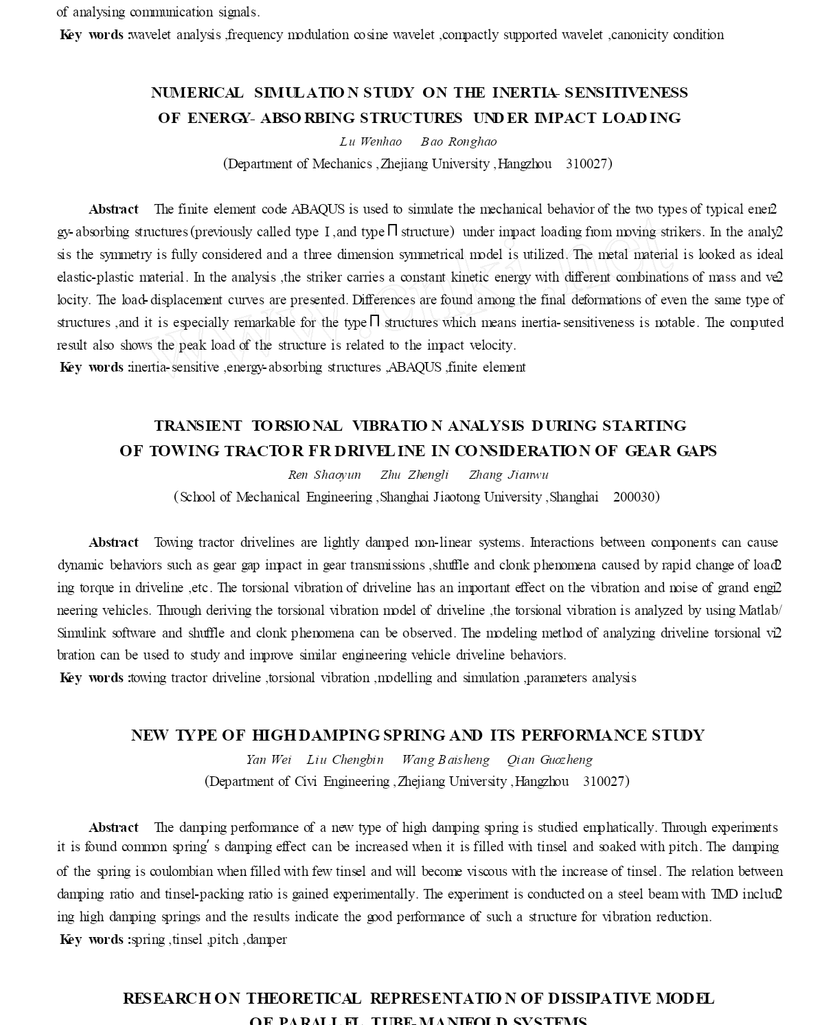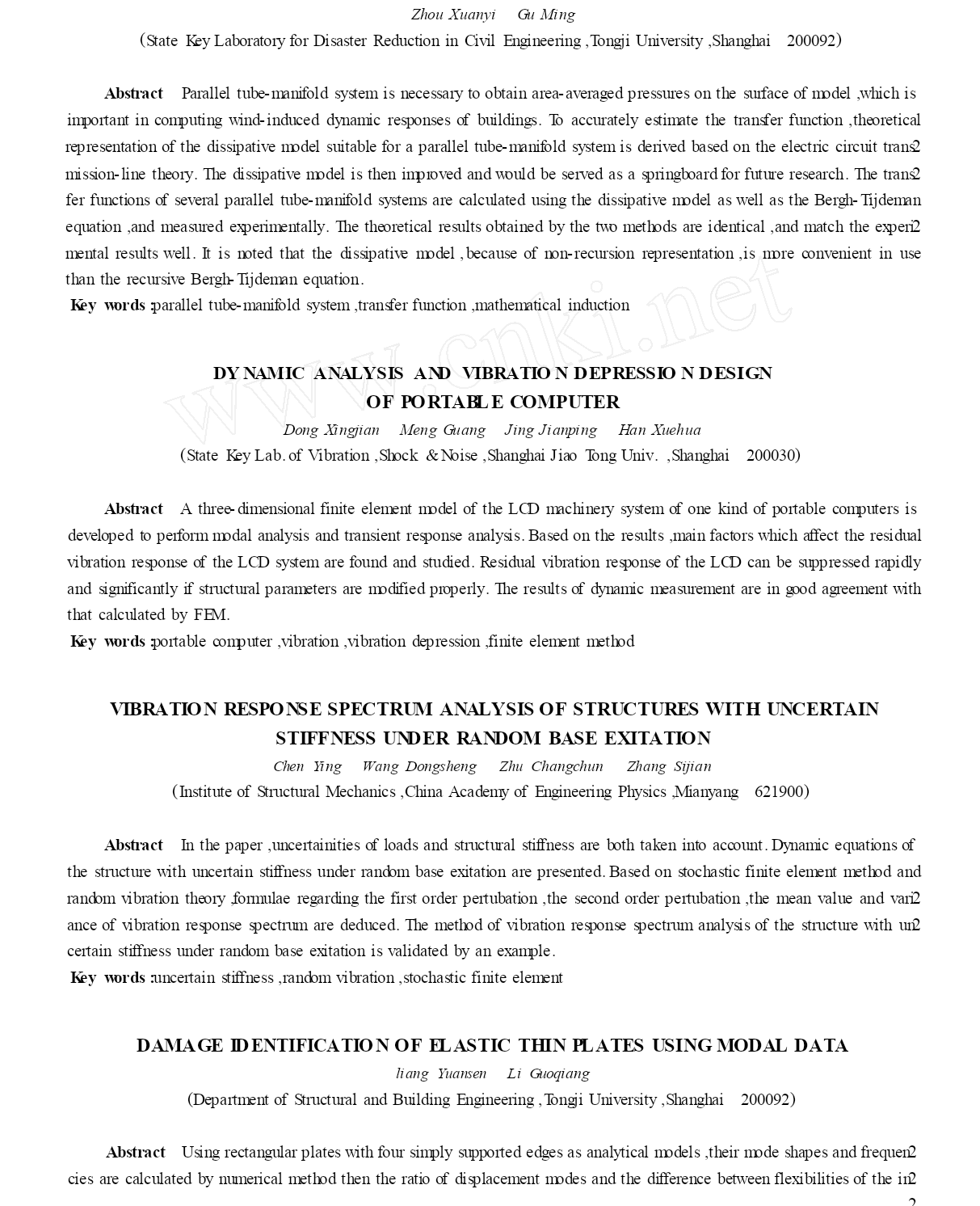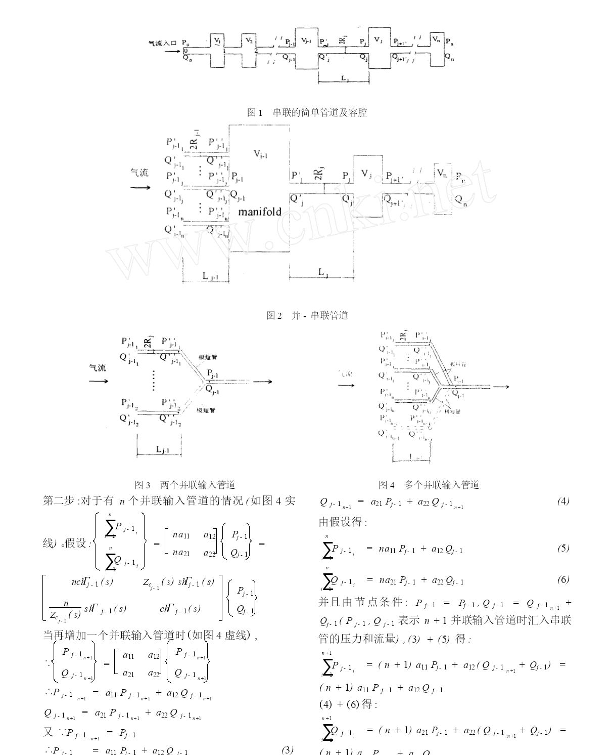 并联管道耗散模型的理论研究【完整版】(文档可以直接使用,也可根据实际需要修订后使用,可编辑放心下载)Ξ并联管道耗散模型的理论研究周毅顾明(同济大学土木工程防灾国家重点实验室,上海200092)摘要多通道测压管路是获得实验模型外表多个邻近测点平均风压时程的必要测量系统,其测量结果对于计算结构风振响应具有重要意义。为了准确地计算多通道测压管路系统的频率响应函数,本文基于电路传输线理论,推导了可用于并联管道的耗散模型,进一步完善了原先只能用于串联管道的耗散模型,为今后深入分析多通道测压管路系统打下了理论根底。接着利用并联管道的耗散模型与Bergh-Tijdeman方程对几组不同管路系统的频率响应函数进行了计算,并将两个方程的计算结果与实验值进行比拟,结果说明两个方程计算的结果完全一致,并与实验值吻合得很好。文中进一步指出较之递归式的Bergh-Tijdeman方程,非递归式的耗散模型运用起来更加方便。关键词:多通道测压管路系统,频率响应函数,数学归纳法中图分类号:TU317文献标识码:A等设备的出现使得人们能进一步测量脉动风压以满足工程实践的需要。因测量的需要,测压管路系统往往有一定长度。气流经过测压管路系统至传感器后,压力信号中的脉动局部已经发生了畸变(平均压力不会发生畸变是很好理解的),从而导致脉动信号的测量结果失真。脉动压力信号的畸变可归结为测压管路系统频率响应函数(简称频响函数)的问题。流体管道的动态方程与电路中的动态方程十分相似,GerstoftP(1987)将电路模拟理论运用于风洞管路测压系统,取代了从前对流体动力方程直接求解的0引言风洞刚性模型测压试验是获得建筑结构风荷载的重要方法。刚性模型的测压管路系统一般包括模型外表的金属短管及连接金属管和传感器的PVC管等管道元件。为了得到模型外表风压的完整信息,人们一般在其外表布置密集的测点。相对于这种精细化的做法,工程设计人员更希望获得在建筑物外表局部面积上平均后的风压力(注意不是指平均风压,而是局部面积中多个测点风压的时程平均)。为了这个目的,研究人员将多通道集成测压系统(简称多通道测压系统)运用到风洞测压试验中1:连接模型外表测点的多个测压管中的气流在气动总管(pneumaticmanifold)中进行气动平均后再汇入连至传感器的总管。必须认识到,用气动总管得到的气动平均后的峰值压力与将各点测得的峰值压力直接相加有着本质的区别。由于各点的峰值并不是同时发生(即相关性不为1),直接相加各点的峰值压力会导致过大地估计结构的风荷载。而多通道测压系统测量的多点平均脉动风压是将气动总管的各个输入管气流瞬时相加,这样就更真实地反映了模型外表局部面积上的风压力。可见,采用多通道测压系统测量脉动风压,不仅能扩大同步测点的数目,并能更真实地测量模型外表脉动风压的相关性能。多通道测压系统很早就被用来测量平均静压,1979年,Surry和Stathopoulos采用多通道测压系统测量多点气动平均的脉动风压2。随着近几十年电子领域的开展,传感器、扫描阀34方法。蔡亦钢以及苏而皇对管道动态分析进行了进一步研究。蔡亦钢基于电路传输线理论提出了5流体管道的耗散模型并用矩阵传递关系来表达管路输出与输入端的压力及流量关系,较之递归式的Bergh-Tijdeman方程,非递归式的耗散模型运用起来更加方便,但他没有给出并联管道的方程。本文基于电路传输线理论,推导了可用于并联管道的方程,使耗散模型的应用范围扩展到并联管道,并将计算结果与并联管道的Bergh-Tijdeman方程以及实验值进行了比较。1串联管道的耗散模型4,5流体传输管道系统可用电路传输线理论进行分析。管道系统可分成无数的单元,每一单元的流体特性可由流阻、流容、流导和流感来表示。对流体管道在频域内的动态特性分析,应从连续性方程、动量方程、能量方程和状态方程中得出不同流动条件下的特征阻抗和传播算子,并结合具体的负载阻抗(管路输出端压力与流量的比值)和源阻抗(管路输入端压力与流量的比值),就能处理一个复杂的管路流体力学问题。测压管路系统中的PVC管、固定在模型外表测压孔处的金属短管以及限制器都可认为是简单管道;测压管路系统中的气动总管以及传感器内部的腔体可用容腔来描述。图1为由简单管道及容腔串联而成的管路。对于其中一节的传递关系为:Pj-1(x,s)(<j/<j-1)[J0(αj-1)/J0(αj)[sinh(<j-1Lj-1)/sinh(<jLj)J2(αj)/J2(αj-1)]×cosh(<jLj)-Pj/Pj-1](2)其中P为流体压力,j-1指第j-1节管道或容腔,n为输入管的数目,<为与圆频率、音速、比热比、流体的平均密度