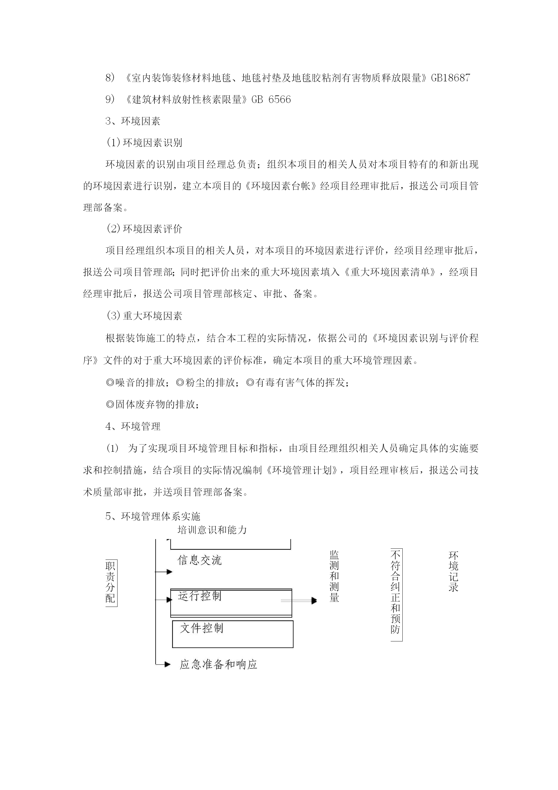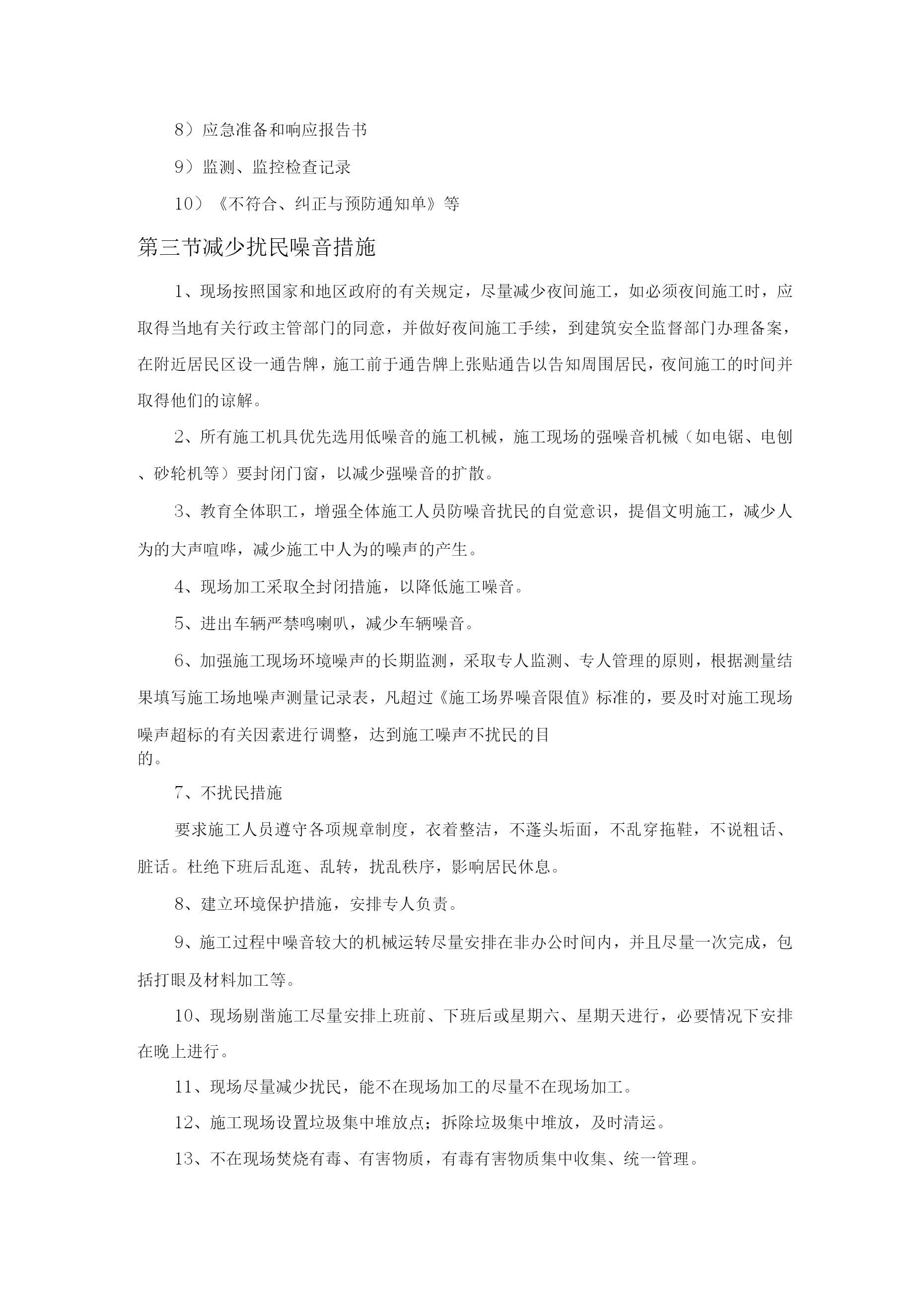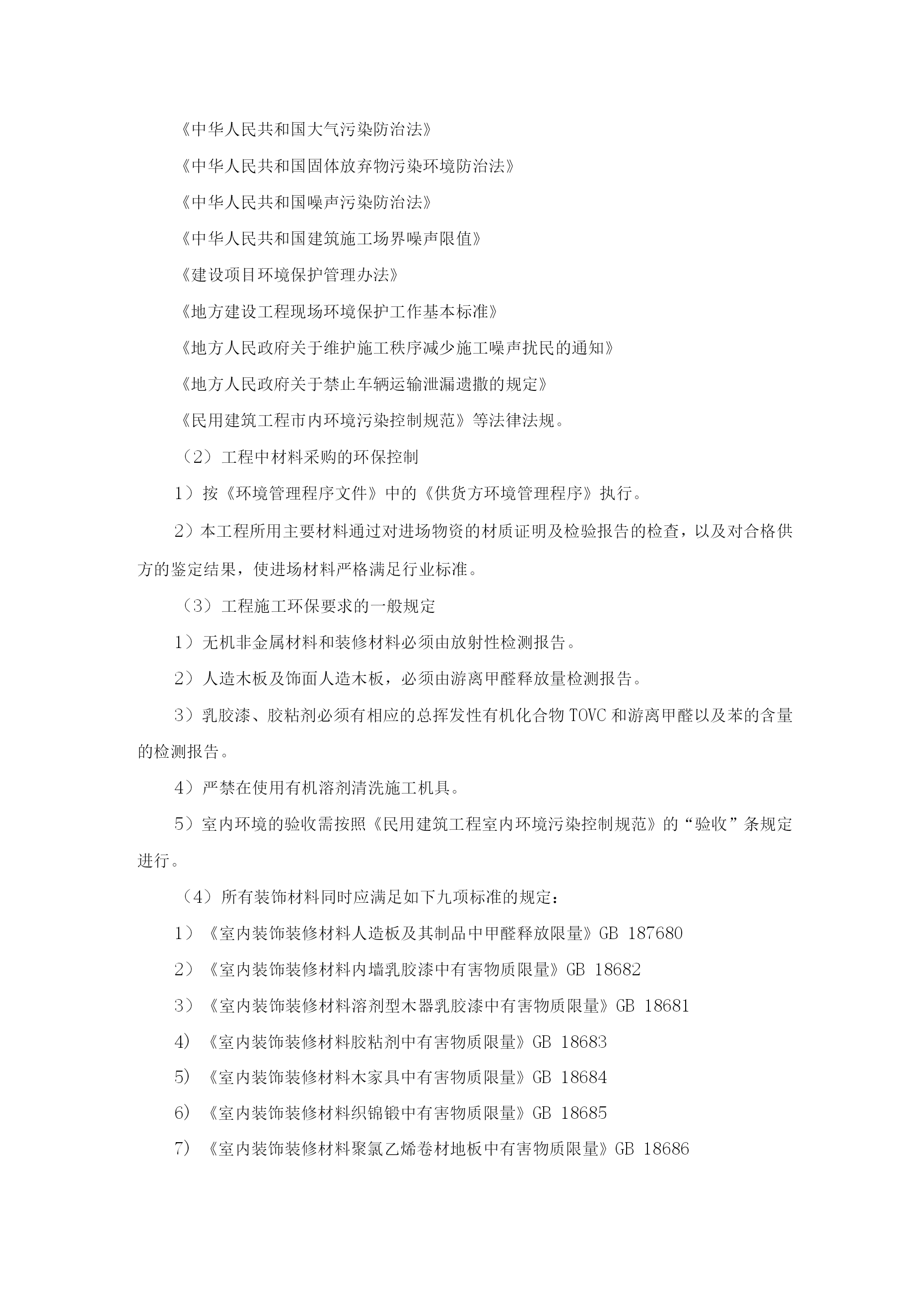 环保及减少噪音措施第一节环境保护的概念1、保护环境是按照法律法规、各级主管部门和公司的要求,保护和改善作业现场的环境,控制现场的各种粉尘、废水、废气、固定废弃物、噪声、震动等对环境的污染和危害。2、环境保护的意义。(1)保护和改善施工环境是保证人们身体健康和社会文明的需要。采用专项措施防止粉尘、噪声和水源污染,保护好作业现场及周围的环境,是保证职工和相关人员身体健康、体现社会总体文明的一项利国利民的重要工作。(2)保护和改善施工现场环境是消除对外部干扰保证施工顺利进行的需要。随着人们的法制观念和自我保护意识的增强,应及时采取防治措施,减少对环境的污染和对市民的干扰,也是施工生产顺利进行的基本条件。(3)保护和改善施工现场环境是现代化大生产的客观要求。现代化施工广泛应用新设备、新技术、新的生产工艺,对环境质量要求很高,如果粉尘、震动超标就可能损坏设备、影响功能发挥,使设备难以发挥作用。(4)节约能源、保护人类生存环境、保护社会和企业可持续发展的需要。人类社会即将面临环境污染和能源危机的挑战。为了保护子孙后代赖以生存的环境条件,每个公民和企业都有责任和义务来保护环境。良好的环境和生存条件,也是企业发展的基础和动力。第二节环境保护要求1、环境管理承诺承诺:向甲方-一为您提供绿色环保的产品;向社会一-保护环境是我们应尽的职责。为了保护环境,为了营造绿色装饰,我公司在该工程施工管理过程中,将一切以顾客的需要为中心、以科学的管理、先进的技术、优良的品质,努力去实现ISO141环境管理标准的要求。遵循以人为本组织施工,遵守有关环境法律、法规,用我们保护环境的全部能力,建立并有效运行环境管理体系,去最大限度地实现施工环境的美化。2、法律、法规和对本工程物资环保要求(1)法律、法规项目经理部执行公司编制的《法律法规及其他要求清单》内的法规。主要包括:《中华人民共和国大气污染防治法》《中华人民共和国固体放弃物污染环境防治法》《中华人民共和国噪声污染防治法》《中华人民共和国建筑施工场界噪声限值》《建设项目环境保护管理办法》《地方建设工程现场环境保护工作基本标准》《地方人民政府关于维护施工秩序减少施工噪声扰民的通知》《地方人民政府关于禁止车辆运输泄漏遗撒的规定》《民用建筑工程市内环境污染控制规范》等法律法规。(2)工程中材料采购的环保控制1)按《环境管理程序文件》中的《供货方环境管理程序》执行。2)本工程所用主要材料通过对进场物资的材质证明及检验报告的检查,以及对合格供方的鉴定结果,使进场材料严格满足行业标准。(3)工程施工环保要求的一般规定1)无机非金属材料和装修材料必须由放射性检测报告。2)人造木板及饰面人造木板,必须由游离甲醛释放量检测报告。3)乳胶漆、胶粘剂必须有相应的总挥发性有机化合物TOVC和游离甲醛以及苯的含量的检测报告。4)严禁在使用有机溶剂清洗施工机具。5)室内环境的验收需按照《民用建筑工程室内环境污染控制规范》的“验收”条规定进行。(4)所有装饰材料同时应满足如下九项标准的规定:1)《室内装饰装修材料人造板及其制品中甲醛释放限量》GB1876802)《室内装饰装修材料内墙乳胶漆中有害物质限量》GB186823)《室内装饰装修材料溶剂型木器乳胶漆中有害物质限量》GB18681《室内装饰装修材料胶粘剂中有害物质限量》GB18683《室内装饰装修材料木家具中有害物质限量》GB18684《室内装饰装修材料织锦锻中有害物质限量》GB18685《室内装饰装修材料聚氯乙烯卷材地板中有害物质限量》GB18686《室内装饰装修材料地毯、地毯衬垫及地毯胶粘剂有害物质释放限量》GB18687《建筑材料放射性核素限量》GB65663、环境因素环境因素识别环境因素的识别由项目经理总负责;组织本项目的相关人员对本项目特有的和新出现的环境因素进行识别,建立本项目的《环境因素台帐》经项目经理审批后,报送公司项目管理部备案。环境因素评价项目经理组织本项目的相关人员,对本项目的环境因素进行评价,经项目经理审批后,报送公司项目管理部;同时把评价出来的重大环境因素填入《重大环境因素清单》,经项目经理审批后,报送公司项目管理部核定、审批、备案。重大环境因素根据装饰施工的特点,结合本工程的实际情况,依据公司的《环境因素识别与评价程序》文件的对于重大环境因素的评价标准,确定本项目的重大环境管理因素。◎噪音的排放;◎粉尘的排放;◎有毒有害气体的挥发;◎固体废弃物的排放;4、环境管理为了实现项目环境管理目标和指标,由项目经理组织相关人员确定具体的实施要求和控制措施,结合项目的实际情况编制《环境管理计划》,项目经理审核后,报送公司技术质量部审批,并送项目管理部备案。5、环境管