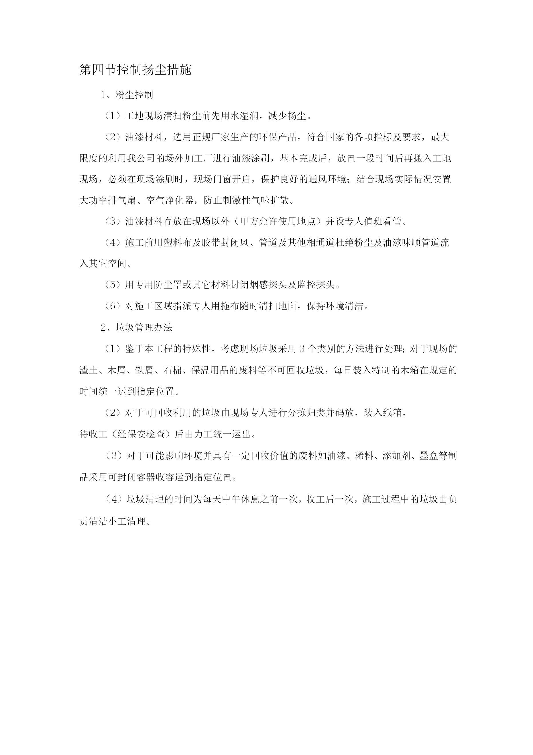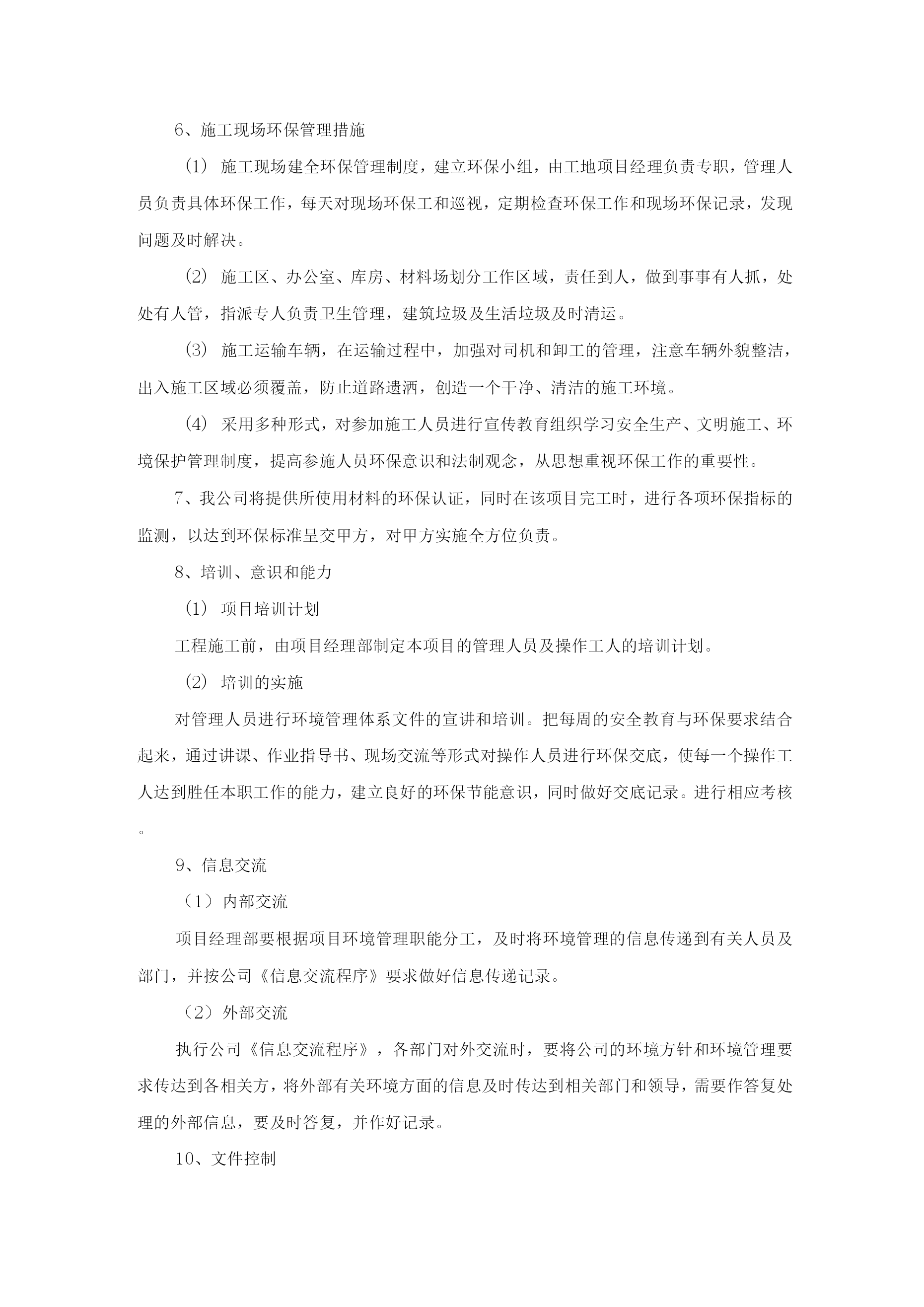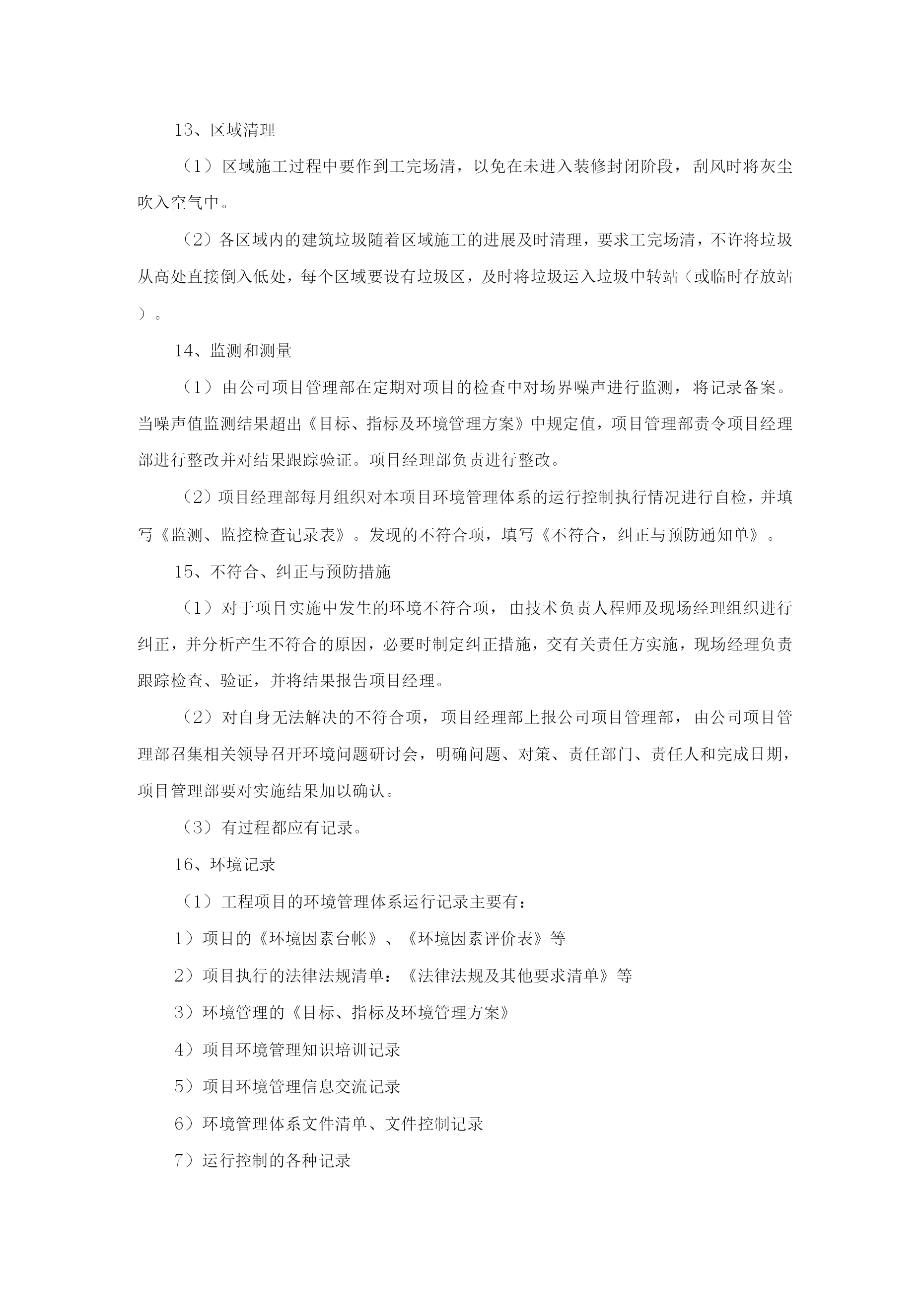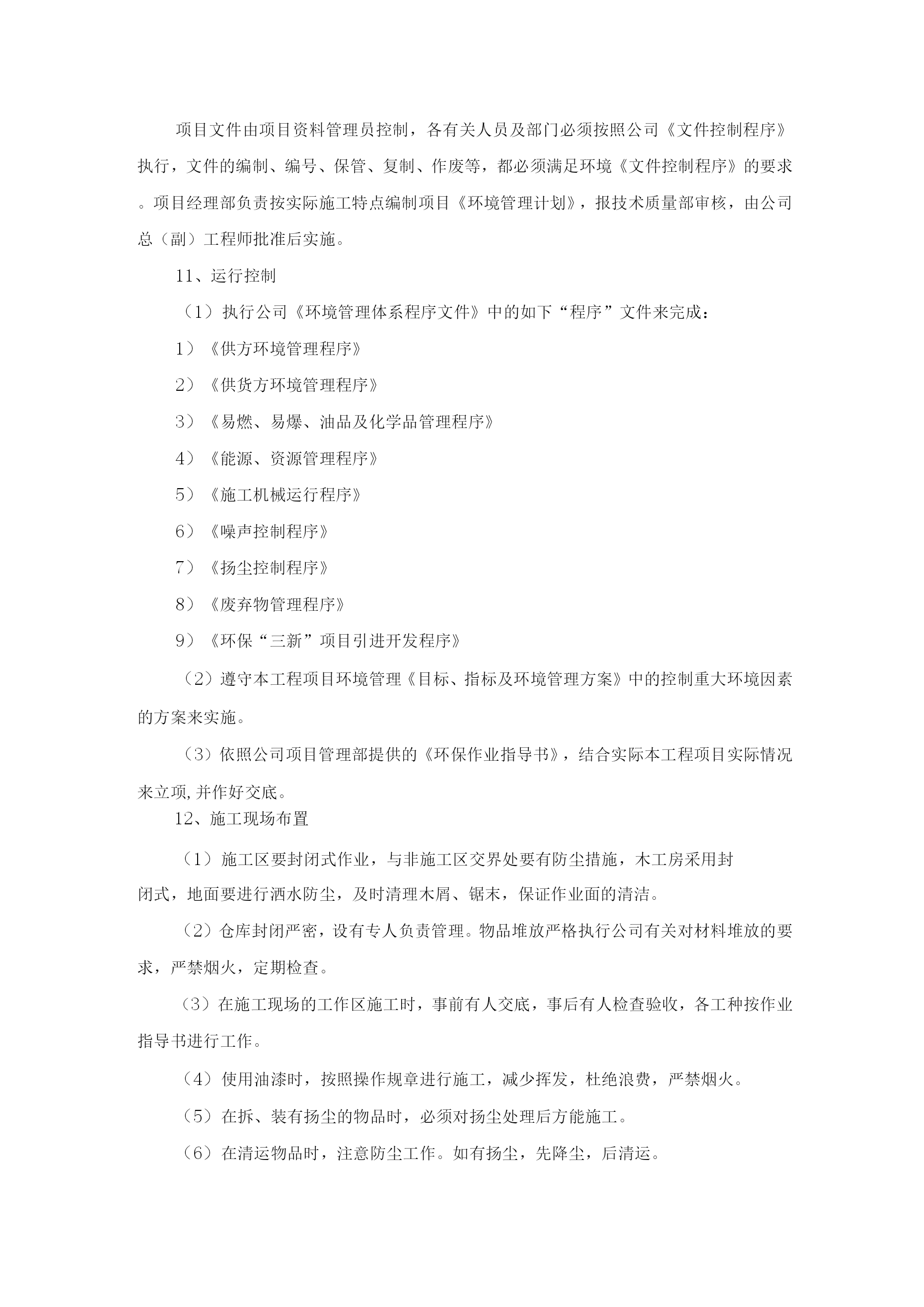 环保及减少噪音措施第一节环境保护的概念1、保护环境是按照法律法规、各级主管部门和公司的要求,保护和改善作业现场的环境,控制现场的各种粉尘、废水、废气、固定废弃物、噪声、震动等对环境的污染和危害。2、环境保护的意义。(1)保护和改善施工环境是保证人们身体健康和社会文明的需要。采用专项措施防止粉尘、噪声和水源污染,保护好作业现场及周围的环境,是保证职工和相关人员身体健康、体现社会总体文明的一项利国利民的重要工作。(2)保护和改善施工现场环境是消除对外部干扰保证施工顺利进行的需要。随着人们的法制观念和自我保护意识的增强,应及时采取防治措施,减少对环境的污染和对市民的干扰,也是施工生产顺利进行的基本条件。(3)保护和改善施工现场环境是现代化大生产的客观要求。现代化施工广泛应用新设备、新技术、新的生产工艺,对环境质量要求很高,如果粉尘、震动超标就可能损坏设备、影响功能发挥,使设备难以发挥作用。(4)节约能源、保护人类生存环境、保护社会和企业可持续发展的需要。人类社会即将面临环境污染和能源危机的挑战。为了保护子孙后代赖以生存的环境条件,每个公民和企业都有责任和义务来保护环境。良好的环境和生存条件,也是企业发展的基础和动力。第二节环境保护要求1、环境管理承诺承诺:向甲方-一为您提供绿色环保的产品;向社会一-保护环境是我们应尽的职责。为了保护环境,为了营造绿色装饰,我公司在该工程施工管理过程中,将一切以顾客的需要为中心、以科学的管理、先进的技术、优良的品质,努力去实现ISO141环境管理标准的要求。遵循以人为本组织施工,遵守有关环境法律、法规,用我们保护环境的全部能力,建立并有效运行环境管理体系,去最大限度地实现施工环境的美化。2、法律、法规和对本工程物资环保要求(1)法律、法规项目经理部执行公司编制的《法律法规及其他要求清单》内的法规。主要包括:《中华人民共和国大气污染防治法》《中华人民共和国固体放弃物污染环境防治法》《中华人民共和国噪声污染防治法》《中华人民共和国建筑施工场界噪声限值》《建设项目环境保护管理办法》《地方建设工程现场环境保护工作基本标准》《地方人民政府关于维护施工秩序减少施工噪声扰民的通知》《地方人民政府关于禁止车辆运输泄漏遗撒的规定》《民用建筑工程市内环境污染控制规范》等法律法规。(2)工程中材料采购的环保控制1)按《环境管理程序文件》中的《供货方环境管理程序》执行。2)本工程所用主要材料通过对进场物资的材质证明及检验报告的检查,以及对合格供方的鉴定结果,使进场材料严格满足行业标准。(3)工程施工环保要求的一般规定1)无机非金属材料和装修材料必须由放射性检测报告。2)人造木板及饰面人造木板,必须由游离甲醛释放量检测报告。3)乳胶漆、胶粘剂必须有相应的总挥发性有机化合物TOVC和游离甲醛以及苯的含量的检测报告。4)严禁在使用有机溶剂清洗施工机具。5)室内环境的验收需按照《民用建筑工程室内环境污染控制规范》的“验收”条规定进行。(4)所有装饰材料同时应满足如下九项标准的规定:1)《室内装饰装修材料人造板及其制品中甲醛释放限量》GB1876802)《室内装饰装修材料内墙乳胶漆中有害物质限量》GB186823)《室内装饰装修材料溶剂型木器乳胶漆中有害物质限量》GB18681《室内装饰装修材料胶粘剂中有害物质限量》GB18683《室内装饰装修材料木家具中有害物质限量》GB18684《室内装饰装修材料织锦锻中有害物质限量》GB18685《室内装饰装修材料聚氯乙烯卷材地板中有害物质限量》GB18686《室内装饰装修材料地毯、地毯衬垫及地毯胶粘剂有害物质释放限量》GB18687《建筑材料放射性核素限量》GB65663、环境因素环境因素识别环境因素的识别由项目经理总负责;组织本项目的相关人员对本项目特有的和新出现的环境因素进行识别,建立本项目的《环境因素台帐》经项目经理审批后,报送公司项目管理部备案。环境因素评价项目经理组织本项目的相关人员,对本项目的环境因素进行评价,经项目经理审批后,报送公司项目管理部;同时把评价出来的重大环境因素填入《重大环境因素清单》,经项目经理审批后,报送公司项目管理部核定、审批、备案。重大环境因素根据装饰施工的特点,结合本工程的实际情况,依据公司的《环境因素识别与评价程序》文件的对于重大环境因素的评价标准,确定本项目的重大环境管理因素。◎噪音的排放;◎粉尘的排放;◎有毒有害气体的挥发;◎固体废弃物的排放;4、环境管理为了实现项目环境管理目标和指标,由项目经理组织相关人员确定具体的实施要求和控制措施,结合项目的实际情况编制《环境管理计划》,项目经理审核后,报送公司技术质量部审批,并送项目管理部备案。5、环境管
