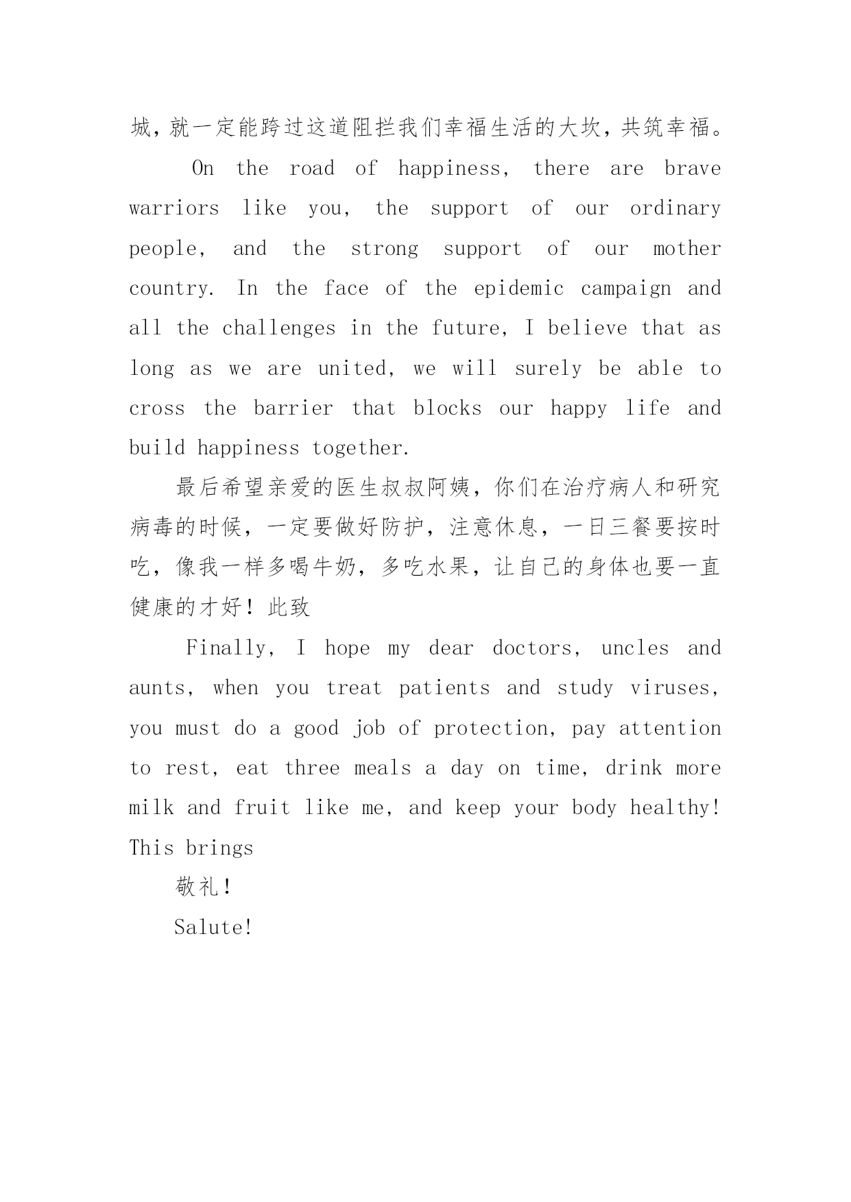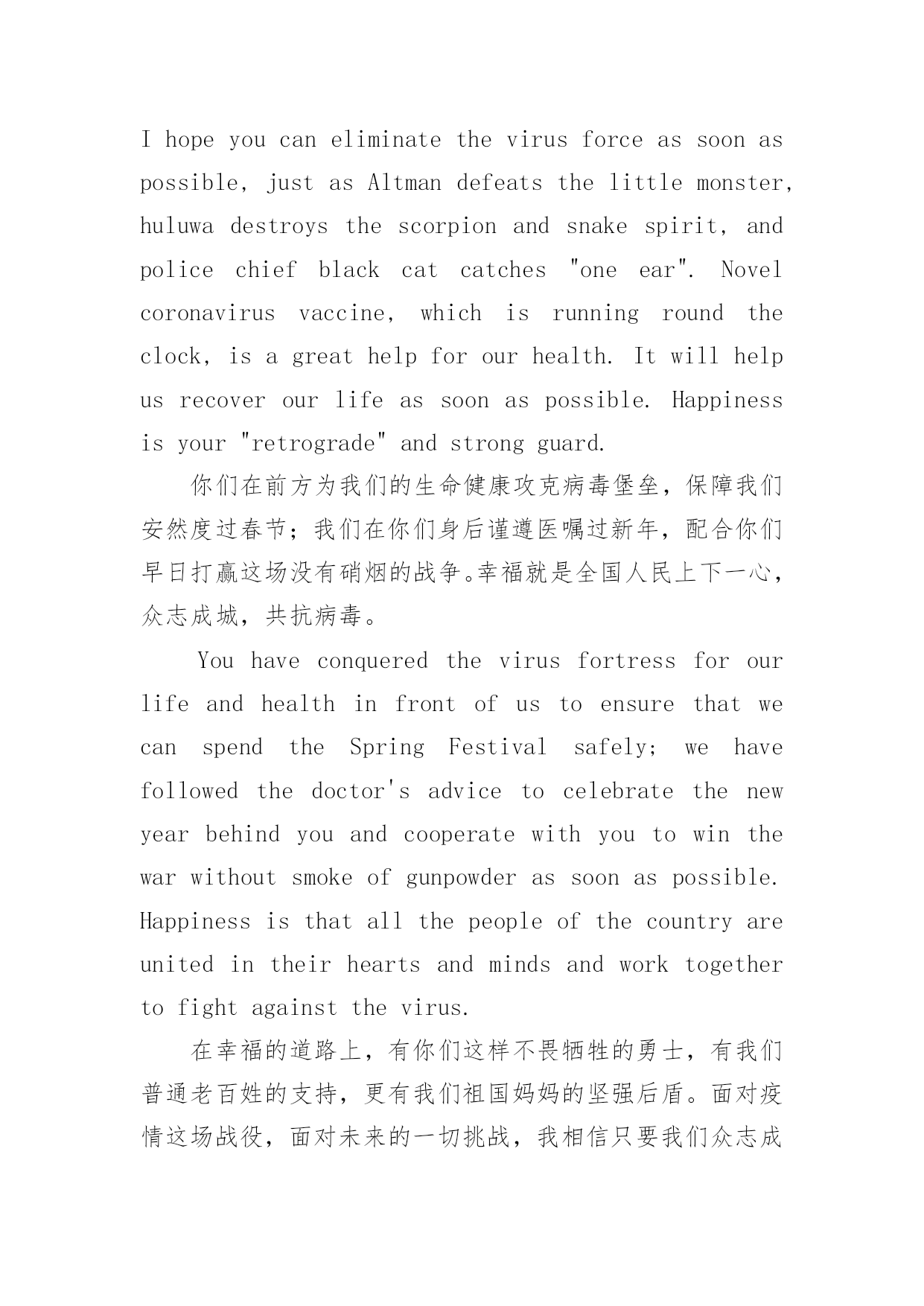 高考英语作文热点素材2020高考英语作文热点素材亲爱的医生叔叔阿姨们:Deardoctors,unclesandaunts首先祝你们新年好!身体健康,全家幸福快乐!Firstofall,IwishyouahappyNewYear!Goodhealth,happyfamily!我是一名普通的三年级小学生,虽然你们也许看不到我的这封信,但是我还是想谢谢你们!谢谢你们在这寒冬腊月带给我们浓浓的幸福感。Iamanordinarythirdgradeprimaryschoolstudent,althoughyoumaynotseemyletter,butIstillwanttothankyou!Thankyouforbringingusastrongsenseofhappinessinthiscoldwinter.今年春节大家都知道发生了一件大事,虽然我对“死亡”这个词还一知半解,但是从爸爸妈妈凝重的神情上我好像有点明白这个事情的严重性了,也知道了它是一种由新型冠状病毒感染的.肺炎,因为这个病毒传染的方式主要是通过我们人与人之间的飞沫传播的,所以我们家连过年都不串门了,每天宅在家里,保护好自己不给你们添麻烦。幸福就是众志成城,每个人都要担起属于自己的社会责任。Novelcoronavirusisalittlebitunknowntome.AlthoughIknowlittleabouttheword"death",Iseemtohavealittleunderstandingoftheseriousnessofthismatterfromthelookoffatherandmother.Ialsoknowthatitisapneumoniacausedbyanewcoronavirus,becausethewayofvirusinfectionismainlythroughthedropletsbetweenpeople.Soourfamilydoesn'tevenvisitduringtheSpringFestival.Westayathomeeverydaytoprotectourselvesfromcausingyoutrouble.Happinessistheunityofonemind.Everyonehastobeartheirownsocialresponsibility.而这个危难时刻,谢谢你们为了守护我们的健康、平安,第一个奔向“战场”,在病毒肆虐最厉害的地方,发挥着你们的超级医术,面对着我们普通人逃都来不及的病毒,和死神抢夺着病人的生命。希望你们像奥特曼打败小怪兽、葫芦娃消灭蝎子蛇精、黑猫警长抓住“一只耳”一样,早日消灭病毒大部队。谢谢你们为了我们的身体健康,夜以继日地研制新型冠状病毒的疫苗,和时间赛跑,可以让我们尽快恢复以前的生活。幸福就是你们的“逆行”和坚强守护。Atthiscriticalmoment,thankyouforrunningtothe"battlefield"firstinordertoprotectourhealthandsafety,playingyoursupermedicalskillsintheplacewherethevirusismostrampant,facingthevirusthatordinarypeoplecan'tescape,andtheGodofdeathsnatchingthelifeofpatients.Ihopeyoucaneliminatethevirusforceassoonaspossible,justasAltmandefeatsthelittlemonster,huluwadestroysthescorpionandsnakespirit,andpolicechiefblackcatcatches"oneear".Novelcoronavirusvaccine,whichisrunningroundtheclock,isagreathelpforourhealth.Itwillhelpusrecoverourlifeassoonaspossible.Happinessisyour"retrograde"andstrongguard.你们在前方为我们的生命健康攻克病毒堡垒,保障我们安然度过春节;我们在你们身后谨遵医嘱过新年,配合你们早日打赢这场没有硝烟的战争。幸福就是全国人民上下一心,众志成城,共抗病毒。YouhaveconqueredthevirusfortressforourlifeandhealthinfrontofustoensurethatwecanspendtheSpringFestivalsafely;wehavefollowedthe