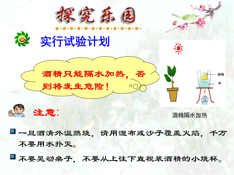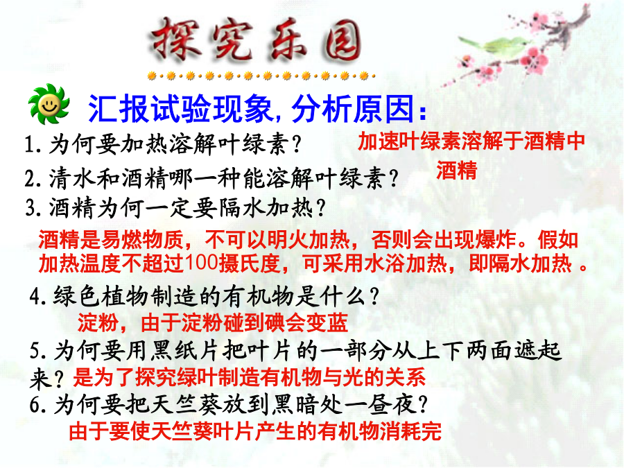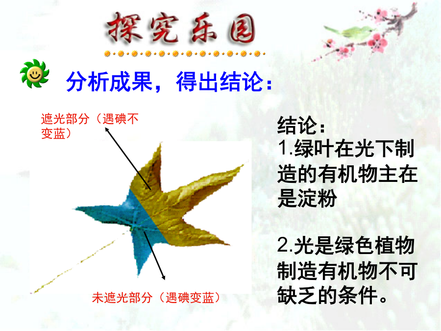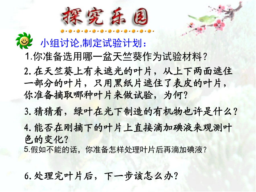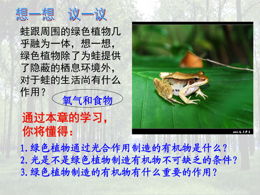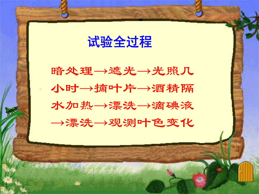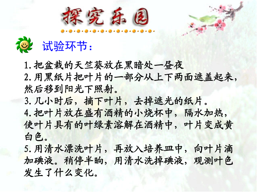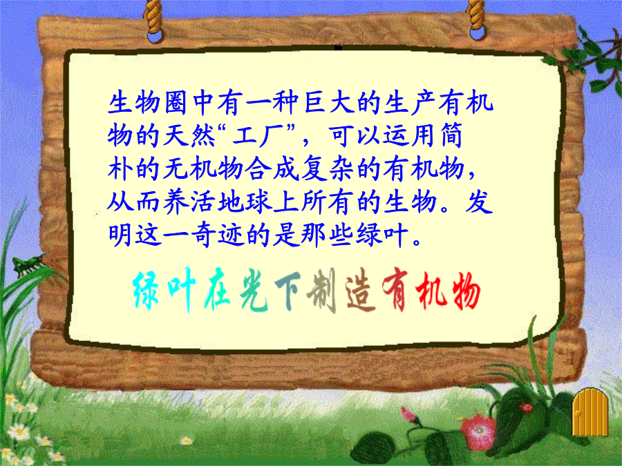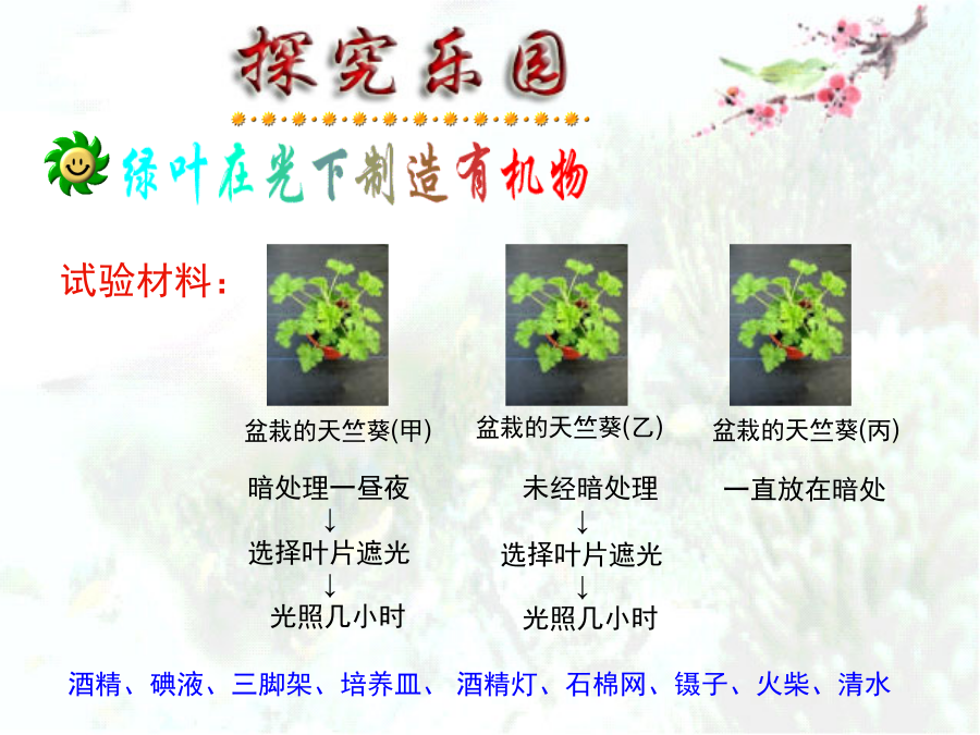 第四章想一想议一议生物圈中有一种巨大的生产有机物的天然“工厂”,可以运用简朴的无机物合成复杂的有机物,从而养活地球上所有的生物。发明这一奇迹的是那些绿叶。试验材料:1.你准备选用哪一盆天竺葵作为试验材料?试验环节:汇报试验现象,分析原因:暗处理→遮光→光照几小时→摘叶片→酒精隔水加热→漂洗→滴碘液→漂洗→观测叶色变化分析成果,得出结论:绿色植物,只要细胞中具有叶绿体,就能制造有机物,叶片是绿色植物制造有机物的重要器官。叶绿体由于具有叶绿素而展现绿色,绿色植物通过叶绿素捕捉太阳光,运用光提供的能量,在叶绿体中合成有机物,并把光能转化成化学能,储存在有机物中。植物的叶片是进行光合作用的重要器官。叶绿体既是生产有机物的“车间”,也是将光能转变为化学能的“能量转换器”。思考:有机物用来构建植物体3.从个体水平来看:植物生长旺盛,需要的有机物越多;寒冷的冬天,植物体内合成的有机物减少或者停止,因此植物的生长缓慢,当春天来临,风和日丽,植物光合作用日渐旺盛,有机物的合成不停增多,植物生长迅速,生物圈也因此而生机盎然。绿色植物制造的有机物养育了生物圈中的其他生物绿色植物作为生物圈中的生产者,所制造的有机物通过食物链,食物网,养育了生物圈中的其他生物。评价自我1.生物圈中生产有机物的“天然工厂”是()A、藻类植物B、苔藓植物C、种子植物D、所有绿色植物5.光合作用进行的场所是()A、线粒体B、叶绿体C、液泡D、细胞壁在农作物生长期间,假如大部分叶片被害虫毁掉了,对农作物的产量有何影响,为何?三、技能训练请匆乱倒废弃的溶液和叶片!谢谢观看!