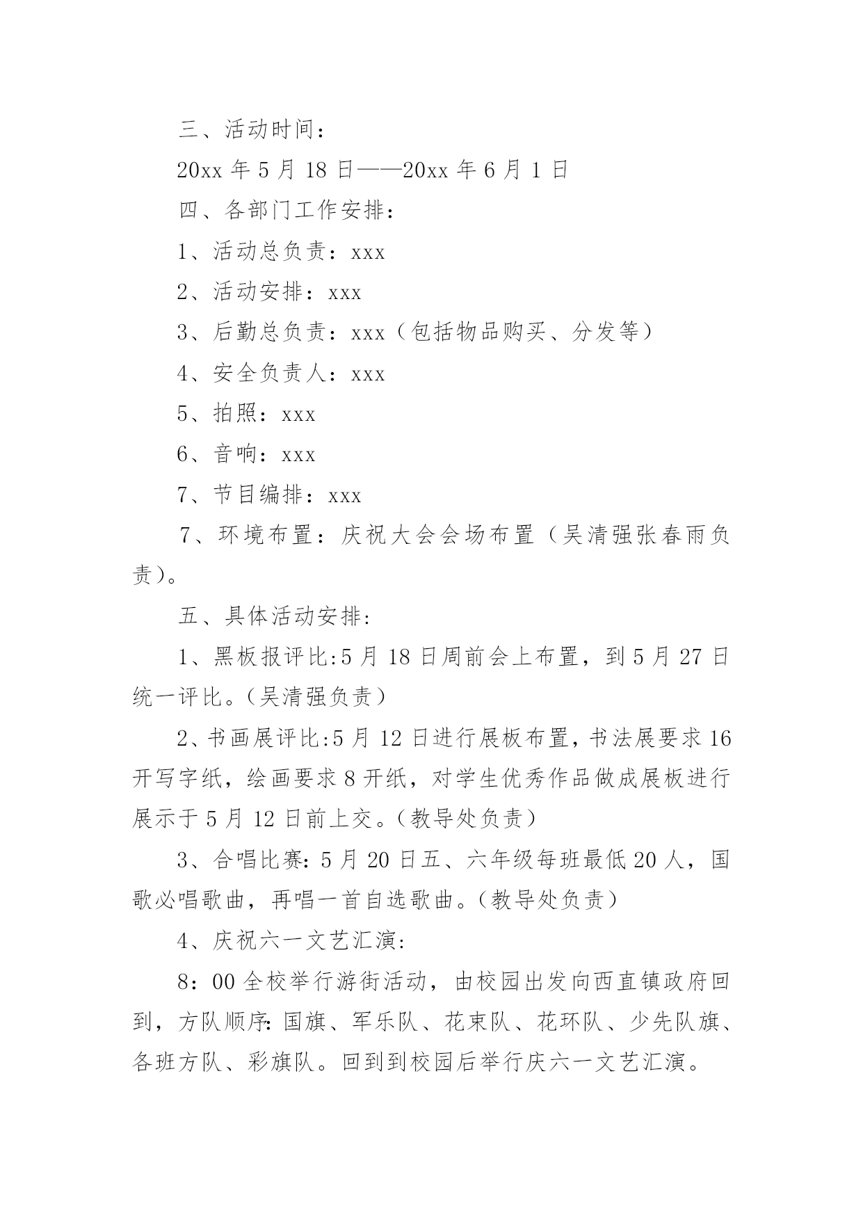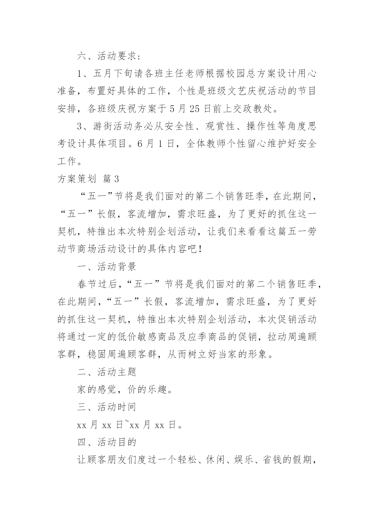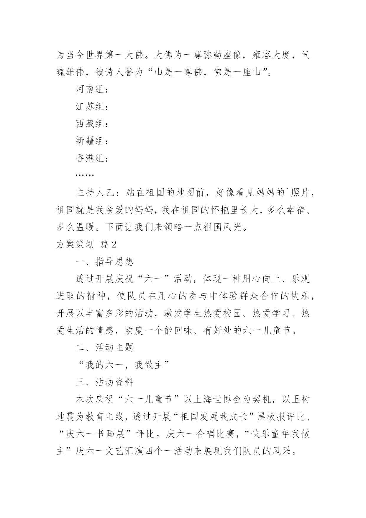 方案策划【推荐】方案策划集合5篇为了确保事情或工作安全顺利进行,常常需要提前制定一份优秀的方案,方案是阐明行动的时间,地点,目的,预期效果,预算及方法等的书面计划。优秀的方案都具备一些什么特点呢?以下是小编为大家整理的方案策划7篇,仅供参考,欢迎大家阅读。方案策划篇1活动目的:通过活动,让学生们进一步理解我国的国旗、国徽和国歌。赞美我们美丽的祖国,热爱祖国。从中树立起自己的理想,并为之努力奋斗,好好学习科学文化知识。活动准备:课件,音乐,电子琴,排演节目活动过程:中队长:集合。整队。(报告人数,请辅导员参加活动)出旗。唱队歌。主持人甲:陈心怡主持人乙:俞上主持人甲:祖国!多么神圣的名字。祖国!我们可爱的母亲。主持人乙:我们为伟大的中华民族而骄傲,我们为拥有这样的伟大祖国而自豪。主持人甲乙合:六(4)中队《我为祖国歌唱》主题班队现在开始。播放歌曲《春光美》请听诗朗诵《彩色的中国》。《彩色的中国》A:轻轻的打开地图。B:我第一眼看到了彩色的中国,碧绿的草原。A:金色的是沙漠。B:蓝蓝的是大海。A:弯弯的是江河。B:在我们祖国的版图上,一片五颜六色。A:就像盛开的鲜艳花朵。B:面对这美丽的图画,我们放声歌唱;AB::我爱您--中国!听到这么优美的歌曲你们的眼前可曾出现美丽的春光图画?小组交流:祖国的春天北京组:配图片长城长城修筑的历史悠久,工程雄伟浩大,是世界少有的奇迹。不到长城非好汉。长城东西南北交错,绵延伏于我们伟大祖国辽阔的土地上。它好像一条巨龙,翻越巍巍群山,穿过茫茫草原,跨过浩瀚的沙漠,奔向苍茫的大海。长城是我国古代劳动人民创造的奇迹。自秦始皇开始,修筑长城一直是一项大工程。四川组:乐山大佛乐山大佛位于四川省乐山市郊,建于唐代。依山开凿大佛一座,通高71米,脚背宽8.5米,为当今世界第一大佛。大佛为一尊弥勒座像,雍容大度,气魄雄伟,被诗人誉为“山是一尊佛,佛是一座山”。河南组:江苏组:西藏组:新疆组:香港组:……主持人乙:站在祖国的地图前,好像看见妈妈的`照片,祖国就是我亲爱的妈妈,我在祖国的怀抱里长大,多么幸福、多么温暖。下面让我们来领略一点祖国风光。方案策划篇2一、指导思想透过开展庆祝“六一”活动,体现一种用心向上、乐观进取的精神,使队员在用心的参与中体验群众合作的快乐,开展以丰富多彩的活动,激发学生热爱校园、热爱学习、热爱生活的情感,欢度一个能回味、有好处的六一儿童节。二、活动主题“我的六一,我做主”三、活动资料本次庆祝“六一儿童节”以上海世博会为契机,以玉树地震为教育主线,透过开展“祖国发展我成长”黑板报评比、“庆六一书画展”评比。庆六一合唱比赛,“快乐童年我做主”庆六一文艺汇演四个一活动来展现我们队员的风采。三、活动时间:20xx年5月18日——20xx年6月1日四、各部门工作安排:1、活动总负责:xxx2、活动安排:xxx3、后勤总负责:xxx(包括物品购买、分发等)4、安全负责人:xxx5、拍照:xxx6、音响:xxx7、节目编排:xxx7、环境布置:庆祝大会会场布置(吴清强张春雨负责)。五、具体活动安排:1、黑板报评比:5月18日周前会上布置,到5月27日统一评比。(吴清强负责)2、书画展评比:5月12日进行展板布置,书法展要求16开写字纸,绘画要求8开纸,对学生优秀作品做成展板进行展示于5月12日前上交。(教导处负责)3、合唱比赛:5月20日五、六年级每班最低20人,国歌必唱歌曲,再唱一首自选歌曲。(教导处负责)4、庆祝六一文艺汇演:8:00全校举行游街活动,由校园出发向西直镇政府回到,方队顺序:国旗、军乐队、花束队、花环队、少先队旗、各班方队、彩旗队。回到到校园后举行庆六一文艺汇演。六、活动要求:1、五月下旬请各班主任老师根据校园总方案设计用心准备,布置好具体的工作,个性是班级文艺庆祝活动的节目安排,各班级庆祝方案于5月25日前上交政教处。3、游街活动务必从安全性、观赏性、操作性等角度思考设计具体项目。6月1日,全体教师个性留心维护好安全工作。方案策划篇3“五一”节将是我们面对的第二个销售旺季,在此期间,“五一”长假,客流增加,需求旺盛,为了更好的抓住这一契机,特推出本次特别企划活动,让我们来看看这篇五一劳动节商场活动设计的具体内容吧!一、活动背景春节过后,“五一”节将是我们面对的第二个销售旺季,在此期间,“五一”长假,客流增加,需求旺盛,为了更好的抓住这一契机,特推出本次特别企划活动,本次促销活动将通过一定的低价敏感商品及应季商品的促销,拉动周遍顾客群,稳固周遍顾客群,从而树立好当家的形象。二、活动主题家的感觉,价的乐趣。三、活动时间xx月xx日~xx月xx日。四、活动目的让顾客朋友们度过一个轻松、休闲、娱乐、省钱的假期,享受一家人购物的幸福快乐,从而促进假日消费,提高卖场的销售额。五、活动地点店