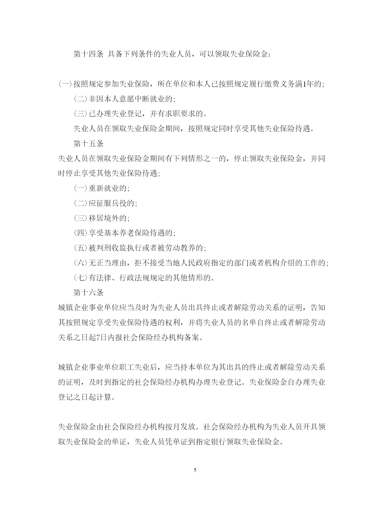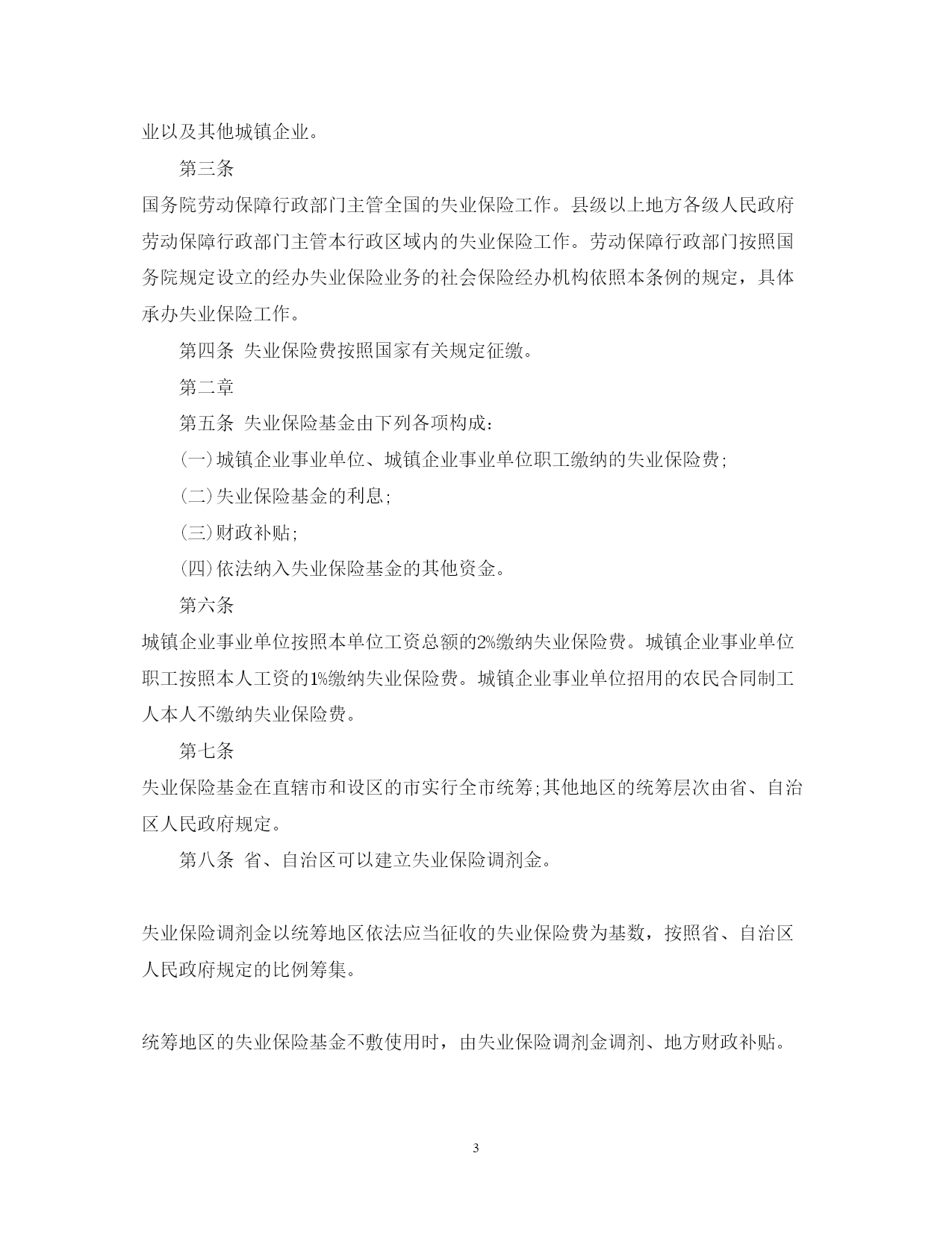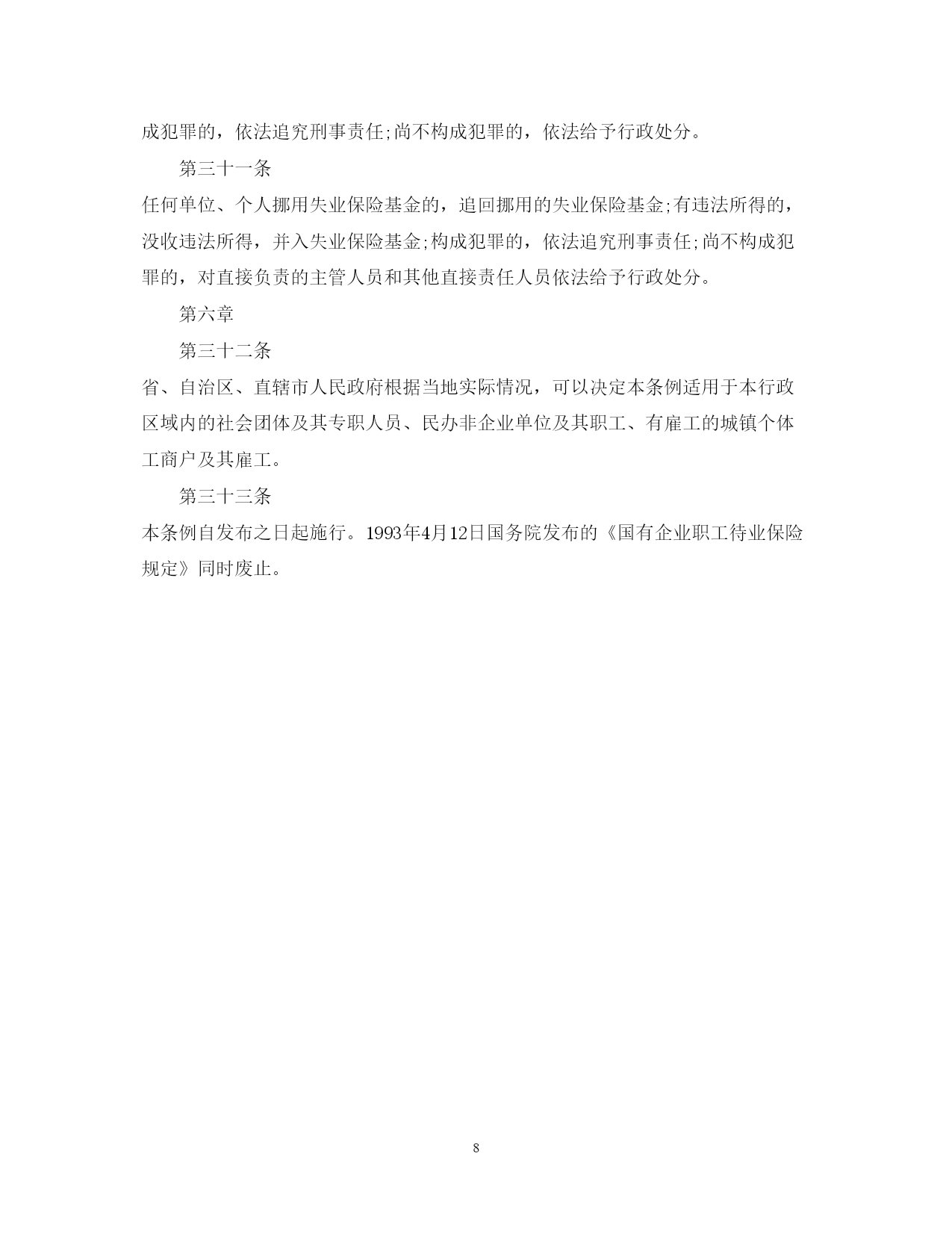 此资料由网络收集而来,如有侵权请告知上传者立即删除。资料共分享,我们负责传递知识。PAGEPAGE8失业保险条例失业保险制度是国家通过立法强制实施,由社会集中建立失业保险基金,对非因本人意愿中断就业失去工资收入的劳动者提供一定时期的物质帮助及再就业服务的一项社会保险制度。下文是小编收集的失业保险条例,欢迎阅读!失业保险条例是什么失业保险既是社会保障体系的重要组成部分,又是形成市场就业机制的必要条件。为充分发挥失业保险的作用,进一步改革和完善失业保险制度,劳动和社会保障部成立后,在原有工作的基础上,与有关部门密切结合,加快了制订新的失业保险行政法规节奏,经过广泛征求意见、反复研究论证,向国务院上报了《失业保险条例》(草案)。1998年12月16日,国务院常务会议通过,并于1999年1月22日,发布了国务院第258号令,颁布了《失业保险条例》。《条例》吸取了我国失业保险制度建立和发展的实践经验,借鉴了国外有益做法,在许多方面做了重大调整,体现了社会主义市场经济对失业保险制度的要求,体现了失业保险制度服务改革和稳定大局的精神,为形成具有中国特色的基本完善的失业保险制度打下了坚实基础。失业保险制度是国家通过立法强制实施,由社会集中建立失业保险基金,对非因本人意愿中断就业失去工资收入的劳动者提供一定时期的物质帮助及再就业服务的一项社会保险制度。它是社会保障体系的重要组成部分,是社会保险的重要项目之一。失业保险具有如下几个主要特点:一是普遍性。它主要是为了保障有工资收入的劳动者失业后的基本生活而建立的,其覆盖范围包括劳动力队伍中的大部分成员。因此,在确定适用范围时,参保单位应不分部门和行业,不分所有制性质,其职工应不分用工形式,不分家居城镇、农村,解除或终止劳动关系后,只要本人符合条件,都有享受失业保险待遇的权利。分析我国失业保险适用范围的变化情况,呈逐步扩大的趋势,从国营企业的四种人到国有企业的七类九种人和企业化管理的事业单位职工,再到《失业保险条例》规定的城镇所有企业事业单位及其职工,充分体现了普遍性原则。二是强制性。它是通过国家制定法律、法规来强制实施的。按照规定,在失业保险制度覆盖范围内的单位及其职工必须参加失业保险并履行缴费义务。根据有关规定,不履行缴费义务的单位和个人都应当承担相应的法律责任。三是互济性。失业保险基金主要来源于社会筹集,由单位、个人和国家三方共同负担,缴费比例、缴费方式相对稳定,筹集的失业保险费,不分来源渠道,不分缴费单位的性质,全部并入失业保险基金,在统筹地区内统一调度使用以发挥互济功能。失业保险制度,是指依法筹集失业社会保险基金,对因失业而暂时中断劳动、失去劳动报酬的劳动者给予帮助的社会保险制度。其目的是通过建立社会保险基金的办法,使员工在失业期间获得必要的经济帮助,保证其基本生活,并通过转业训练、职业介绍等手段,为他们重新实现就业创造条件。失业保险制度的主要内容包括:1、建立专项基金;2、建立专门管理机构;3、健全对失业员工的管理和服务;4、建立转业训练和生产自救实体。中华人民共和国失业保险条例第一章第一条为了保障失业人员失业期间基本生活,促进其再就业,制定本条例。第二条城镇企业事业单位、城镇企业事业单位职工依照本条例的规定,缴纳失业保险费。城镇企业事业单位失业人员依照本条例的规定,享受失业保险待遇。本条所称城镇企业,是指国有企业、城镇集体企业、外商投资企业、城镇私营企业以及其他城镇企业。第三条国务院劳动保障行政部门主管全国的失业保险工作。县级以上地方各级人民政府劳动保障行政部门主管本行政区域内的失业保险工作。劳动保障行政部门按照国务院规定设立的经办失业保险业务的社会保险经办机构依照本条例的规定,具体承办失业保险工作。第四条失业保险费按照国家有关规定征缴。第二章第五条失业保险基金由下列各项构成:(一)城镇企业事业单位、城镇企业事业单位职工缴纳的失业保险费;(二)失业保险基金的利息;(三)财政补贴;(四)依法纳入失业保险基金的其他资金。第六条城镇企业事业单位按照本单位工资总额的2%缴纳失业保险费。城镇企业事业单位职工按照本人工资的1%缴纳失业保险费。城镇企业事业单位招用的农民合同制工人本人不缴纳失业保险费。第七条失业保险基金在直辖市和设区的市实行全市统筹;其他地区的统筹层次由省、自治区人民政府规定。第八条省、自治区可以建立失业保险调剂金。失业保险调剂金以统筹地区依法应当征收的失业保险费为基数,按照省、自治区人民政府规定的比例筹集。统筹地区的失业保险基金不敷使用时,由失业保险调剂金调剂、地方财政补贴。失业保险调剂金的筹集、调剂使用以及地方财政补贴的具体办法,由省、自治区人民政府规定。第九条省、自治区、直辖市人民政府根据本行政区域失业