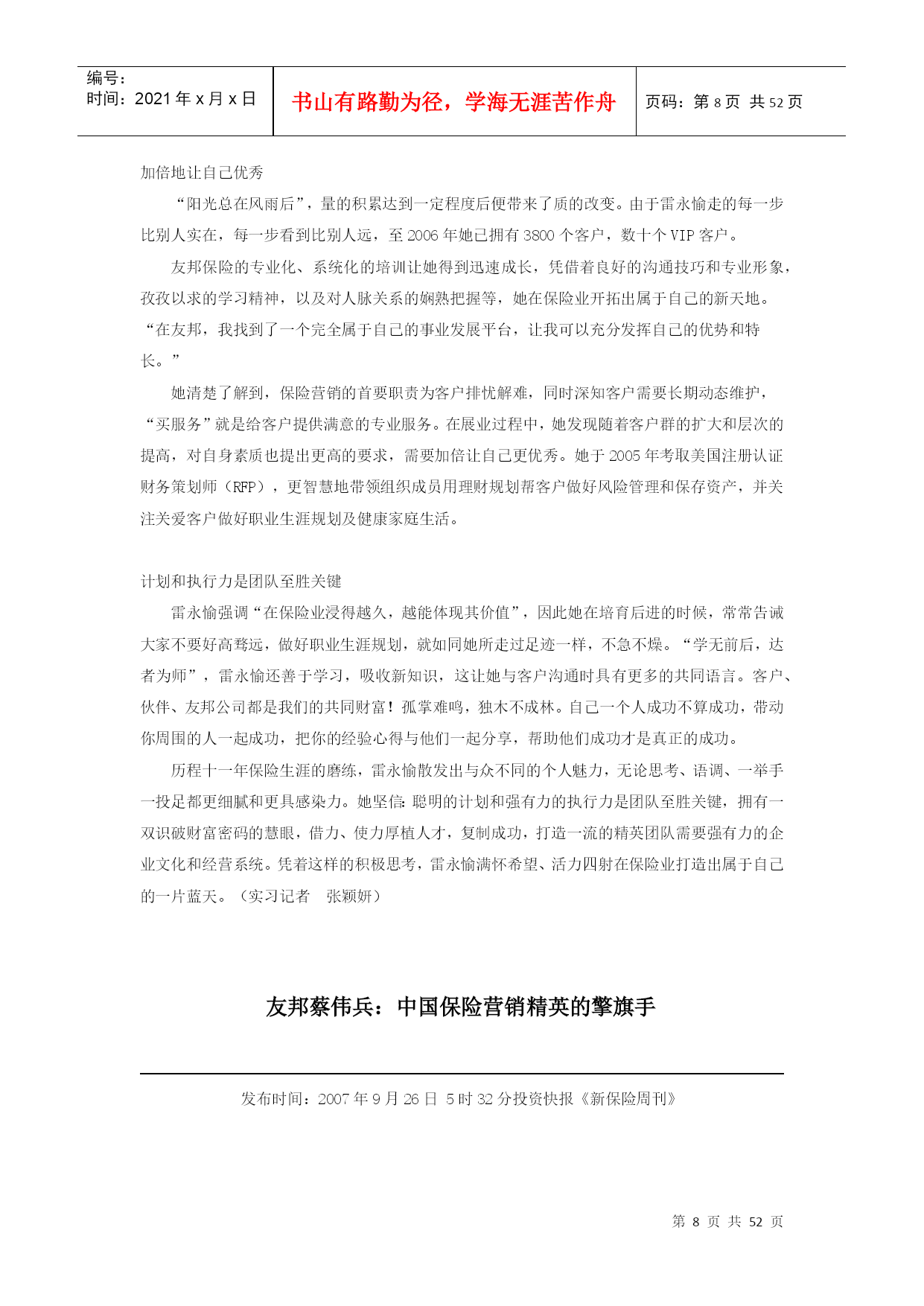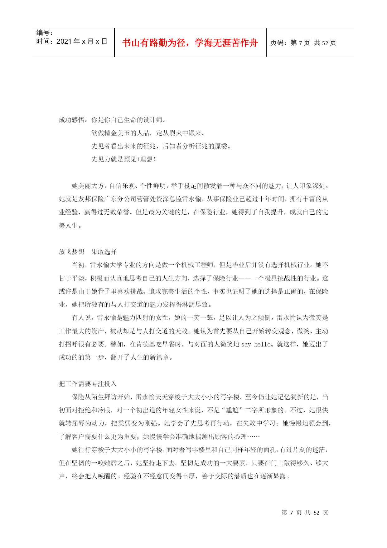 编号:时间:2021年x月x日书山有路勤为径,学海无涯苦作舟页码:第PAGE52页共NUMPAGES52页第PAGE\*MERGEFORMAT52页共NUMPAGES\*MERGEFORMAT52页保险营销成功案例目录HYPERLINK"xx86468x/news_detail.php?id=7517&nowmenuid=56&cpath=0041:&catid=41"\t"_self"谢勤琼:坚持每天“十访”就能成功HYPERLINK"xx86468x/news_detail.php?id=7503&nowmenuid=56&cpath=0041:&catid=41"\t"_self"友邦保险雷永愉:微笑是工作最大的资产HYPERLINK"xx86468x/news_detail.php?id=74一三&nowmenuid=56&cpath=0041:&catid=41"\t"_self"友邦蔡伟兵:中国保险营销精英的擎旗手HYPERLINK"xx86468x/news_detail.php?id=7371&nowmenuid=56&cpath=0041:&catid=41"\t"_self"陈瑛:把保险当作终身事业来经营HYPERLINK"xx86468x/news_detail.php?id=7298&nowmenuid=56&cpath=0041:&catid=41"\t"_self"李圆圆:既然来了,就要拿第一HYPERLINK"xx86468x/news_detail.php?id=7206&nowmenuid=56&cpath=0041:&catid=41"\t"_self"销售大平台:产品说明会创佳绩HYPERLINK"xx86468x/news_detail.php?id=7126&nowmenuid=56&cpath=0041:&catid=41"\t"_self"激励大师:行动是成功的阶梯HYPERLINK"xx86468x/news_detail.php?id=7099&nowmenuid=56&cpath=0041:&catid=41"\t"_self"金杯银杯,不如消费者的口碑HYPERLINK"xx86468x/news_detail.php?id=7034&nowmenuid=56&cpath=0041:&catid=41"\t"_self"夏季营销攻略:售前服务做足功夫HYPERLINK"xx86468x/news_detail.php?id=7005&nowmenuid=56&cpath=0041:&catid=41"\t"_self"保险新营销:网联和据点赢先机HYPERLINK"xx86468x/news_detail.php?id=6914&nowmenuid=56&cpath=0041:&catid=41"\t"_self"广东友邦李畅:用专业成就卓越HYPERLINK"xx86468x/news_detail.php?id=6716&nowmenuid=56&cpath=0041:&catid=41"\t"_self"签单后的服务更重要!HYPERLINK"xx86468x/news_detail.php?id=6672&nowmenuid=56&cpath=0041:&catid=41"\t"_self"案例教学是最好的培训方法HYPERLINK"xx86468x/news_detail.php?id=6580&nowmenuid=56&cpath=0041:&catid=41"\t"_self"团险营销秘笈――多渠道开拓客户资源HYPERLINK"xx86468x/news_detail.php?id=6523&nowmenuid=56&cpath=0041:&catid=41"\t"_self"身体力行是团队建设的关键HYPERLINK"xx86468x/news_detail.php?id=6473&nowmenuid=56&cpath=0041:&catid=41"\t"_self"判断力和耐心是电话行销的法宝HYPERLINK"xx86468x/news_detail.php?id=6449&nowmenuid=56&cpath=0041:&catid=41"\t"_self"保险营销:视客户为朋友HYPERLINK"xx86468x/news_detail.php?id=6410&nowmenuid=56&cpath=0041:&catid=41"\t"_self"状元秘笈:锁定中年女性客户群HYPERLINK"xx864