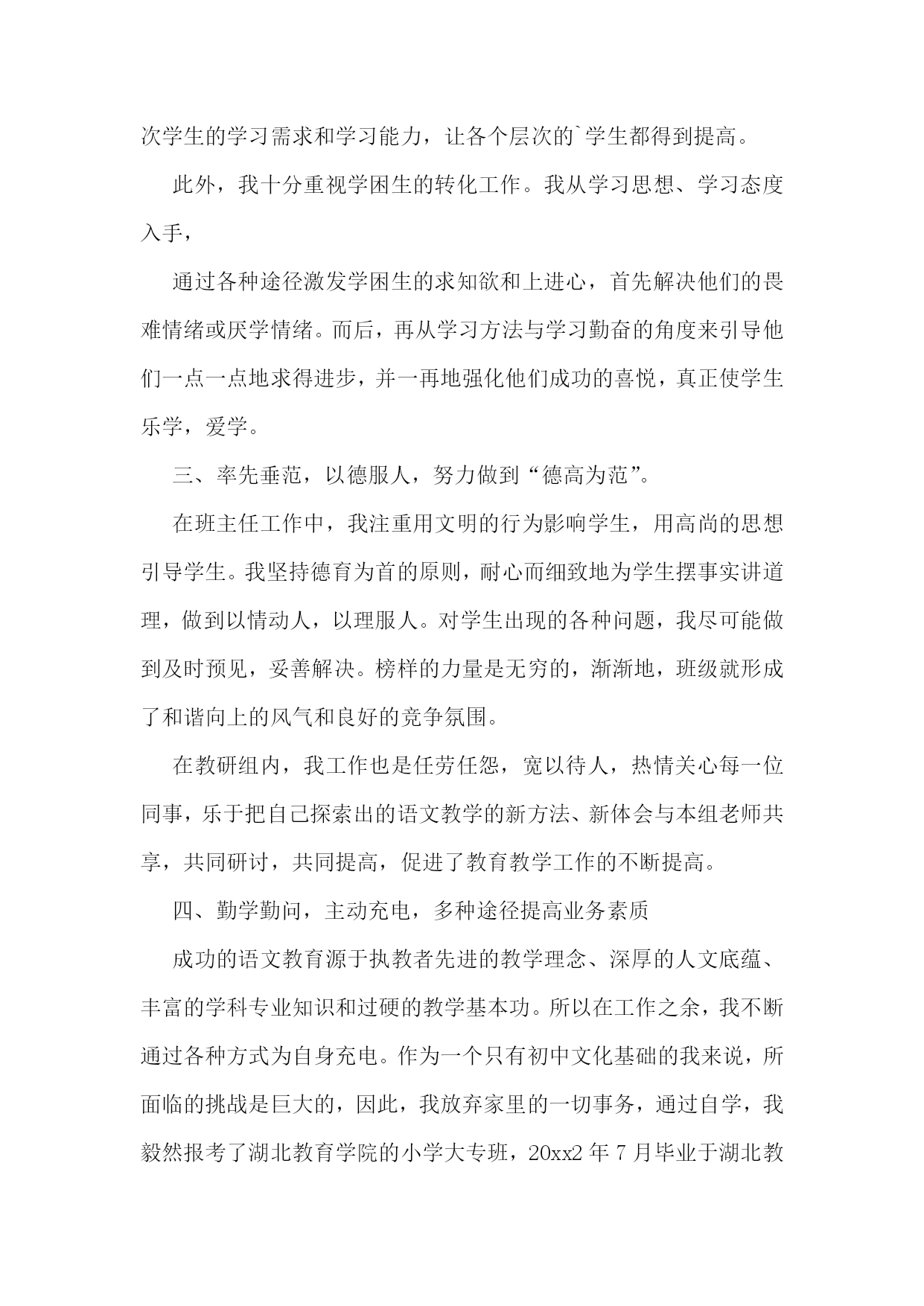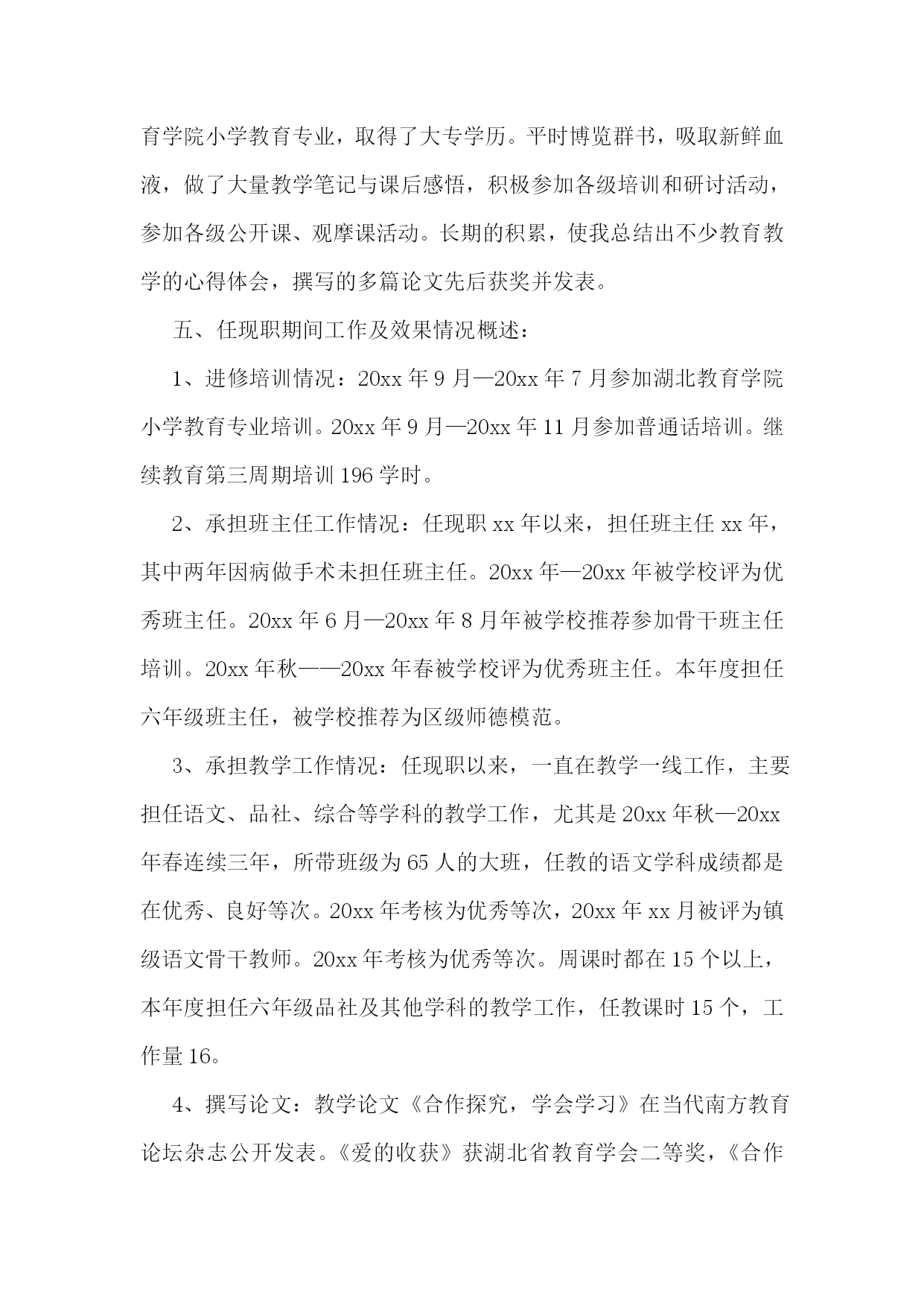 小学专业技术工作总结15篇小学专业技术工作总结1我是嵩明县小街镇边远山区匡郎小学教师史绍录,男,现年50岁。于1987年7月毕业于曲靖师范,分配到自己的家乡小街镇学校工作,于20xx年9月考入云南师范大学在职进修,20xx年10月毕业,从教30多年,一直担任班主任和小学语文教育教学工作兼少先队大队辅导员。近10年来一直在山区教苗族。我认真履行岗位职责,注重自身品德修养,工作勤勤恳恳,任劳任怨,务实求实,取得了一定的成绩,得到老师和领导们的好评。几年来我辛苦工作,因材施教,循循善诱,始终年年坚持一年级语文兼班主任的教育教学工作,为学校培养了一批又一批合格的一年级学生,对小学生活和生存习惯学习观等养成教育多方面的培养做出了很多的贡献。我的具体做法是:一、广采博收,丰富自己的知识内涵。近几年因从事小学语文教学,我深知自己的教学可直接影响学生的后半生,责任重大,因此我经常订阅《安徒生童话》、《伊索寓言》等多种杂志;并经常与外地的同行联系,进行教学研究;每年还要到昆明市、县进修学校和外地参加教研活动,丰富自己的知识内涵,提高自己的执教水平。二、采取多种途径,提高学生的成绩。1、培养学生兴趣。俗话说兴趣是最好的老师。大部分苗族学生对学习语文都有心理障碍,又懒得花费时间去背诵思考,导致有的学生基础知识掌握不错,但又得不到高分,使学习语文的积极性受挫。通过这种状况,经常给学生做与课内容相关的小故事为开场白来导入新课;充分分析语文对人生活密不可分、生活离不开语文等教育来唤醒苗族学生对语文的关注;在课堂上,多用幽默语言、态势语,充分把语文与现实生活相联系等来展现语文知识迷人的魅力,增强学生的兴趣;经常研究利用生字词趣味教学法和多媒体课件进行教学;还通过鼓励表扬、课下谈心等方式,激发学生学习语文的热情。2、认真备课。备好课是讲好课的前提。在备课时针对本班学生的实际,采取相应的方法,因材施教;翻阅大量参考资料,做相关的课件,研究教学大纲、《小学生形象教学法》等权威性资料,真正做到对本节课的知识要求、能力要求、重点、难点的突破方法、学生将会出现的问题、配备什么样的练习来巩固知识等,心中有数,有备而来。其实,尊敬民族,了解家长,关爱学生,接触家庭也是一种备课。3、注重基础,培养能力工程师专业技术总结在对近几年的研究得知,基础知识是提高成绩的前提和关键,而学生又往往忽视基础知识,语文学科的特点也使学生勤于看书,思考,面对这种情况,我更加耐心疏导,加强课堂40分钟的效率,精讲精练,争取当堂知识当堂掌握,并配备各种练习,巩固基础知识。能力的考查与提高是我们现行教育的’根本所在,因此在教学中,在注重基础的同时,时刻不忘能力的培养,在课堂教学中,对汉语拼音、字的笔顺笔画从不同的角度提出问题,引发学生思考,对易混、难懂问题,鼓励学生课堂讨论,各抒己见;平时鼓励学生敢于否定答案,勇于提出创新见解。并随时纠正苗族学生对汉语发音不准等问题,努力找到学生快速学会汉字的绝经。经过艰苦的努力,使学生的能力水平有了很大提高。三、积极进行教改。特别是山区苗族学生,一定要讲求教法。现在我们实行的是新的课程标准,新的课程体系,这就要求我们教师要“穿新鞋、走新路”。“新路”指的是新的教学方法、教学模式,因此教改势在必行。在教学内容的呈现上充分利用多媒体课件,使枯燥知识具体化、形象化、直观化,便于学生理解。在授课中摒弃“满堂灌”、“填鸭式”,而是师生之间形成互动、和谐的教学关系,形成一个“知识共同体”。教师角色定位不再是传统知识的传播者,而是学生学习知识的引导者、促进者,教师要引导学生发现问题、提出问题、分析问题、解决问题,师生平等,互动互惠。采用“自学辅导法”、“诱思探究法”等多种新的教学方法,变学生“要我学为我要学”。四、教书育人,做好班主任工作。在班主任工作中,我做到了有爱心、有恒心,腿勤、眼勤、嘴勤、手勤,及时了解学生的思想动态,针对学生的心理特点采取科学有效的方法,使全体学生在思想觉悟、道德观念、个性品质、团队精神等方面得到提高。学海无涯,教无止境。过去自己虽做了一定的工作,取得一些成绩,但只能说明过去,今后我会百尺竿头,更进一步。五、整体优化,带动个别。从事七年的大队辅导员工作,保平安、搞卫生,抓纪律,促文明,督学习、搞活动。我组织一批大队委员,每天轮流对学校各班进行纪律、卫生、学习、行为等多项检查打分,每天早中晚检查三次,并对违纪队员给予批评。长期坚持,对校规校纪及学生行为规范起到了监督作用,利于学生好习惯的培养。并在周一升旗仪式上举行“国旗下的演讲”活动,并利用校园广播及时公告本周内发生的大事,对队员提出新的要求,及时奖惩。学校已经形成了一个好的校风和学风。我们还让学生从各种活动中快乐地学会学习、学会做人、知好歹、识大体。让个别调皮学生受到集体大流