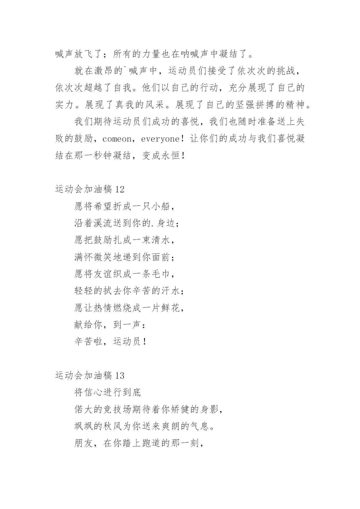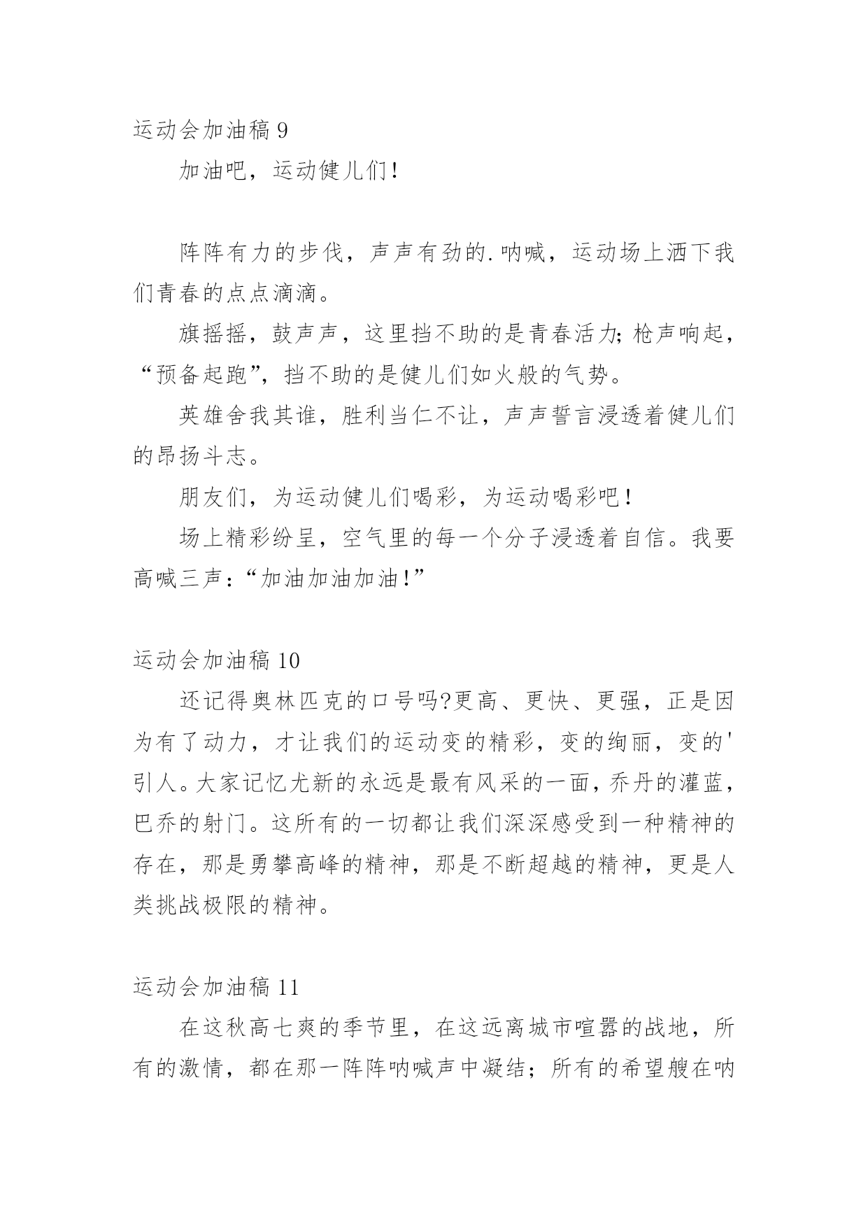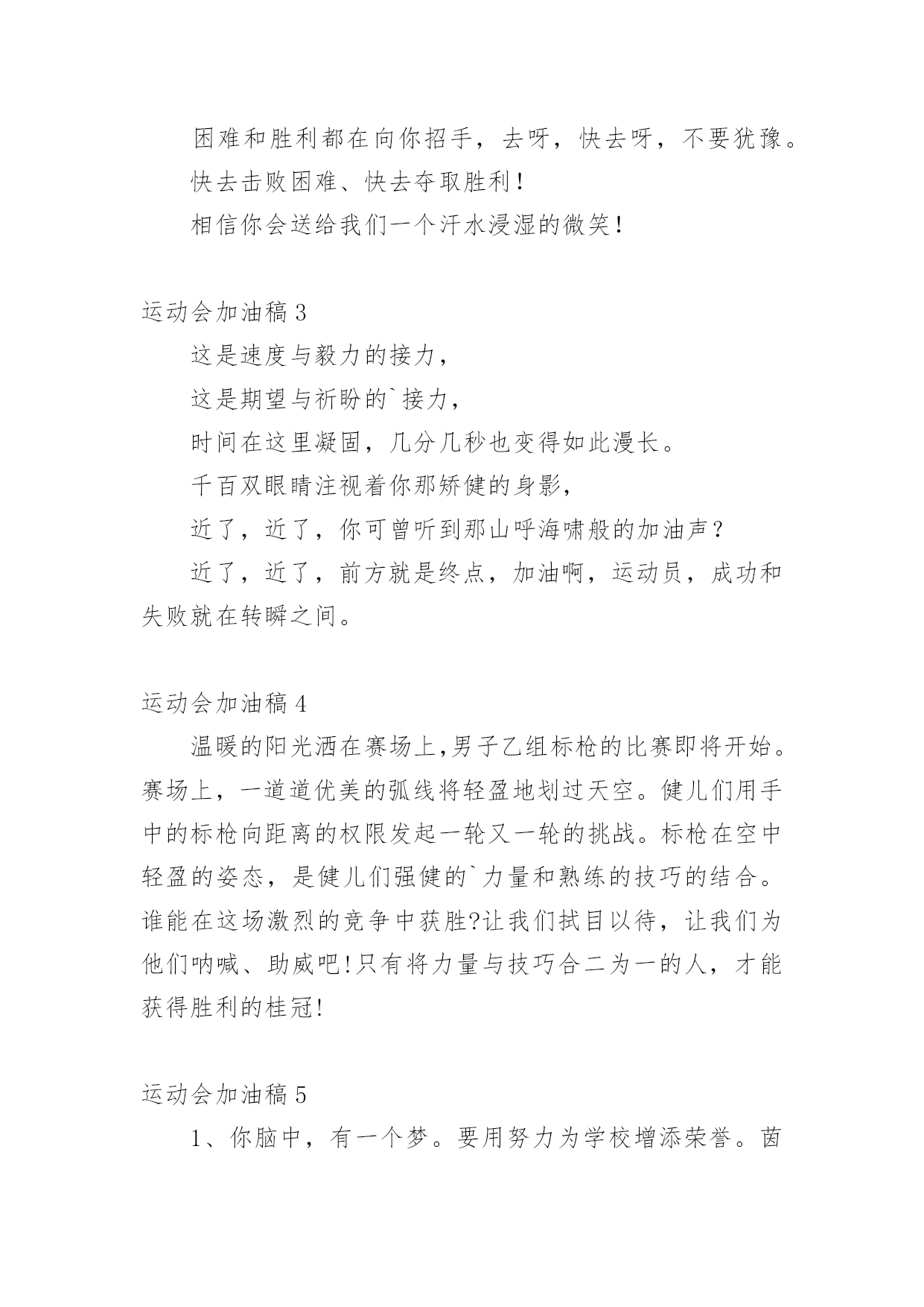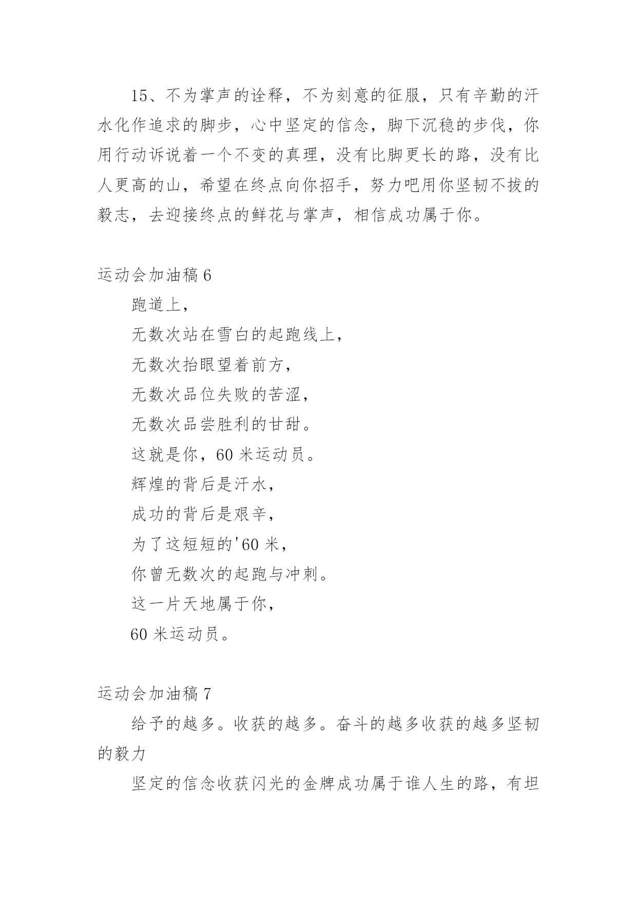 运动会加油稿运动会加油稿【热】在社会发展不断提速的今天,我们用到加油稿的地方越来越多,加油稿是用于给别人加油鼓气,提升别人气势的文稿。那么加油稿一般是怎么写的呢?以下是小编为大家整理的运动会加油稿,仅供参考,欢迎大家阅读。运动会加油稿1带着青春的朝气,散发着年轻的激情,搏击生命的长空,高吼一声:“我们来啦。”我们走进了杭电大学生冬季运动会。来自五湖四海的莘莘学子共聚杭电一方,学习上你追我赶,运动场上随处可见他们矫健的身影,在杭电大学生运动会上他们踊跃报名,以期一展当代大学生的风采。在运动会的.几天里,他们始终坚持发扬友谊第一,重在参与的优良风格,赛出成绩赛出风格将会伴随运动会顺利结束,拭目以待吧,亲爱的师生。运动会加油稿2深深的呼吸,等待你的是艰难的5000米。相信胜利会属于你们。但在这征途上,需要你用勇敢的心去面对。我们在为你加油,你是否听到了我们发自心中的.呐喊?困难和胜利都在向你招手,去呀,快去呀,不要犹豫。快去击败困难、快去夺取胜利!相信你会送给我们一个汗水浸湿的微笑!运动会加油稿3这是速度与毅力的接力,这是期望与祈盼的`接力,时间在这里凝固,几分几秒也变得如此漫长。千百双眼睛注视着你那矫健的身影,近了,近了,你可曾听到那山呼海啸般的加油声?近了,近了,前方就是终点,加油啊,运动员,成功和失败就在转瞬之间。运动会加油稿4温暖的阳光洒在赛场上,男子乙组标枪的比赛即将开始。赛场上,一道道优美的弧线将轻盈地划过天空。健儿们用手中的标枪向距离的权限发起一轮又一轮的挑战。标枪在空中轻盈的姿态,是健儿们强健的`力量和熟练的技巧的结合。谁能在这场激烈的竞争中获胜?让我们拭目以待,让我们为他们呐喊、助威吧!只有将力量与技巧合二为一的人,才能获得胜利的桂冠!运动会加油稿51、你脑中,有一个梦。要用努力为学校增添荣誉。茵茵运动场,谁是真的英雄?努力拼搏的你带给我们太多感动。忘记了累,也忘记_了痛,背起期望中的终点。用我们的呐喊唤起你的动力,祝福每个运动员都赛出成绩。把握竞赛中的每一秒钟,和全体同学共同努力。不经历拼搏,怎么见彩虹。没有谁能随随便便成功。努力吧,健儿们,拼搏吧,勇士们!2、运动会比赛的体育项目训练接近尾声。在第一,第二运动场上依然弥漫着浓浓的挑战与竞争气氛。望着他们依然有条不紊地继续坚持训练,心中莫名其妙地产生了对他们深深的钦佩:他们已经在精神上战胜了自我。在最后等待他们的是挑战自己的极限。3、运动场上有你们的飒爽英姿,运动场上有你们拼搏的身影,面对漫漫的征程,你没有畏惧和退缩,任汗水打湿脊背,任疲惫爬满全身,依然奋力追赶,只有一个目标,只有一个信念,为班级赢得荣誉,拼搏吧,我为你们呐喊,加油!4、在我们的花样年华中,你们磨砺锻造了自己,就是全世界的;你们不畏强敌,展示了自己,就是最勇敢最有魄力的!人不是为了失败而生,但也不是为了成功而存活,只要你有一颗不断进取的心,你就是秀的。5、拼搏者,你是赛场上最亮的点。在你的眼中,不在乎胜利的欢乐和失败的眼泪,完全只是为了展示生命跳跃的节拍。拼搏者,你是生命乐章中最响的音符。在你的心中,只有不停拼搏的信念,用自己坚实的步伐去迈开人生新的旅程。场上的拼搏者,你是我们永远的骄傲!6、我只愿做一片落叶,去点缀金黄的秋天,我只愿做一颗恒星,去装饰耀眼的星河,我只愿做一棵,去充实五彩的世界,我只愿坐在场边,同你们分享喜悦,努力吧,拼搏吧,无论何时何地,都会有我在你的身边。7、几许真诚的`鼓励,几句亲切的问候,几注深情的目光,几多支持与帮助,带给运动员的是信心,是勇气,是誓夺第一的决心和毅力。几句呐喊,几束鲜花,阵阵锣鼓,片片掌声,带给运动员的是满足,是感激,是成功后的喜悦和快意。谢谢你,我们的啦啦队!8、前一轮的准备已经结束,下一轮的激烈竞争已经开始。在我们的花样年华中,你们磨砺锻造了自己,就是全世界的;你们不畏强敌,展示了自己,就是最勇敢最有魄力的!人不是为了失败而生,但也不是为了成功而存活,只要你有一颗不断进取的心,你就是秀的。9、看!那一面面迎风飘舞的彩旗,是一朵朵盛开的鲜花;听!那一阵阵惊天动地的欢呼,是回响在耳边胜利的风声。运动场上的你们,是胜利的标志,运动场上的你们,是青春的赞叹。去吧!去迎接那伟大的挑战,去吧!去做一名追风的少年。10、温暖的阳光洒在赛场上,男子乙组标枪的比赛即将开始。赛场上,一道道优美的弧线将轻盈地划过天空。健儿们用手中的标枪向距离的权限发起一轮又一轮的挑战。标枪在空中轻盈的姿态,是健儿们强健的力量和熟练的技巧的结合。谁能在这场激烈的竞争中获胜?让我们拭目以待,让我们为他们呐喊、助威吧!只有将力量与技巧合二为一的人,才能获得胜利的桂冠!11、踏着春天的气息,迈着轻盈的脚步,我们迎来了心仪已久的运动会。这里就是展示自我的舞台。我们向往高山的坚忍不拔,我们渴望大