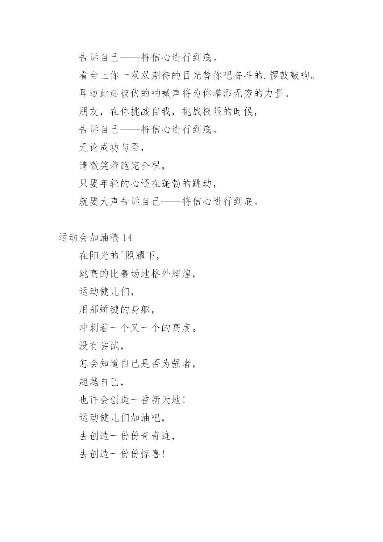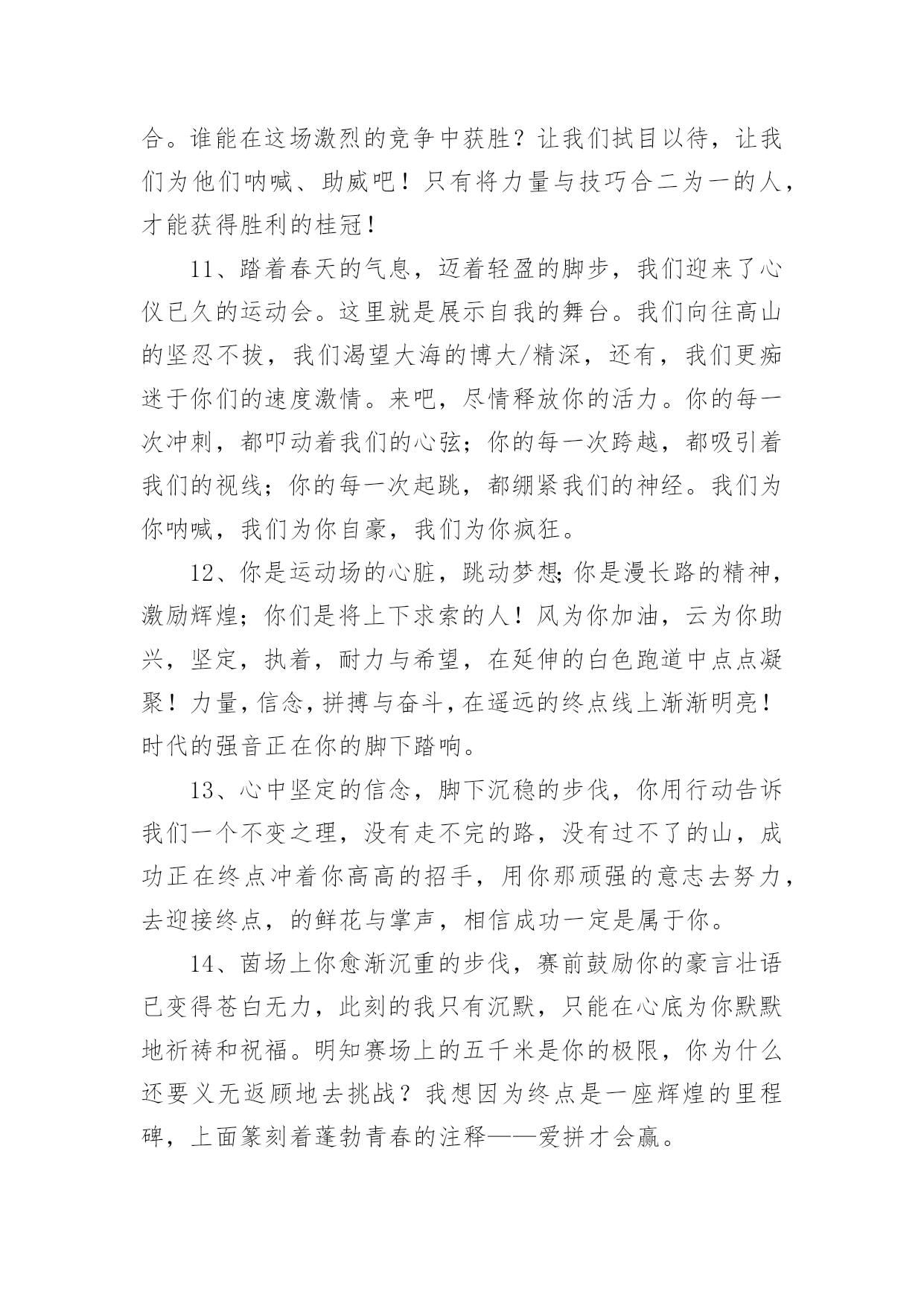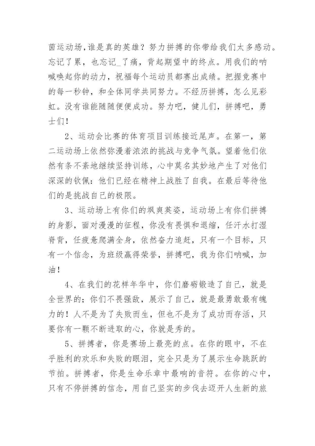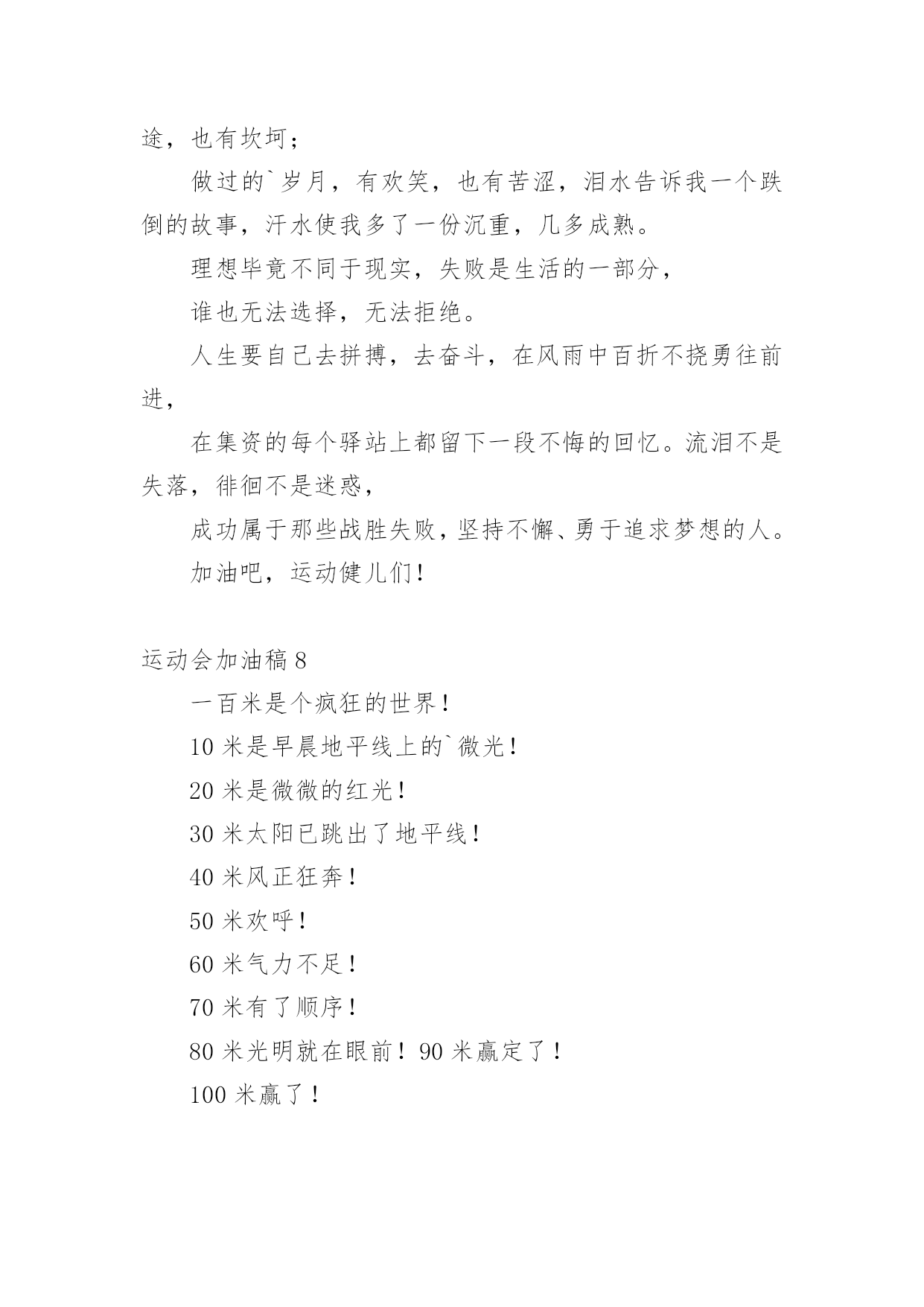 运动会加油稿运动会加油稿【热】在社会发展不断提速的今天,我们用到加油稿的地方越来越多,加油稿是用于给别人加油鼓气,提升别人气势的文稿。那么加油稿一般是怎么写的呢?以下是小编为大家整理的运动会加油稿,仅供参考,欢迎大家阅读。运动会加油稿1带着青春的朝气,散发着年轻的激情,搏击生命的长空,高吼一声:“我们来啦。”我们走进了杭电大学生冬季运动会。来自五湖四海的莘莘学子共聚杭电一方,学习上你追我赶,运动场上随处可见他们矫健的身影,在杭电大学生运动会上他们踊跃报名,以期一展当代大学生的风采。在运动会的.几天里,他们始终坚持发扬友谊第一,重在参与的优良风格,赛出成绩赛出风格将会伴随运动会顺利结束,拭目以待吧,亲爱的师生。运动会加油稿2深深的呼吸,等待你的是艰难的5000米。相信胜利会属于你们。但在这征途上,需要你用勇敢的心去面对。我们在为你加油,你是否听到了我们发自心中的.呐喊?困难和胜利都在向你招手,去呀,快去呀,不要犹豫。快去击败困难、快去夺取胜利!相信你会送给我们一个汗水浸湿的微笑!运动会加油稿3这是速度与毅力的接力,这是期望与祈盼的`接力,时间在这里凝固,几分几秒也变得如此漫长。千百双眼睛注视着你那矫健的身影,近了,近了,你可曾听到那山呼海啸般的加油声?近了,近了,前方就是终点,加油啊,运动员,成功和失败就在转瞬之间。运动会加油稿4温暖的阳光洒在赛场上,男子乙组标枪的比赛即将开始。赛场上,一道道优美的弧线将轻盈地划过天空。健儿们用手中的标枪向距离的权限发起一轮又一轮的挑战。标枪在空中轻盈的姿态,是健儿们强健的`力量和熟练的技巧的结合。谁能在这场激烈的竞争中获胜?让我们拭目以待,让我们为他们呐喊、助威吧!只有将力量与技巧合二为一的人,才能获得胜利的桂冠!运动会加油稿51、你脑中,有一个梦。要用努力为学校增添荣誉。茵茵运动场,谁是真的英雄?努力拼搏的你带给我们太多感动。忘记了累,也忘记_了痛,背起期望中的终点。用我们的呐喊唤起你的动力,祝福每个运动员都赛出成绩。把握竞赛中的每一秒钟,和全体同学共同努力。不经历拼搏,怎么见彩虹。没有谁能随随便便成功。努力吧,健儿们,拼搏吧,勇士们!2、运动会比赛的体育项目训练接近尾声。在第一,第二运动场上依然弥漫着浓浓的挑战与竞争气氛。望着他们依然有条不紊地继续坚持训练,心中莫名其妙地产生了对他们深深的钦佩:他们已经在精神上战胜了自我。在最后等待他们的是挑战自己的极限。3、运动场上有你们的飒爽英姿,运动场上有你们拼搏的身影,面对漫漫的征程,你没有畏惧和退缩,任汗水打湿脊背,任疲惫爬满全身,依然奋力追赶,只有一个目标,只有一个信念,为班级赢得荣誉,拼搏吧,我为你们呐喊,加油!4、在我们的花样年华中,你们磨砺锻造了自己,就是全世界的;你们不畏强敌,展示了自己,就是最勇敢最有魄力的!人不是为了失败而生,但也不是为了成功而存活,只要你有一颗不断进取的心,你就是秀的。5、拼搏者,你是赛场上最亮的点。在你的眼中,不在乎胜利的欢乐和失败的眼泪,完全只是为了展示生命跳跃的节拍。拼搏者,你是生命乐章中最响的音符。在你的心中,只有不停拼搏的信念,用自己坚实的步伐去迈开人生新的旅程。场上的拼搏者,你是我们永远的骄傲!6、我只愿做一片落叶,去点缀金黄的秋天,我只愿做一颗恒星,去装饰耀眼的星河,我只愿做一棵,去充实五彩的世界,我只愿坐在场边,同你们分享喜悦,努力吧,拼搏吧,无论何时何地,都会有我在你的身边。7、几许真诚的`鼓励,几句亲切的问候,几注深情的目光,几多支持与帮助,带给运动员的是信心,是勇气,是誓夺第一的决心和毅力。几句呐喊,几束鲜花,阵阵锣鼓,片片掌声,带给运动员的是满足,是感激,是成功后的喜悦和快意。谢谢你,我们的啦啦队!8、前一轮的准备已经结束,下一轮的激烈竞争已经开始。在我们的花样年华中,你们磨砺锻造了自己,就是全世界的;你们不畏强敌,展示了自己,就是最勇敢最有魄力的!人不是为了失败而生,但也不是为了成功而存活,只要你有一颗不断进取的心,你就是秀的。9、看!那一面面迎风飘舞的彩旗,是一朵朵盛开的鲜花;听!那一阵阵惊天动地的欢呼,是回响在耳边胜利的风声。运动场上的你们,是胜利的标志,运动场上的你们,是青春的赞叹。去吧!去迎接那伟大的挑战,去吧!去做一名追风的少年。10、温暖的阳光洒在赛场上,男子乙组标枪的比赛即将开始。赛场上,一道道优美的弧线将轻盈地划过天空。健儿们用手中的标枪向距离的权限发起一轮又一轮的挑战。标枪在空中轻盈的姿态,是健儿们强健的力量和熟练的技巧的结合。谁能在这场激烈的竞争中获胜?让我们拭目以待,让我们为他们呐喊、助威吧!只有将力量与技巧合二为一的人,才能获得胜利的桂冠!11、踏着春天的气息,迈着轻盈的脚步,我们迎来了心仪已久的运动会。这里就是展示自我的舞台。我们向往高山的坚忍不拔,我们渴望大