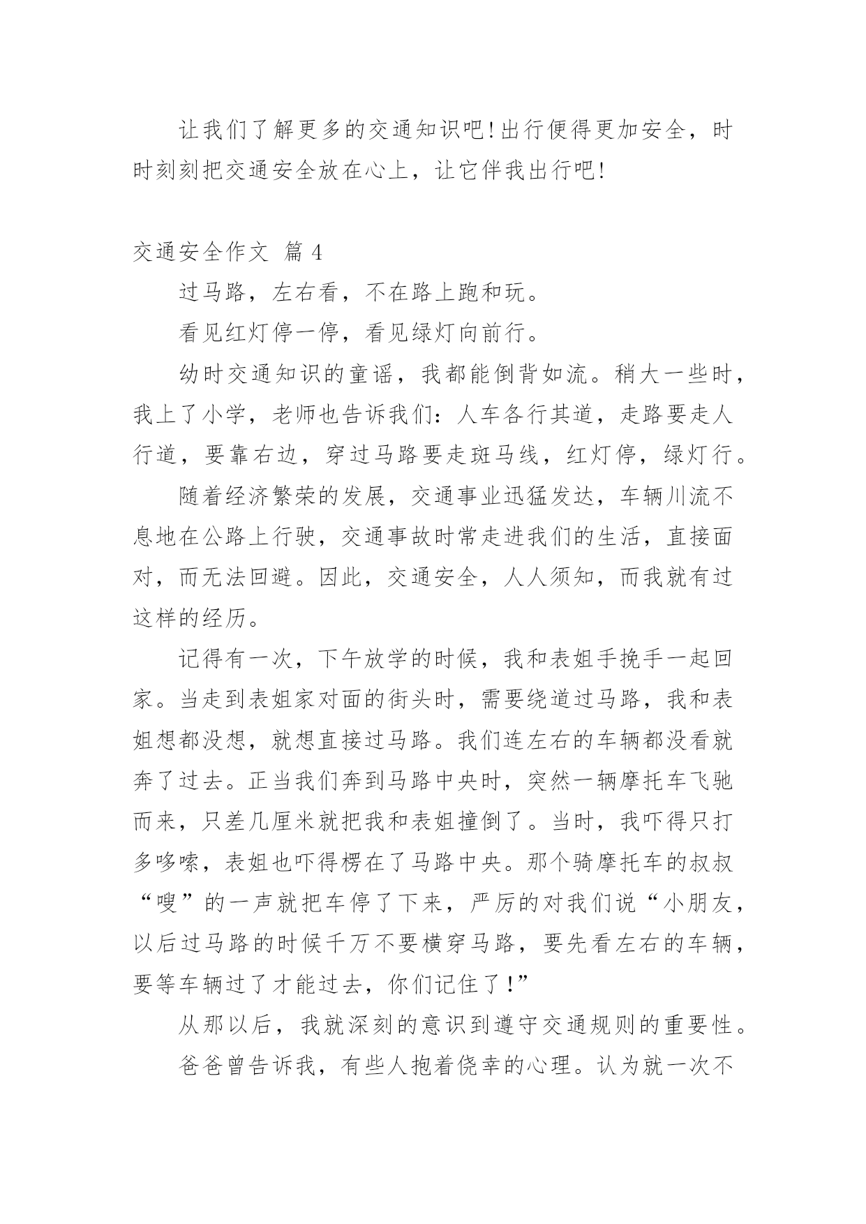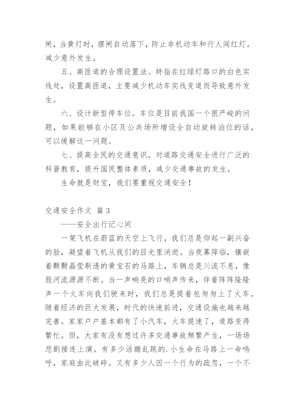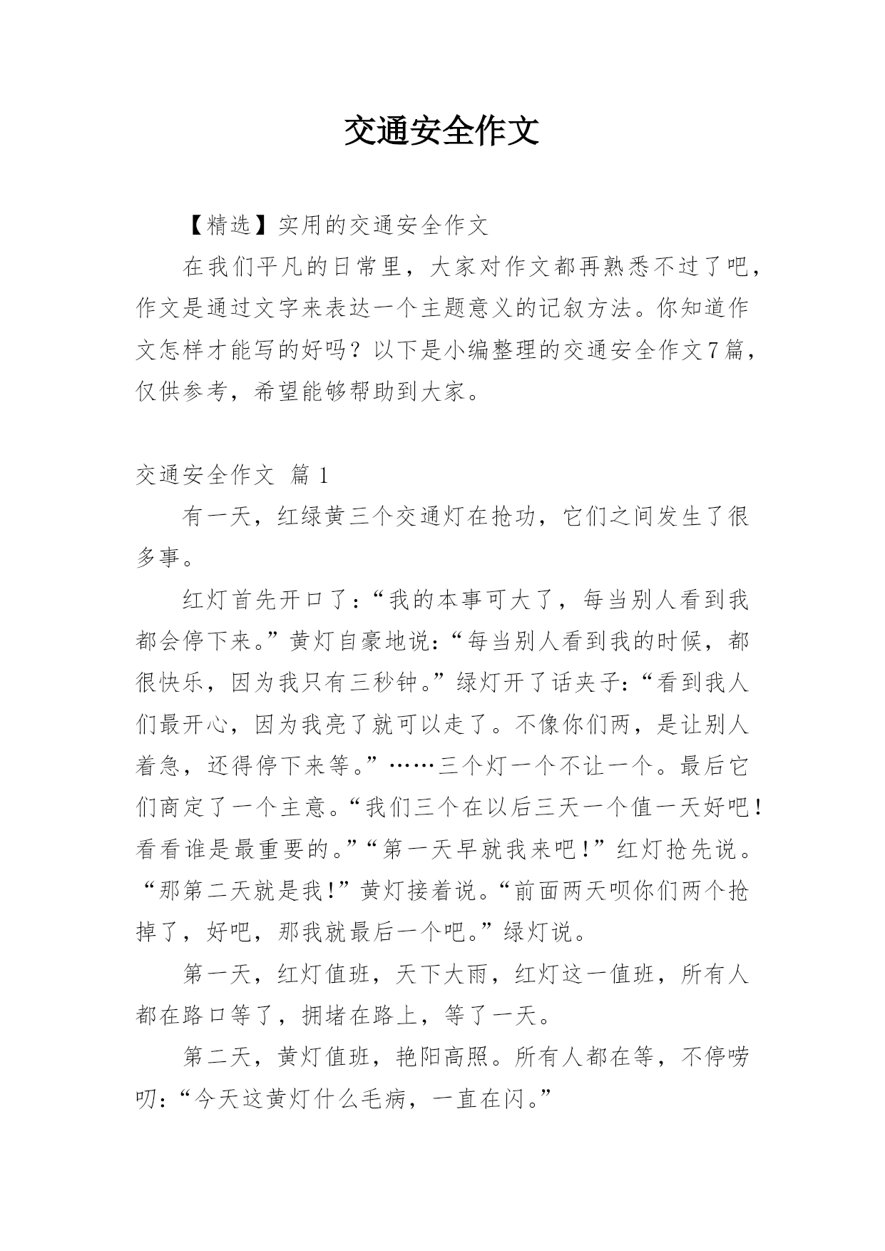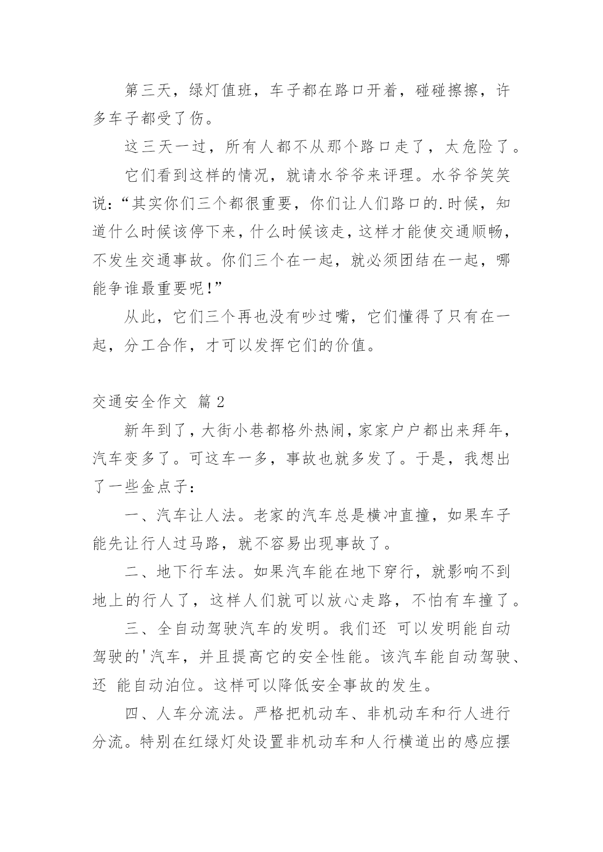 交通安全作文【精选】实用的交通安全作文在我们平凡的日常里,大家对作文都再熟悉不过了吧,作文是通过文字来表达一个主题意义的记叙方法。你知道作文怎样才能写的好吗?以下是小编整理的交通安全作文7篇,仅供参考,希望能够帮助到大家。交通安全作文篇1有一天,红绿黄三个交通灯在抢功,它们之间发生了很多事。红灯首先开口了:“我的本事可大了,每当别人看到我都会停下来。”黄灯自豪地说:“每当别人看到我的时候,都很快乐,因为我只有三秒钟。”绿灯开了话夹子:“看到我人们最开心,因为我亮了就可以走了。不像你们两,是让别人着急,还得停下来等。”……三个灯一个不让一个。最后它们商定了一个主意。“我们三个在以后三天一个值一天好吧!看看谁是最重要的。”“第一天早就我来吧!”红灯抢先说。“那第二天就是我!”黄灯接着说。“前面两天呗你们两个抢掉了,好吧,那我就最后一个吧。”绿灯说。第一天,红灯值班,天下大雨,红灯这一值班,所有人都在路口等了,拥堵在路上,等了一天。第二天,黄灯值班,艳阳高照。所有人都在等,不停唠叨:“今天这黄灯什么毛病,一直在闪。”第三天,绿灯值班,车子都在路口开着,碰碰擦擦,许多车子都受了伤。这三天一过,所有人都不从那个路口走了,太危险了。它们看到这样的情况,就请水爷爷来评理。水爷爷笑笑说:“其实你们三个都很重要,你们让人们路口的.时候,知道什么时候该停下来,什么时候该走,这样才能使交通顺畅,不发生交通事故。你们三个在一起,就必须团结在一起,哪能争谁最重要呢!”从此,它们三个再也没有吵过嘴,它们懂得了只有在一起,分工合作,才可以发挥它们的价值。交通安全作文篇2新年到了,大街小巷都格外热闹,家家户户都出来拜年,汽车变多了。可这车一多,事故也就多发了。于是,我想出了一些金点子:一、汽车让人法。老家的汽车总是横冲直撞,如果车子能先让行人过马路,就不容易出现事故了。二、地下行车法。如果汽车能在地下穿行,就影响不到地上的行人了,这样人们就可以放心走路,不怕有车撞了。三、全自动驾驶汽车的发明。我们还可以发明能自动驾驶的'汽车,并且提高它的安全性能。该汽车能自动驾驶、还能自动泊位。这样可以降低安全事故的发生。四、人车分流法。严格把机动车、非机动车和行人进行分流。特别在红绿灯处设置非机动车和人行横道出的感应摆闸,当黄灯时,摆闸自动落下,防止非机动车和行人闯红灯。减少意外发生。五、高匝道的合理设置法。特指在红绿灯路口的白色实线处,设置高匝道,主要减少机动车实线变道而导致意外发生。六、设计新型停车位。车位是目前我国一个很严峻的问题,如果能够在小区及公共场所增设全自动旋转泊位的话,可以缓解这一问题。七、提高全民的交通意识。对道路交通安全进行广泛的科普教育,提升国民整体素质,减少交通事故的发生。生命就是财宝,我们要重视交通安全!交通安全作文篇3——安全出行记心间一架飞机在蔚蓝的天空上飞行,我们总是仰起一副兴奋的脸,凝望着飞机从我们的目光里消逝。当夜幕降临,镶嵌着颗颗晶莹剔透的黄宝石的马路上,车辆总是川流不息,像股河流源源不断。当一声响亮的口哨声传来,伴着阵阵隆隆声一个火车向我们驶来时,我们总是提着包匆匆上了火车。随着经济的巨大发展,时代的快速前进,交通设施也越来越完善。家家户户基本都有了小汽车,火车提速了,道路变得繁忙。但,大家有没有想过许多交通事故频繁产生,一场场悲剧接连上演。有多少活蹦乱跳的.小生命在马路上一命呜呼,家庭由此破碎。又有多少人因一个行为的疏忽,一个不在意,便辞离人世。据统计,我国每年死于交通人数在10万以上,日均死亡270多人。为什么会有这么一个巨大的数字?为什么会有那么多悲剧?我想这是小学生交通安全意识肤浅的一个显着标记。很多人总是抢几秒过马路,把在红灯时过马路当儿戏看待,不遵守交通规则,翻马路上的栏杆,在马路上玩滑板……这些是多么危险啊!有一个真实的故事:有辆校车上的学生爱把车窗打开,然后把手和头伸出窗外,感受车在马路上疾驰,一阵风吹过时的清爽。一次,坐靠在窗边的一名学生突然把头伸出去,向对面的公交车上的人打招呼。这是,一辆驶在后边的车猛的驶来,夹然而过,那名同学的头顿时被撞掉了。这是血的教训啊!这辆校车上的学生缺乏交通安全知识和没有一点对交通安全的意识,认识。假如这位学生知道把头伸出去会有多大危险,这个做法是错误的话,他的生命会就此告终么?现在的小学生总因为一个好玩,一个试试而不考虑交通上的任何危险。同学们,遵守交通规则和懂得些交通安全知识使我们出行时的保障。我们有了这个保障才能带着好心情出门,载着满满一身收获回家。我给大家传授一些交通知识:要满12周岁才可以骑自行车上路,骑自行车时不可以互相打闹或臀部离开坐板,应抓紧扶手,精神集中。乘摩托车时要带上头盔,不准在摩托车上侧坐。坐的士车时,小孩尽可能不做副驾驶位,要系好安全带。坐船时,不要把身体