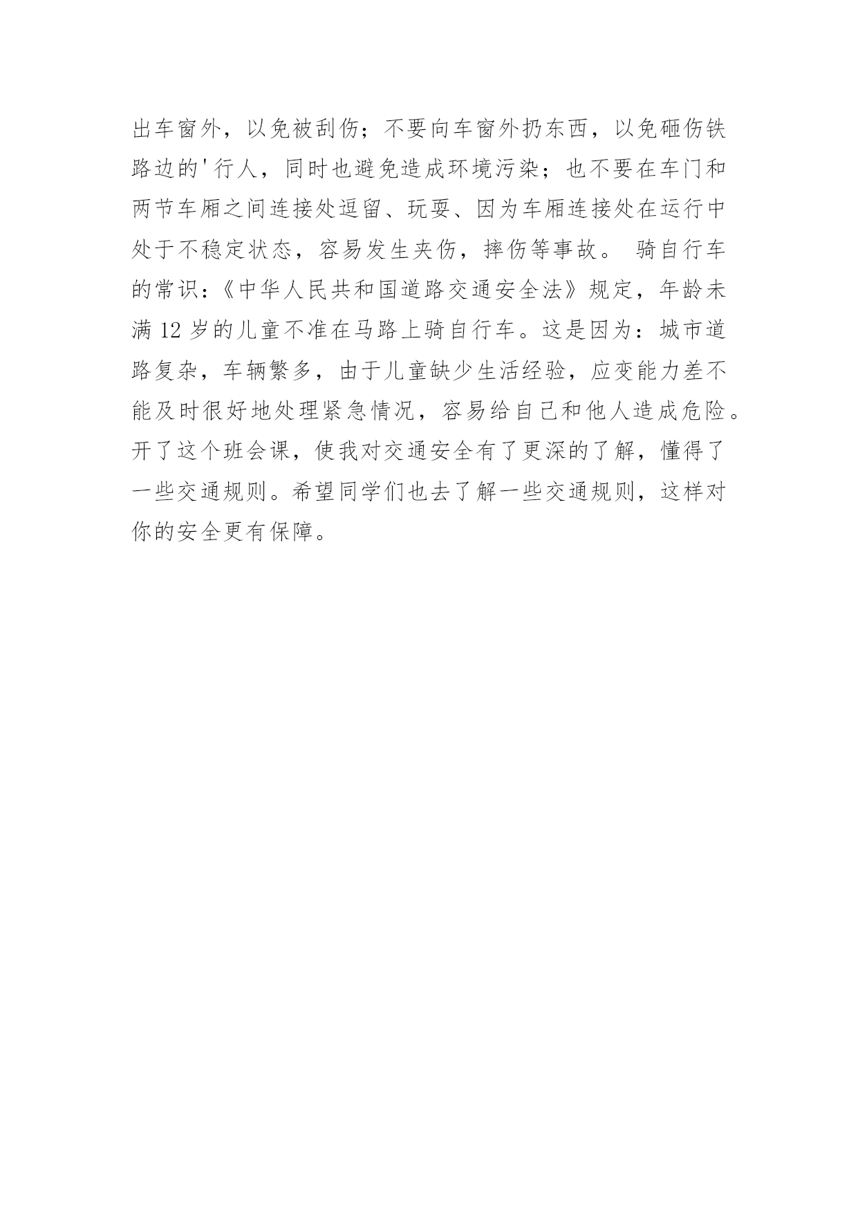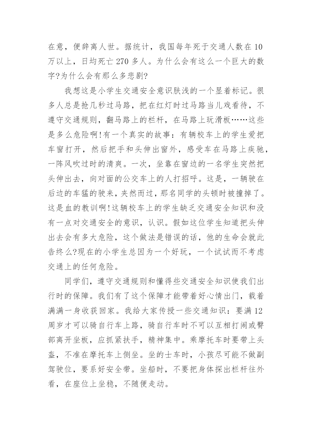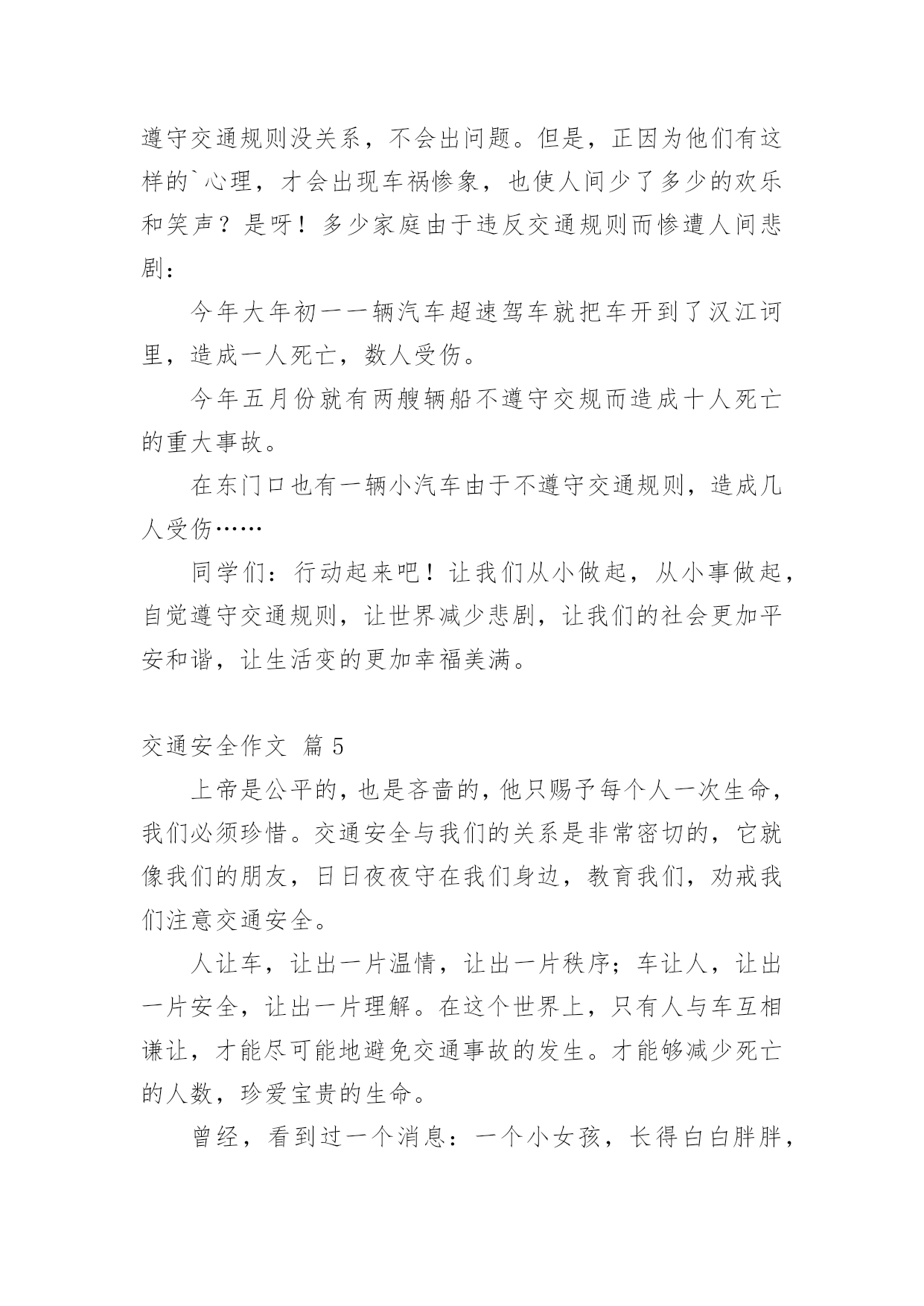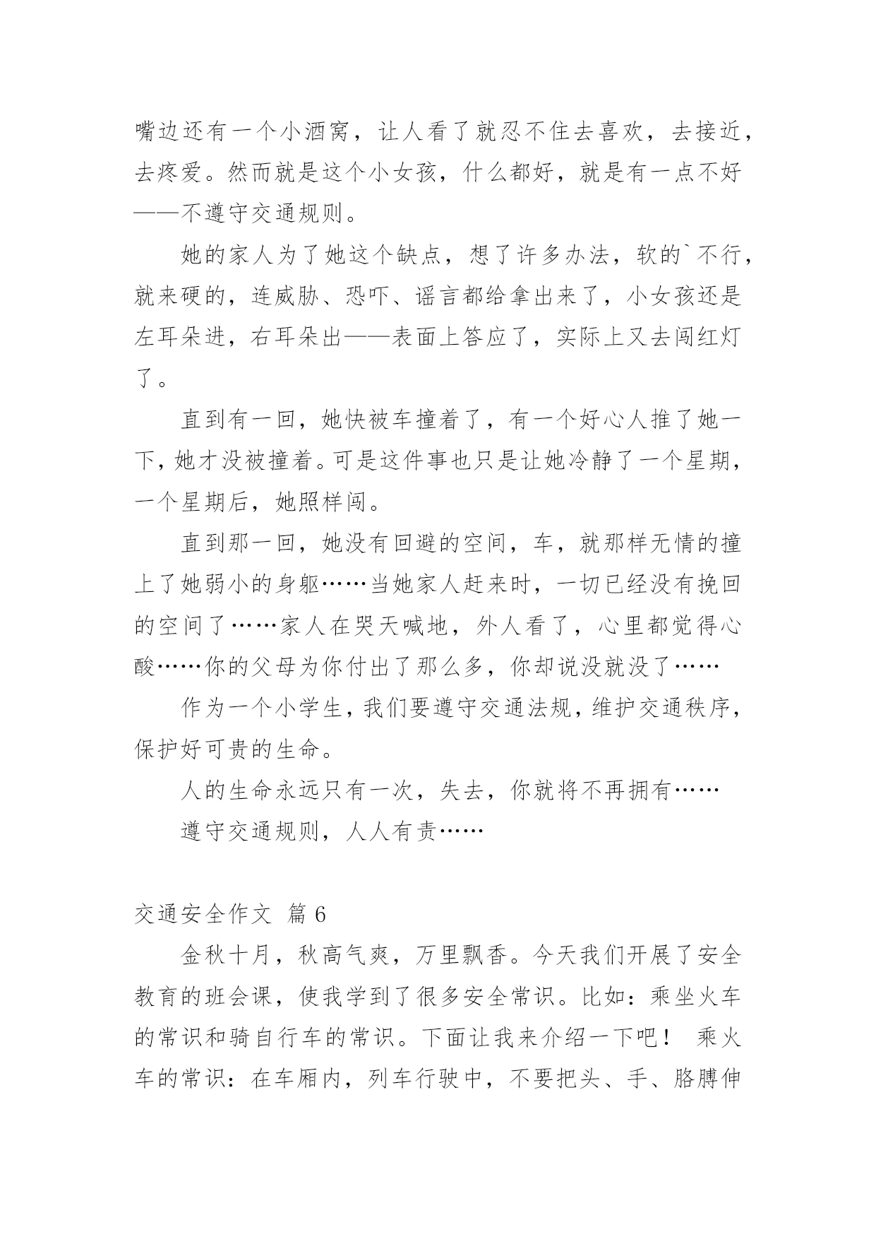 交通安全作文【精选】实用的交通安全作文在我们平凡的日常里,大家对作文都再熟悉不过了吧,作文是通过文字来表达一个主题意义的记叙方法。你知道作文怎样才能写的好吗?以下是小编整理的交通安全作文7篇,仅供参考,希望能够帮助到大家。交通安全作文篇1有一天,红绿黄三个交通灯在抢功,它们之间发生了很多事。红灯首先开口了:“我的本事可大了,每当别人看到我都会停下来。”黄灯自豪地说:“每当别人看到我的时候,都很快乐,因为我只有三秒钟。”绿灯开了话夹子:“看到我人们最开心,因为我亮了就可以走了。不像你们两,是让别人着急,还得停下来等。”……三个灯一个不让一个。最后它们商定了一个主意。“我们三个在以后三天一个值一天好吧!看看谁是最重要的。”“第一天早就我来吧!”红灯抢先说。“那第二天就是我!”黄灯接着说。“前面两天呗你们两个抢掉了,好吧,那我就最后一个吧。”绿灯说。第一天,红灯值班,天下大雨,红灯这一值班,所有人都在路口等了,拥堵在路上,等了一天。第二天,黄灯值班,艳阳高照。所有人都在等,不停唠叨:“今天这黄灯什么毛病,一直在闪。”第三天,绿灯值班,车子都在路口开着,碰碰擦擦,许多车子都受了伤。这三天一过,所有人都不从那个路口走了,太危险了。它们看到这样的情况,就请水爷爷来评理。水爷爷笑笑说:“其实你们三个都很重要,你们让人们路口的.时候,知道什么时候该停下来,什么时候该走,这样才能使交通顺畅,不发生交通事故。你们三个在一起,就必须团结在一起,哪能争谁最重要呢!”从此,它们三个再也没有吵过嘴,它们懂得了只有在一起,分工合作,才可以发挥它们的价值。交通安全作文篇2新年到了,大街小巷都格外热闹,家家户户都出来拜年,汽车变多了。可这车一多,事故也就多发了。于是,我想出了一些金点子:一、汽车让人法。老家的汽车总是横冲直撞,如果车子能先让行人过马路,就不容易出现事故了。二、地下行车法。如果汽车能在地下穿行,就影响不到地上的行人了,这样人们就可以放心走路,不怕有车撞了。三、全自动驾驶汽车的发明。我们还可以发明能自动驾驶的'汽车,并且提高它的安全性能。该汽车能自动驾驶、还能自动泊位。这样可以降低安全事故的发生。四、人车分流法。严格把机动车、非机动车和行人进行分流。特别在红绿灯处设置非机动车和人行横道出的感应摆闸,当黄灯时,摆闸自动落下,防止非机动车和行人闯红灯。减少意外发生。五、高匝道的合理设置法。特指在红绿灯路口的白色实线处,设置高匝道,主要减少机动车实线变道而导致意外发生。六、设计新型停车位。车位是目前我国一个很严峻的问题,如果能够在小区及公共场所增设全自动旋转泊位的话,可以缓解这一问题。七、提高全民的交通意识。对道路交通安全进行广泛的科普教育,提升国民整体素质,减少交通事故的发生。生命就是财宝,我们要重视交通安全!交通安全作文篇3——安全出行记心间一架飞机在蔚蓝的天空上飞行,我们总是仰起一副兴奋的脸,凝望着飞机从我们的目光里消逝。当夜幕降临,镶嵌着颗颗晶莹剔透的黄宝石的马路上,车辆总是川流不息,像股河流源源不断。当一声响亮的口哨声传来,伴着阵阵隆隆声一个火车向我们驶来时,我们总是提着包匆匆上了火车。随着经济的巨大发展,时代的快速前进,交通设施也越来越完善。家家户户基本都有了小汽车,火车提速了,道路变得繁忙。但,大家有没有想过许多交通事故频繁产生,一场场悲剧接连上演。有多少活蹦乱跳的.小生命在马路上一命呜呼,家庭由此破碎。又有多少人因一个行为的疏忽,一个不在意,便辞离人世。据统计,我国每年死于交通人数在10万以上,日均死亡270多人。为什么会有这么一个巨大的数字?为什么会有那么多悲剧?我想这是小学生交通安全意识肤浅的一个显着标记。很多人总是抢几秒过马路,把在红灯时过马路当儿戏看待,不遵守交通规则,翻马路上的栏杆,在马路上玩滑板……这些是多么危险啊!有一个真实的故事:有辆校车上的学生爱把车窗打开,然后把手和头伸出窗外,感受车在马路上疾驰,一阵风吹过时的清爽。一次,坐靠在窗边的一名学生突然把头伸出去,向对面的公交车上的人打招呼。这是,一辆驶在后边的车猛的驶来,夹然而过,那名同学的头顿时被撞掉了。这是血的教训啊!这辆校车上的学生缺乏交通安全知识和没有一点对交通安全的意识,认识。假如这位学生知道把头伸出去会有多大危险,这个做法是错误的话,他的生命会就此告终么?现在的小学生总因为一个好玩,一个试试而不考虑交通上的任何危险。同学们,遵守交通规则和懂得些交通安全知识使我们出行时的保障。我们有了这个保障才能带着好心情出门,载着满满一身收获回家。我给大家传授一些交通知识:要满12周岁才可以骑自行车上路,骑自行车时不可以互相打闹或臀部离开坐板,应抓紧扶手,精神集中。乘摩托车时要带上头盔,不准在摩托车上侧坐。坐的士车时,小孩尽可能不做副驾驶位,要系好安全带。坐船时,不要把身体