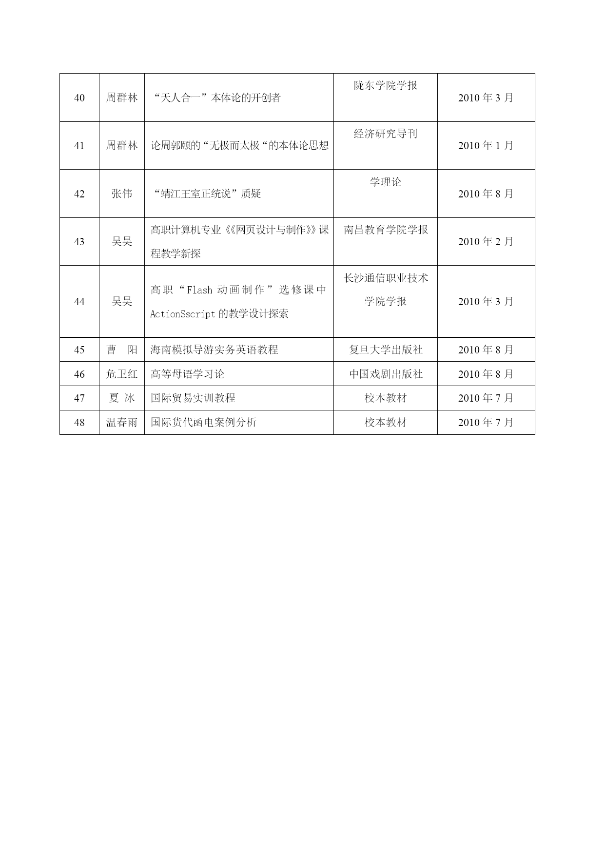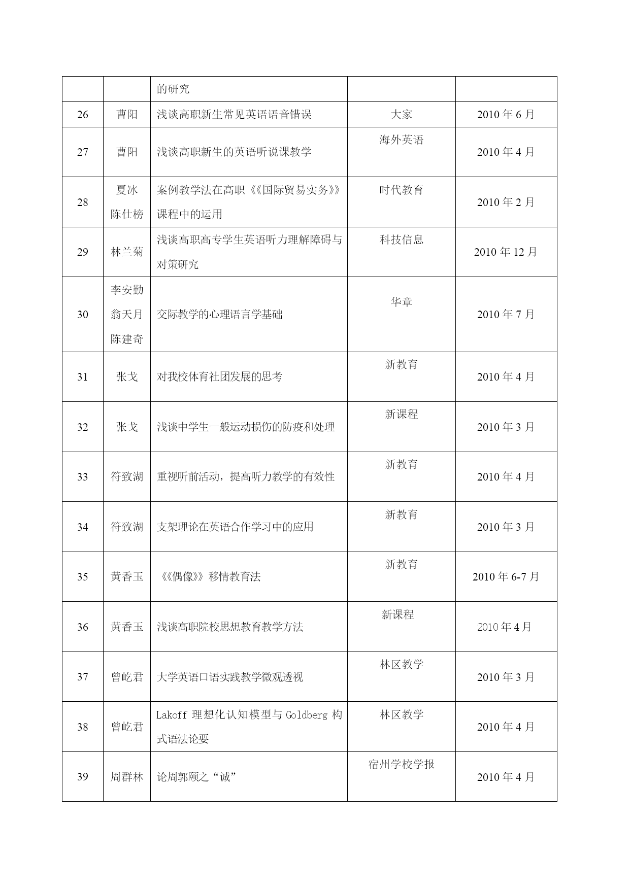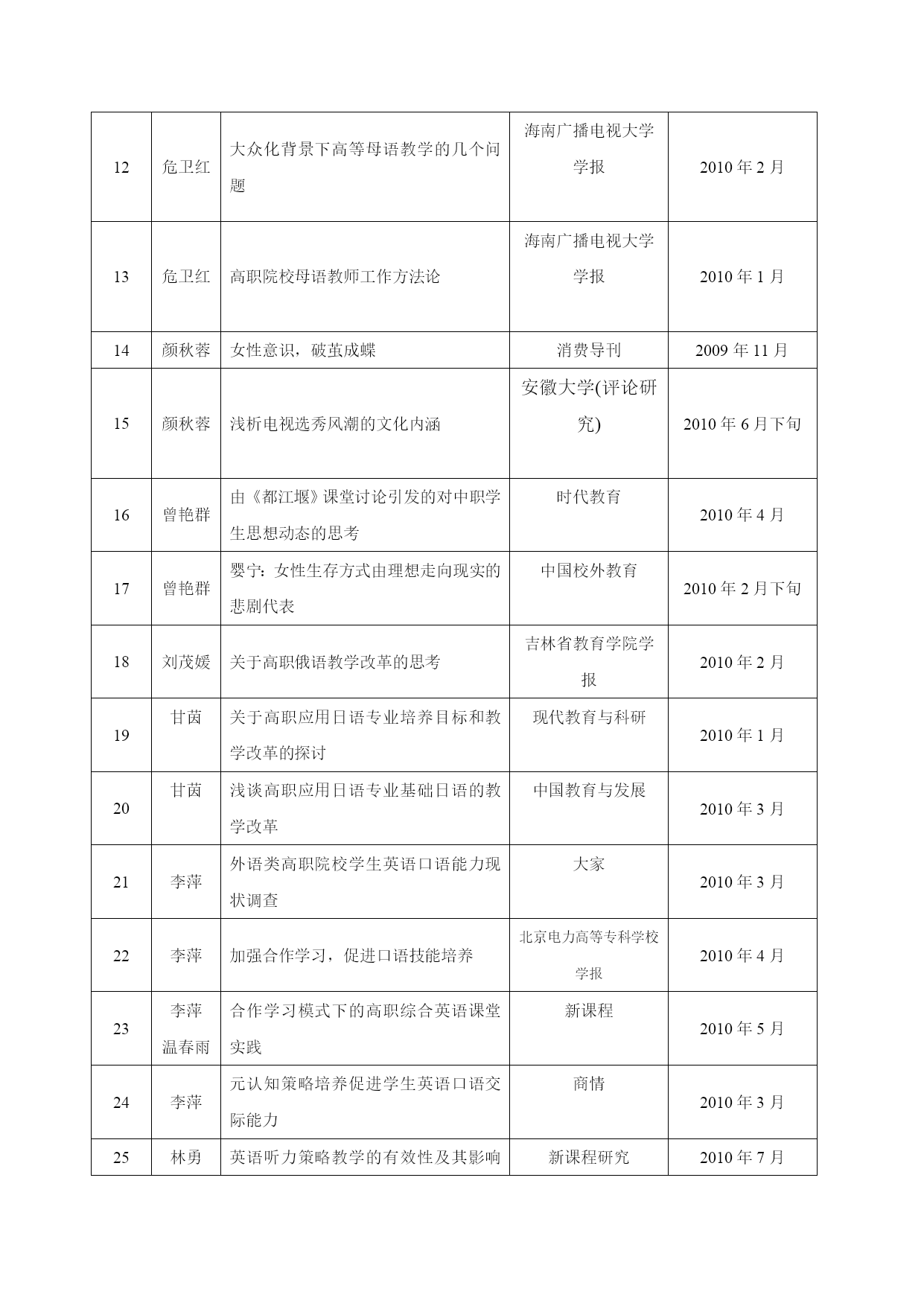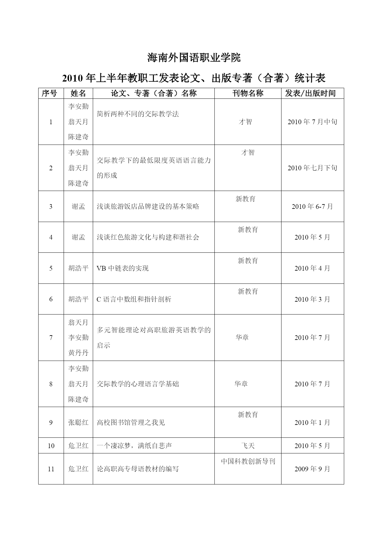 海南外国语职业学院2010年上半年教职工发表论文、出版专著(合著)统计表序号姓名论文、专著(合著)名称刊物名称发表/出版时间1李安勤翁天月陈建奇简析两种不同的交际教学法才智2010年7月中旬2李安勤翁天月陈建奇交际教学下的最低限度英语语言能力的形成才智2010年七月下旬3谢孟浅谈旅游饭店品牌建设的基本策略新教育2010年6-7月4谢孟浅谈红色旅游文化与构建和谐社会新教育2010年5月5胡浩平VB中链表的实现新教育2010年4月6胡浩平C语言中数组和指针剖析新教育2010年3月7翁天月李安勤黄丹丹多元智能理论对高职旅游英语教学的启示华章2010年7月8李安勤翁天月陈建奇交际教学的心理语言学基础华章2010年7月9张聪红高校图书馆管理之我见新教育2010年1月10危卫红一个凄凉梦,满纸自悲声飞天2010年5月11危卫红论高职高专母语教材的编写中国科教创新导刊2009年9月12危卫红大众化背景下高等母语教学的几个问题海南广播电视大学学报2010年2月13危卫红高职院校母语教师工作方法论海南广播电视大学学报2010年1月14颜秋蓉女性意识,破茧成蝶消费导刊2009年11月15颜秋蓉浅析电视选秀风潮的文化内涵安徽大学(评论研究)2010年6月下旬16曾艳群由《都江堰》课堂讨论引发的对中职学生思想动态的思考时代教育2010年4月17曾艳群婴宁:女性生存方式由理想走向现实的悲剧代表中国校外教育2010年2月下旬18刘茂媛关于高职俄语教学改革的思考吉林省教育学院学报2010年2月19甘茵关于高职应用日语专业培养目标和教学改革的探讨现代教育与科研2010年1月20甘茵浅谈高职应用日语专业基础日语的教学改革中国教育与发展2010年3月21李萍外语类高职院校学生英语口语能力现状调查大家2010年3月22李萍加强合作学习,促进口语技能培养北京电力高等专科学校学报2010年4月23李萍温春雨合作学习模式下的高职综合英语课堂实践新课程2010年5月24李萍元认知策略培养促进学生英语口语交际能力商情2010年3月25林勇英语听力策略教学的有效性及其影响的研究新课程研究2010年7月26曹阳浅谈高职新生常见英语语音错误大家2010年6月27曹阳浅谈高职新生的英语听说课教学海外英语2010年4月28夏冰陈仕榜案例教学法在高职《《国际贸易实务》》课程中的运用时代教育2010年2月29林兰菊浅谈高职高专学生英语听力理解障碍与对策研究科技信息2010年12月30李安勤翁天月陈建奇交际教学的心理语言学基础华章2010年7月31张戈对我校体育社团发展的思考新教育2010年4月32张戈浅谈中学生一般运动损伤的防疫和处理新课程2010年3月33符致湖重视听前活动,提高听力教学的有效性新教育2010年4月34符致湖支架理论在英语合作学习中的应用新教育2010年3月35黄香玉《《偶像》》移情教育法新教育2010年6-7月36黄香玉浅谈高职院校思想教育教学方法新课程2010年4月37曾屹君大学英语口语实践教学微观透视林区教学2010年3月38曾屹君Lakoff理想化认知模型与Goldberg构式语法论要林区教学2010年4月39周群林论周郭颐之“诚”宿州学校学报2010年4月40周群林“天人合一”本体论的开创者陇东学院学报2010年3月41周群林论周郭颐的“无极而太极“的本体论思想经济研究导刊2010年1月42张伟“靖江王室正统说”质疑学理论2010年8月43吴昊高职计算机专业《《网页设计与制作》》课程教学新探南昌教育学院学报2010年2月44吴昊高职“Flash动画制作”选修课中ActionSscript的教学设计探索长沙通信职业技术学院学报2010年3月45曹阳海南模拟导游实务英语教程复旦大学出版社2010年8月46危卫红高等母语学习论中国戏剧出版社2010年8月47夏冰国际贸易实训教程校本教材2010年7月48温春雨国际货代函电案例分析校本教材2010年7月