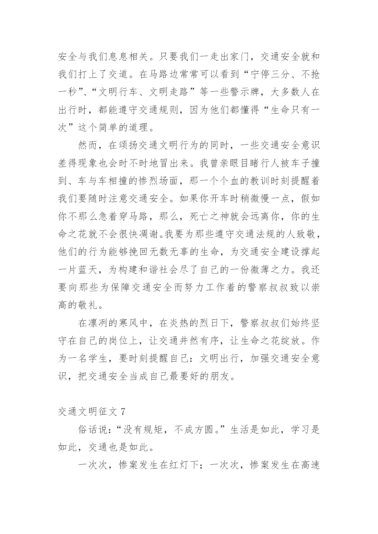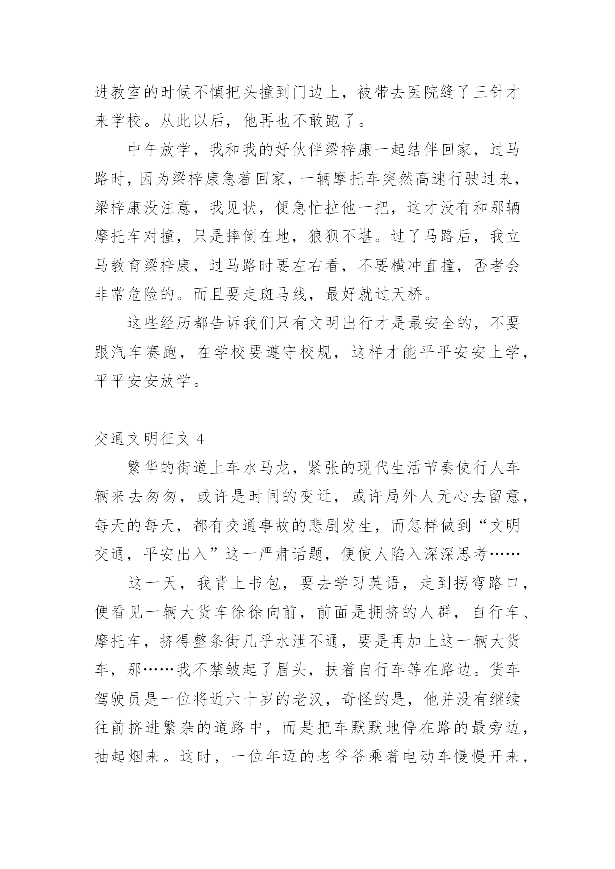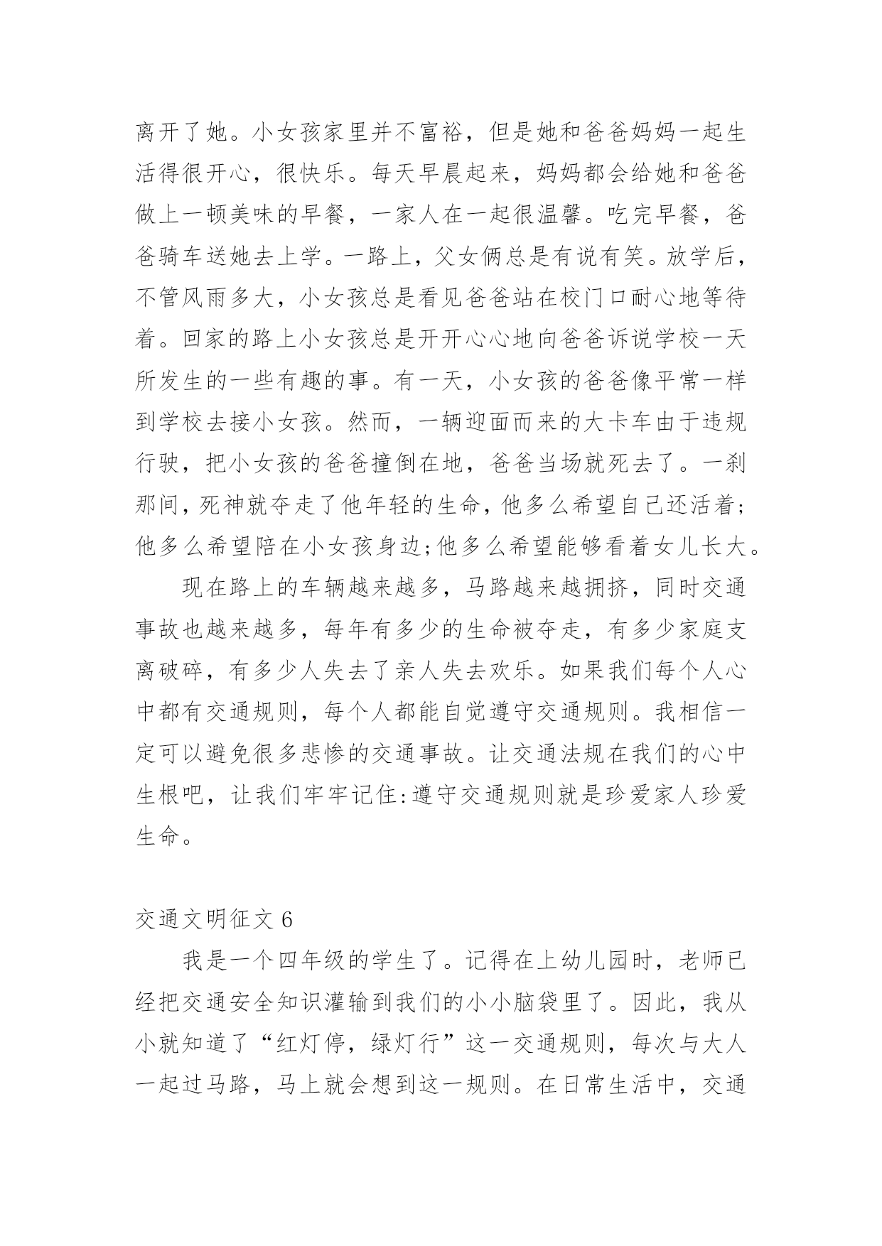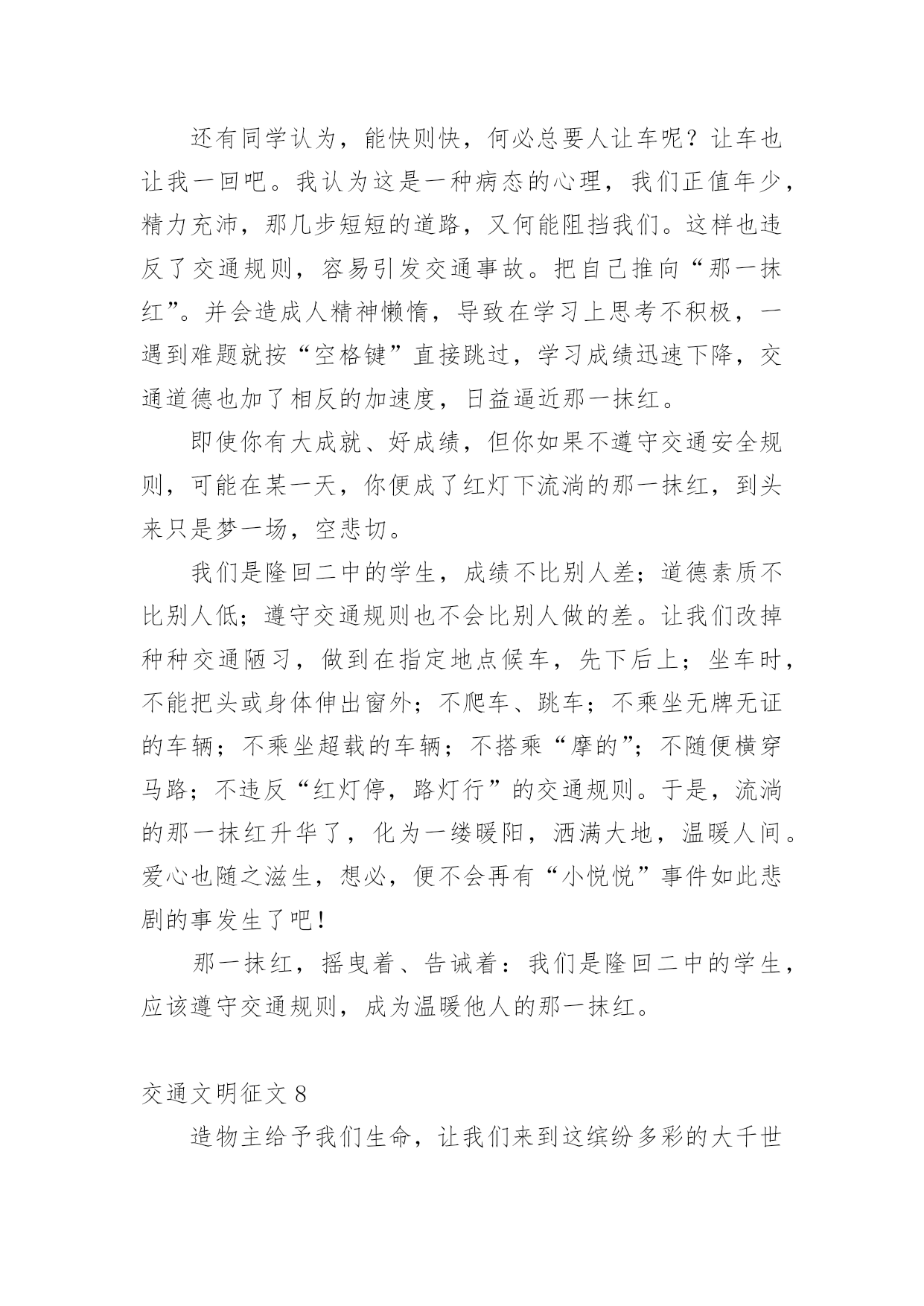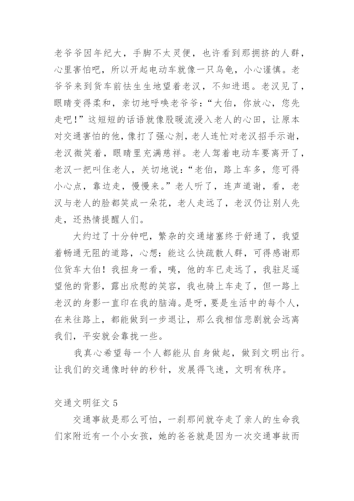 交通文明征文交通文明征文集合18篇在日常学习、工作抑或是生活中,大家一定都接触过征文吧,征文要求篇章结构完整,一定要避免无结尾征文的出现。你所见过的征文是什么样的呢?下面是小编整理的交通文明征文,希望能够帮助到大家。交通文明征文1上帝是公平的也是吝啬的,他只赐予每个人一次生命,所以我们必须珍惜。生活中交通安全与我们的关系是非常密切的。文明行车,文明走路,是人们在日常生活中出行安全的基本要求。出行安全,不仅关系到自己的生命和安全,同时也是尊重他人生命的体现。车让人,让出一份文明;人让车,让出一份安全;车让车,让出一份秩序;人让人,让出一份友爱!如果只是行人让司机,司机却不让行人,过不了多久行人就不会让司机了;如果只是司机让行人,过不了多久,司机也就不会让行人了。只有行人和司机都相互体谅,相互谦让,相互包容,才能使我们的城市更加和谐。“高高兴兴上学去,平平安安回家来。”是每个学校老师和学生家长对学生的一个共同心愿。青少年是祖国的花朵,社会主义的接班人,在学好科学文化知识的同时,更应该学习如何保护自己。在交通日益繁忙,生活节奏日益加快的今天,遵守交通规则更是刻不容缓,这样才为我们前进的路上了护栏。遵守交通法规,人人有责。中学时代是人生最灿烂的季节,珍视生命,才能保证好的时光是需要生命去享受的,拥有健康的生命是拥有一切的前提。你的生命是你自己的在尽情享受青春的欢乐时,也不要忘了,愿我们共同的努力,可以使交通更通畅,生活更安全。交通文明征文2“文明行车,文明走路”是人们在日常生活中出行安全的基本要求。出行安全,不仅关系到自己的生命和安全,同时也是尊重他人生命的体现,是构筑和谐社会的重要因素。透过川流不息行驶的车辆,“关爱生命,安全出行”八个字在我的脑海里显得更加突出。一、我与出行安全提到出行安全,很难不让人想到交通安全。在日常生活中,交通安全总是围绕在我们身边。只要你一出行,便同交通安全打上了交道。行走时的一次走神,过马路时的一次侥幸,开车时的一次违章,仅仅是一次小小的疏忽,这一切都会使一个生命转瞬即逝。飞旋的车轮会无情地吞噬掉行人的生命。曾经看过一则报道:“全国每六分钟就会有一人死于车轮底下”。这绝对不是危言耸听。惨痛的事实再一次给我们敲响了警钟:“文明行车,文明走路”。二、交通安全与生命现代交通的发达虽然给人们带来了无尽的便利,但同时也增加了许多安全隐患。有人曾称交通事故为“现代社会的交通战争”,交通事故像一个隐形的杀手,潜伏在马路上等待着违章违规的人出现。因此,人们应当学会保护自己,要养成文明行车,文明走路的习惯。“人的生命只有一次”“人,最宝贵的是生命”,血的悲剧告诉我们一定要遵守交通法规,真正做到“关爱生命,安全出行”。三、平安大道通和谐安全的出行,营造良好的交通运行环境无意识为和谐社会的构筑添砖加瓦,而和谐的社会又为交通安全的建设撑起了一片蓝天。这,便是双赢的智慧。作为一名普通的中学生,遵守交通法规,维护交通秩序是我们应该具备的社会公德。“文明行走,构筑和谐”,这需要每个公民从自身做起,从小事做起,让“平安大道”更加畅通无阻,共同牵手文明!交通文明征文3生命,那是自然会给人类去雕琢的宝石。文明交通,时刻都应该提醒我们遵守交通规则,注意交通文明。作为一名小学生,更应该现在学起、从小事做起。文明交通,珍爱生命。有一次,我和妈妈在路边散步时,就亲眼目睹到一位叔叔因闯红灯而失去了宝贵的生命。那是在十字路口,大家看见红灯亮着,都自觉地等待着。可有一位叔叔偏偏不耐烦,就急匆匆地冲了过去,他不但左冲右撞,而且也没走在斑马线上。就在他刚走出一半时,远处一辆大货车飞快地驰骋过来了。说时迟,那时快。尽管大货车的驾驶员叔叔看到了乱穿马路的叔叔,但是已迟了。随着刺耳的急刹车声音,闯红灯的叔叔倒在了地上,顿时血流满地……路上的好心人立即打“120”求救,经医疗人员判断,那位叔叔的脊椎、腿部粉碎性骨折,将终身残疾,伴随他的将永远是……一个不文明的习惯就让一个人失去了宝贵的生命,本让一个幸福美满的家庭造成现在的惨壮。人的生命是短暂的,而我们应该好好珍惜这宝贵的生命。为了图一时之快,以生命作为代价,那是很不值得的。因此,应该从中吸取教训,以此为戒。每一个人都应自觉行文明路,做文明人,骑文明车。只要我们车让车,人让人,车让人,人让车,让出一份文明,让出一份安全,让出一份通畅……为了身边爱我们的人,为了我们家中的幸福,为了社会的安定,为了交通的安全,更为了美好的明天,请珍爱生命,文明交通!人多车多,礼让更多;车顺路畅,人心顺畅。路好,车好,文明最好;快行,慢行,安全才行。车让人,让出文明;人让车,让出安全。车让车,让出秩序;人让人,让出和谐。上下楼梯靠右走,楼梯扶手不要爬;进教室时不争抢,下课时候不追逐。这是每个人都必须做到的。记得一次,因为我们班的张毅鋆