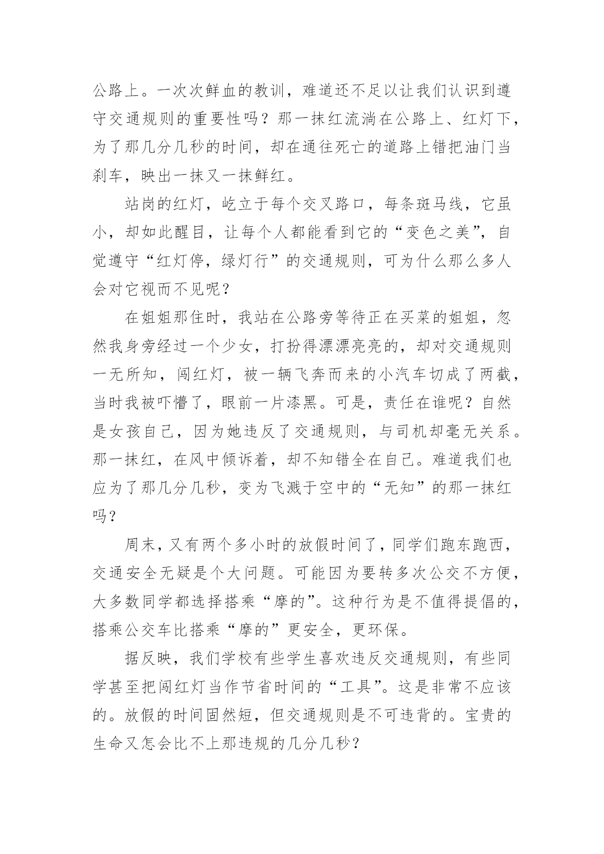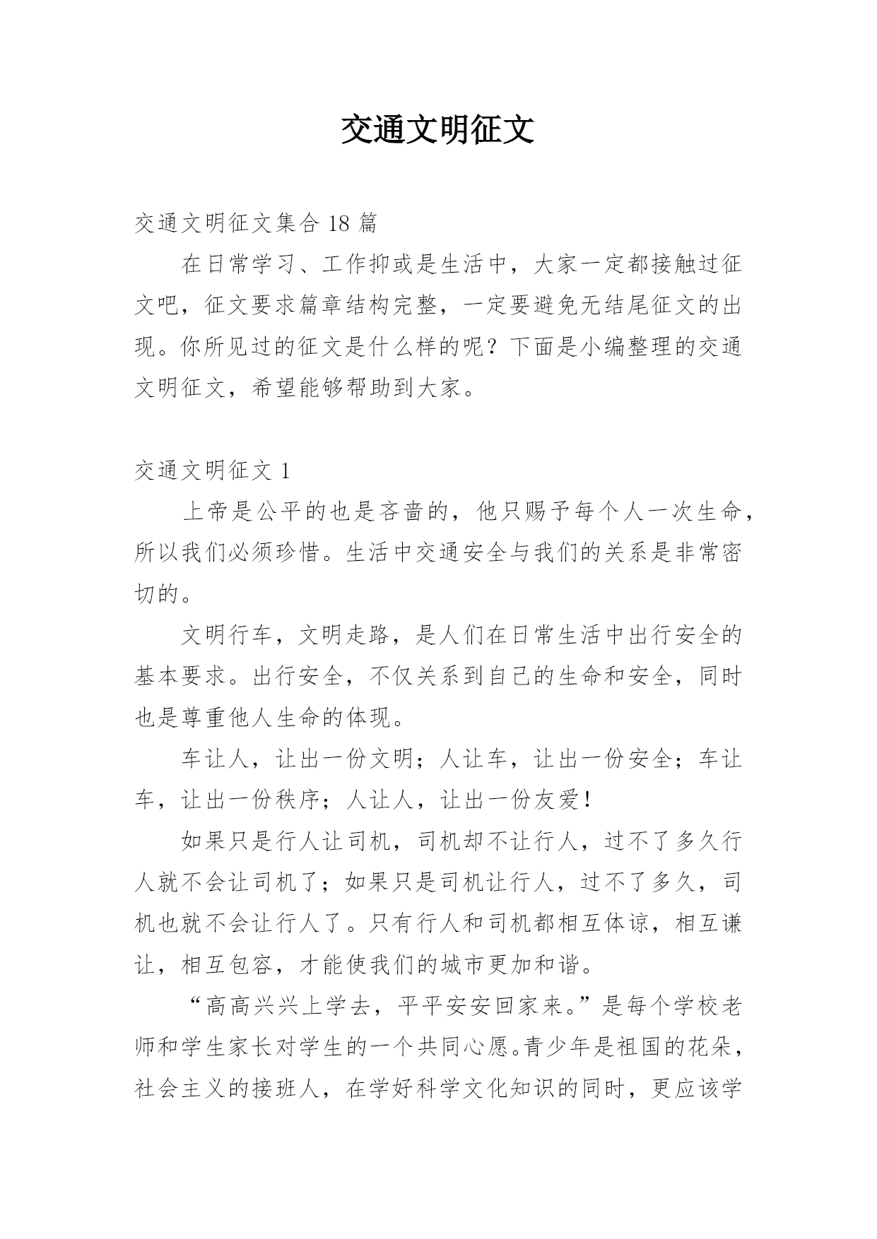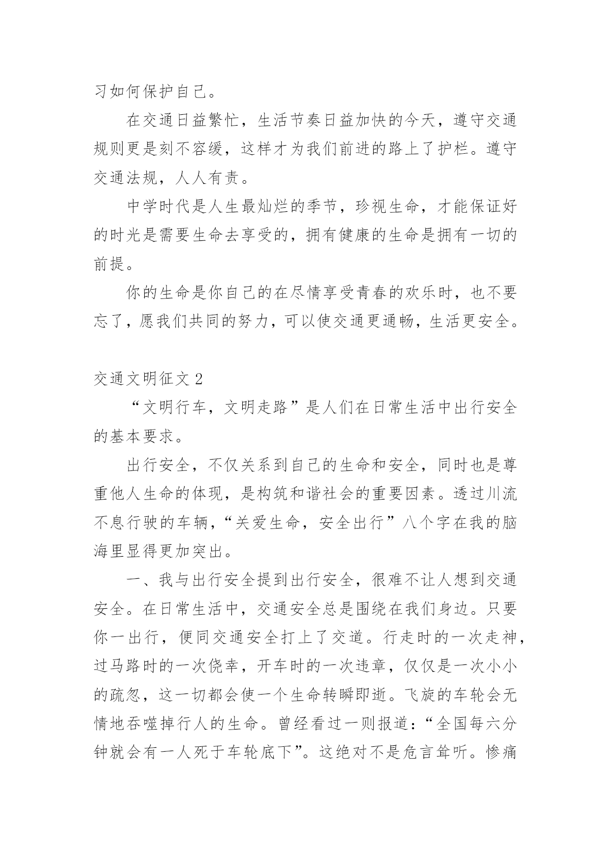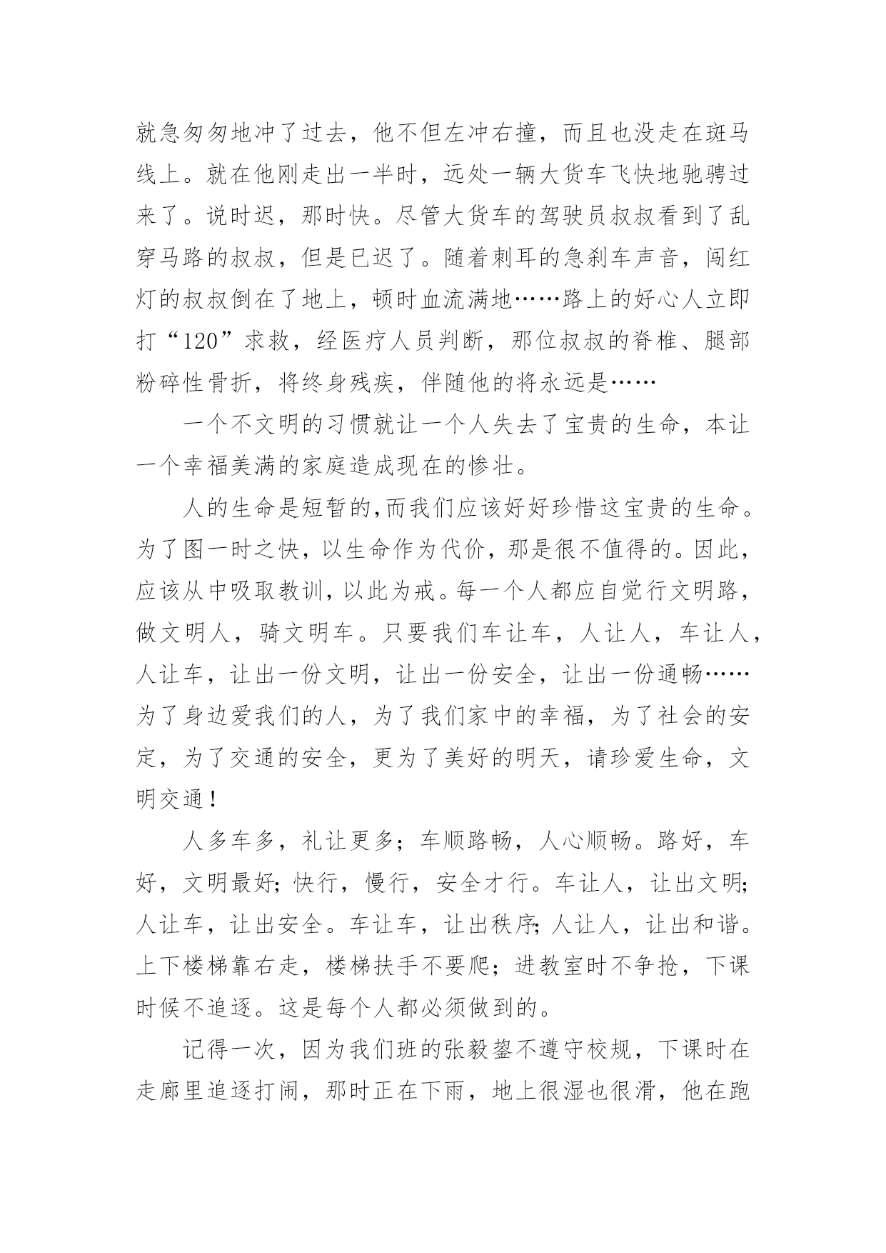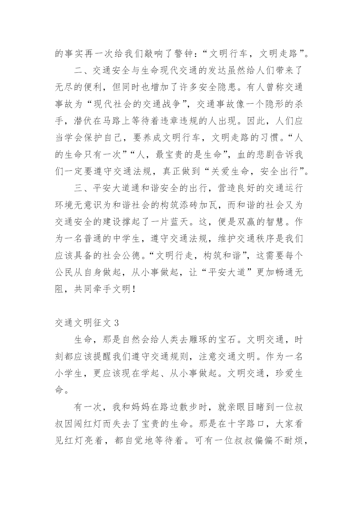 交通文明征文交通文明征文集合18篇在日常学习、工作抑或是生活中,大家一定都接触过征文吧,征文要求篇章结构完整,一定要避免无结尾征文的出现。你所见过的征文是什么样的呢?下面是小编整理的交通文明征文,希望能够帮助到大家。交通文明征文1上帝是公平的也是吝啬的,他只赐予每个人一次生命,所以我们必须珍惜。生活中交通安全与我们的关系是非常密切的。文明行车,文明走路,是人们在日常生活中出行安全的基本要求。出行安全,不仅关系到自己的生命和安全,同时也是尊重他人生命的体现。车让人,让出一份文明;人让车,让出一份安全;车让车,让出一份秩序;人让人,让出一份友爱!如果只是行人让司机,司机却不让行人,过不了多久行人就不会让司机了;如果只是司机让行人,过不了多久,司机也就不会让行人了。只有行人和司机都相互体谅,相互谦让,相互包容,才能使我们的城市更加和谐。“高高兴兴上学去,平平安安回家来。”是每个学校老师和学生家长对学生的一个共同心愿。青少年是祖国的花朵,社会主义的接班人,在学好科学文化知识的同时,更应该学习如何保护自己。在交通日益繁忙,生活节奏日益加快的今天,遵守交通规则更是刻不容缓,这样才为我们前进的路上了护栏。遵守交通法规,人人有责。中学时代是人生最灿烂的季节,珍视生命,才能保证好的时光是需要生命去享受的,拥有健康的生命是拥有一切的前提。你的生命是你自己的在尽情享受青春的欢乐时,也不要忘了,愿我们共同的努力,可以使交通更通畅,生活更安全。交通文明征文2“文明行车,文明走路”是人们在日常生活中出行安全的基本要求。出行安全,不仅关系到自己的生命和安全,同时也是尊重他人生命的体现,是构筑和谐社会的重要因素。透过川流不息行驶的车辆,“关爱生命,安全出行”八个字在我的脑海里显得更加突出。一、我与出行安全提到出行安全,很难不让人想到交通安全。在日常生活中,交通安全总是围绕在我们身边。只要你一出行,便同交通安全打上了交道。行走时的一次走神,过马路时的一次侥幸,开车时的一次违章,仅仅是一次小小的疏忽,这一切都会使一个生命转瞬即逝。飞旋的车轮会无情地吞噬掉行人的生命。曾经看过一则报道:“全国每六分钟就会有一人死于车轮底下”。这绝对不是危言耸听。惨痛的事实再一次给我们敲响了警钟:“文明行车,文明走路”。二、交通安全与生命现代交通的发达虽然给人们带来了无尽的便利,但同时也增加了许多安全隐患。有人曾称交通事故为“现代社会的交通战争”,交通事故像一个隐形的杀手,潜伏在马路上等待着违章违规的人出现。因此,人们应当学会保护自己,要养成文明行车,文明走路的习惯。“人的生命只有一次”“人,最宝贵的是生命”,血的悲剧告诉我们一定要遵守交通法规,真正做到“关爱生命,安全出行”。三、平安大道通和谐安全的出行,营造良好的交通运行环境无意识为和谐社会的构筑添砖加瓦,而和谐的社会又为交通安全的建设撑起了一片蓝天。这,便是双赢的智慧。作为一名普通的中学生,遵守交通法规,维护交通秩序是我们应该具备的社会公德。“文明行走,构筑和谐”,这需要每个公民从自身做起,从小事做起,让“平安大道”更加畅通无阻,共同牵手文明!交通文明征文3生命,那是自然会给人类去雕琢的宝石。文明交通,时刻都应该提醒我们遵守交通规则,注意交通文明。作为一名小学生,更应该现在学起、从小事做起。文明交通,珍爱生命。有一次,我和妈妈在路边散步时,就亲眼目睹到一位叔叔因闯红灯而失去了宝贵的生命。那是在十字路口,大家看见红灯亮着,都自觉地等待着。可有一位叔叔偏偏不耐烦,就急匆匆地冲了过去,他不但左冲右撞,而且也没走在斑马线上。就在他刚走出一半时,远处一辆大货车飞快地驰骋过来了。说时迟,那时快。尽管大货车的驾驶员叔叔看到了乱穿马路的叔叔,但是已迟了。随着刺耳的急刹车声音,闯红灯的叔叔倒在了地上,顿时血流满地……路上的好心人立即打“120”求救,经医疗人员判断,那位叔叔的脊椎、腿部粉碎性骨折,将终身残疾,伴随他的将永远是……一个不文明的习惯就让一个人失去了宝贵的生命,本让一个幸福美满的家庭造成现在的惨壮。人的生命是短暂的,而我们应该好好珍惜这宝贵的生命。为了图一时之快,以生命作为代价,那是很不值得的。因此,应该从中吸取教训,以此为戒。每一个人都应自觉行文明路,做文明人,骑文明车。只要我们车让车,人让人,车让人,人让车,让出一份文明,让出一份安全,让出一份通畅……为了身边爱我们的人,为了我们家中的幸福,为了社会的安定,为了交通的安全,更为了美好的明天,请珍爱生命,文明交通!人多车多,礼让更多;车顺路畅,人心顺畅。路好,车好,文明最好;快行,慢行,安全才行。车让人,让出文明;人让车,让出安全。车让车,让出秩序;人让人,让出和谐。上下楼梯靠右走,楼梯扶手不要爬;进教室时不争抢,下课时候不追逐。这是每个人都必须做到的。记得一次,因为我们班的张毅鋆