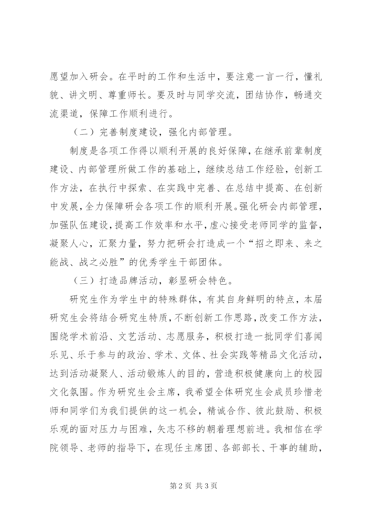 第PAGE\*Arabic\*MERGEFORMAT3页共NUMPAGES\*MERGEFORMAT3页研究生会主席发言稿尊敬的各位领导、老师,亲爱的同学们:大家好。我是会计学院2015级学硕1班的xxx,我很荣幸当选此届研会主席,在此发言,非常感谢院领导、老师以及在座的各位同学对我工作能力和工作成绩的肯定。首先,我谨代表6届研究生会全体成员向所有一直以来关心、信任、支持研会的老师,向所有研会的前辈们致以诚挚的感谢。面对新一届的研会,我很荣幸、也很忐忑,新一届的研究生会是承前启后一届,更是开拓创新的一届。在过去的一年中,和研会的学长学姐以及诸位同学共事学到了很多东西,经过了研一一年的成长和锻炼,现在工作角色的转变也将面临许多新的挑战。我们深知肩上的重任,在继承和发扬研会优良传统的同时,更要在原来的基础上搭建新的舞台,开创新的局面,努力使我们研会工作提升到一个新的水平,这对我们不仅仅是一种压力、更是一种动力。所以,我作为新一任研究生会主席,代表研会全体成员向大家作这一届的工作设想和决心:〈一〉工作定位研究生会是服务同学的群体性组织,具有严肃庄严性,不是一个凌驾于同学之上的组织机构,而是一个服务奉献的机构,要端正加入研会的动机,全体成员要本着为同学服务和锻炼自己的愿望加入研会。在平时的工作和生活中,要注意一言一行,懂礼貌、讲文明、尊重师长。要及时与同学交流,团结协作,畅通交流渠道,保障工作顺利进行。(二)完善制度建设,强化内部管理。制度是各项工作得以顺利开展的良好保障,在继承前辈制度建设、内部管理所做工作的基础上,继续总结工作经验,创新工作方法,在执行中探索、在实践中完善、在总结中提高、在创新中发展,全力保障研会各项工作的顺利开展。强化研会内部管理,加强队伍建设,提高工作效率和水平,虚心接受老师同学的监督,凝聚人心,汇聚力量,努力把研会打造成一个“招之即来、来之能战、战之必胜”的优秀学生干部团体。(三)打造品牌活动,彰显研会特色。研究生作为学生中的特殊群体,有其自身鲜明的特点,本届研究生会将结合研究生特质,不断创新工作思路,改变工作方法,围绕学术前沿、文艺活动、志愿服务,积极打造一批同学们喜闻乐见、乐于参与的政治、学术、文体、社会实践等精品文化活动,达到活动凝聚人、活动锻炼人的目的,营造积极健康向上的校园文化氛围。作为研究生会主席,我希望全体研究生会成员珍惜老师和同学们为我们提供的这一机会,精诚合作、彼此鼓励、积极乐观的面对压力与困难,矢志不移的朝着理想前进。我相信在学院领导、老师的指导下,在现任主席团、各部部长、干事的辅助,以及同学们的大力支持和自我努力下会使会计学院研究生会的工作将更上一层楼。谢谢大家。