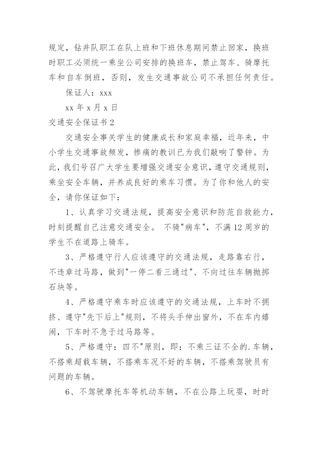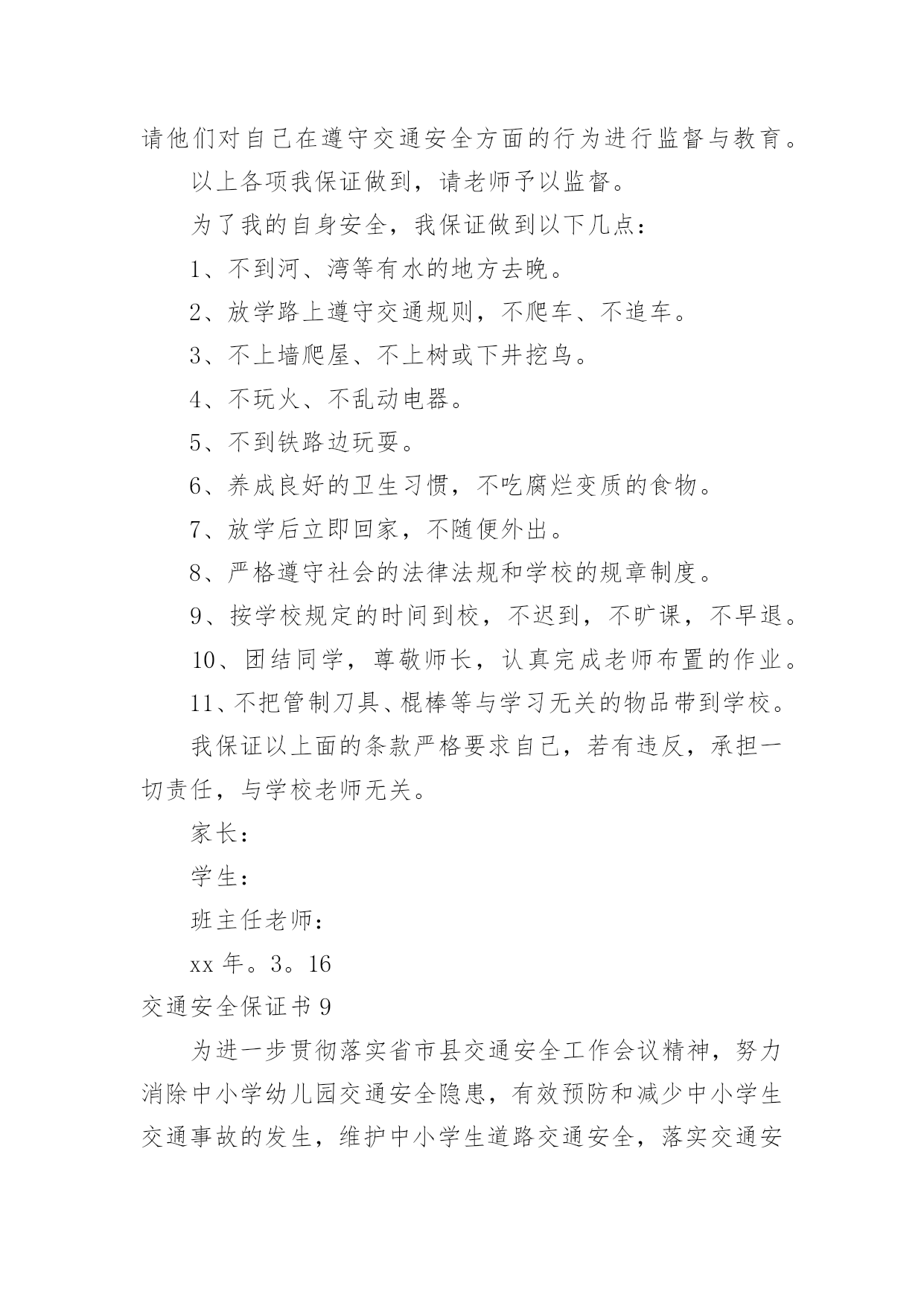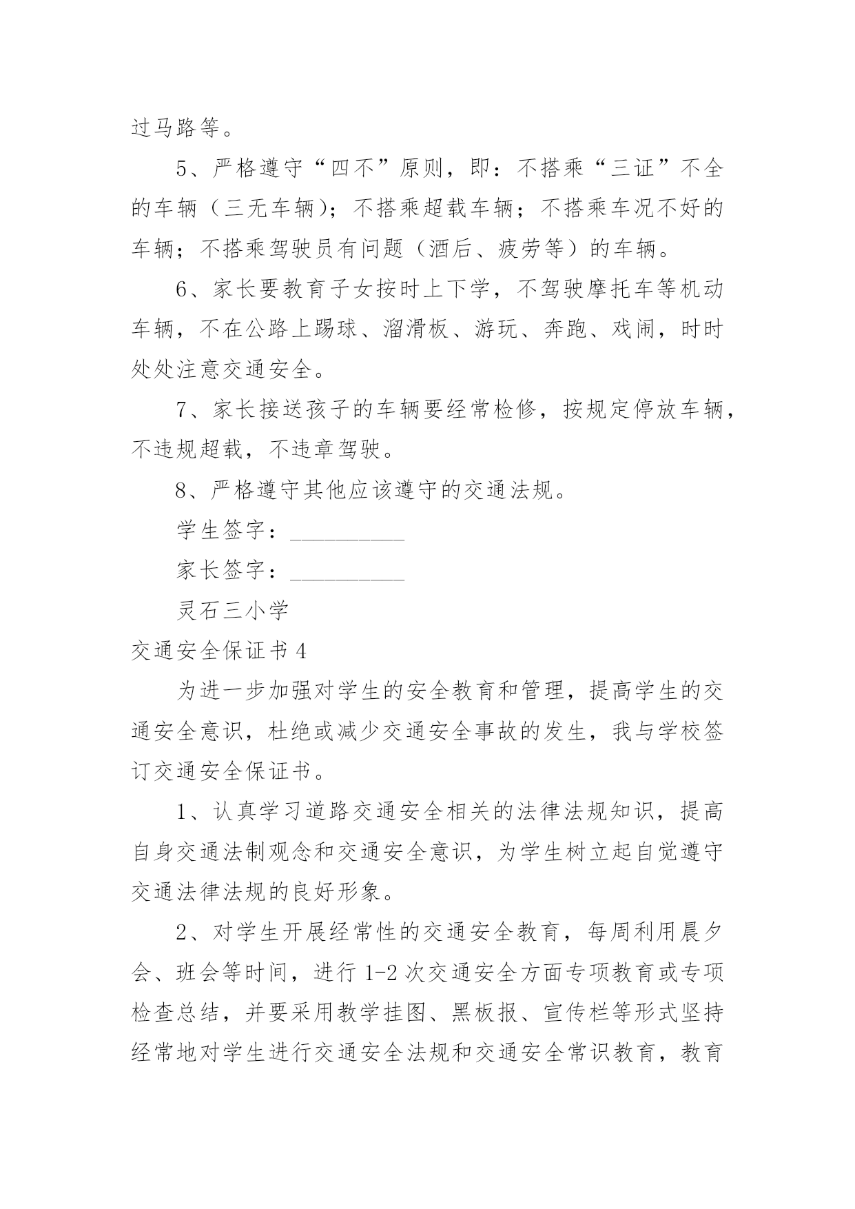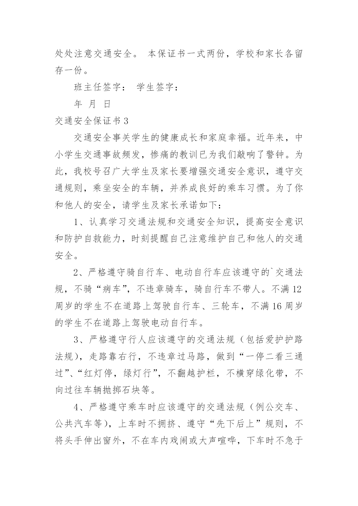 交通安全保证书交通安全保证书15篇在社会一步步向前发展的今天,保证书在我们的生活中并不鲜见,保证书的内容要写得切实、具体,要实事求是,说到做到,不能说过头话。那么大家知道标准正式的保证书格式吗?以下是小编精心整理的交通安全保证书,欢迎大家借鉴与参考,希望对大家有所帮助。交通安全保证书1一是公司对因工作需要外出办事的人员,实行统一派车制度,职工不得驾驶私有机动车办公事,不允许驾驶公车办私车,对违反规定者,发生交通事故由交通管理部门处理,公司不承担任何责任;二是公司专职驾驶员要认真学习《交通安全法》等法律法规。坚持出车前、行驶中、收车后的车辆检查,不开带病车,不酒后驾车,不无证驾车,不肇事逃逸,开文明车。自觉遵守单位的交通安全管理和日常管理;三是公司根据职工居住地区分布情况,配发了班车,因此,凡职工驾驶车辆、骑摩托车和自行车上下班者,属个人行为,如发生交通事故,公司不承担任何责任;四是根据钻二质安4号和钻二1号文《关于转发“关于禁止一线钻井职工在队期间回家的`通知”的通知》的文件规定,钻井队职工在队上班和下班休息期间禁止回家,换班时职工必须统一乘坐公司安排的换班车,禁止驾车、骑摩托车和自车倒班,否则,发生交通事故公司不承担任何责任。保证人:xxxxx年x月x日交通安全保证书2交通安全事关学生的健康成长和家庭幸福,近年来,中小学生交通事故频发,惨痛的教训已为我们敲响了警钟。为此,我们号召广大学生要增强交通安全意识,遵守交通规则,乘坐安全车辆,并养成良好的乘车习惯。为了你和他人的安全,请你保证如下:1、认真学习交通法规,提高安全意识和防范自救能力,时刻提醒自己注意交通安全。不骑"病车",不满12周岁的学生不在道路上骑车。3、严格遵守行人应该遵守的交通法规,走路靠右行,不违章过马路,做到"一停二看三通过"、不向过往车辆抛掷石块等。4、严格遵守乘车时应该遵守的交通法规,上车时不拥挤、遵守"先下后上"规则,不将头手伸出窗外,不在车内嬉闹,下车时不急于过马路等。5、严格遵守:四不"原则,即:不乘三证不全的.车辆,不搭乘超载车辆,不搭乘车况不好的车辆,不搭乘驾驶员有问题的车辆。6、不驾驶摩托车等机动车辆,不在公路上玩耍,时时处处注意交通安全。本保证书一式两份,学校和家长各留存一份。班主任签字:学生签字:年月日交通安全保证书3交通安全事关学生的健康成长和家庭幸福。近年来,中小学生交通事故频发,惨痛的教训已为我们敲响了警钟。为此,我校号召广大学生及家长要增强交通安全意识,遵守交通规则,乘坐安全的车辆,并养成良好的乘车习惯。为了你和他人的安全,请学生及家长承诺如下:1、认真学习交通法规和交通安全知识,提高安全意识和防护自救能力,时刻提醒自己注意维护自己和他人的交通安全。2、严格遵守骑自行车、电动自行车应该遵守的`交通法规,不骑“病车”,不违章骑车,骑自行车不带人。不满12周岁的学生不在道路上驾驶自行车、三轮车,不满16周岁的学生不在道路上驾驶电动自行车。3、严格遵守行人应该遵守的交通法规(包括爱护护路法规),走路靠右行,不违章过马路,做到“一停二看三通过”、“红灯停,绿灯行”,不翻越护栏,不横穿绿化带,不向过往车辆抛掷石块等。4、严格遵守乘车时应该遵守的交通法规(例公交车、公共汽车等),上车时不拥挤、遵守“先下后上”规则,不将头手伸出窗外,不在车内戏闹或大声喧哗,下车时不急于过马路等。5、严格遵守“四不”原则,即:不搭乘“三证”不全的车辆(三无车辆);不搭乘超载车辆;不搭乘车况不好的车辆;不搭乘驾驶员有问题(酒后、疲劳等)的车辆。6、家长要教育子女按时上下学,不驾驶摩托车等机动车辆,不在公路上踢球、溜滑板、游玩、奔跑、戏闹,时时处处注意交通安全。7、家长接送孩子的车辆要经常检修,按规定停放车辆,不违规超载,不违章驾驶。8、严格遵守其他应该遵守的交通法规。学生签字:__________家长签字:__________灵石三小学交通安全保证书4为进一步加强对学生的安全教育和管理,提高学生的交通安全意识,杜绝或减少交通安全事故的发生,我与学校签订交通安全保证书。1、认真学习道路交通安全相关的法律法规知识,提高自身交通法制观念和交通安全意识,为学生树立起自觉遵守交通法律法规的良好形象。2、对学生开展经常性的交通安全教育,每周利用晨夕会、班会等时间,进行1-2次交通安全方面专项教育或专项检查总结,并要采用教学挂图、黑板报、宣传栏等形式坚持经常地对学生进行交通安全法规和交通安全常识教育,教育学生文明行路,主动防范交通安全事故,自觉拒绝乘坐农用车、报废车、拖拉机及无牌无证无运营手续和超载车辆。3、利用家长会等有利时机,搞好对学生家长的交通安全宣传教育,同时请家长配合做好学生的.交通安全教育。4、严格执行路队值班制度,在学生上学和放学时坚持值勤,疏导交通,监督引导
