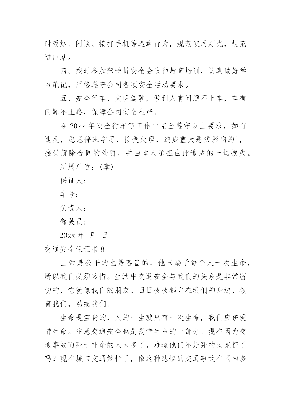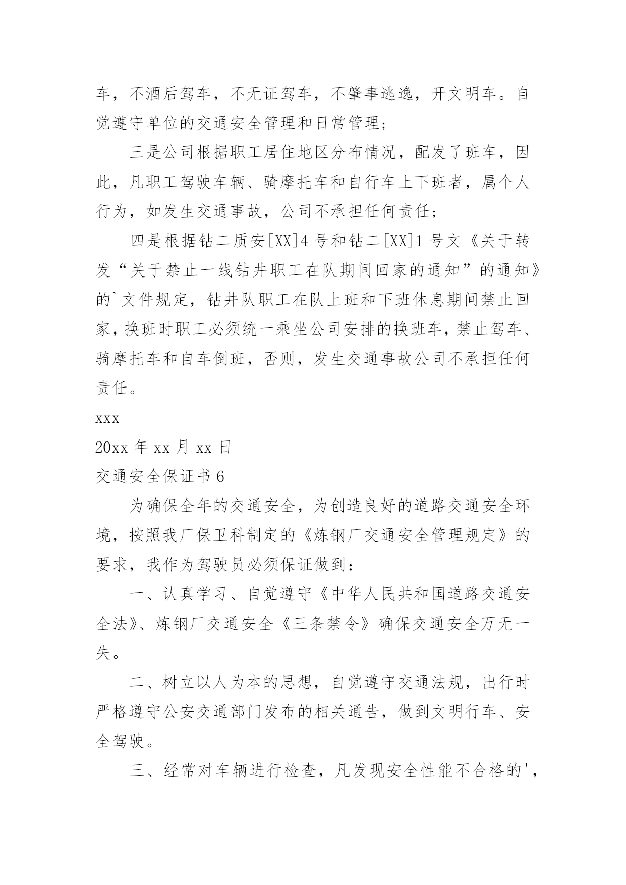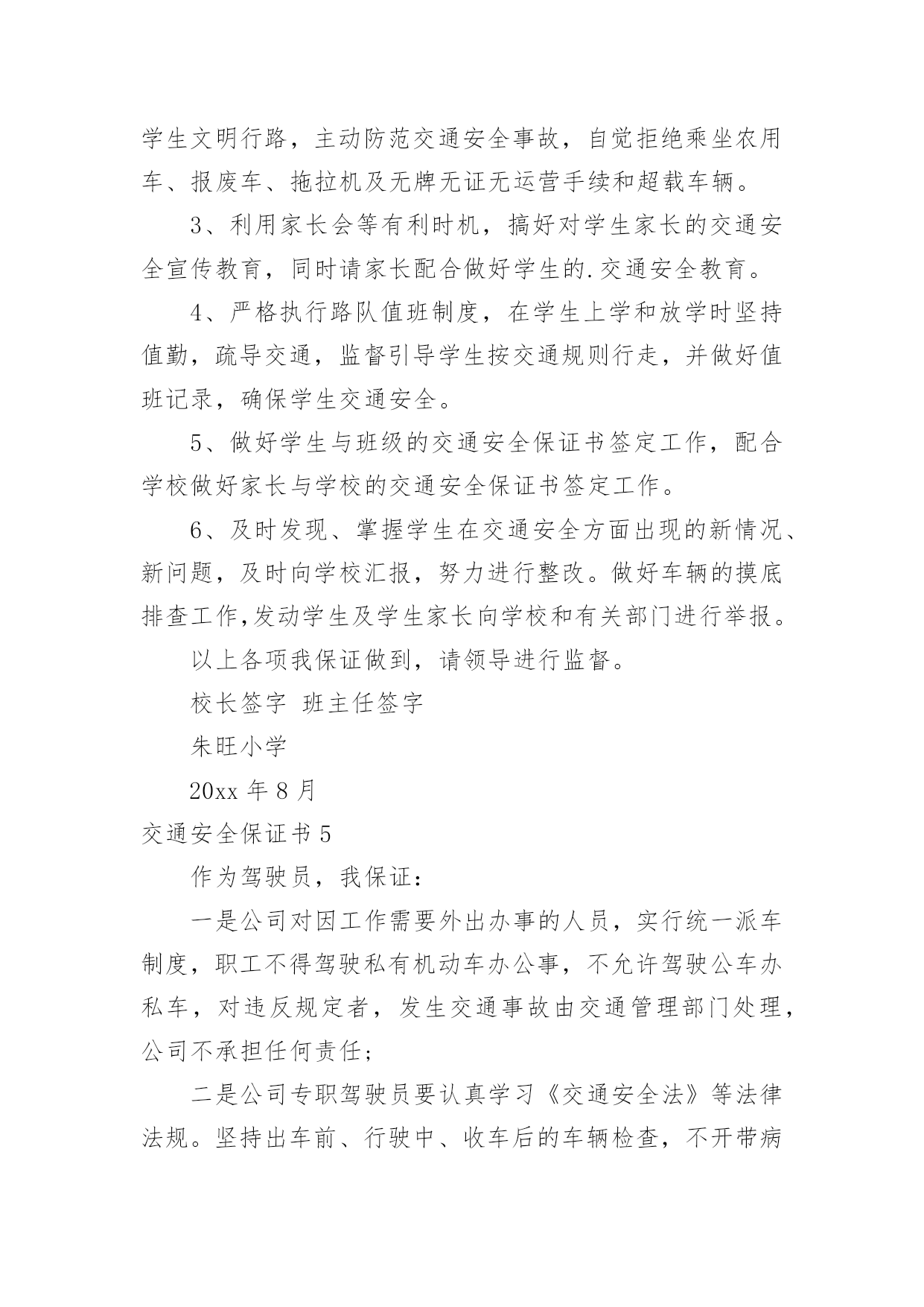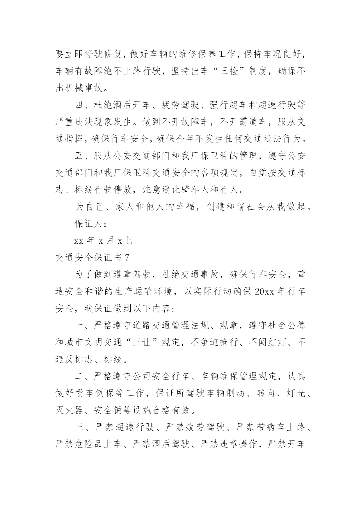 交通安全保证书交通安全保证书15篇在社会一步步向前发展的今天,保证书在我们的生活中并不鲜见,保证书的内容要写得切实、具体,要实事求是,说到做到,不能说过头话。那么大家知道标准正式的保证书格式吗?以下是小编精心整理的交通安全保证书,欢迎大家借鉴与参考,希望对大家有所帮助。交通安全保证书1一是公司对因工作需要外出办事的人员,实行统一派车制度,职工不得驾驶私有机动车办公事,不允许驾驶公车办私车,对违反规定者,发生交通事故由交通管理部门处理,公司不承担任何责任;二是公司专职驾驶员要认真学习《交通安全法》等法律法规。坚持出车前、行驶中、收车后的车辆检查,不开带病车,不酒后驾车,不无证驾车,不肇事逃逸,开文明车。自觉遵守单位的交通安全管理和日常管理;三是公司根据职工居住地区分布情况,配发了班车,因此,凡职工驾驶车辆、骑摩托车和自行车上下班者,属个人行为,如发生交通事故,公司不承担任何责任;四是根据钻二质安4号和钻二1号文《关于转发“关于禁止一线钻井职工在队期间回家的`通知”的通知》的文件规定,钻井队职工在队上班和下班休息期间禁止回家,换班时职工必须统一乘坐公司安排的换班车,禁止驾车、骑摩托车和自车倒班,否则,发生交通事故公司不承担任何责任。保证人:xxxxx年x月x日交通安全保证书2交通安全事关学生的健康成长和家庭幸福,近年来,中小学生交通事故频发,惨痛的教训已为我们敲响了警钟。为此,我们号召广大学生要增强交通安全意识,遵守交通规则,乘坐安全车辆,并养成良好的乘车习惯。为了你和他人的安全,请你保证如下:1、认真学习交通法规,提高安全意识和防范自救能力,时刻提醒自己注意交通安全。不骑"病车",不满12周岁的学生不在道路上骑车。3、严格遵守行人应该遵守的交通法规,走路靠右行,不违章过马路,做到"一停二看三通过"、不向过往车辆抛掷石块等。4、严格遵守乘车时应该遵守的交通法规,上车时不拥挤、遵守"先下后上"规则,不将头手伸出窗外,不在车内嬉闹,下车时不急于过马路等。5、严格遵守:四不"原则,即:不乘三证不全的.车辆,不搭乘超载车辆,不搭乘车况不好的车辆,不搭乘驾驶员有问题的车辆。6、不驾驶摩托车等机动车辆,不在公路上玩耍,时时处处注意交通安全。本保证书一式两份,学校和家长各留存一份。班主任签字:学生签字:年月日交通安全保证书3交通安全事关学生的健康成长和家庭幸福。近年来,中小学生交通事故频发,惨痛的教训已为我们敲响了警钟。为此,我校号召广大学生及家长要增强交通安全意识,遵守交通规则,乘坐安全的车辆,并养成良好的乘车习惯。为了你和他人的安全,请学生及家长承诺如下:1、认真学习交通法规和交通安全知识,提高安全意识和防护自救能力,时刻提醒自己注意维护自己和他人的交通安全。2、严格遵守骑自行车、电动自行车应该遵守的`交通法规,不骑“病车”,不违章骑车,骑自行车不带人。不满12周岁的学生不在道路上驾驶自行车、三轮车,不满16周岁的学生不在道路上驾驶电动自行车。3、严格遵守行人应该遵守的交通法规(包括爱护护路法规),走路靠右行,不违章过马路,做到“一停二看三通过”、“红灯停,绿灯行”,不翻越护栏,不横穿绿化带,不向过往车辆抛掷石块等。4、严格遵守乘车时应该遵守的交通法规(例公交车、公共汽车等),上车时不拥挤、遵守“先下后上”规则,不将头手伸出窗外,不在车内戏闹或大声喧哗,下车时不急于过马路等。5、严格遵守“四不”原则,即:不搭乘“三证”不全的车辆(三无车辆);不搭乘超载车辆;不搭乘车况不好的车辆;不搭乘驾驶员有问题(酒后、疲劳等)的车辆。6、家长要教育子女按时上下学,不驾驶摩托车等机动车辆,不在公路上踢球、溜滑板、游玩、奔跑、戏闹,时时处处注意交通安全。7、家长接送孩子的车辆要经常检修,按规定停放车辆,不违规超载,不违章驾驶。8、严格遵守其他应该遵守的交通法规。学生签字:__________家长签字:__________灵石三小学交通安全保证书4为进一步加强对学生的安全教育和管理,提高学生的交通安全意识,杜绝或减少交通安全事故的发生,我与学校签订交通安全保证书。1、认真学习道路交通安全相关的法律法规知识,提高自身交通法制观念和交通安全意识,为学生树立起自觉遵守交通法律法规的良好形象。2、对学生开展经常性的交通安全教育,每周利用晨夕会、班会等时间,进行1-2次交通安全方面专项教育或专项检查总结,并要采用教学挂图、黑板报、宣传栏等形式坚持经常地对学生进行交通安全法规和交通安全常识教育,教育学生文明行路,主动防范交通安全事故,自觉拒绝乘坐农用车、报废车、拖拉机及无牌无证无运营手续和超载车辆。3、利用家长会等有利时机,搞好对学生家长的交通安全宣传教育,同时请家长配合做好学生的.交通安全教育。4、严格执行路队值班制度,在学生上学和放学时坚持值勤,疏导交通,监督引导
