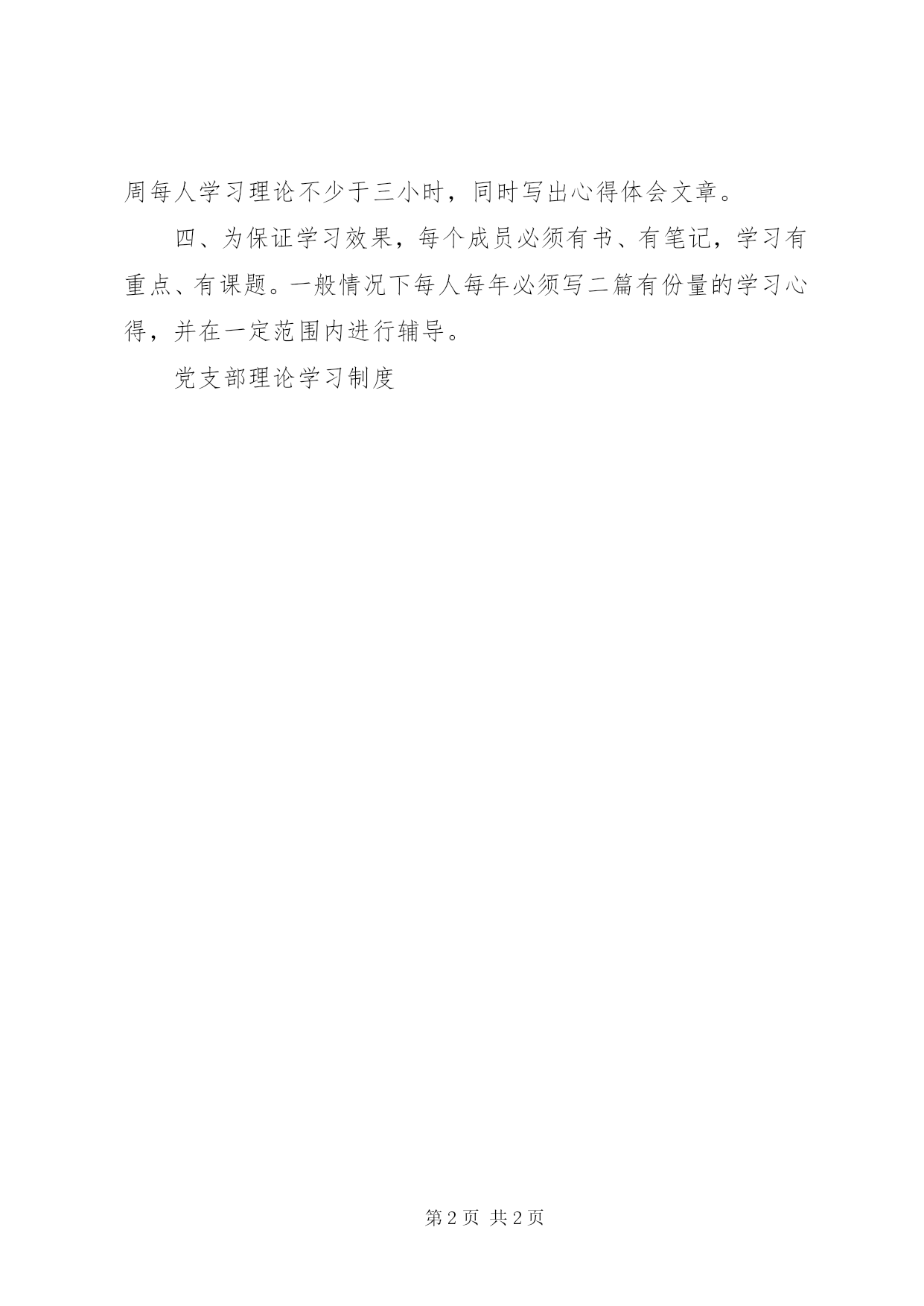 第PAGE\*Arabic\*MERGEFORMAT2页共NUMPAGES\*MERGEFORMAT2页党支部理论学习制度为贯彻落实总、分行、中心支行党组关于规范中国人民银行系统各级党组(党支部)中心组理论学习活动,结合我社实际情况,特制定本制度。一、为推动领导干部、职工的理论学习,成立理论学习中心组,由副主任以上干部组成,党支部书记为学习组组长,副主任级以上干部为成员。学习组组长负责审定学习计划、时间和内容,并督促检查本组成员的学习情况;党建干事担任学习秘书,负责拟定学习计划、学习内容、提供资料,做好学习记录和考勤,负责起草学习的书面材料和总结。二、学习组全体成员要自觉地学习马列主义、毛泽东思想及邓小平理论,特别是带头学好****同志的“三个代表”重要思想、“十六届三中全会”精神和当前党和国家方针政策以及央行职能转换后金融工作的方针政策和信用社的规章制度,还要学习现代经济金融、科学技术、法律和历史等方面的知识,坚持理论联系实际,在学习中解决一些具体工作问题。三、学习组的学习采取集中学和个人自学相结合,以自学为主;学原著与学习辅导材料相结合,以学原著为主;学习理论和解决问题相结合,以解决问题为主。每年年初,确定学习组的主要学习内容和任务,每月由组长集中组织学习一天时间,其余每周每人学习理论不少于三小时,同时写出心得体会文章。四、为保证学习效果,每个成员必须有书、有笔记,学习有重点、有课题。一般情况下每人每年必须写二篇有份量的学习心得,并在一定范围内进行辅导。党支部理论学习制度