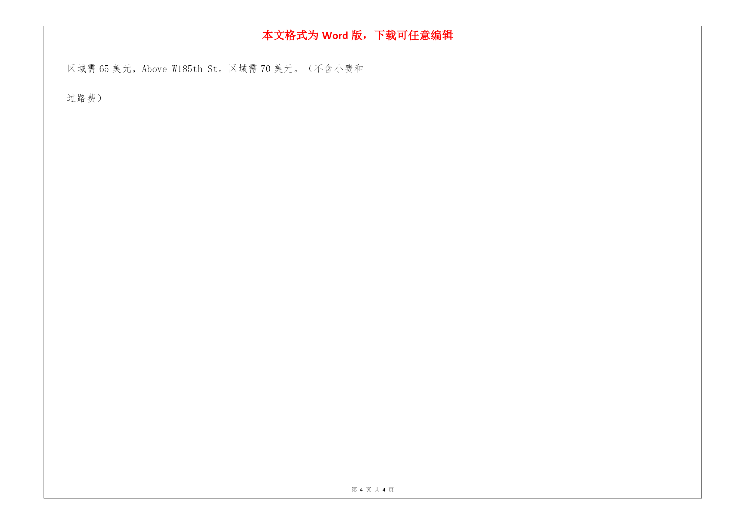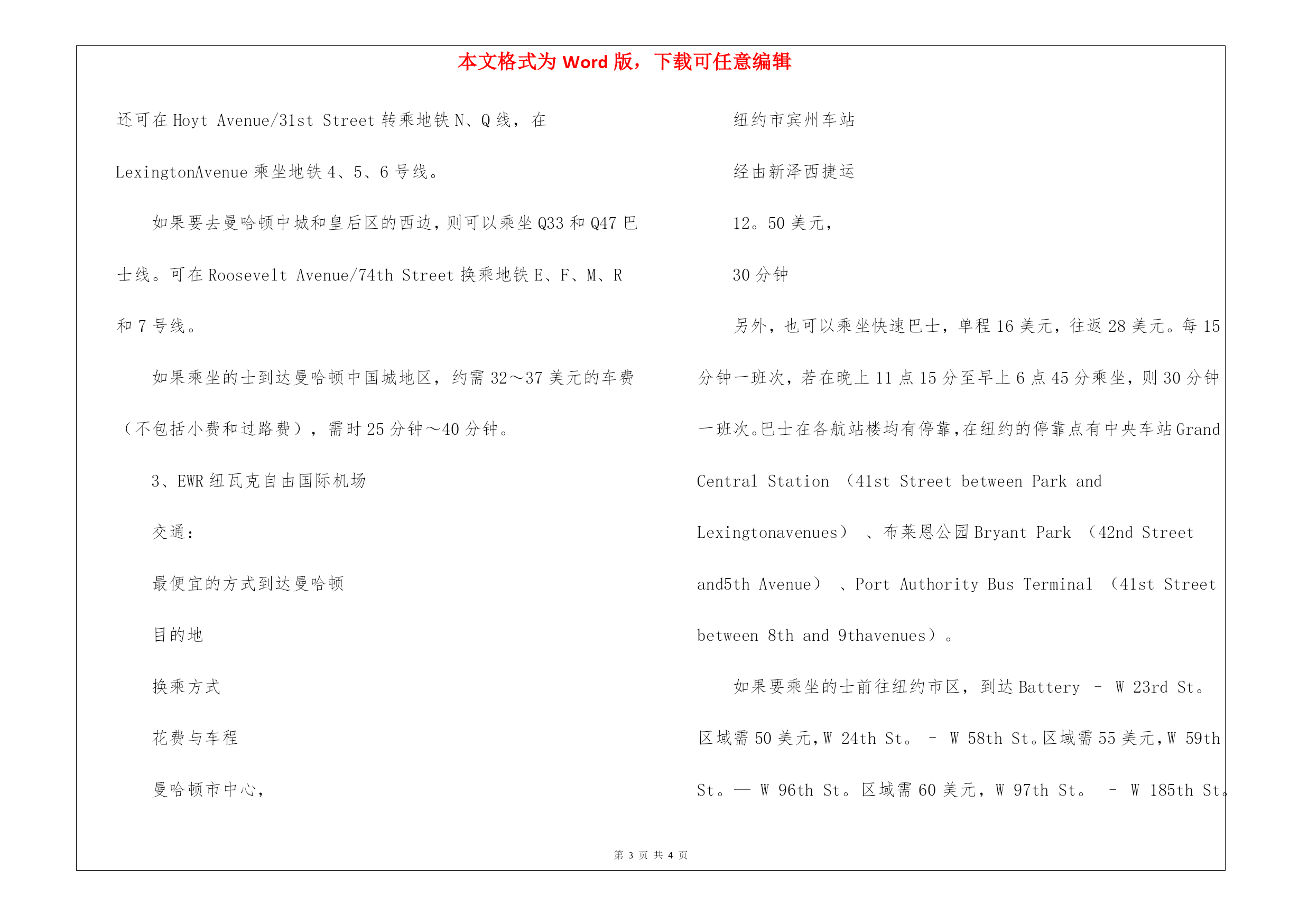 本文格式为Word版,下载可任意编辑第PAGE\*MERGEFORMAT4页共NUMPAGES\*MERGEFORMAT4页纽约机场到市区的交通攻略纽约机场到市区的交通攻略1、JFK肯尼迪国际机场交通:最便宜的方式到达曼哈顿(通过乘坐机场火车和纽约地铁)目的地换乘方式花费与车程曼哈顿中城MidtownManhattanNewYorkPennStationW。34St。MTANYCTransitESubwayatJamaicaStation7。50美元,50分钟曼哈顿下城LowerManhattanbelowW。14St。MTANYCTransitASubwayatHowardBeachStation7。50美元,60分钟曼哈顿上城UpperManhattanW。125St。MTANYCTransitESubwayatJamaicaStation。InManhattantransfertoasubwayorbusforfinaldestination。7。50美元,75分钟皇后区南,布鲁克林区北部SouthernQueens,NorthernBrooklynMTANYCTransitJorZSubwayatJamaicaStation7。50美元,50分钟以上费用包括5美元机场火车和2。5美元地铁费用。曼哈顿中国城位于曼哈顿下城区域,使用以上方式到达,则从机场到目的`地需1个多小时的车程。如果想更快速地到达曼哈顿,可乘坐机场火车,再转乘LIRR长岛铁路。目的地换乘方式花费与车程ManhattanWestside(PennStation)QueensLongIslandRailRoadatJamaicaStation15。50美元,35分钟另外,也可以乘坐机场巴士。巴士停靠在5号航站楼,共有3条,车费为2。75美元(若有交通卡则为2。50美元)。三条巴士线分别是:Q10:到达皇后区。可转乘地铁A线的LeffertsBlvd地铁站和E线、F线的KewGardens地铁站。Q3:到达皇后区。可在169thSt。andHillsideAve。乘坐地铁F线。B15:到达纽约东部。可在NewLotsandLivoniaAves乘坐地铁3号线和4号线。如果乘坐的士到达曼哈顿地区的话,约需52美元的车费(不包括小费和过路费),需时35分钟至50分钟。2、LGA拉瓜迪亚机场交通:可乘坐机场巴士出入机场,机场提供了往来曼哈顿区和皇后区的巴士服务。乘坐M60巴士线到达曼哈顿125号街和百老汇,到达皇后区之后还可在HoytAvenue/31stStreet转乘地铁N、Q线,在LexingtonAvenue乘坐地铁4、5、6号线。如果要去曼哈顿中城和皇后区的西边,则可以乘坐Q33和Q47巴士线。可在RooseveltAvenue/74thStreet换乘地铁E、F、M、R和7号线。如果乘坐的士到达曼哈顿中国城地区,约需32~37美元的车费(不包括小费和过路费),需时25分钟~40分钟。3、EWR纽瓦克自由国际机场交通:最便宜的方式到达曼哈顿目的地换乘方式花费与车程曼哈顿市中心,纽约市宾州车站经由新泽西捷运12。50美元,30分钟另外,也可以乘坐快速巴士,单程16美元,往返28美元。每15分钟一班次,若在晚上11点15分至早上6点45分乘坐,则30分钟一班次。巴士在各航站楼均有停靠,在纽约的停靠点有中央车站GrandCentralStation(41stStreetbetweenParkandLexingtonavenues)、布莱恩公园BryantPark(42ndStreetand5thAvenue)、PortAuthorityBusTerminal(41stStreetbetween8thand9thavenues)。如果要乘坐的士前往纽约市区,到达Battery–W23rdSt。区域需50美元,W24thSt。–W58thSt。区域需55美元,W59thSt。—W96thSt。区域需60美元,W97thSt。–W185thSt。区域需65美元,AboveW185thSt。区域需70美元。(不含小费和过路费)