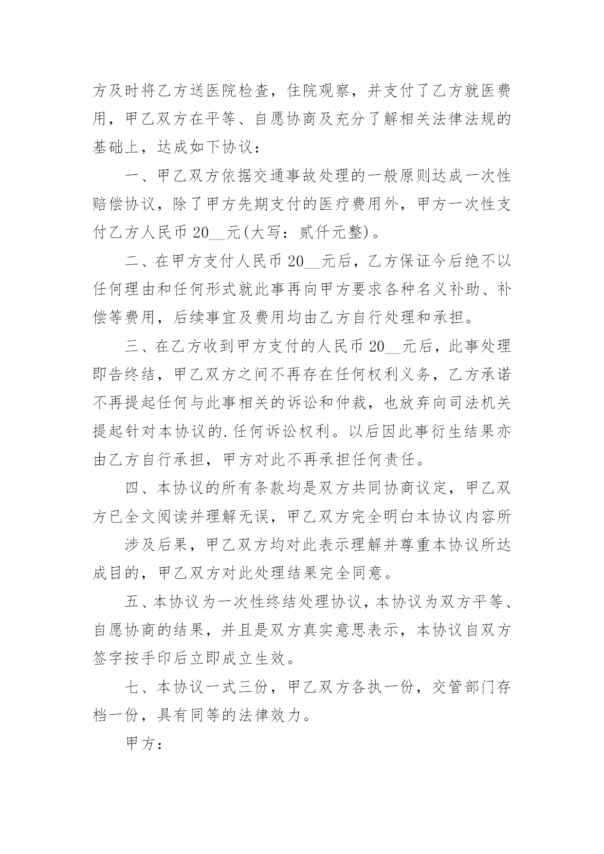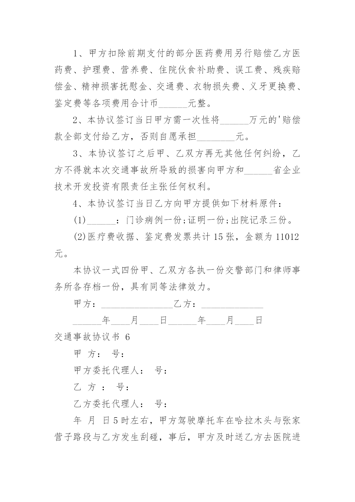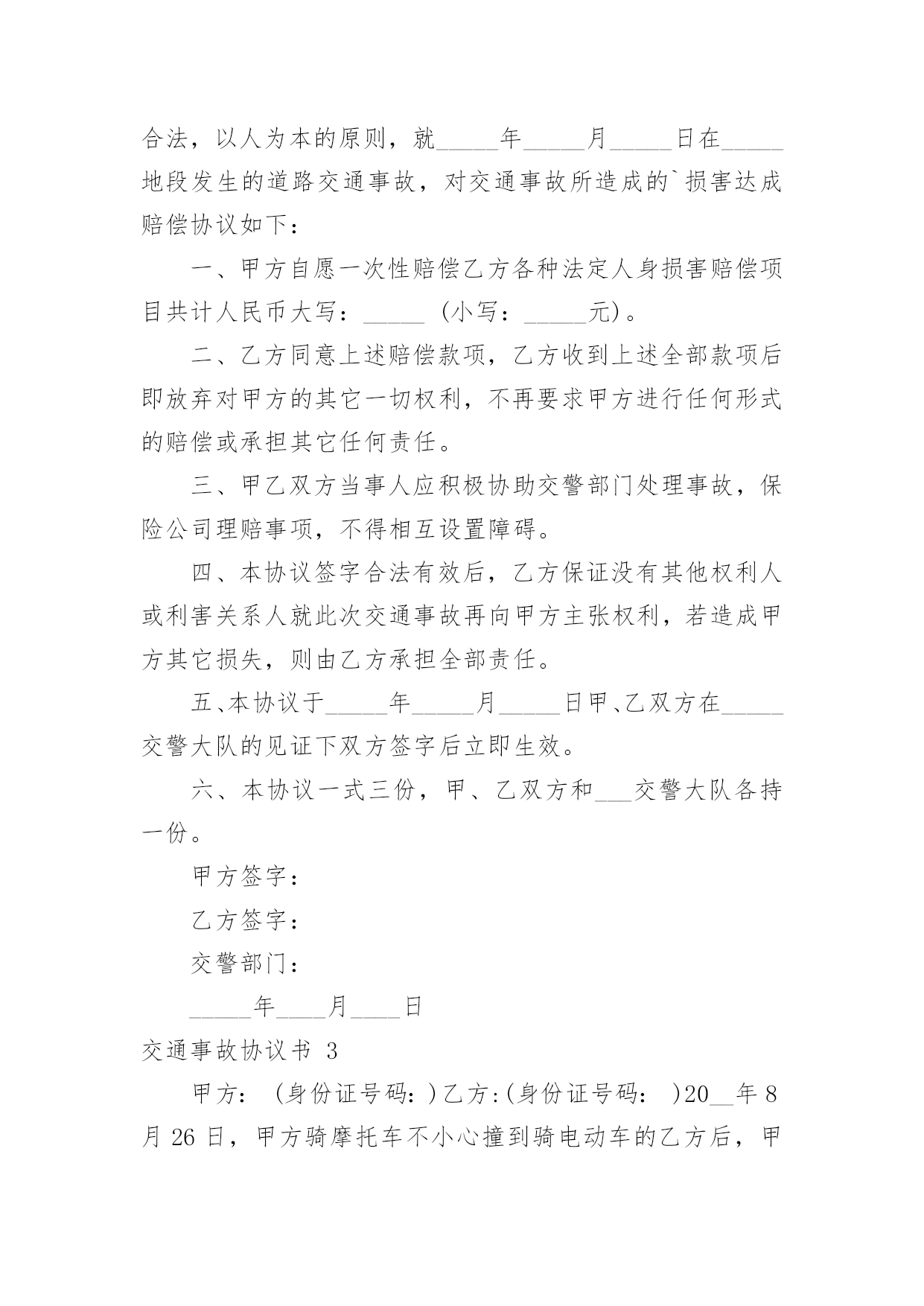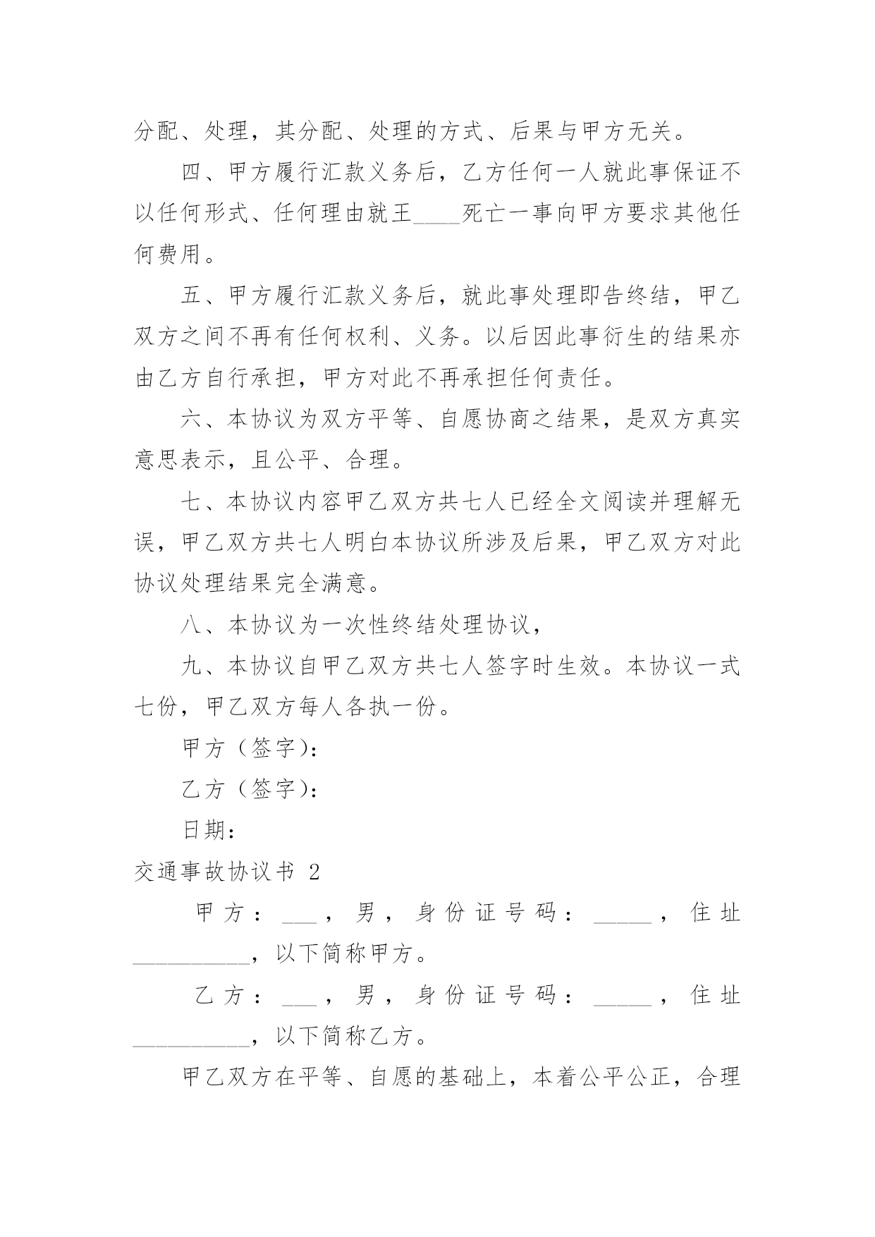 交通事故协议书交通事故协议书15篇在生活中,协议使用的频率越来越高,签订签订协议可以使事务的结果更加完美化。那么你真正懂得怎么写好协议吗?以下是小编收集整理的交通事故协议书,欢迎大家借鉴与参考,希望对大家有所帮助。交通事故协议书1甲方:乙方:20____年9月4日14时30分,于____驾驶小客车(内乘王____、王__)由西向东行至北京市____区____与____国道交叉口西1.5公里处时,车辆驶入路北侧与路树相撞,造成王____抢救无效死亡。现于____(甲方)与王____的六名近亲属(乙方)就王____死亡赔偿事宜,本着平等、自愿、公平原则,经友好协商,达成如下死亡赔偿协议书:一、甲方一次性支付给乙方六人死亡赔偿金、被扶养人生活费等共计贰拾贰万元(未包括丧葬费,丧葬费壹万五仟元已经在本协议签定前由梁____支付给了王____的哥哥王____)。二、甲方将上述贰拾贰万元于本协议签订后日内汇入乙方六人共同指定的'银行帐号。帐号为:三、上述费用支付给乙方六人后,由乙方六人内部自行分配、处理,其分配、处理的方式、后果与甲方无关。四、甲方履行汇款义务后,乙方任何一人就此事保证不以任何形式、任何理由就王____死亡一事向甲方要求其他任何费用。五、甲方履行汇款义务后,就此事处理即告终结,甲乙双方之间不再有任何权利、义务。以后因此事衍生的结果亦由乙方自行承担,甲方对此不再承担任何责任。六、本协议为双方平等、自愿协商之结果,是双方真实意思表示,且公平、合理。七、本协议内容甲乙双方共七人已经全文阅读并理解无误,甲乙双方共七人明白本协议所涉及后果,甲乙双方对此协议处理结果完全满意。八、本协议为一次性终结处理协议,九、本协议自甲乙双方共七人签字时生效。本协议一式七份,甲乙双方每人各执一份。甲方(签字):乙方(签字):日期:交通事故协议书2甲方:___,男,身份证号码:_____,住址__________,以下简称甲方。乙方:___,男,身份证号码:_____,住址__________,以下简称乙方。甲乙双方在平等、自愿的基础上,本着公平公正,合理合法,以人为本的原则,就_____年_____月_____日在_____地段发生的道路交通事故,对交通事故所造成的`损害达成赔偿协议如下:一、甲方自愿一次性赔偿乙方各种法定人身损害赔偿项目共计人民币大写:_____(小写:_____元)。二、乙方同意上述赔偿款项,乙方收到上述全部款项后即放弃对甲方的其它一切权利,不再要求甲方进行任何形式的赔偿或承担其它任何责任。三、甲乙双方当事人应积极协助交警部门处理事故,保险公司理赔事项,不得相互设置障碍。四、本协议签字合法有效后,乙方保证没有其他权利人或利害关系人就此次交通事故再向甲方主张权利,若造成甲方其它损失,则由乙方承担全部责任。五、本协议于_____年_____月_____日甲、乙双方在_____交警大队的见证下双方签字后立即生效。六、本协议一式三份,甲、乙双方和___交警大队各持一份。甲方签字:乙方签字:交警部门:_____年____月____日交通事故协议书3甲方:(身份证号码:)乙方:(身份证号码:)20__年8月26日,甲方骑摩托车不小心撞到骑电动车的乙方后,甲方及时将乙方送医院检查,住院观察,并支付了乙方就医费用,甲乙双方在平等、自愿协商及充分了解相关法律法规的基础上,达成如下协议:一、甲乙双方依据交通事故处理的一般原则达成一次性赔偿协议,除了甲方先期支付的医疗费用外,甲方一次性支付乙方人民币20__元(大写:贰仟元整)。二、在甲方支付人民币20__元后,乙方保证今后绝不以任何理由和任何形式就此事再向甲方要求各种名义补助、补偿等费用,后续事宜及费用均由乙方自行处理和承担。三、在乙方收到甲方支付的人民币20__元后,此事处理即告终结,甲乙双方之间不再存在任何权利义务,乙方承诺不再提起任何与此事相关的诉讼和仲裁,也放弃向司法机关提起针对本协议的.任何诉讼权利。以后因此事衍生结果亦由乙方自行承担,甲方对此不再承担任何责任。四、本协议的所有条款均是双方共同协商议定,甲乙双方已全文阅读并理解无误,甲乙双方完全明白本协议内容所涉及后果,甲乙双方均对此表示理解并尊重本协议所达成目的,甲乙双方对此处理结果完全同意。五、本协议为一次性终结处理协议,本协议为双方平等、自愿协商的结果,并且是双方真实意思表示,本协议自双方签字按手印后立即成立生效。七、本协议一式三份,甲乙双方各执一份,交管部门存档一份,具有同等的法律效力。甲方:乙方:签字时间:年月日交通事故协议书4交通事故死亡赔偿协议书范本甲方:乙方:(以上均写明、姓名、性别、出生年月日、民族、职业、住址、电话)年月日时分,于xx驾驶小客车(内乘王XX、王x)由西向东行至xxxx市xx区xx与xx国道交叉口西xxx