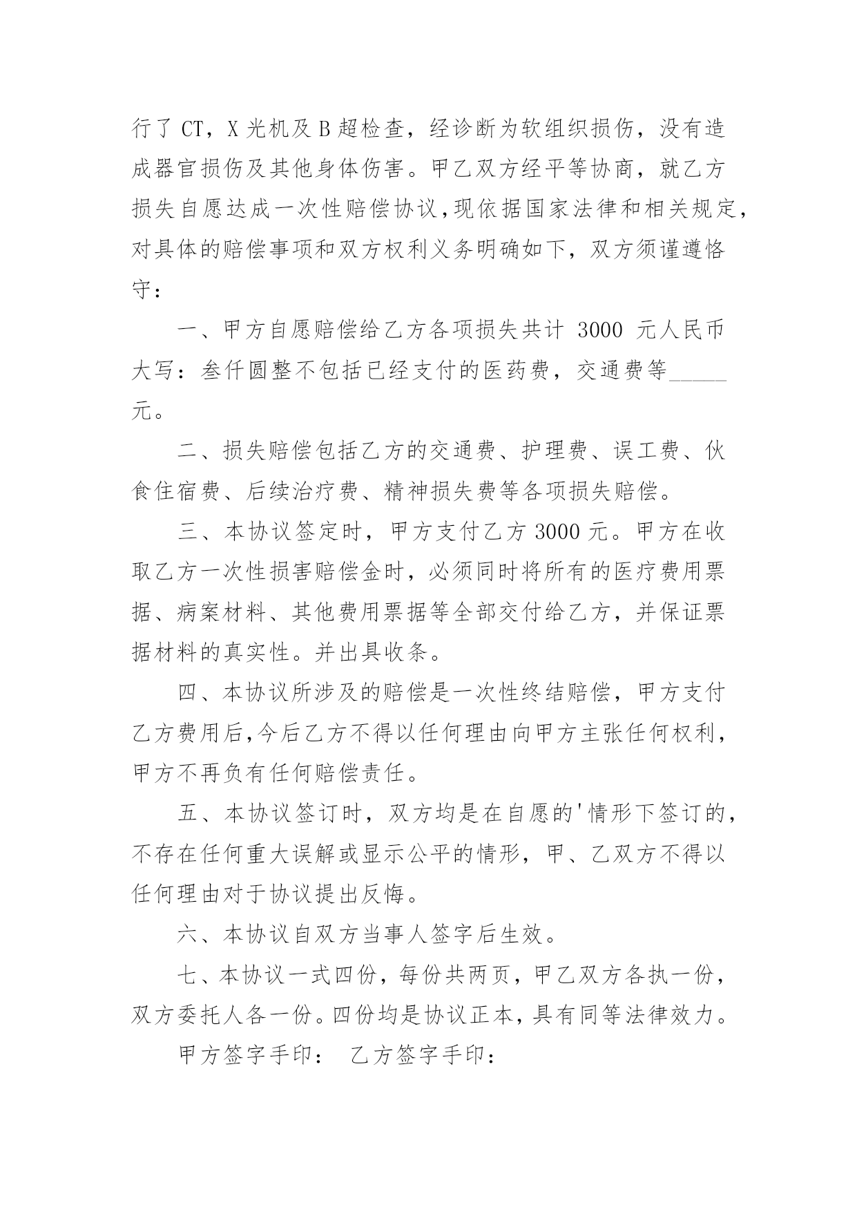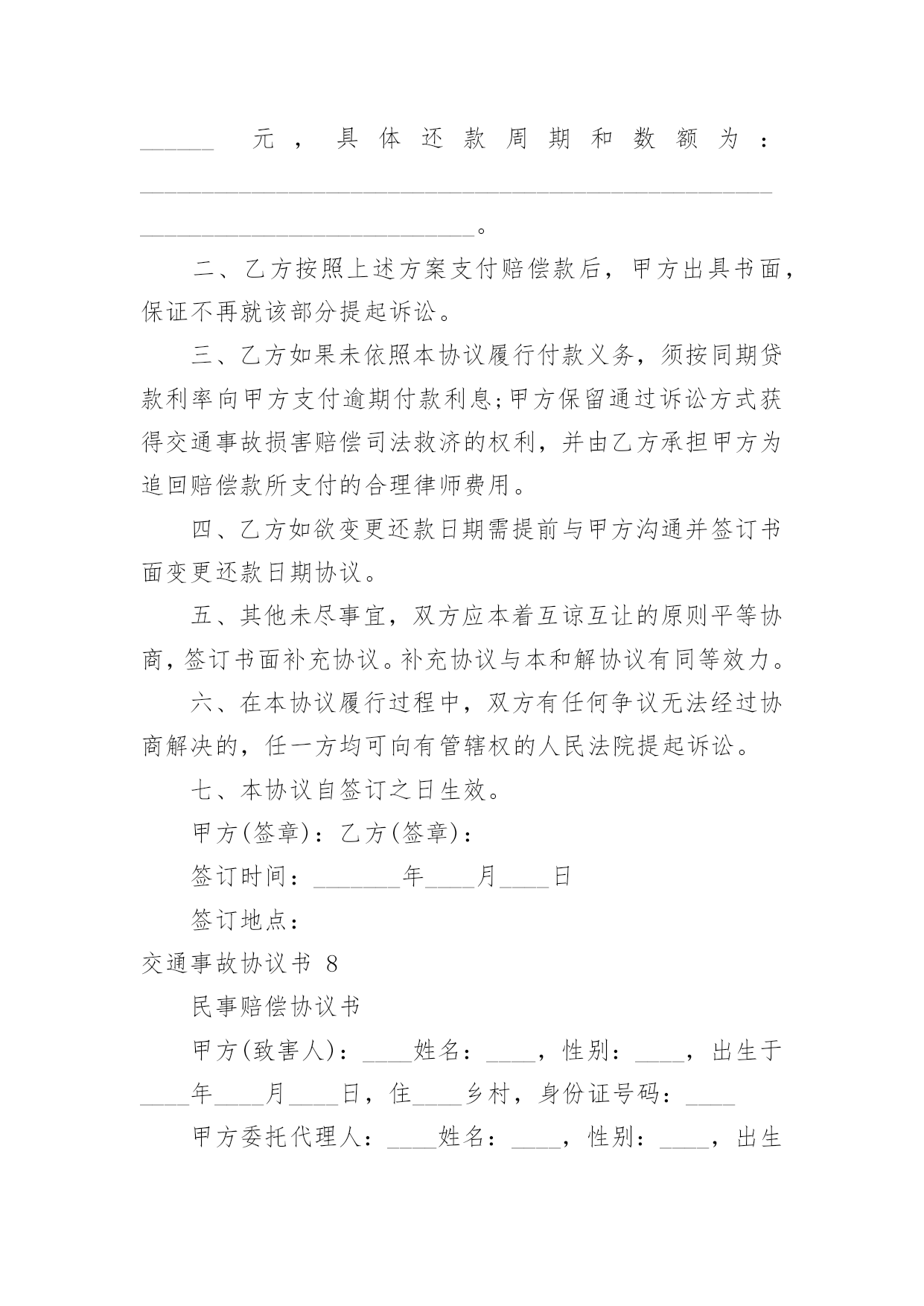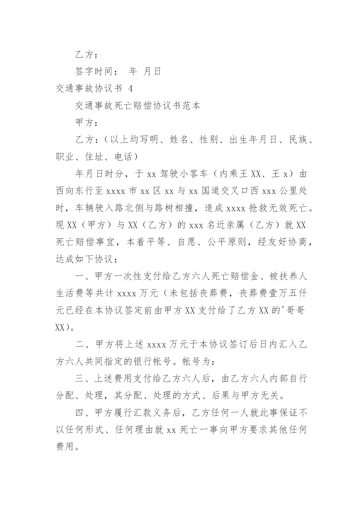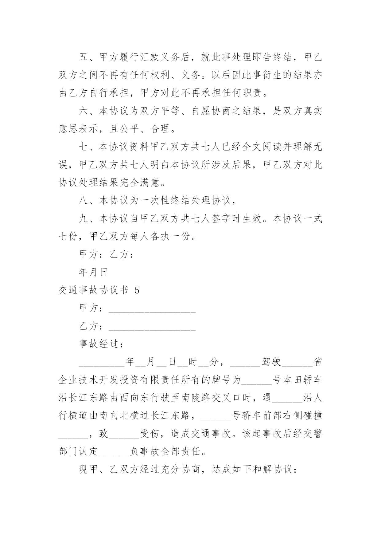 交通事故协议书交通事故协议书15篇在生活中,协议使用的频率越来越高,签订签订协议可以使事务的结果更加完美化。那么你真正懂得怎么写好协议吗?以下是小编收集整理的交通事故协议书,欢迎大家借鉴与参考,希望对大家有所帮助。交通事故协议书1甲方:乙方:20____年9月4日14时30分,于____驾驶小客车(内乘王____、王__)由西向东行至北京市____区____与____国道交叉口西1.5公里处时,车辆驶入路北侧与路树相撞,造成王____抢救无效死亡。现于____(甲方)与王____的六名近亲属(乙方)就王____死亡赔偿事宜,本着平等、自愿、公平原则,经友好协商,达成如下死亡赔偿协议书:一、甲方一次性支付给乙方六人死亡赔偿金、被扶养人生活费等共计贰拾贰万元(未包括丧葬费,丧葬费壹万五仟元已经在本协议签定前由梁____支付给了王____的哥哥王____)。二、甲方将上述贰拾贰万元于本协议签订后日内汇入乙方六人共同指定的'银行帐号。帐号为:三、上述费用支付给乙方六人后,由乙方六人内部自行分配、处理,其分配、处理的方式、后果与甲方无关。四、甲方履行汇款义务后,乙方任何一人就此事保证不以任何形式、任何理由就王____死亡一事向甲方要求其他任何费用。五、甲方履行汇款义务后,就此事处理即告终结,甲乙双方之间不再有任何权利、义务。以后因此事衍生的结果亦由乙方自行承担,甲方对此不再承担任何责任。六、本协议为双方平等、自愿协商之结果,是双方真实意思表示,且公平、合理。七、本协议内容甲乙双方共七人已经全文阅读并理解无误,甲乙双方共七人明白本协议所涉及后果,甲乙双方对此协议处理结果完全满意。八、本协议为一次性终结处理协议,九、本协议自甲乙双方共七人签字时生效。本协议一式七份,甲乙双方每人各执一份。甲方(签字):乙方(签字):日期:交通事故协议书2甲方:___,男,身份证号码:_____,住址__________,以下简称甲方。乙方:___,男,身份证号码:_____,住址__________,以下简称乙方。甲乙双方在平等、自愿的基础上,本着公平公正,合理合法,以人为本的原则,就_____年_____月_____日在_____地段发生的道路交通事故,对交通事故所造成的`损害达成赔偿协议如下:一、甲方自愿一次性赔偿乙方各种法定人身损害赔偿项目共计人民币大写:_____(小写:_____元)。二、乙方同意上述赔偿款项,乙方收到上述全部款项后即放弃对甲方的其它一切权利,不再要求甲方进行任何形式的赔偿或承担其它任何责任。三、甲乙双方当事人应积极协助交警部门处理事故,保险公司理赔事项,不得相互设置障碍。四、本协议签字合法有效后,乙方保证没有其他权利人或利害关系人就此次交通事故再向甲方主张权利,若造成甲方其它损失,则由乙方承担全部责任。五、本协议于_____年_____月_____日甲、乙双方在_____交警大队的见证下双方签字后立即生效。六、本协议一式三份,甲、乙双方和___交警大队各持一份。甲方签字:乙方签字:交警部门:_____年____月____日交通事故协议书3甲方:(身份证号码:)乙方:(身份证号码:)20__年8月26日,甲方骑摩托车不小心撞到骑电动车的乙方后,甲方及时将乙方送医院检查,住院观察,并支付了乙方就医费用,甲乙双方在平等、自愿协商及充分了解相关法律法规的基础上,达成如下协议:一、甲乙双方依据交通事故处理的一般原则达成一次性赔偿协议,除了甲方先期支付的医疗费用外,甲方一次性支付乙方人民币20__元(大写:贰仟元整)。二、在甲方支付人民币20__元后,乙方保证今后绝不以任何理由和任何形式就此事再向甲方要求各种名义补助、补偿等费用,后续事宜及费用均由乙方自行处理和承担。三、在乙方收到甲方支付的人民币20__元后,此事处理即告终结,甲乙双方之间不再存在任何权利义务,乙方承诺不再提起任何与此事相关的诉讼和仲裁,也放弃向司法机关提起针对本协议的.任何诉讼权利。以后因此事衍生结果亦由乙方自行承担,甲方对此不再承担任何责任。四、本协议的所有条款均是双方共同协商议定,甲乙双方已全文阅读并理解无误,甲乙双方完全明白本协议内容所涉及后果,甲乙双方均对此表示理解并尊重本协议所达成目的,甲乙双方对此处理结果完全同意。五、本协议为一次性终结处理协议,本协议为双方平等、自愿协商的结果,并且是双方真实意思表示,本协议自双方签字按手印后立即成立生效。七、本协议一式三份,甲乙双方各执一份,交管部门存档一份,具有同等的法律效力。甲方:乙方:签字时间:年月日交通事故协议书4交通事故死亡赔偿协议书范本甲方:乙方:(以上均写明、姓名、性别、出生年月日、民族、职业、住址、电话)年月日时分,于xx驾驶小客车(内乘王XX、王x)由西向东行至xxxx市xx区xx与xx国道交叉口西xxx