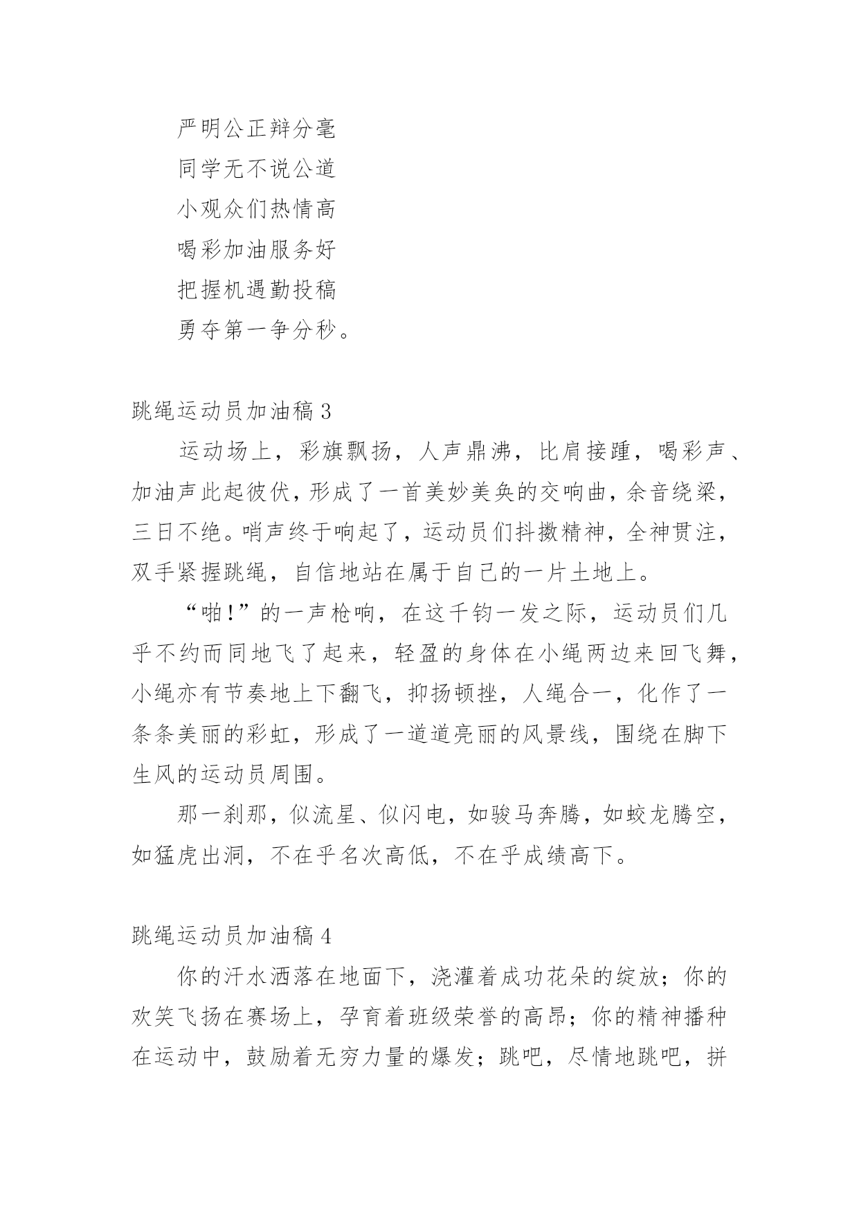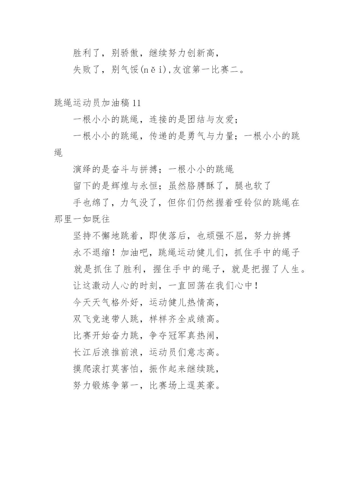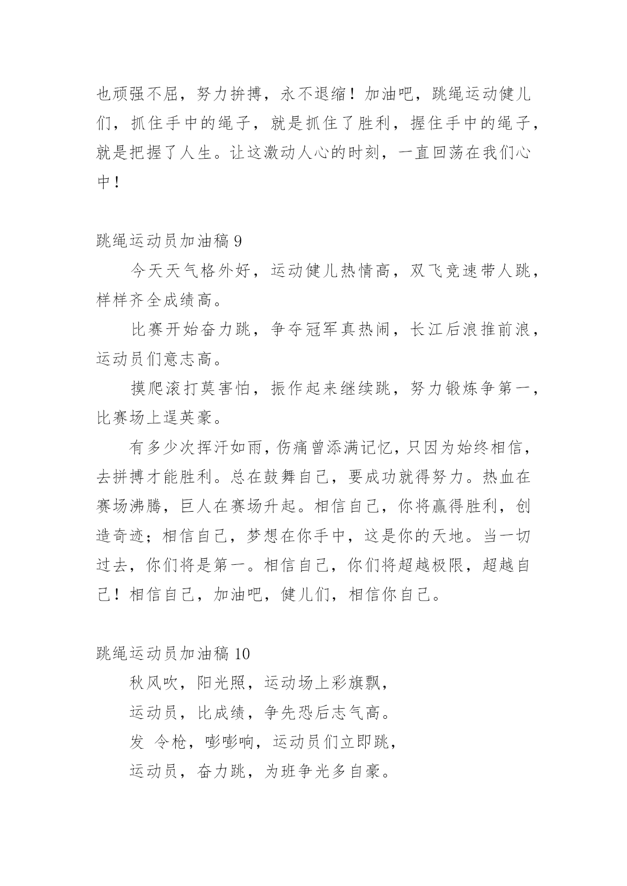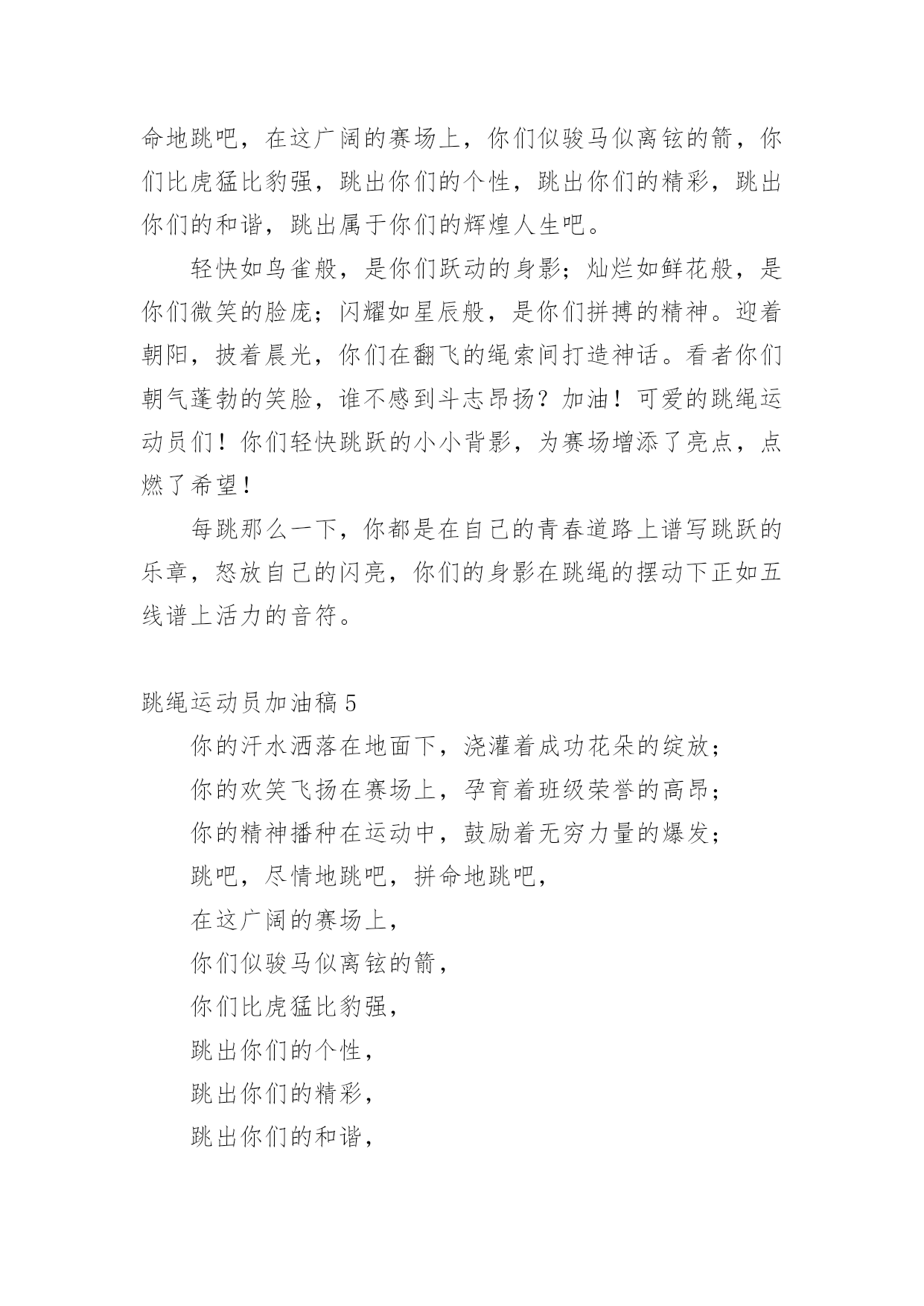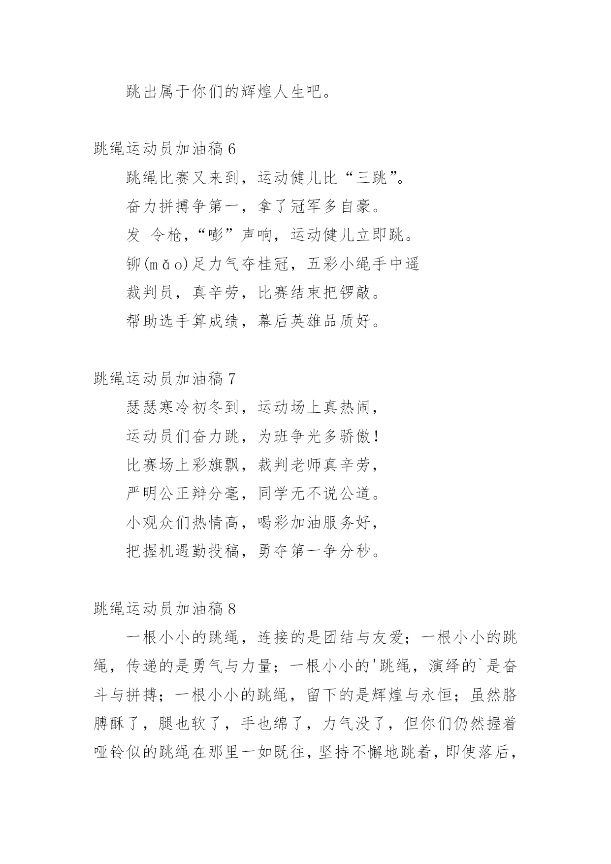 跳绳运动员加油稿在日新月异的现代社会中,我们用到加油稿的地方越来越多,借助加油稿可以活跃气氛,催人奋进。相信很多朋友都对写加油稿感到非常苦恼吧,下面是小编精心整理的跳绳运动员加油稿,供大家参考借鉴,希望可以帮助到有需要的朋友。跳绳运动员加油稿1你的汗水洒落在地面下,浇灌着成功花朵的绽放;你的欢笑飞扬在赛场上,孕育着班级荣誉的高昂;你的精神播种在运动中,鼓励着无穷力量的爆发;跳吧,尽情地跳吧,拼命地跳吧,在这广阔的赛场上,你们似骏马似离铉的箭,你们比虎猛比豹强,跳出你们的个性,跳出你们的精彩,跳出你们的和谐,跳出属于你们的辉煌人生吧。跳绳运动员加油稿2运动场上真热闹运动员们奋力跳为班争光多骄傲比赛场上彩旗飘裁判老师真辛劳严明公正辩分毫同学无不说公道小观众们热情高喝彩加油服务好把握机遇勤投稿勇夺第一争分秒。跳绳运动员加油稿3运动场上,彩旗飘扬,人声鼎沸,比肩接踵,喝彩声、加油声此起彼伏,形成了一首美妙美奂的交响曲,余音绕梁,三日不绝。哨声终于响起了,运动员们抖擞精神,全神贯注,双手紧握跳绳,自信地站在属于自己的一片土地上。“啪!”的一声枪响,在这千钧一发之际,运动员们几乎不约而同地飞了起来,轻盈的身体在小绳两边来回飞舞,小绳亦有节奏地上下翻飞,抑扬顿挫,人绳合一,化作了一条条美丽的彩虹,形成了一道道亮丽的风景线,围绕在脚下生风的运动员周围。那一刹那,似流星、似闪电,如骏马奔腾,如蛟龙腾空,如猛虎出洞,不在乎名次高低,不在乎成绩高下。跳绳运动员加油稿4你的汗水洒落在地面下,浇灌着成功花朵的绽放;你的欢笑飞扬在赛场上,孕育着班级荣誉的高昂;你的精神播种在运动中,鼓励着无穷力量的爆发;跳吧,尽情地跳吧,拼命地跳吧,在这广阔的赛场上,你们似骏马似离铉的箭,你们比虎猛比豹强,跳出你们的个性,跳出你们的精彩,跳出你们的和谐,跳出属于你们的辉煌人生吧。轻快如鸟雀般,是你们跃动的身影;灿烂如鲜花般,是你们微笑的脸庞;闪耀如星辰般,是你们拼搏的精神。迎着朝阳,披着晨光,你们在翻飞的绳索间打造神话。看者你们朝气蓬勃的笑脸,谁不感到斗志昂扬?加油!可爱的跳绳运动员们!你们轻快跳跃的小小背影,为赛场增添了亮点,点燃了希望!每跳那么一下,你都是在自己的青春道路上谱写跳跃的乐章,怒放自己的闪亮,你们的身影在跳绳的摆动下正如五线谱上活力的音符。跳绳运动员加油稿5你的汗水洒落在地面下,浇灌着成功花朵的绽放;你的欢笑飞扬在赛场上,孕育着班级荣誉的高昂;你的精神播种在运动中,鼓励着无穷力量的爆发;跳吧,尽情地跳吧,拼命地跳吧,在这广阔的赛场上,你们似骏马似离铉的箭,你们比虎猛比豹强,跳出你们的个性,跳出你们的精彩,跳出你们的和谐,跳出属于你们的辉煌人生吧。跳绳运动员加油稿6跳绳比赛又来到,运动健儿比“三跳”。奋力拼搏争第一,拿了冠军多自豪。发令枪,“嘭”声响,运动健儿立即跳。铆(mǎo)足力气夺桂冠,五彩小绳手中遥裁判员,真辛劳,比赛结束把锣敲。帮助选手算成绩,幕后英雄品质好。跳绳运动员加油稿7瑟瑟寒冷初冬到,运动场上真热闹,运动员们奋力跳,为班争光多骄傲!比赛场上彩旗飘,裁判老师真辛劳,严明公正辩分毫,同学无不说公道。小观众们热情高,喝彩加油服务好,把握机遇勤投稿,勇夺第一争分秒。跳绳运动员加油稿8一根小小的跳绳,连接的是团结与友爱;一根小小的跳绳,传递的是勇气与力量;一根小小的'跳绳,演绎的`是奋斗与拼搏;一根小小的跳绳,留下的是辉煌与永恒;虽然胳膊酥了,腿也软了,手也绵了,力气没了,但你们仍然握着哑铃似的跳绳在那里一如既往,坚持不懈地跳着,即使落后,也顽强不屈,努力拚搏,永不退缩!加油吧,跳绳运动健儿们,抓住手中的绳子,就是抓住了胜利,握住手中的绳子,就是把握了人生。让这激动人心的时刻,一直回荡在我们心中!跳绳运动员加油稿9今天天气格外好,运动健儿热情高,双飞竞速带人跳,样样齐全成绩高。比赛开始奋力跳,争夺冠军真热闹,长江后浪推前浪,运动员们意志高。摸爬滚打莫害怕,振作起来继续跳,努力锻炼争第一,比赛场上逞英豪。有多少次挥汗如雨,伤痛曾添满记忆,只因为始终相信,去拼搏才能胜利。总在鼓舞自己,要成功就得努力。热血在赛场沸腾,巨人在赛场升起。相信自己,你将赢得胜利,创造奇迹;相信自己,梦想在你手中,这是你的天地。当一切过去,你们将是第一。相信自己,你们将超越极限,超越自己!相信自己,加油吧,健儿们,相信你自己。跳绳运动员加油稿10秋风吹,阳光照,运动场上彩旗飘,运动员,比成绩,争先恐后志气高。发令枪,嘭嘭响,运动员们立即跳,运动员,奋力跳,为班争光多自豪。胜利了,别骄傲,继续努力创新高,失败了,别气馁(něi),友谊第一比赛二。跳绳运动员加油稿11一根小小的跳绳,连接的是团结与友爱;一根小小的跳绳,传递的是勇气与力量;一根小小的跳绳演绎的是奋斗与拼搏;一根小小