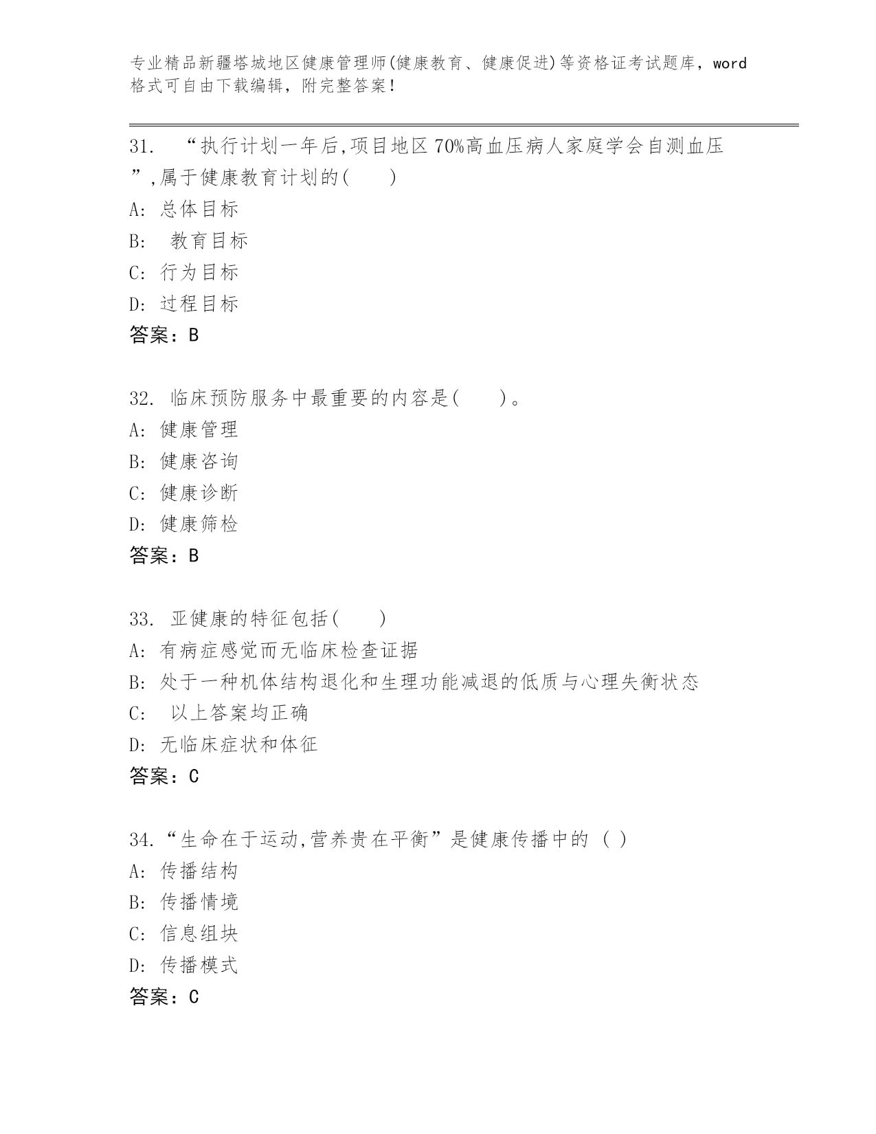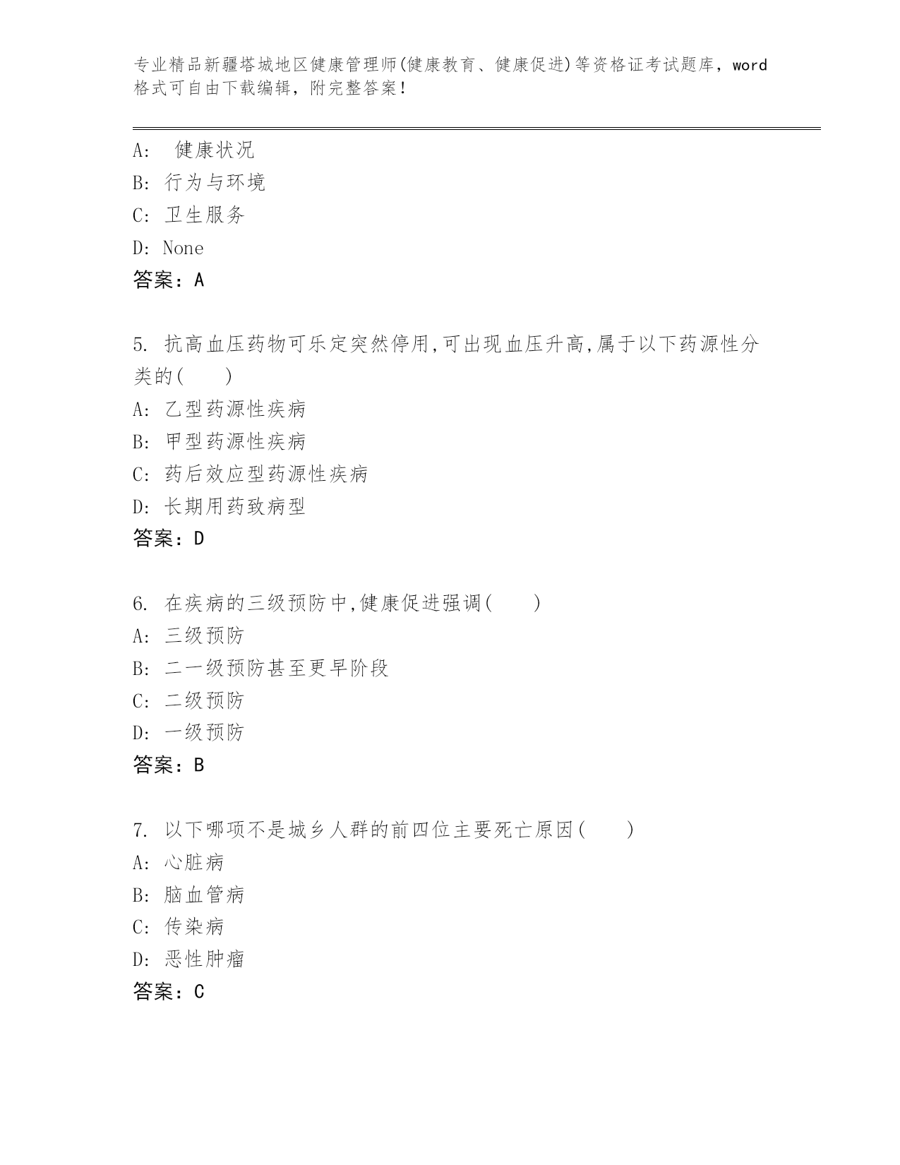 完整版新疆塔城地区健康管理师(健康教育、健康促进)等资格证考试王牌题库【典型题】
